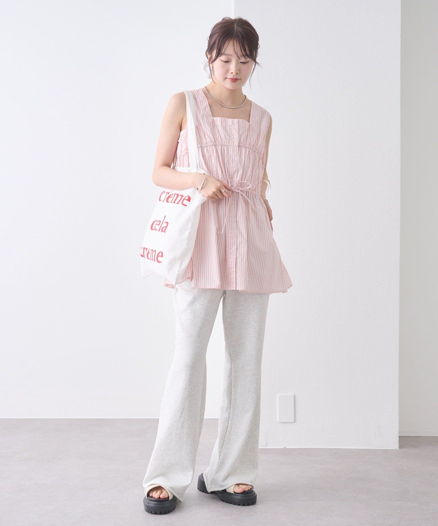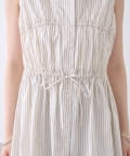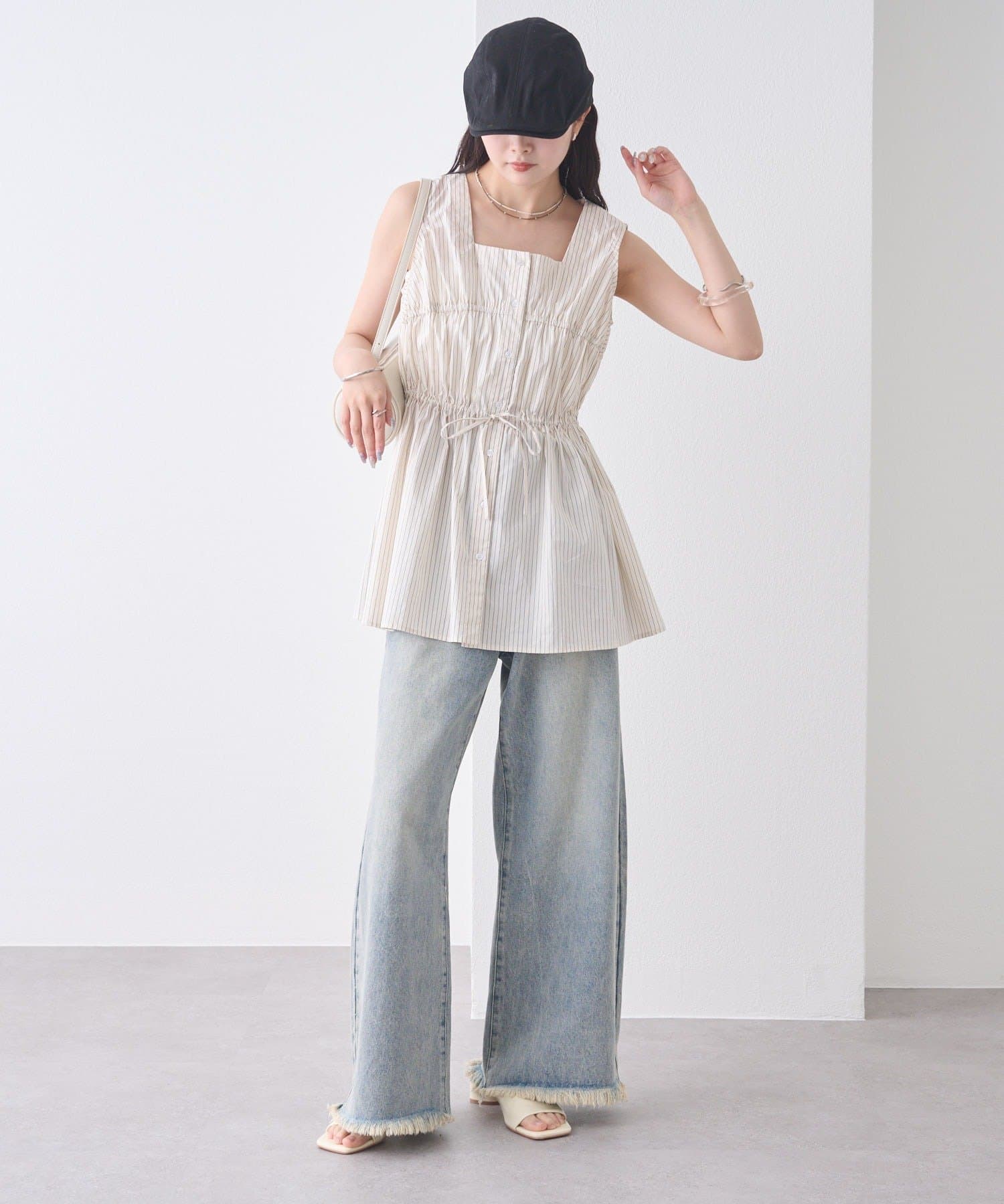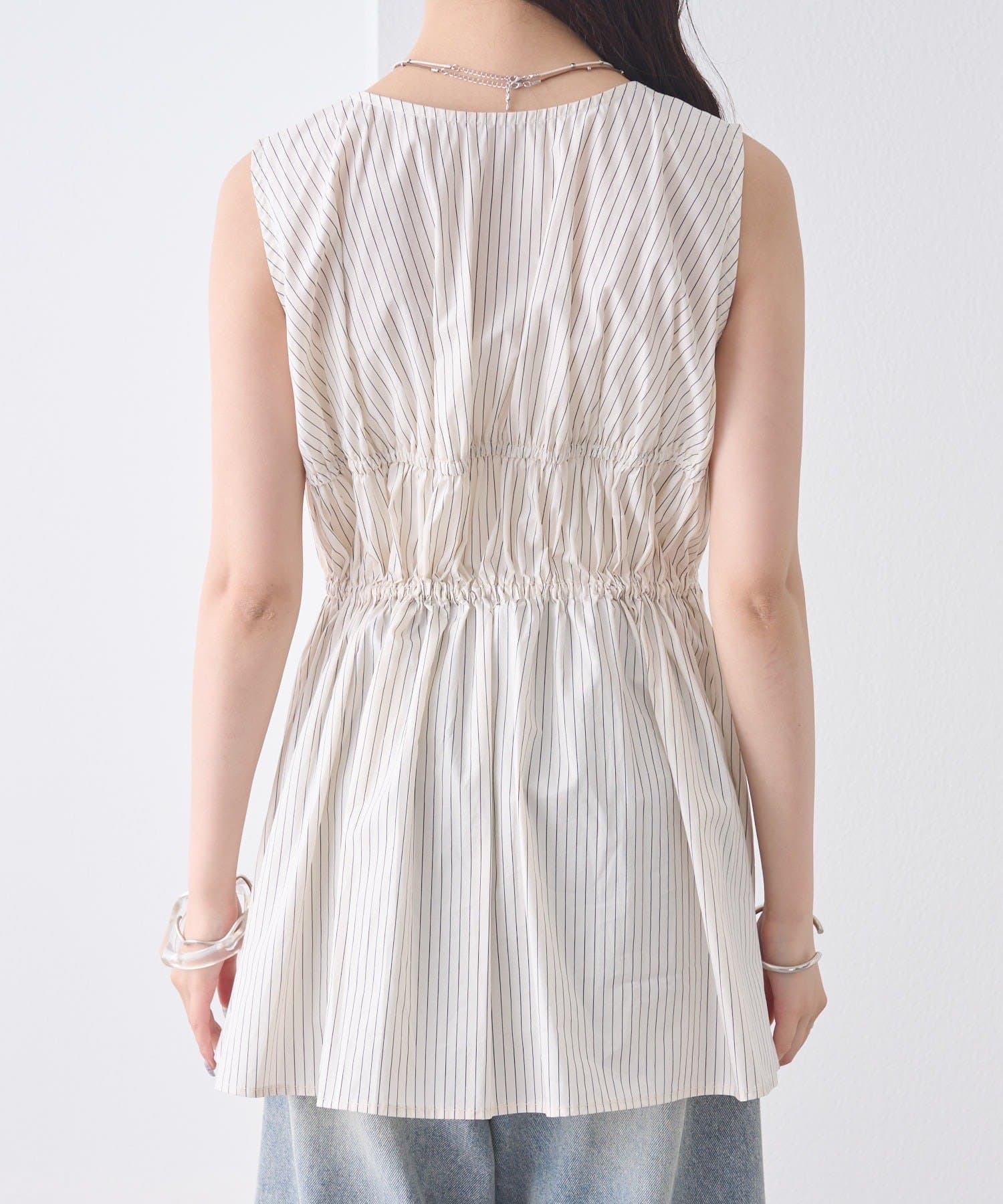 ・スマートでシャープな印象を与えるストライプ柄ですが、タンクトップのシャーリングデザインが女性らしい可愛らしい印象も表現♡