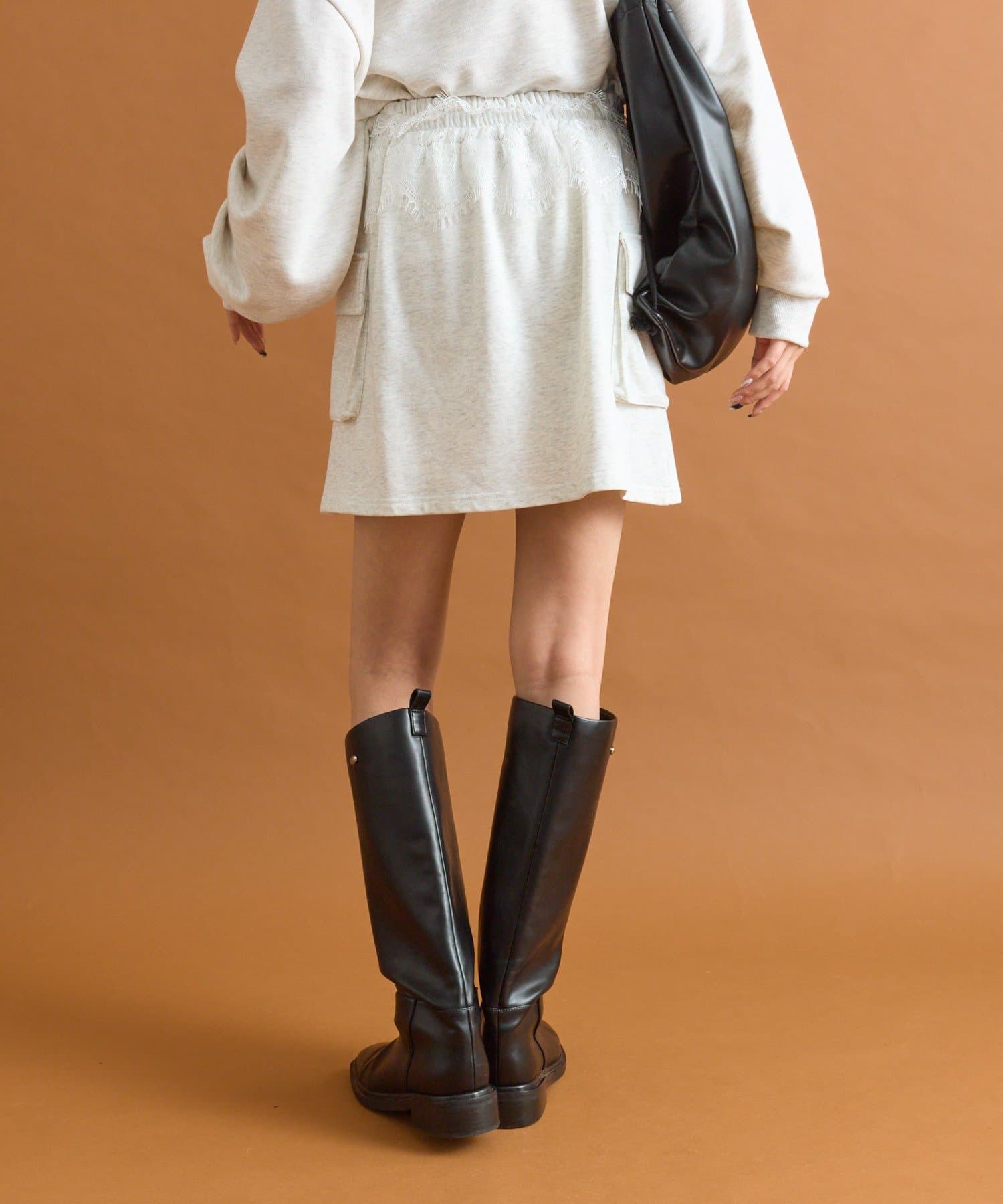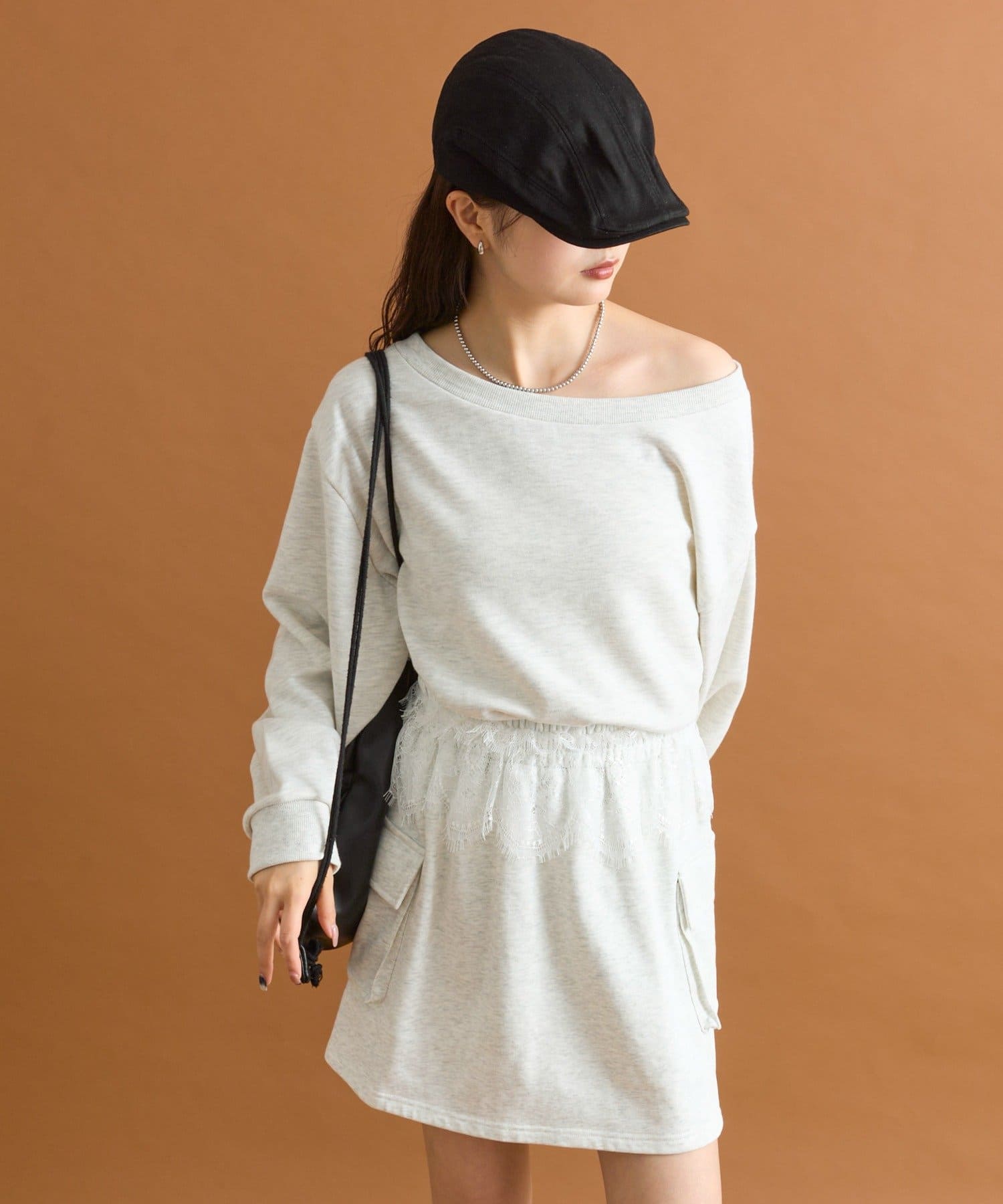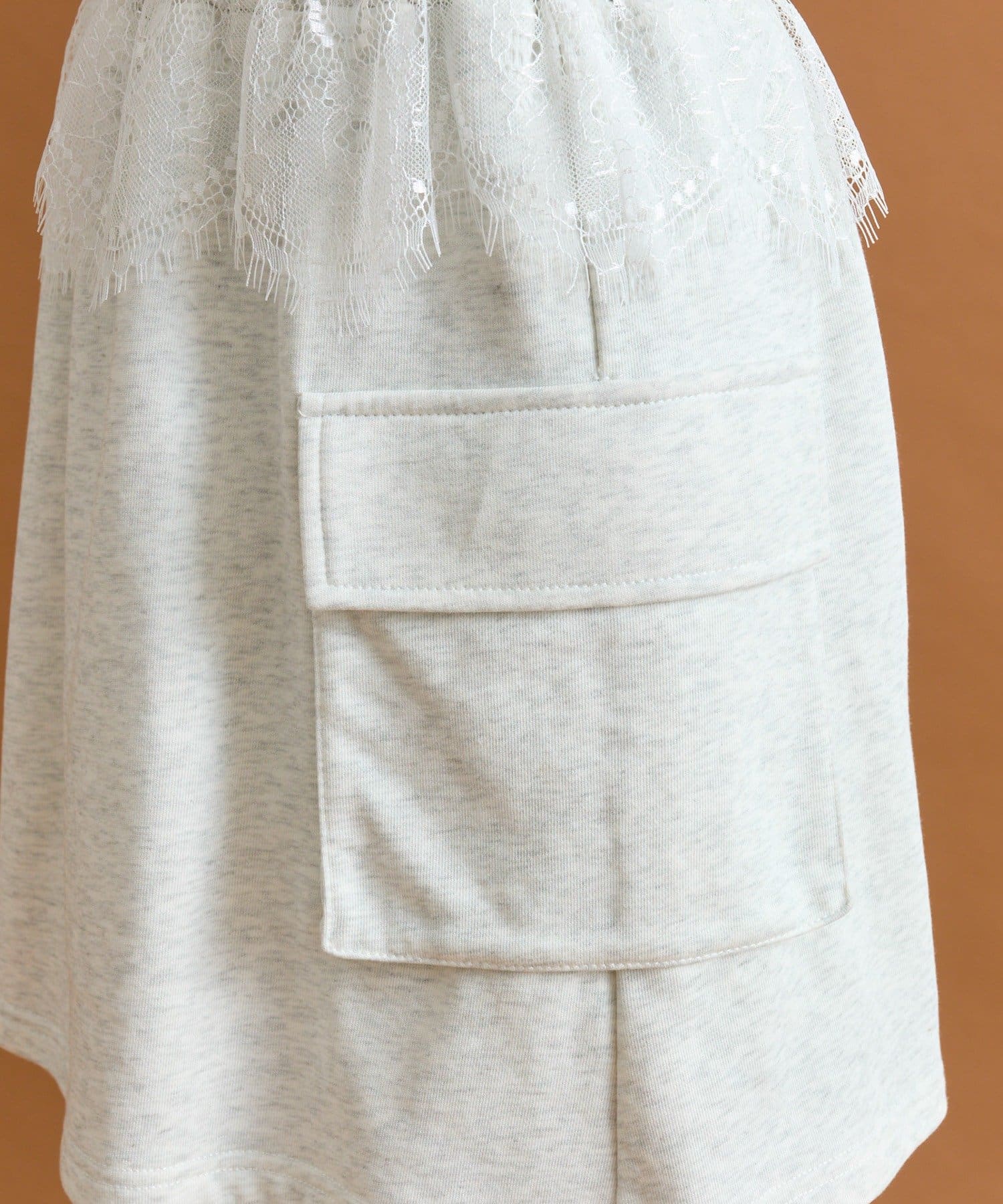 ・ウエスト部分にほどこされたレースが目を惹きます。スウェットのカジュアルさとレースの甘さがちょうど良いバランスです♡