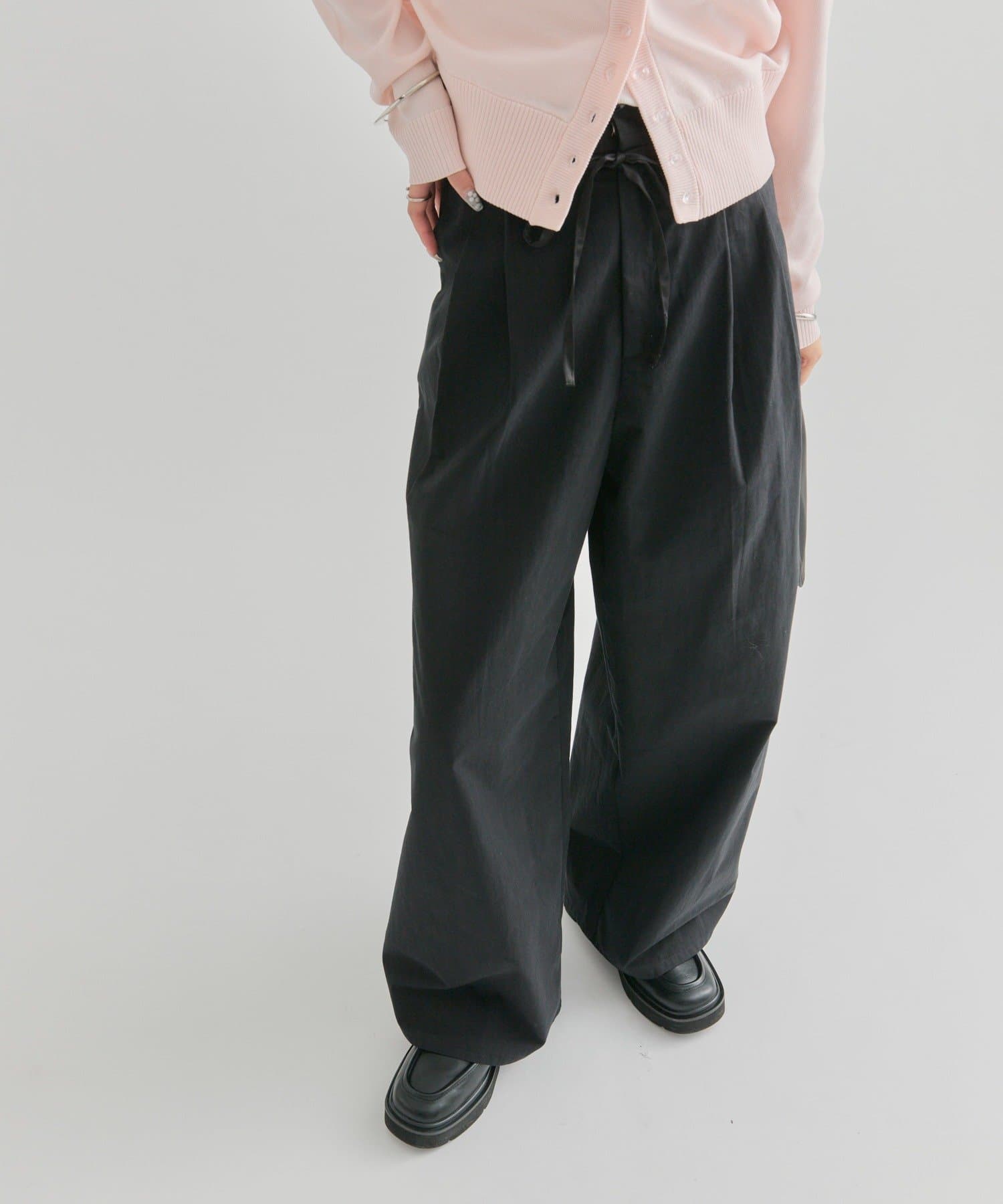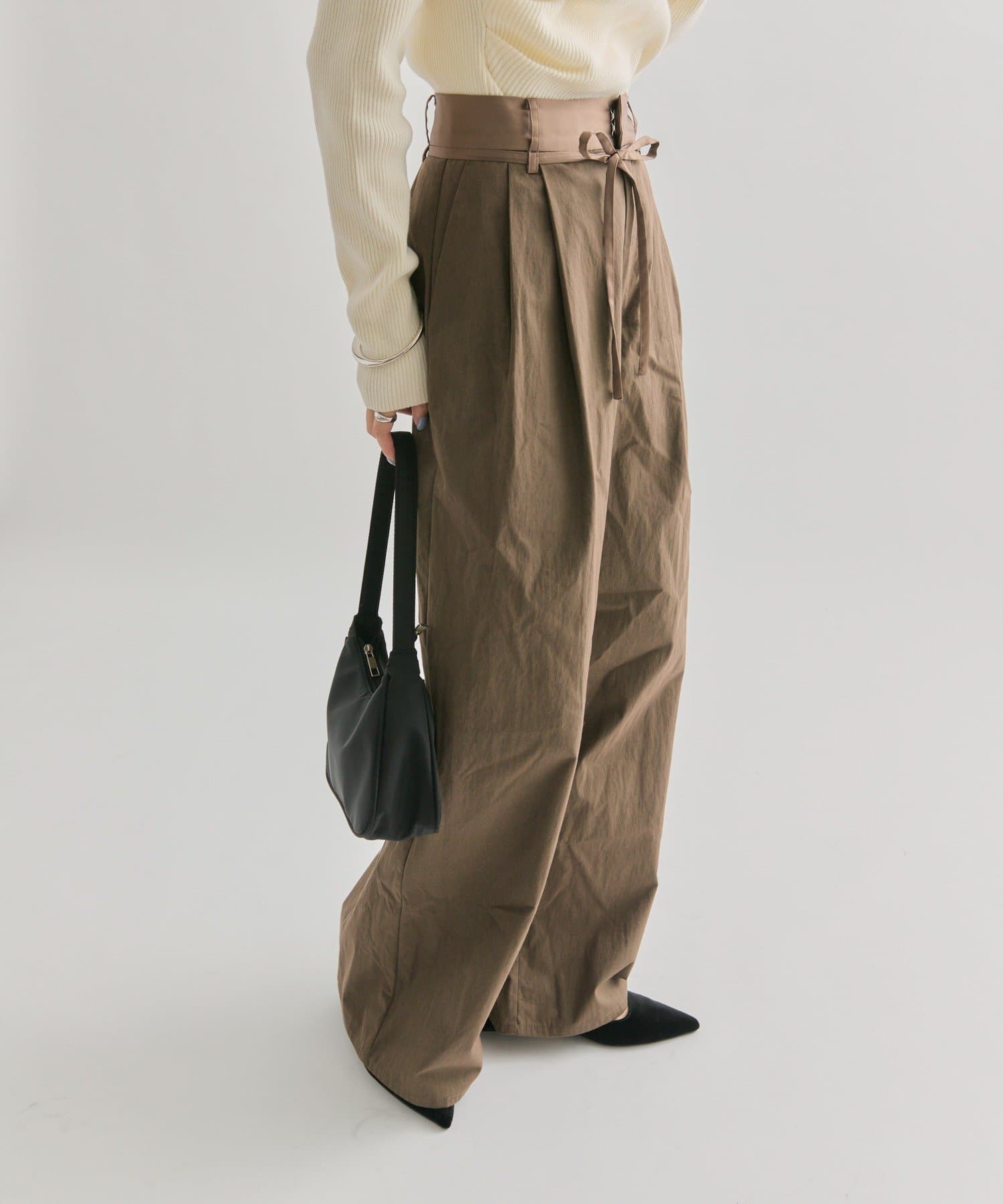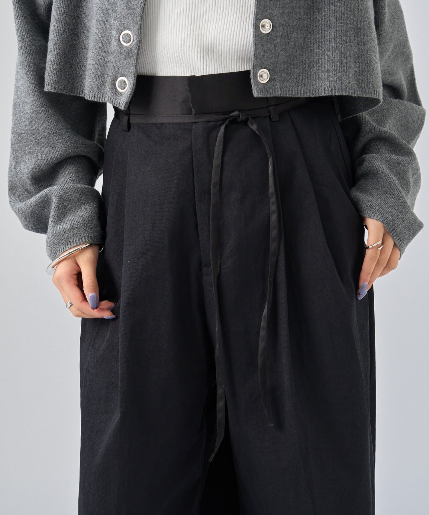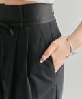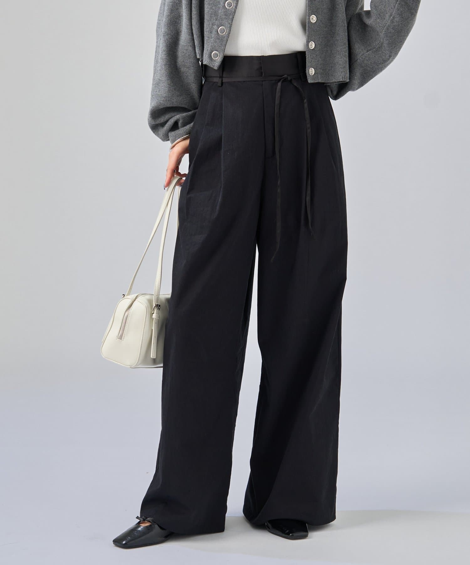 ・ウエスト周りがサテン生地のベルトデザイン仕様になっており、シンプルながらもインパクトを与えてくれるアイテム。さらっとしていて履きやすく、程よいワイド感で落ち感があり気になる脚のラインを拾わずカバーしてくれるのもポイントです♩