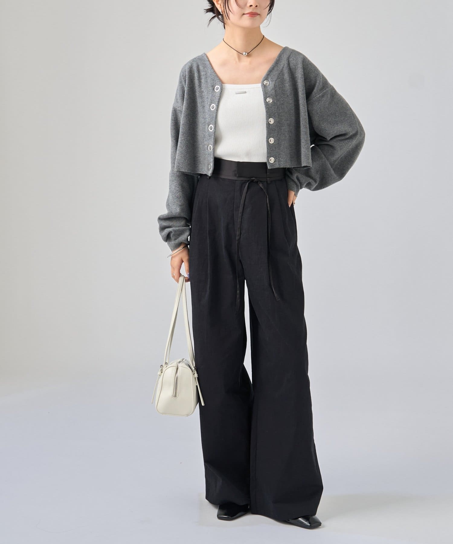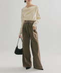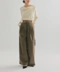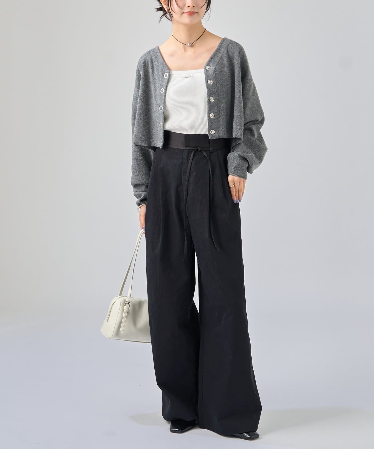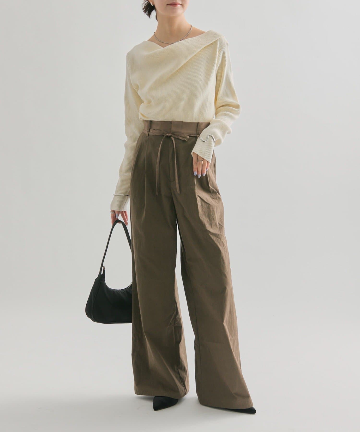 ・ウエスト周りがサテン生地のベルトデザイン仕様になっており、シンプルながらもインパクトを与えてくれるアイテム。さらっとしていて履きやすく、程よいワイド感で落ち感があり気になる脚のラインを拾わずカバーしてくれるのもポイントです♩