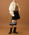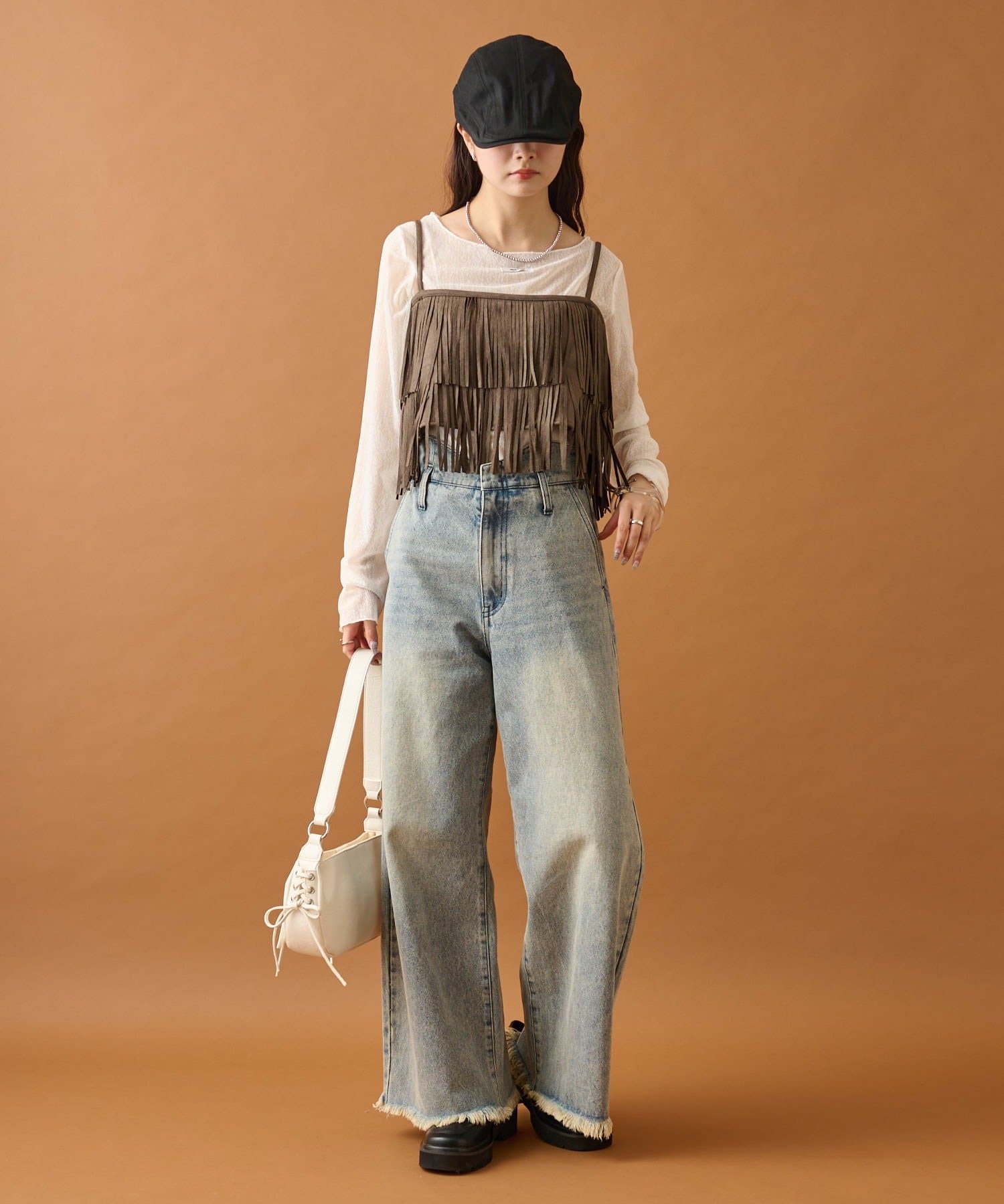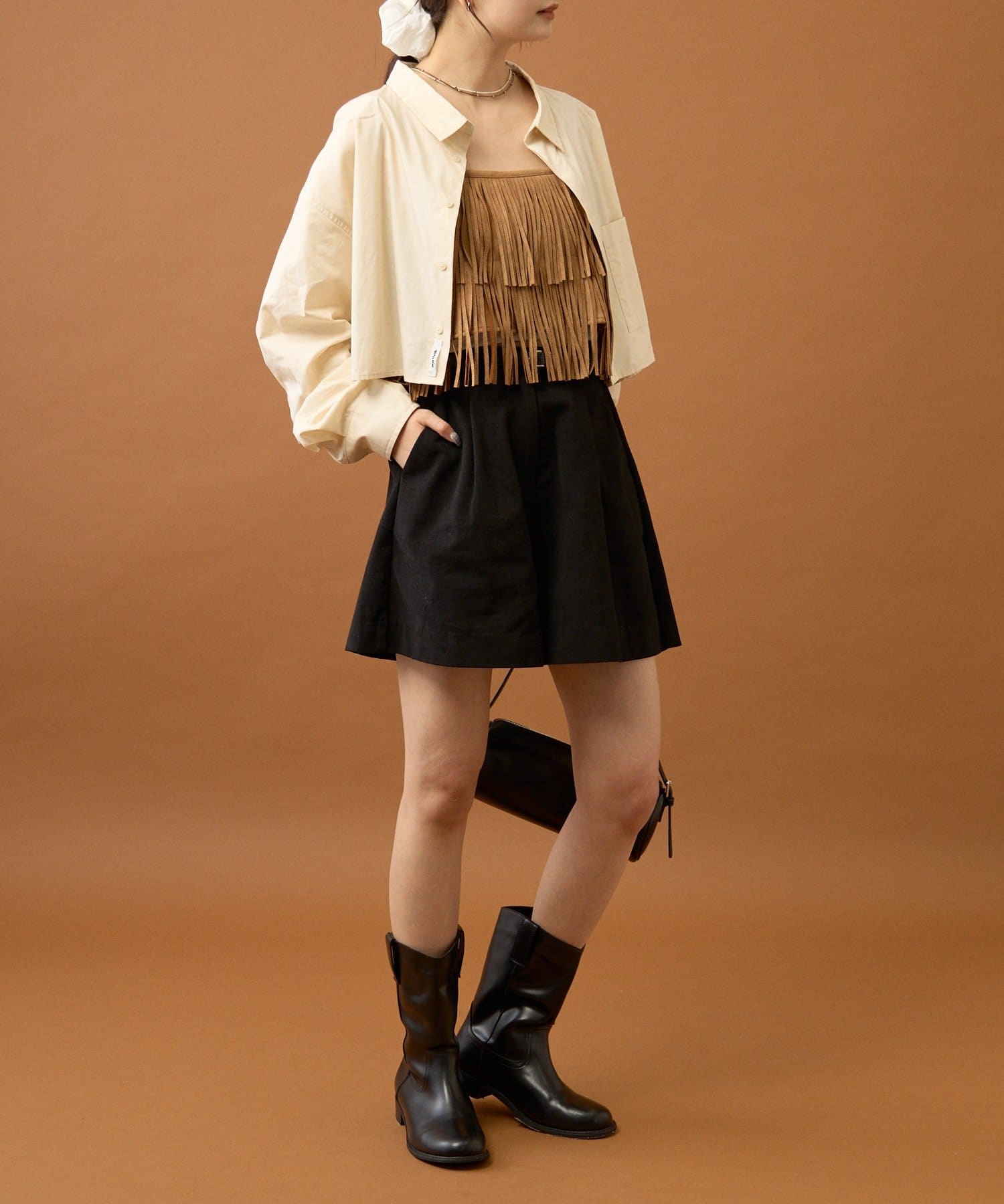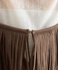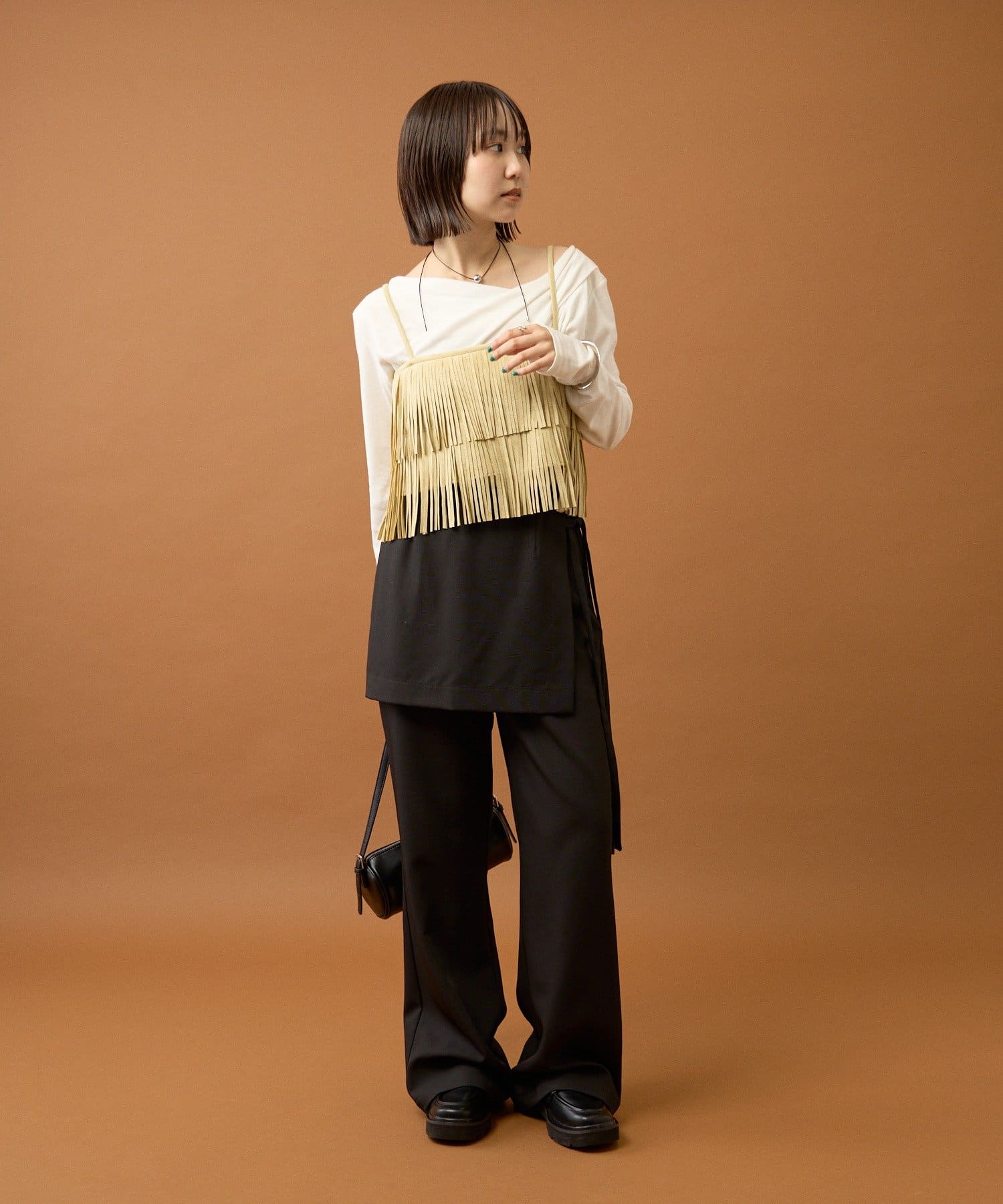 ・フェイクスウェードフリンジスカートと合わせてセットアップのようなコーディネートに。