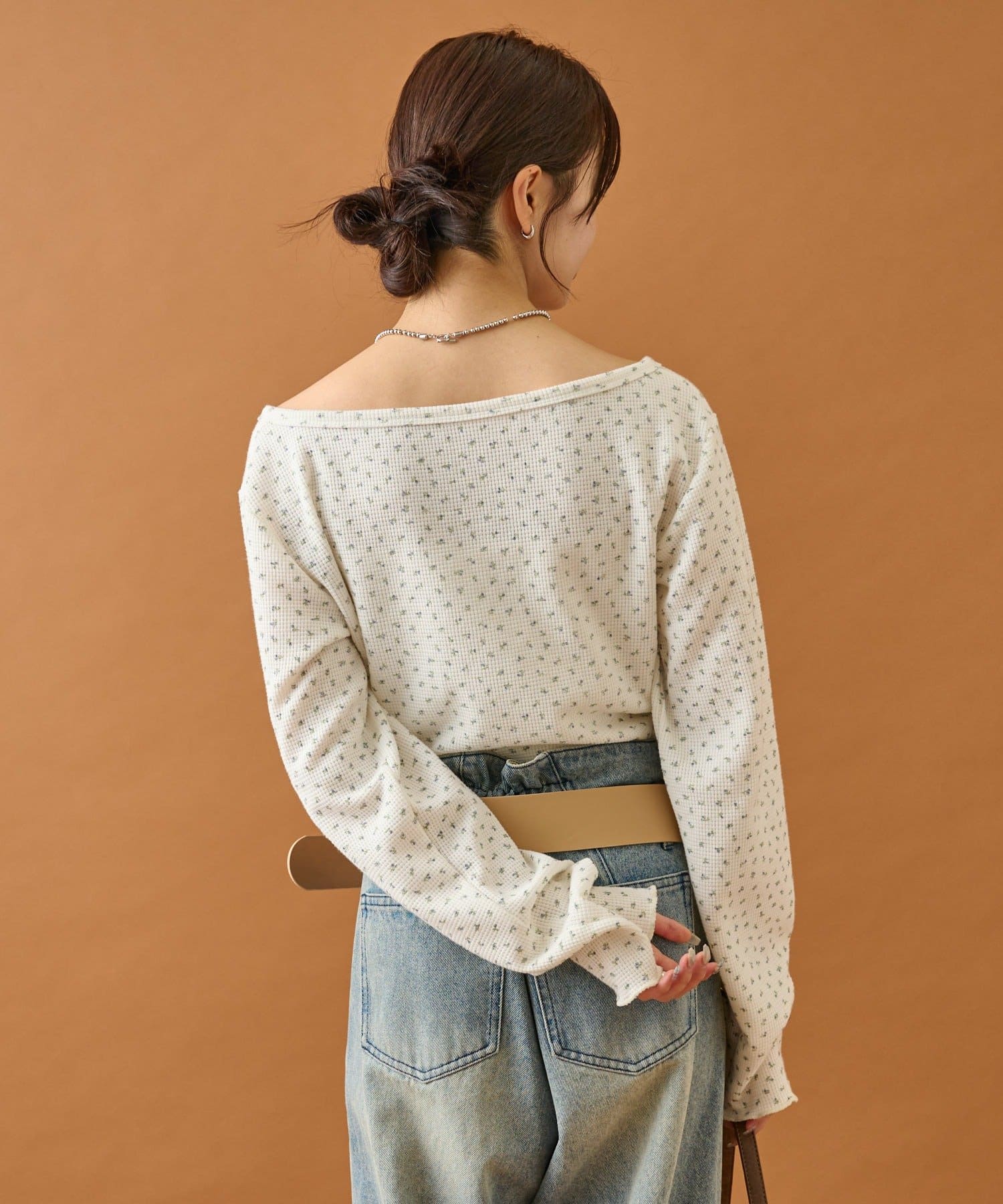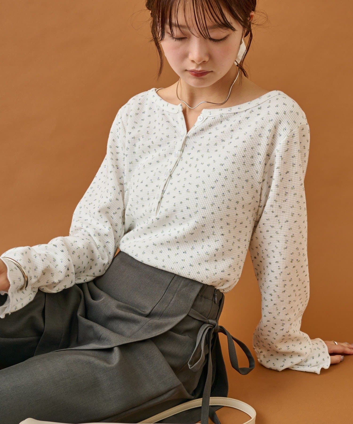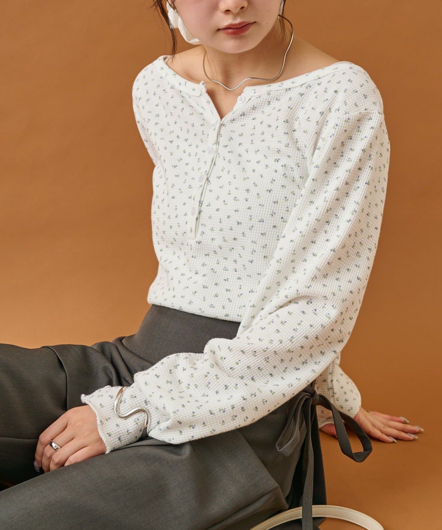 ・首元が空いているのでネックレス等のアクセサリーも良いアクセントに。