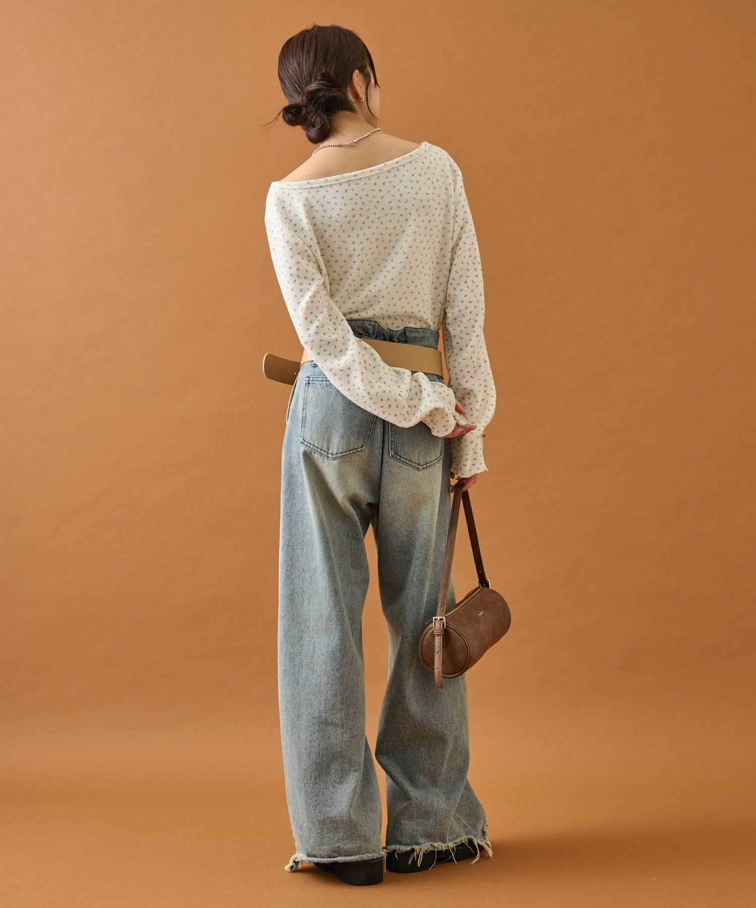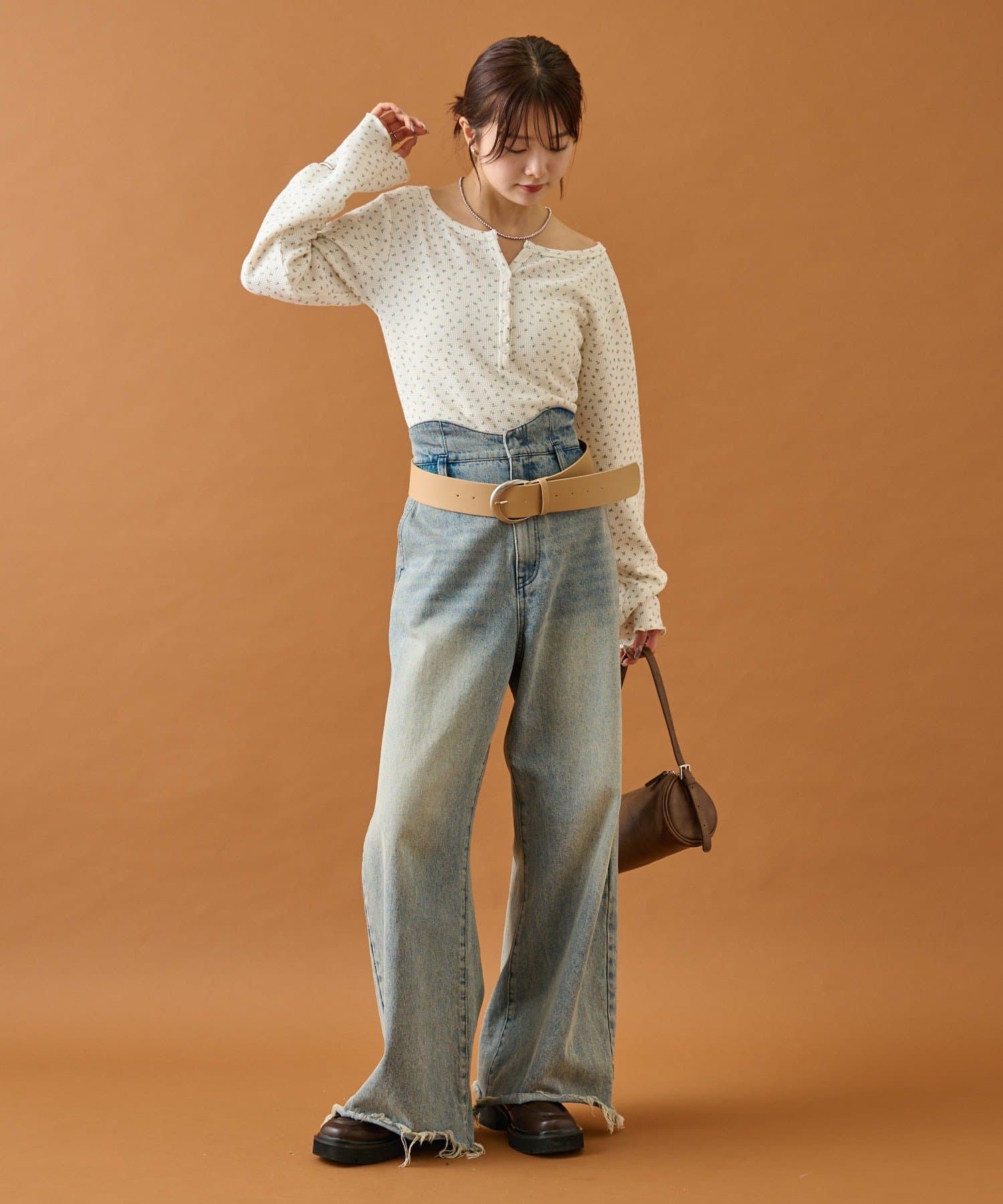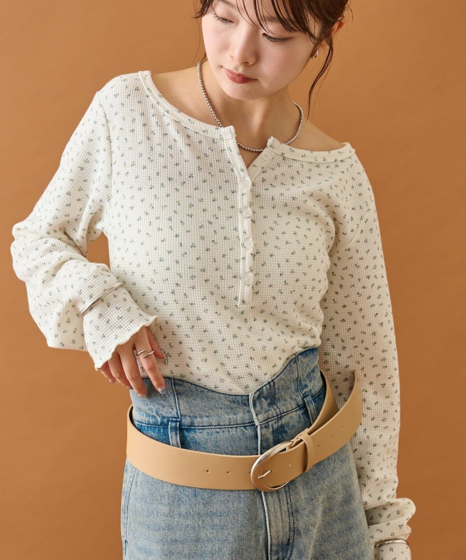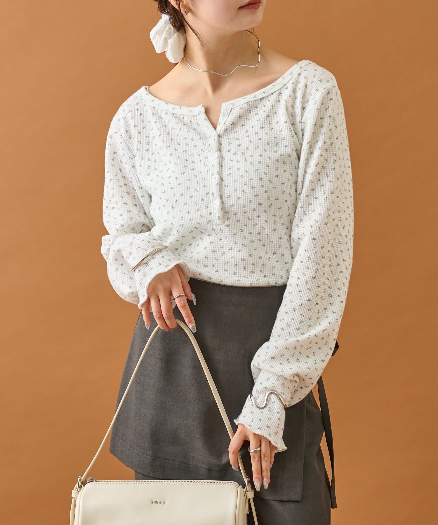 ・首元が空いているのでネックレス等のアクセサリーも良いアクセントに。