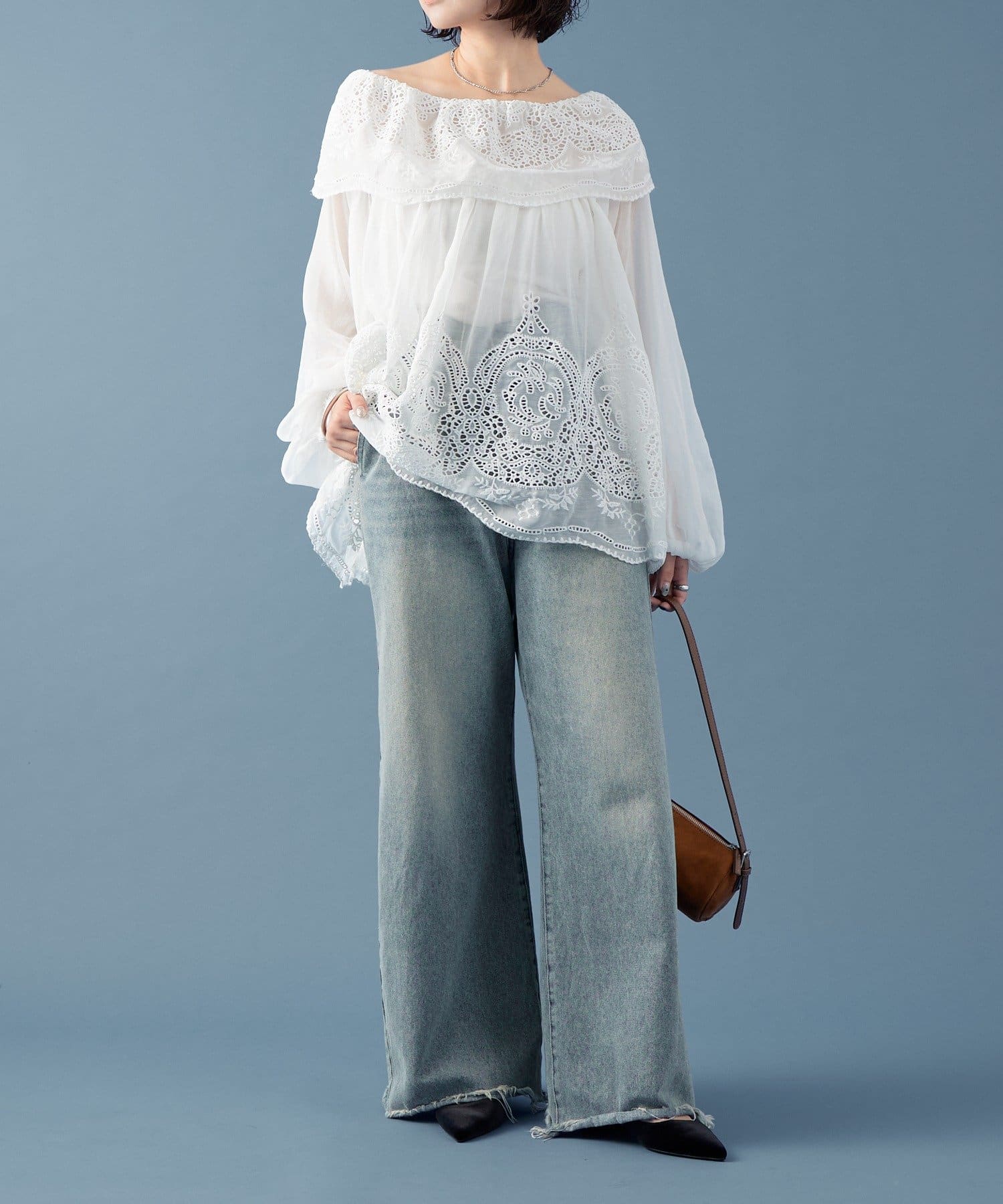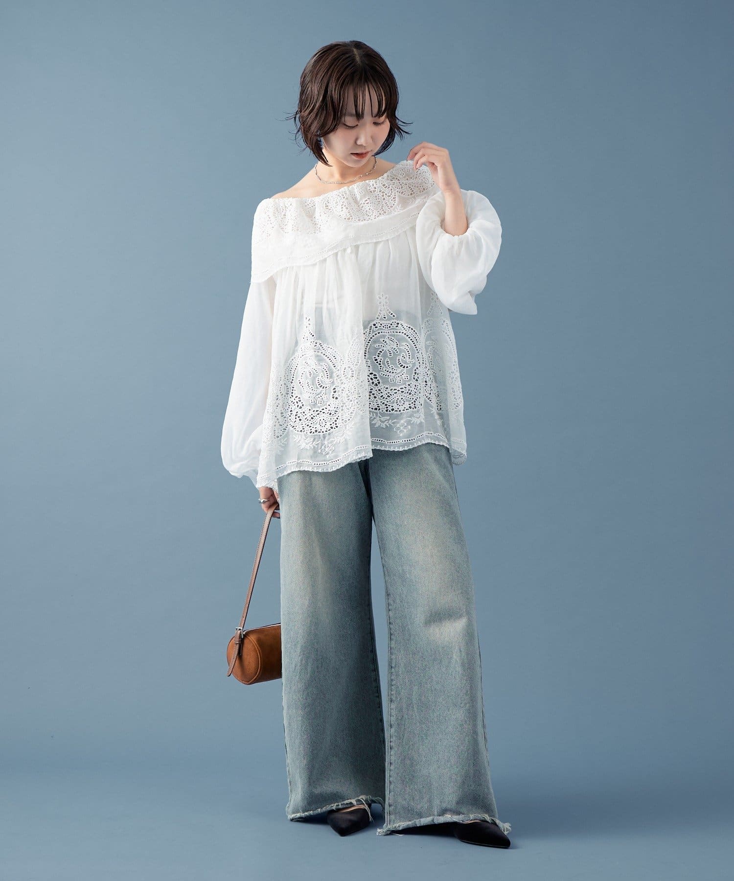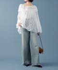 ・甘めなブラウスなのでデニムと合わせてカジュアルダウンさせたコーディネートに。