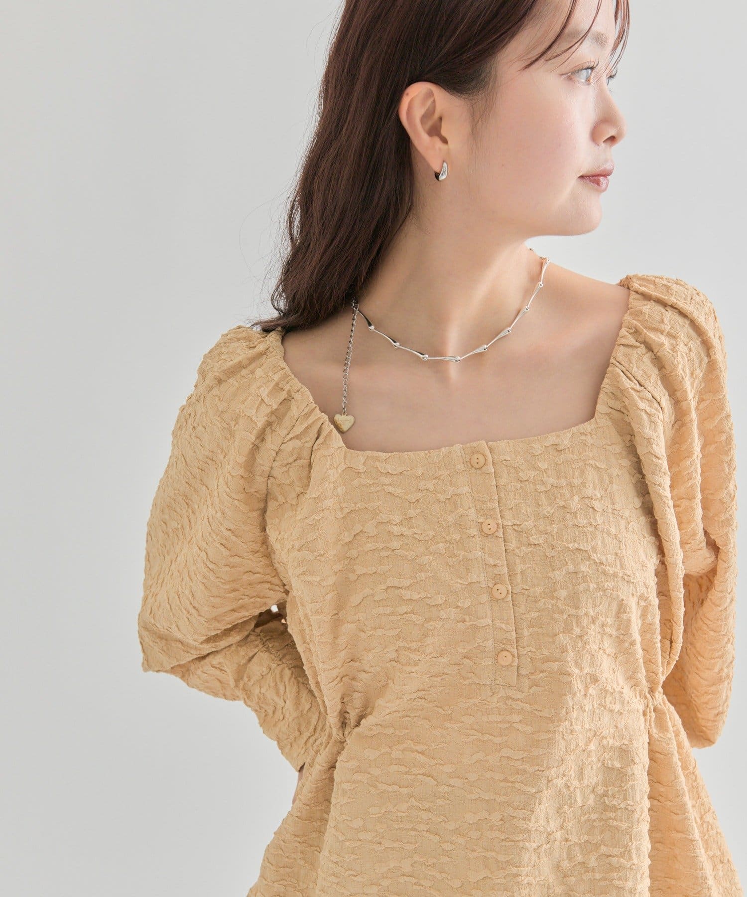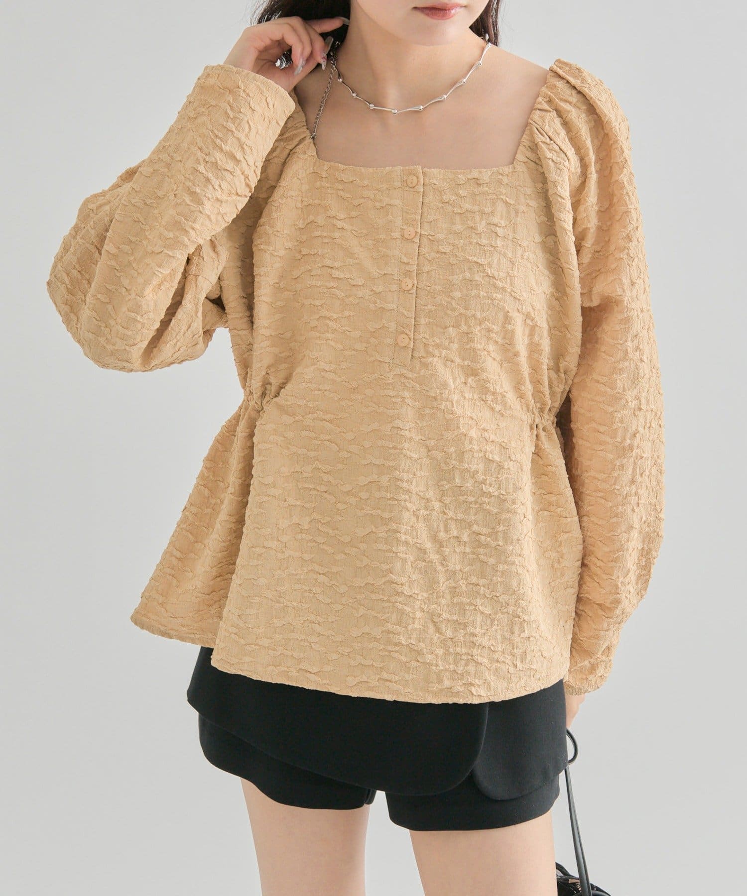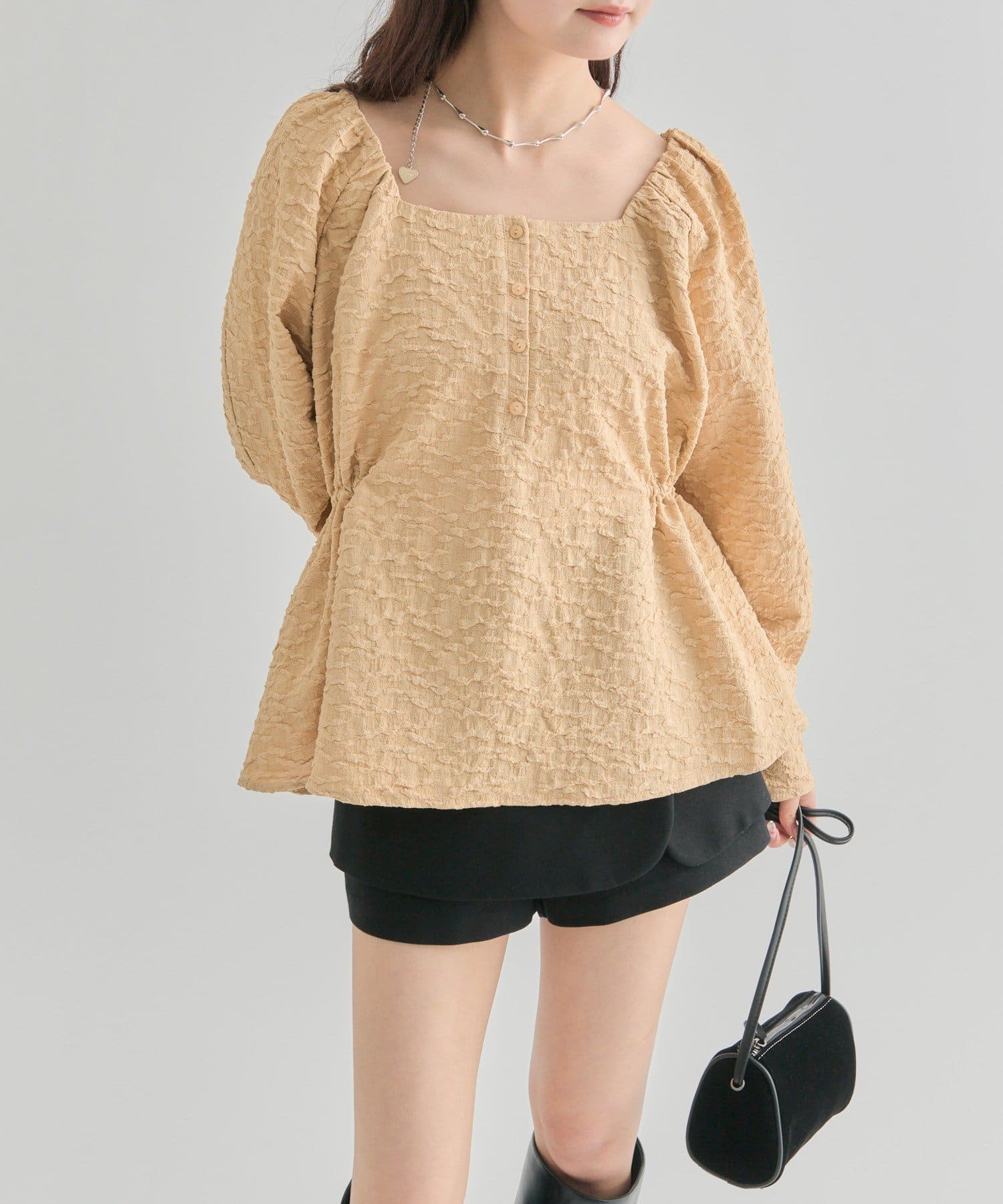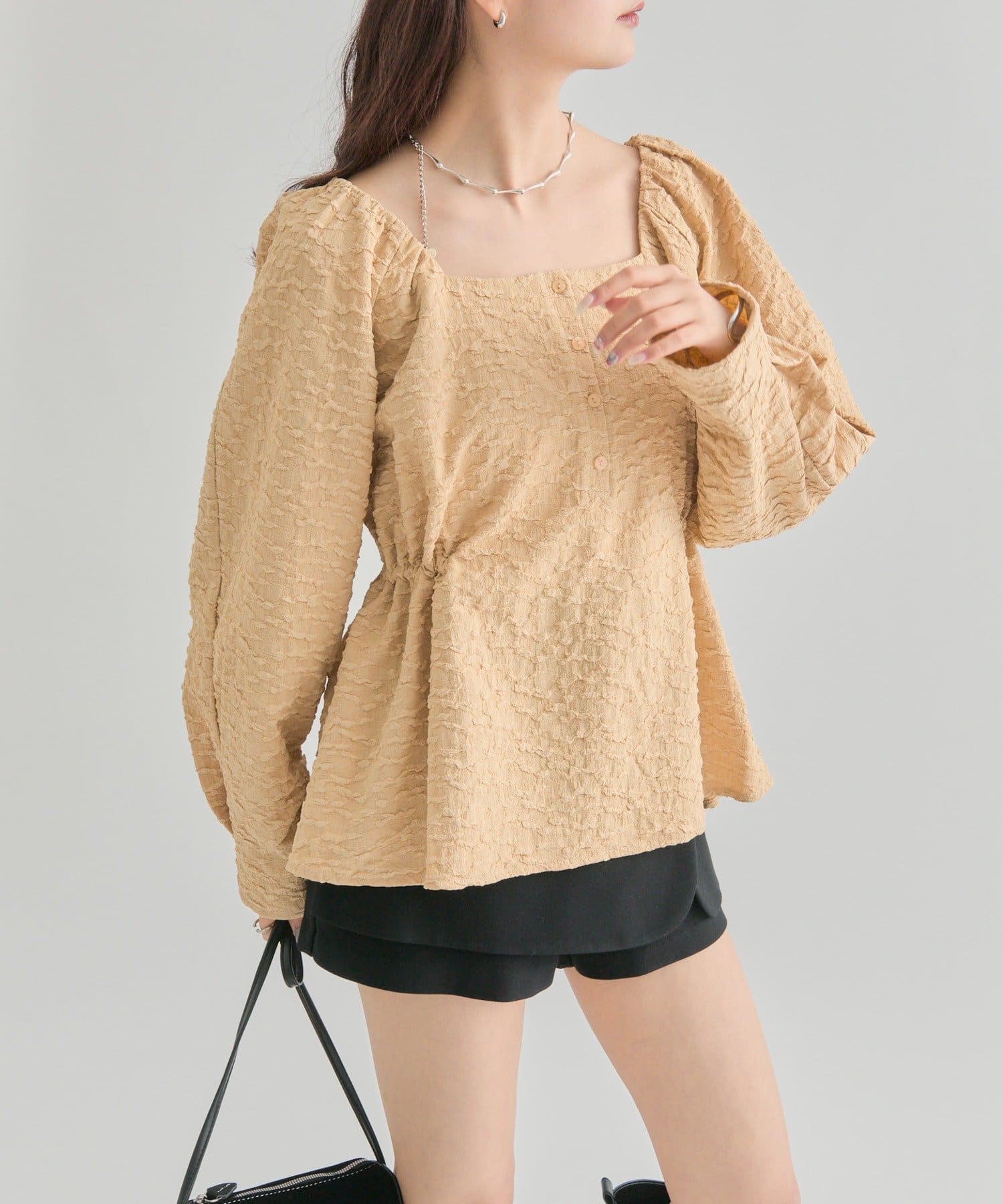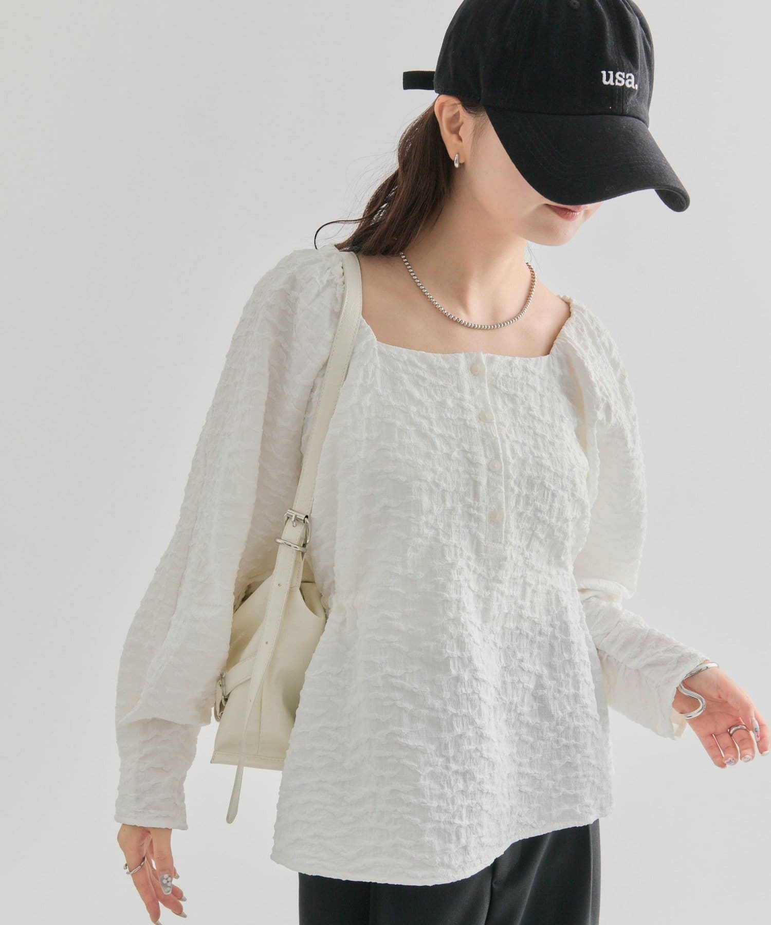 ・夏に人気だったエンボスパフブラウスが長袖になって再登場しました♩ふんわりとしたパフのデザインが可愛らしいのが特徴のブラウスです!
