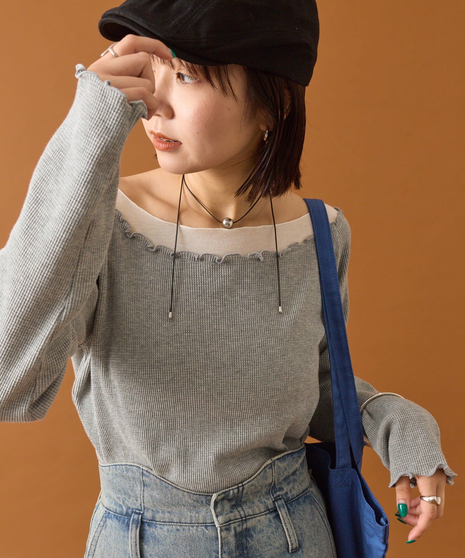 ・カジュアルな印象のワッフル生地と首元・裾部分のフリルがあしらわれたMIXデザインのロンT。