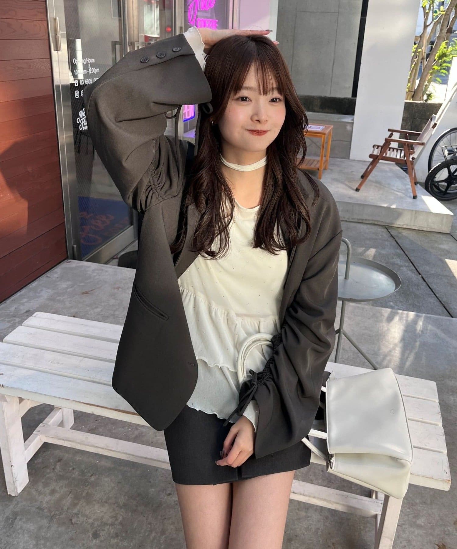購入場所:店舗ネットで見ていた時から入荷を心待ちにしていたドットのトップス!袖口にギャザーが入っていて細見えするデザインが可愛い。上からベルトを付けたり、カーディガンを羽織ったりして着たい♡