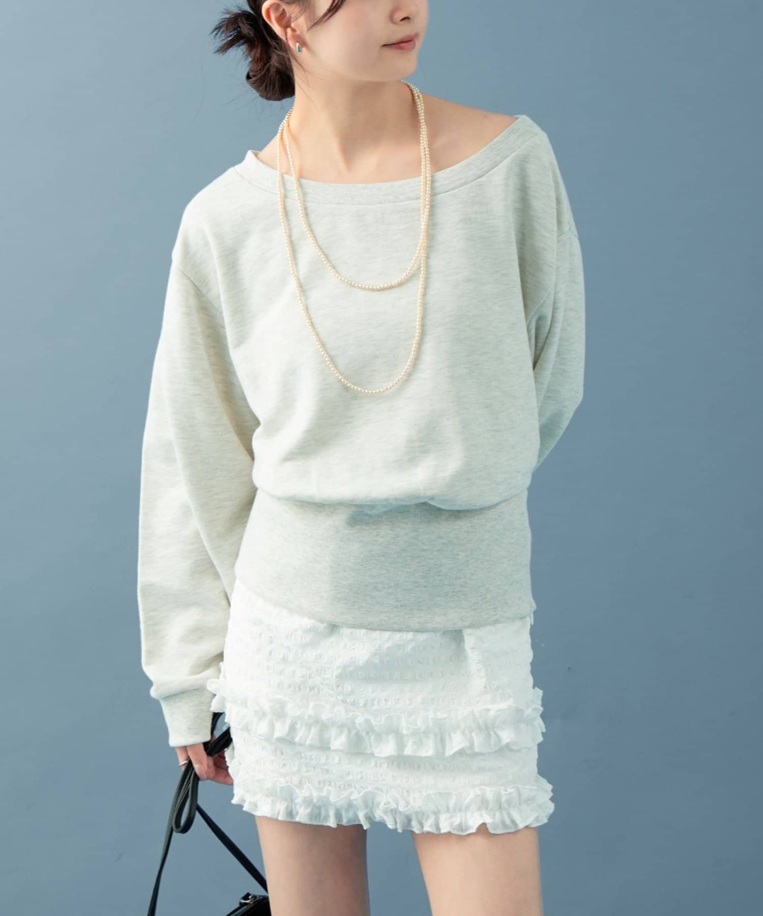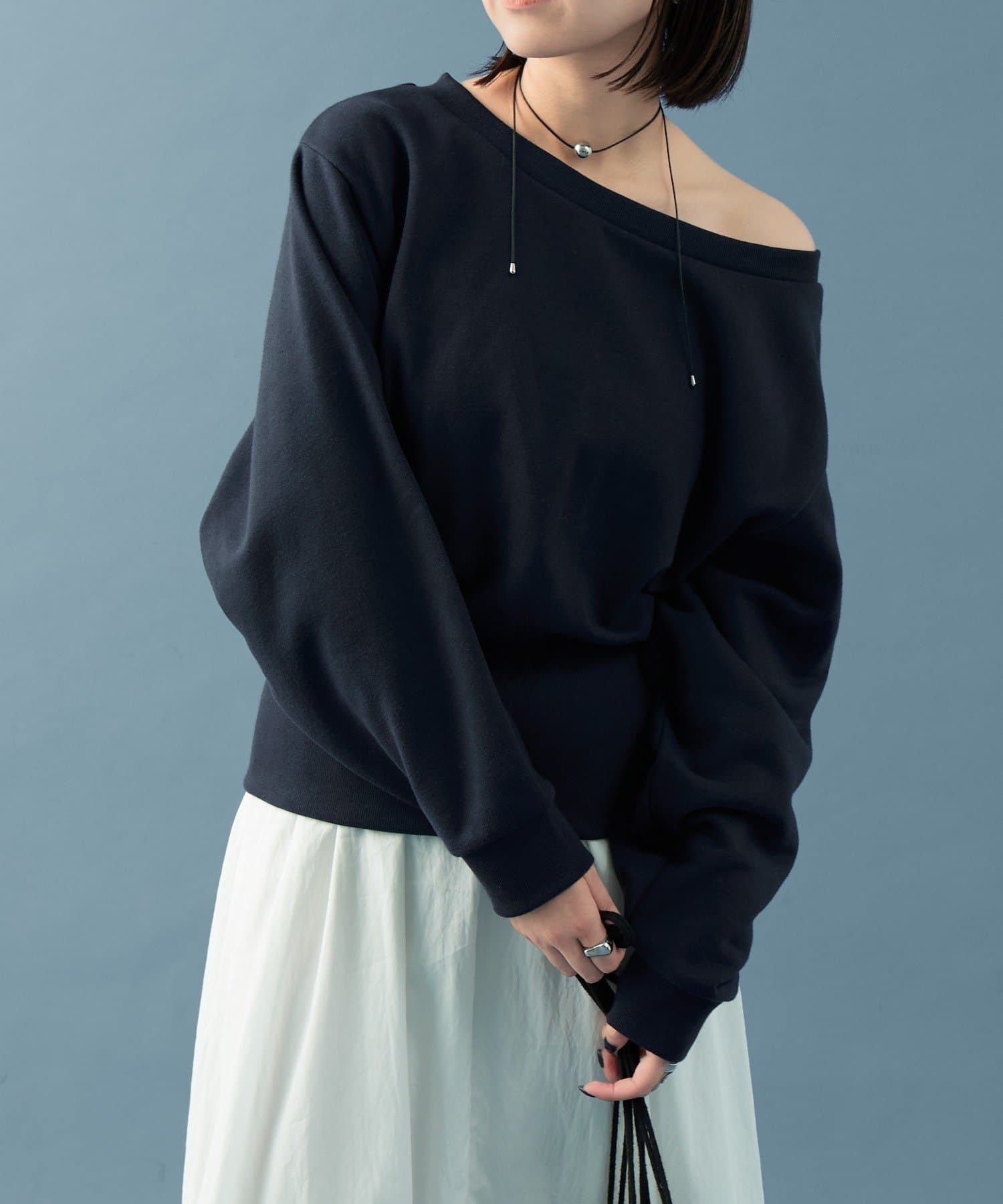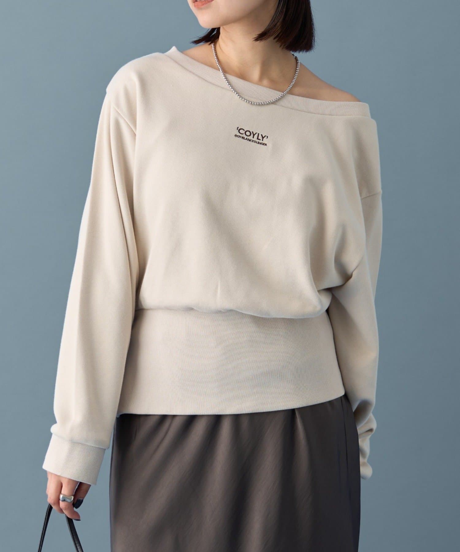 スウェットのカジュアルさとオフショルの肌見せの女性らしさでこなれ感が出るのが嬉しいです◎
