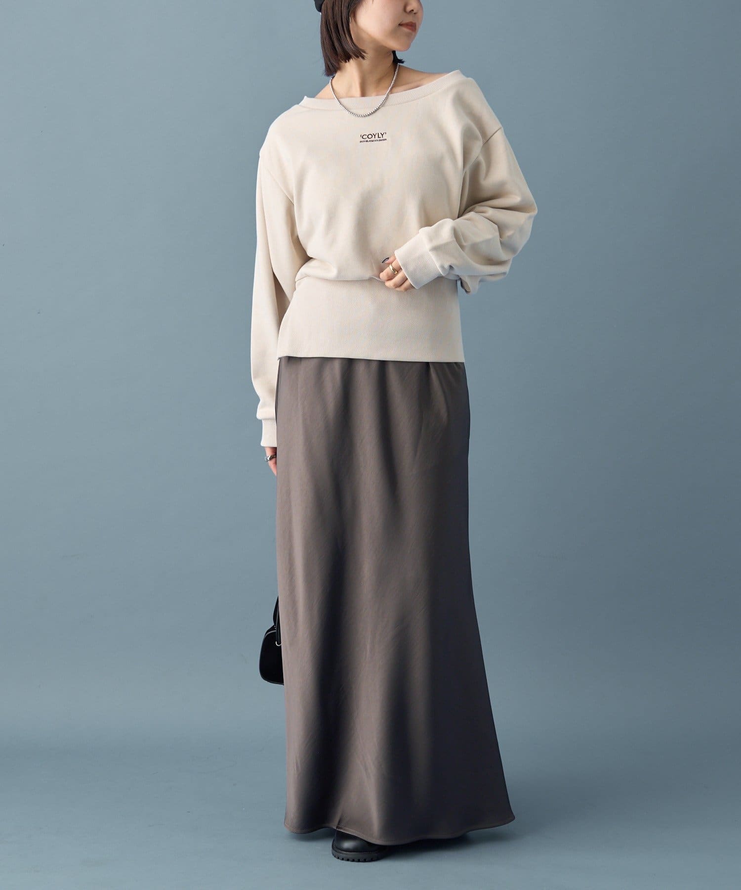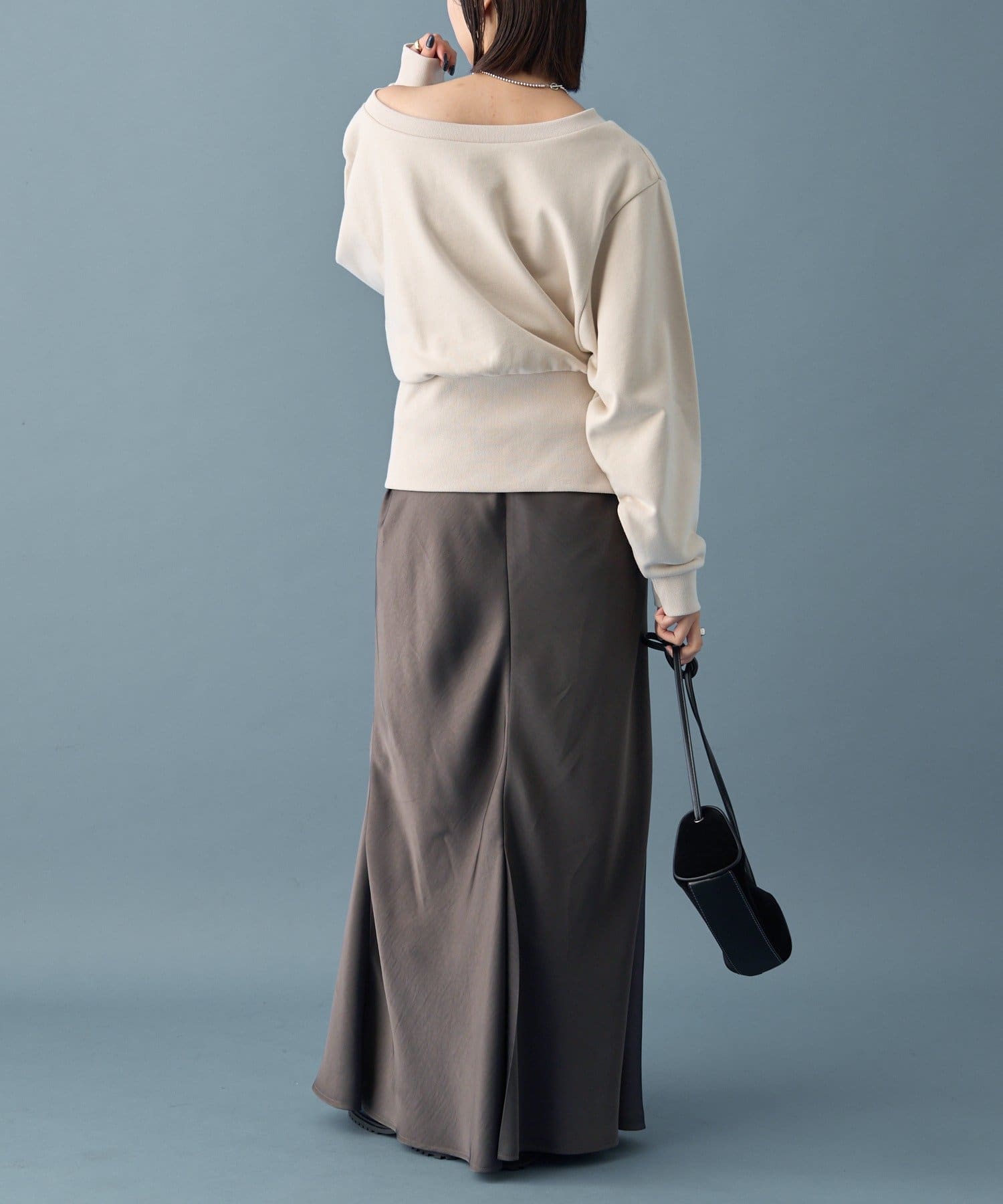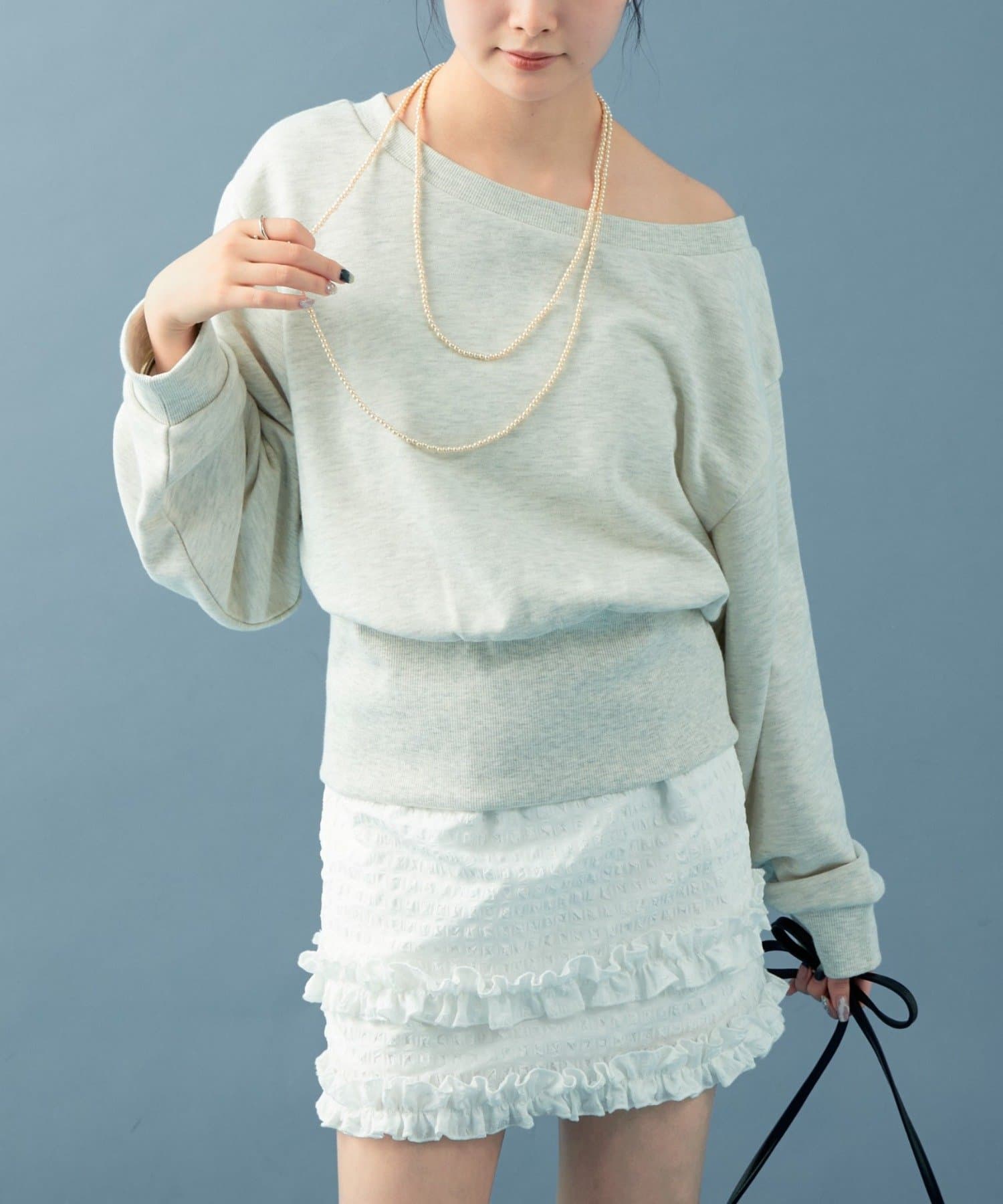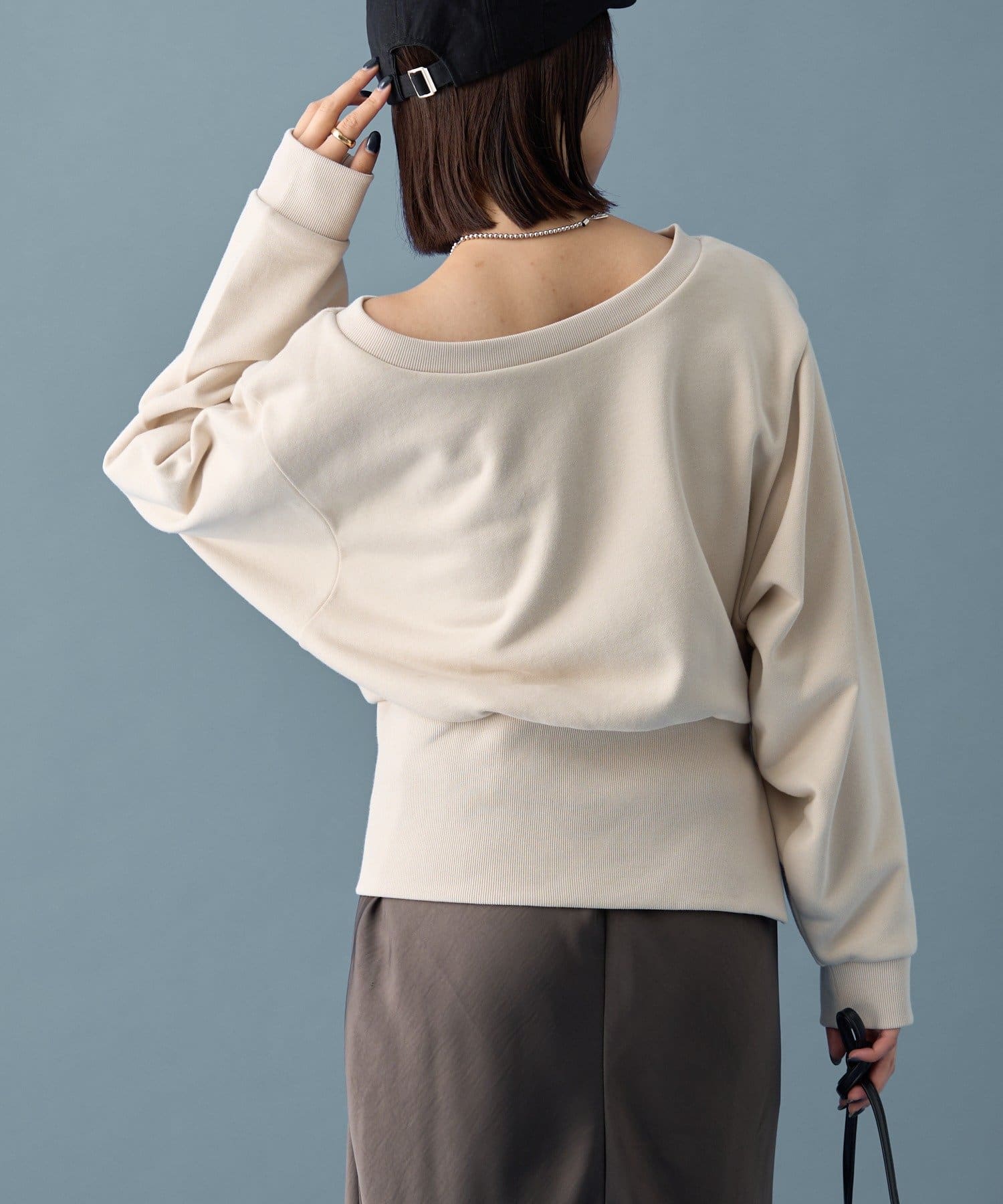 スウェットのカジュアルさとオフショルの肌見せの女性らしさでこなれ感が出るのが嬉しいです◎
