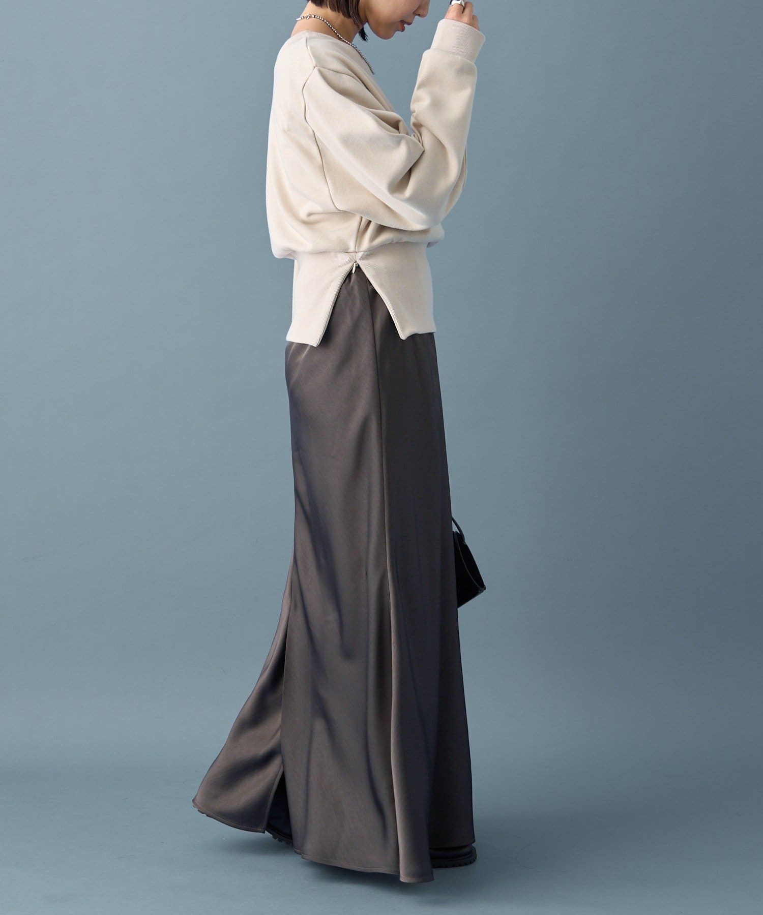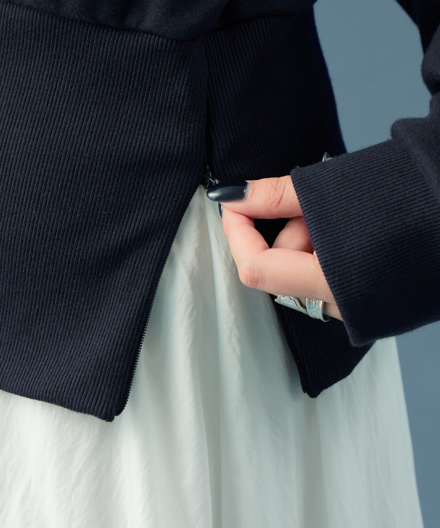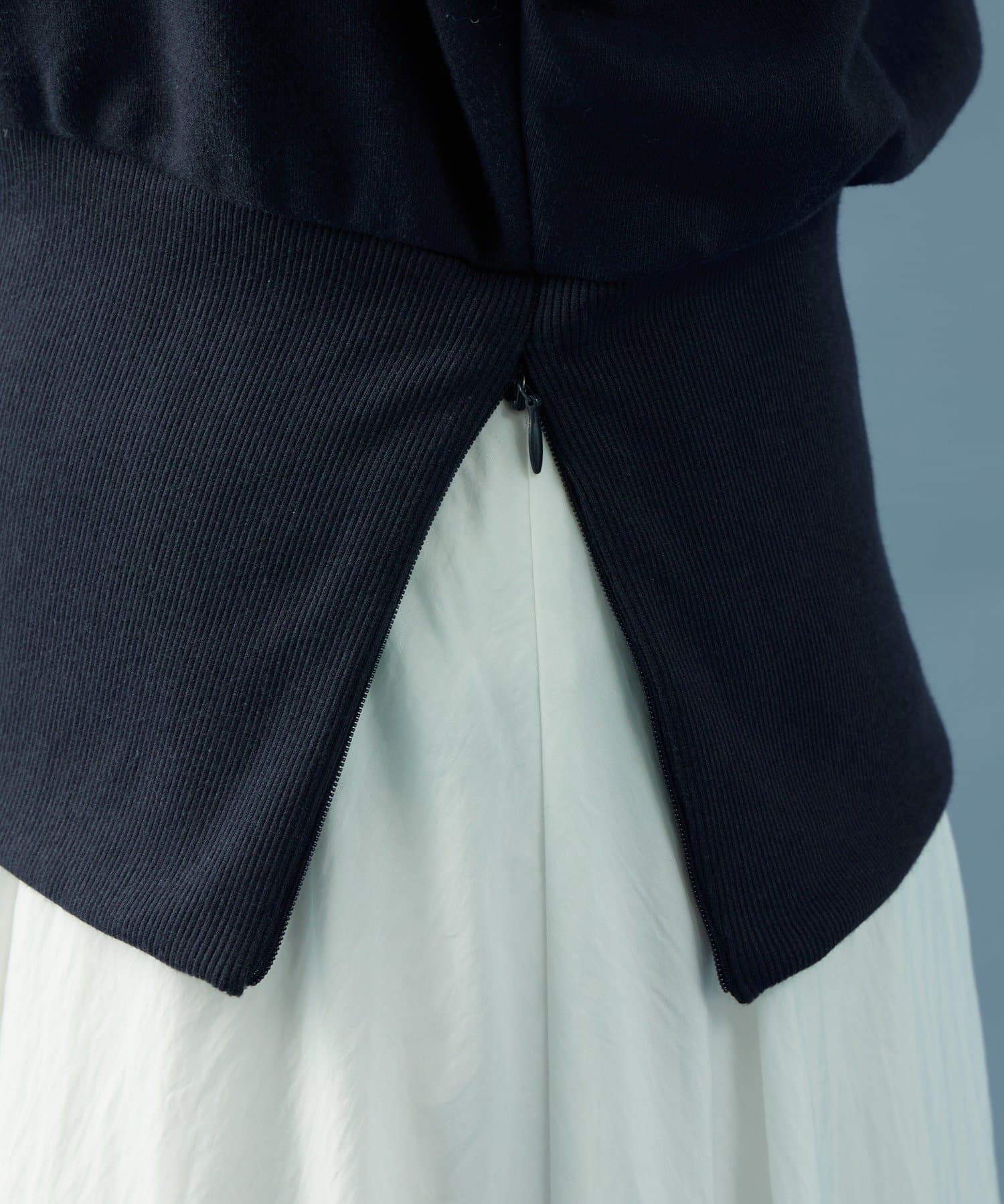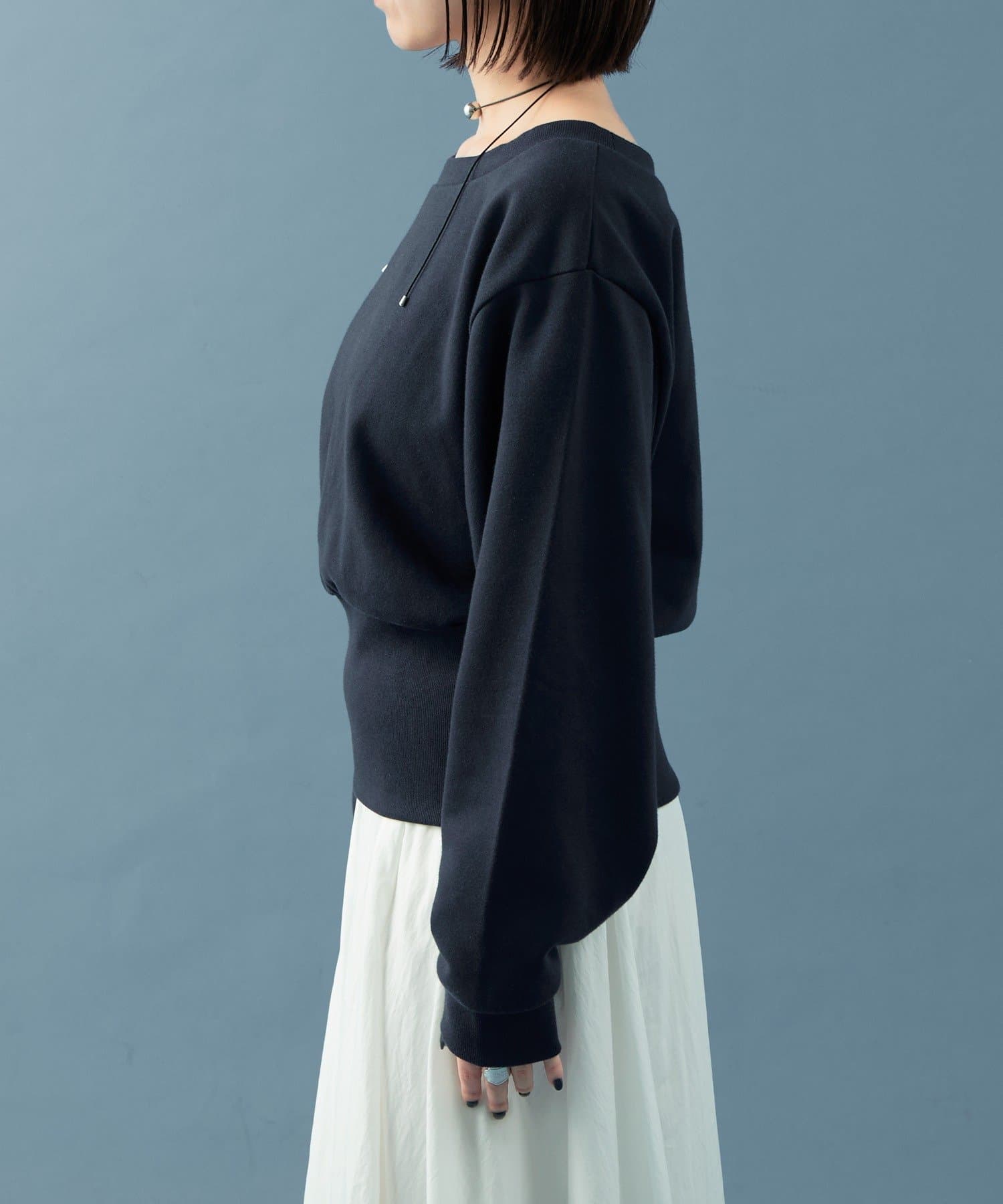 ・裾がリブ素材になっており、スウェット部分のふんわりシルエットからすっきりとしたシルエットに◎スタイルアップの効果も!