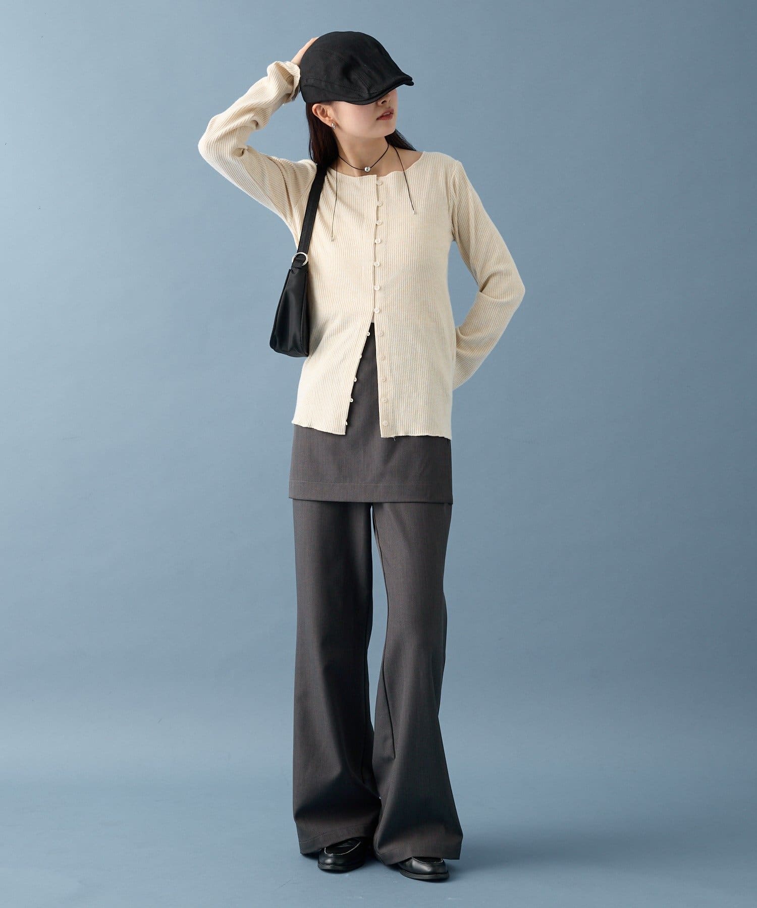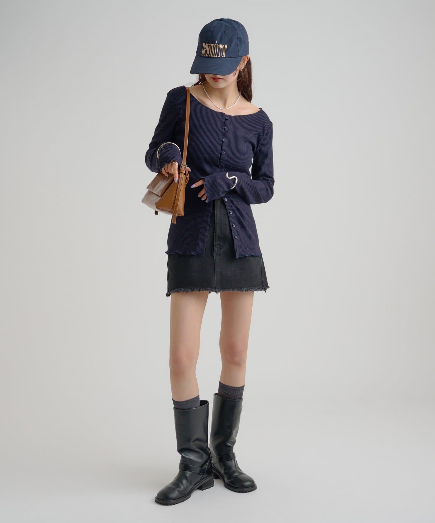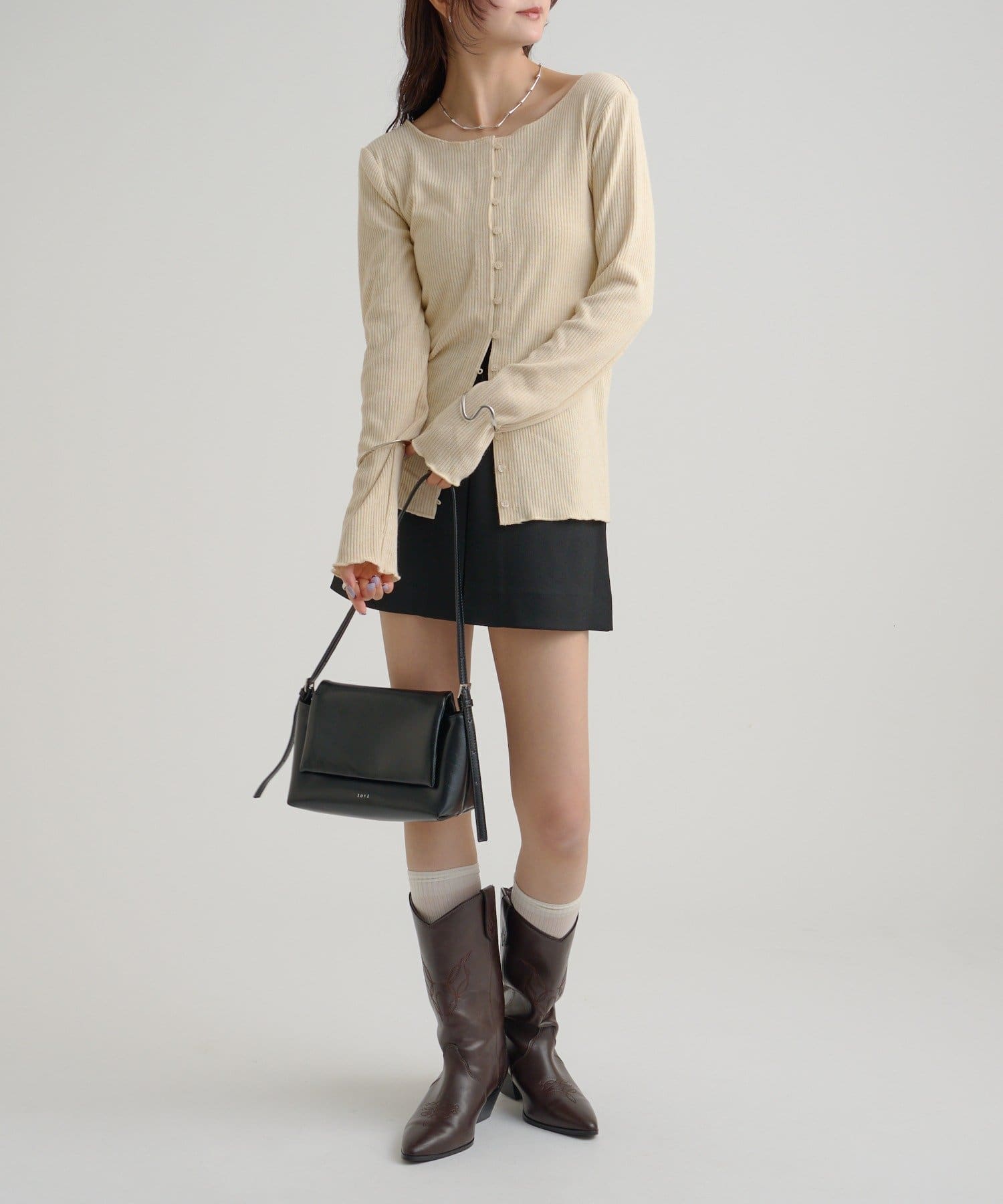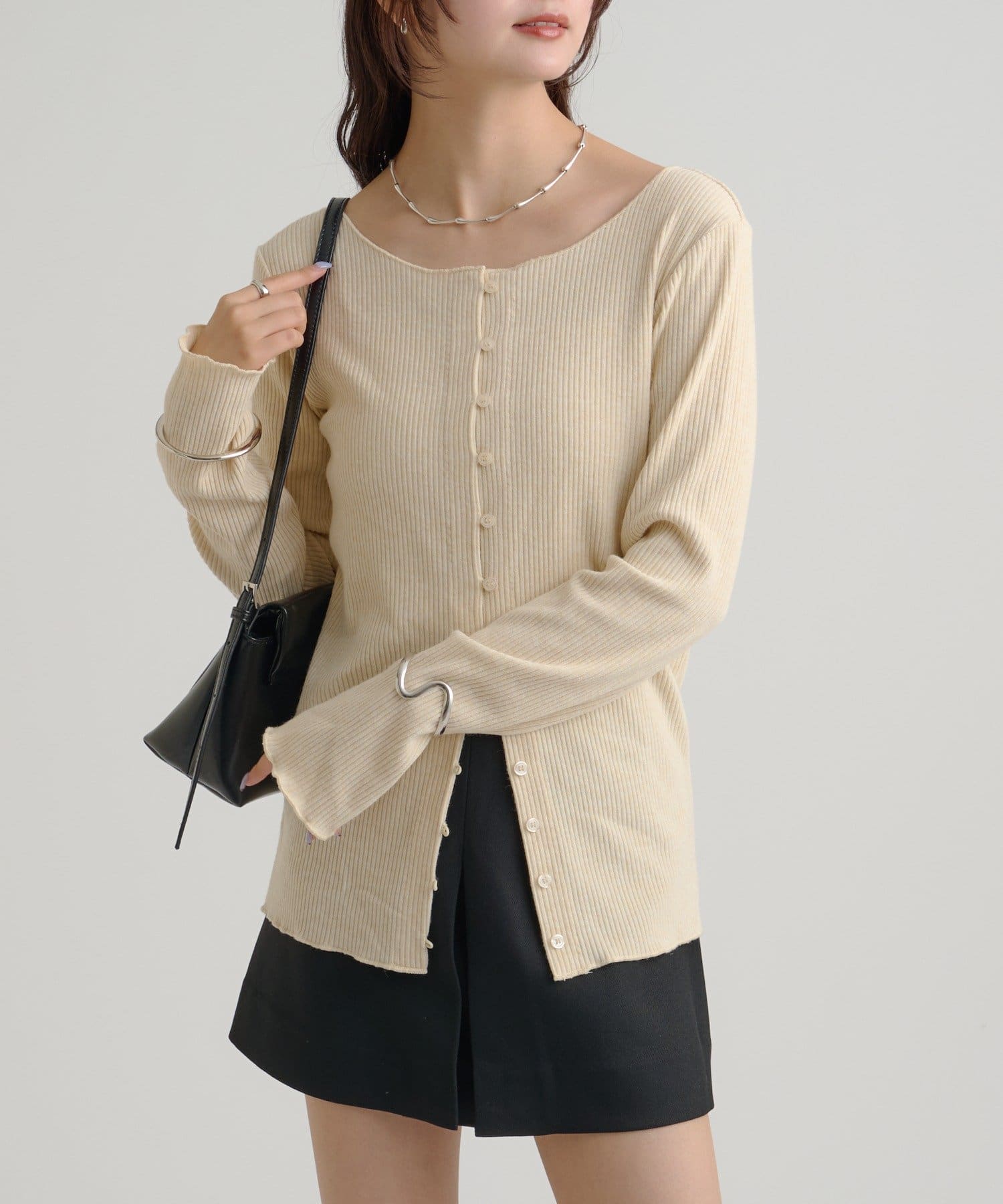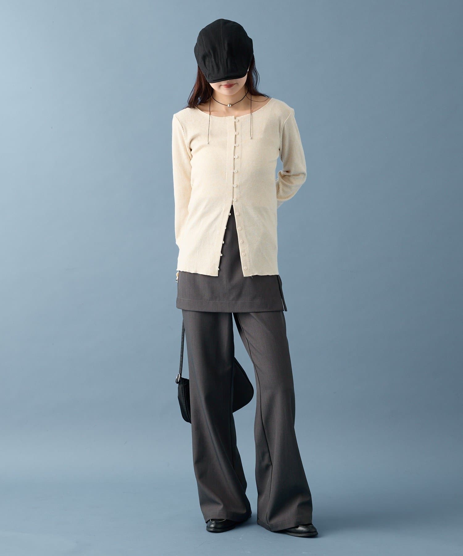 ・カーディガンが長めのデザインなので、ミニ丈のボトムスと合わせも可愛く決まります!