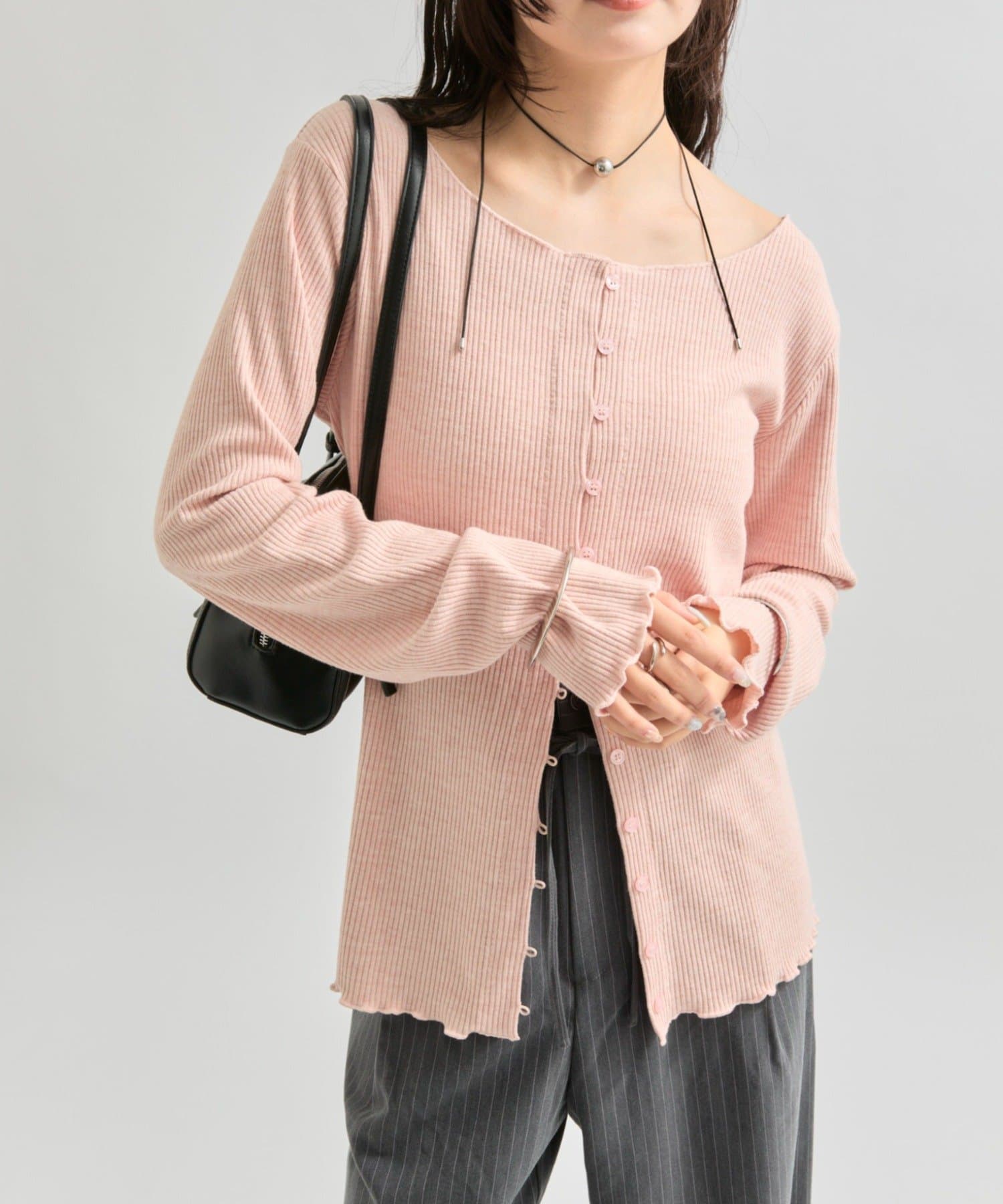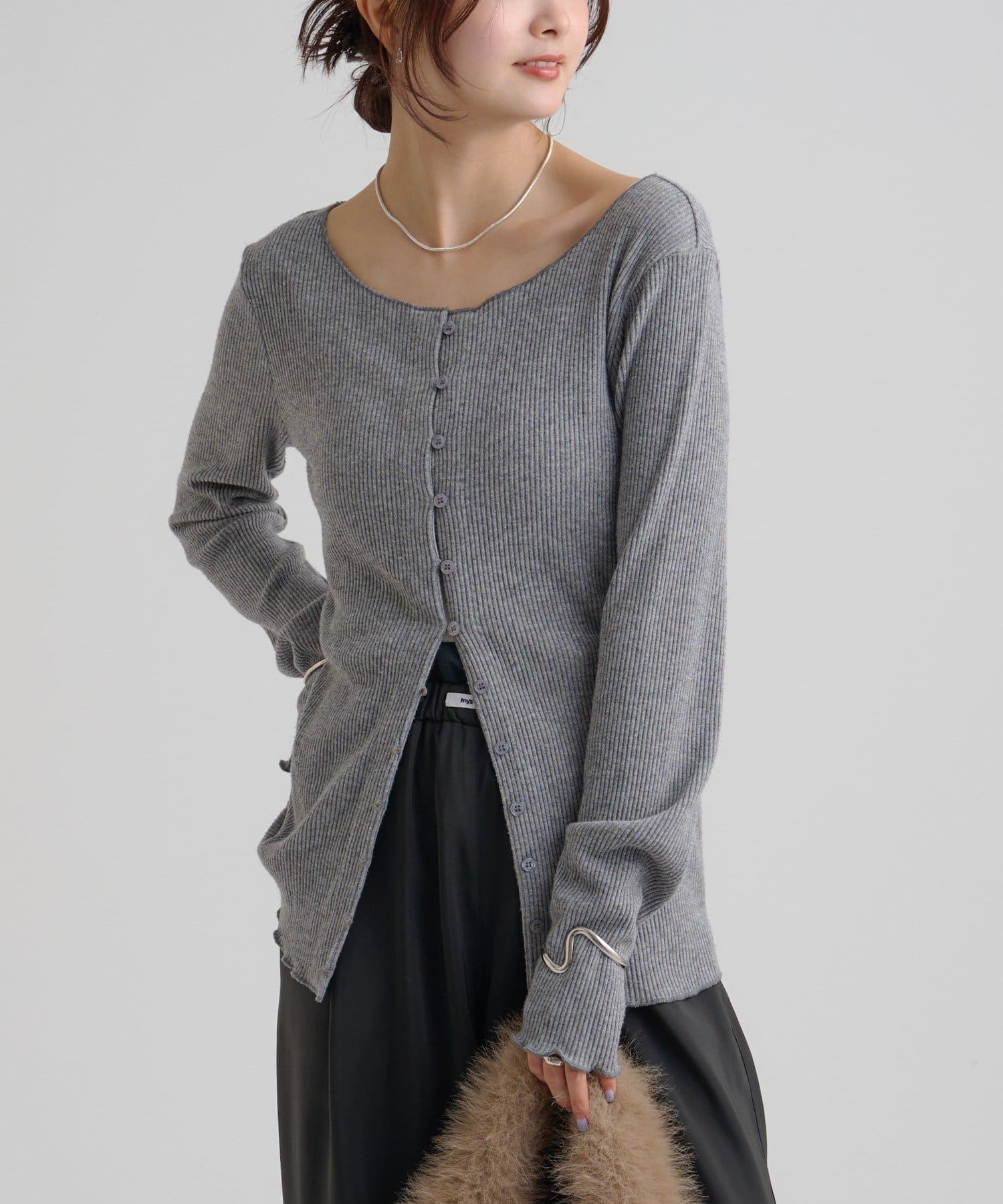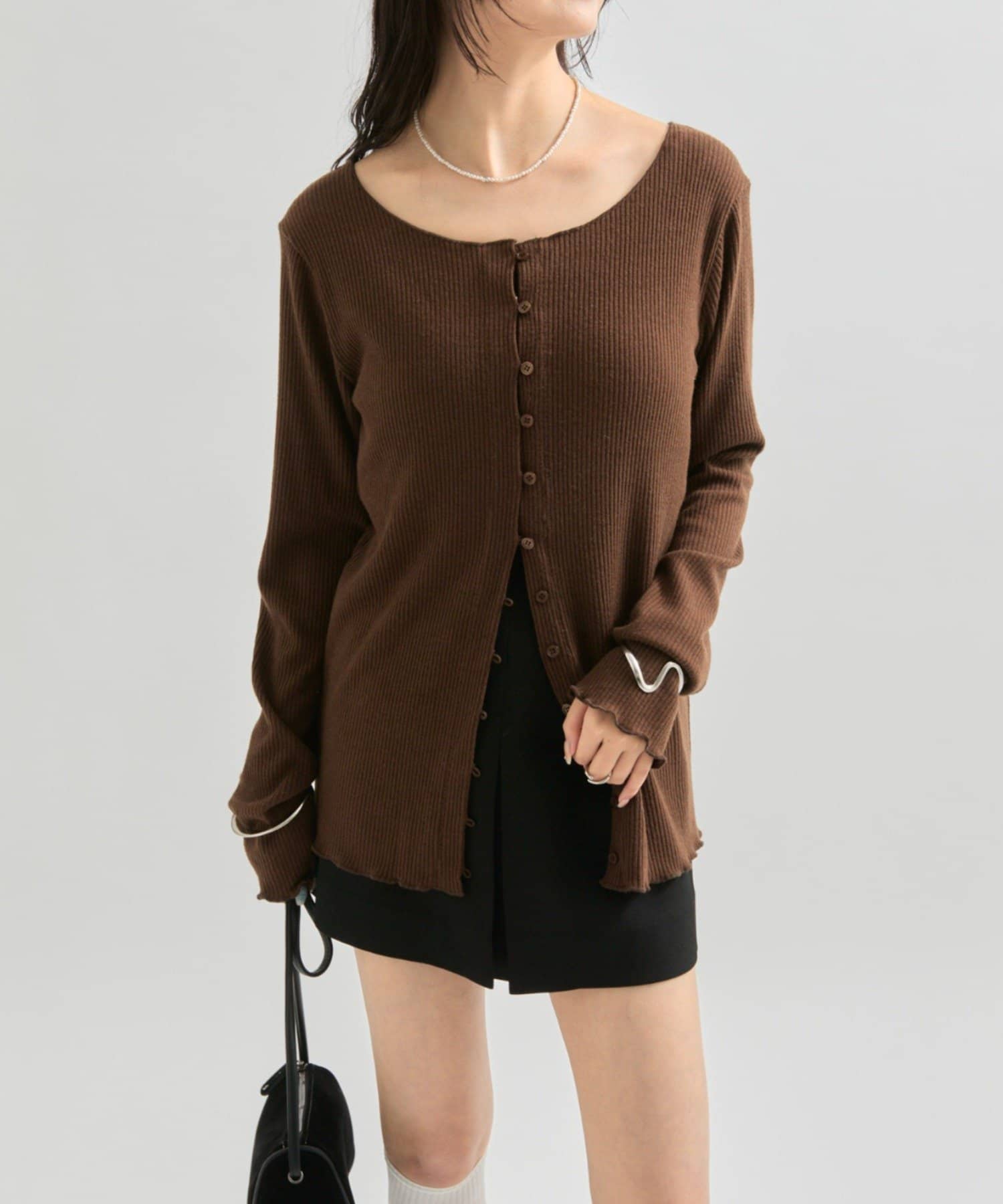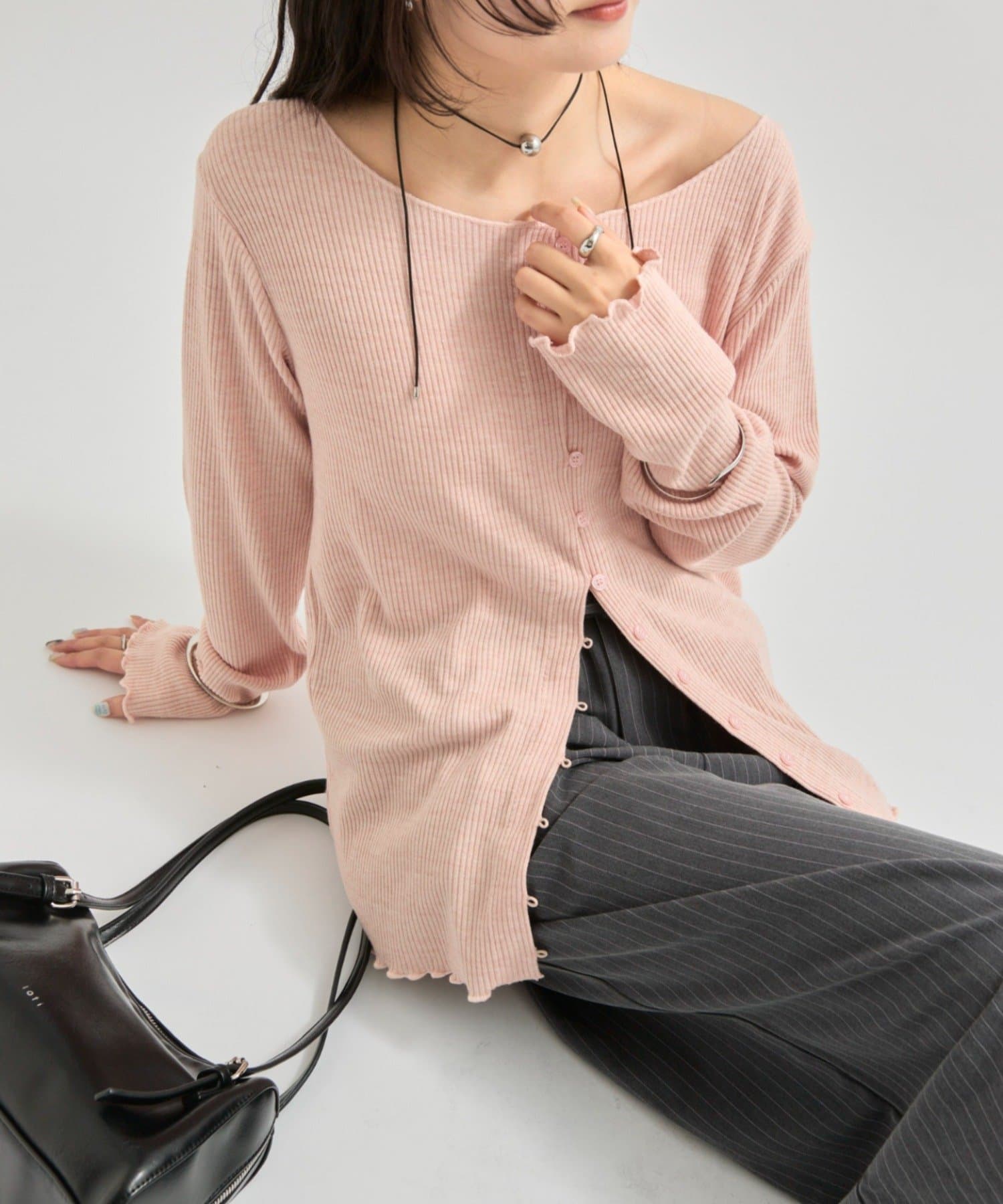 ・シンプルなデザインで、どんなコーディネートにも合わせやすいリブニットカーディガン。