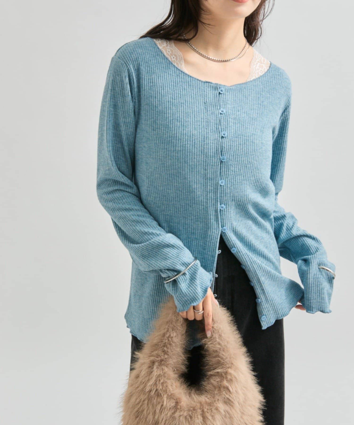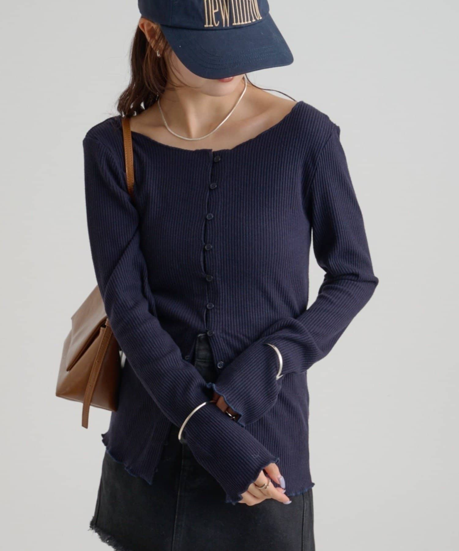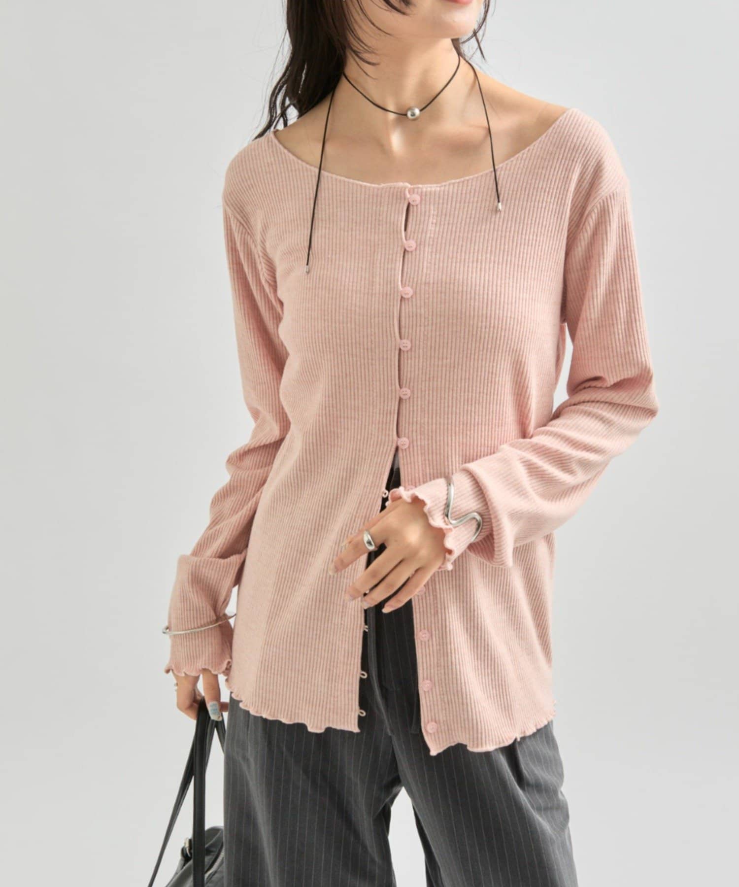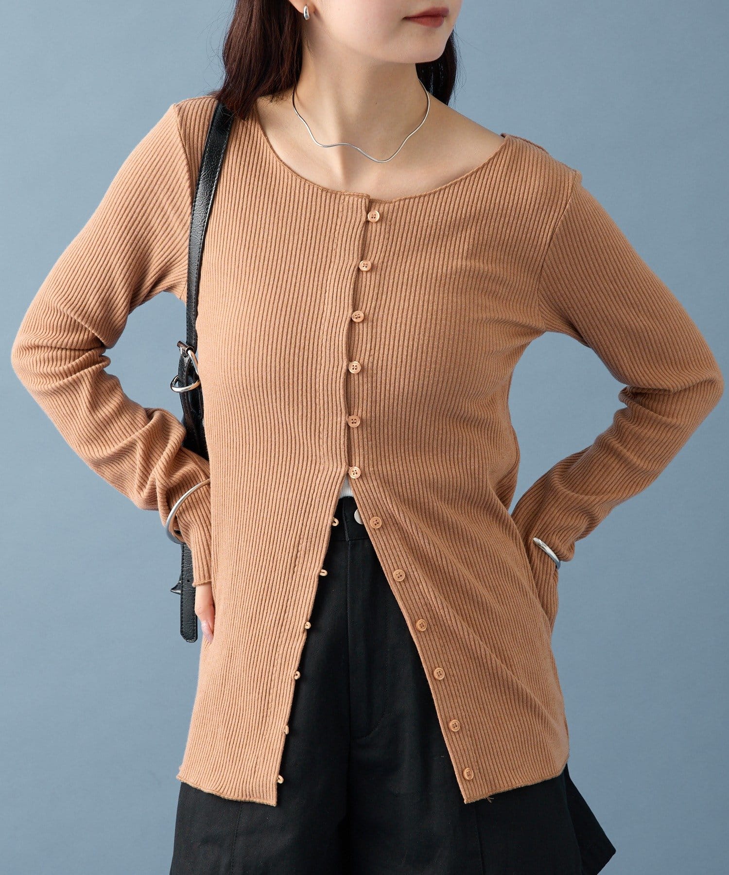 ・シンプルなデザインで、どんなコーディネートにも合わせやすいリブニットカーディガン。
