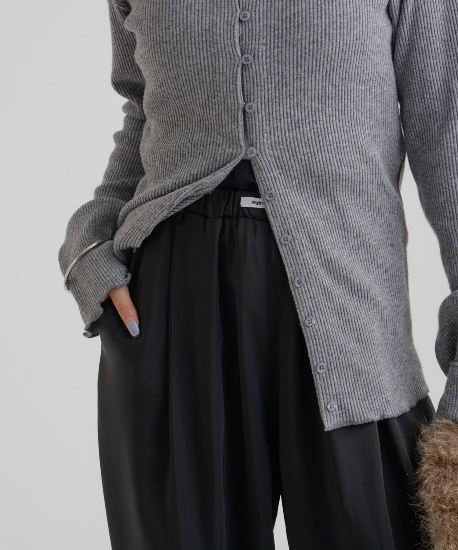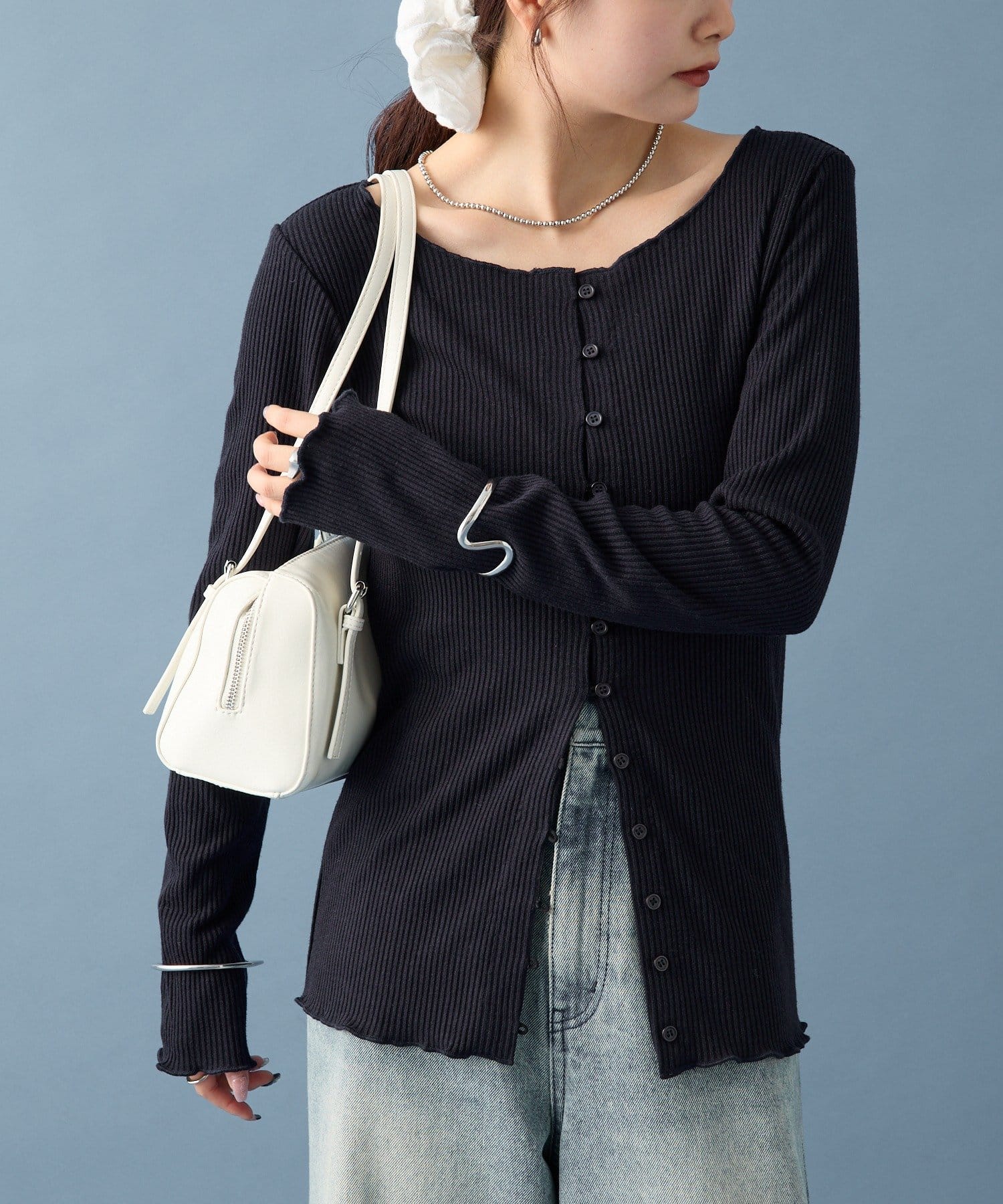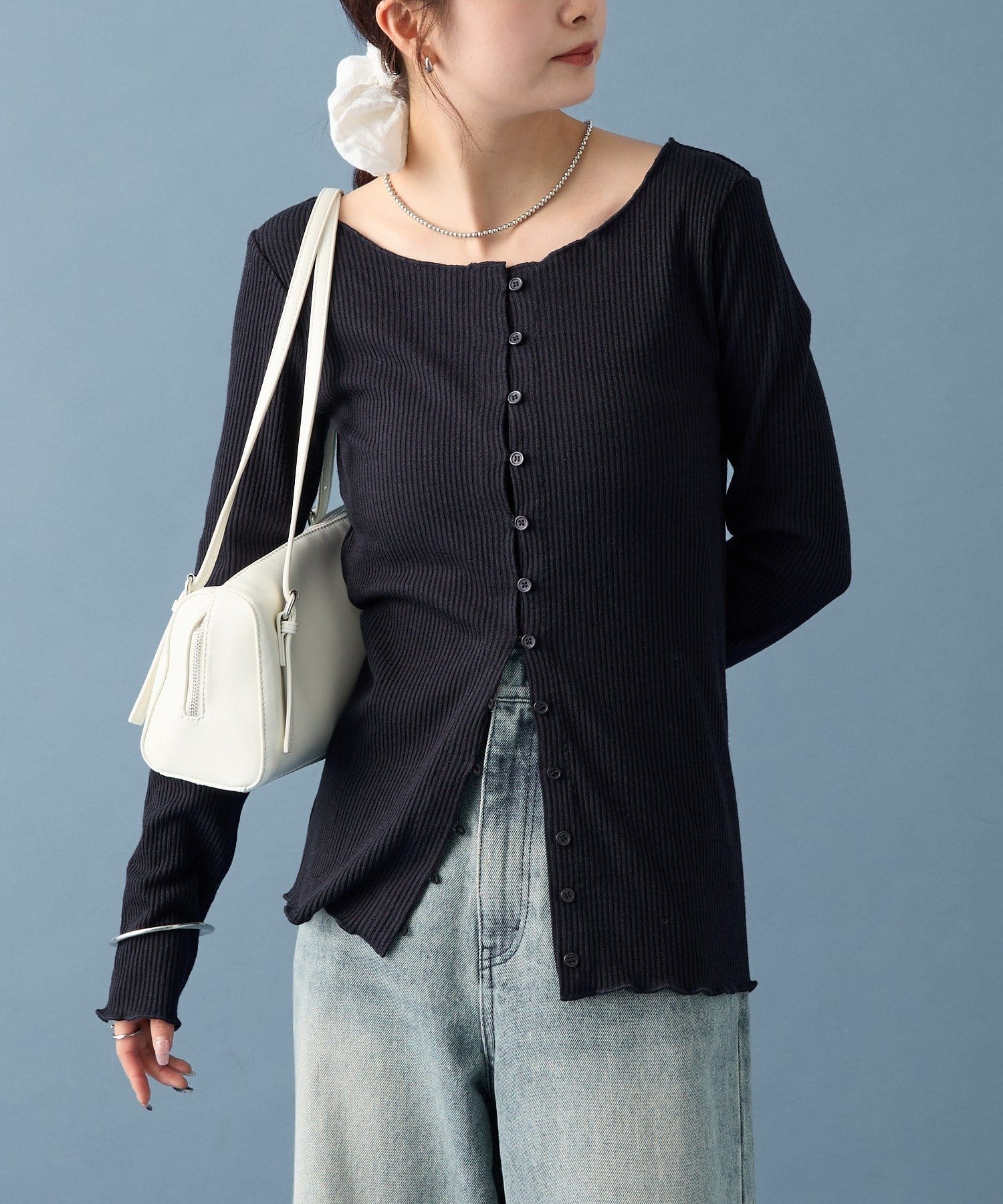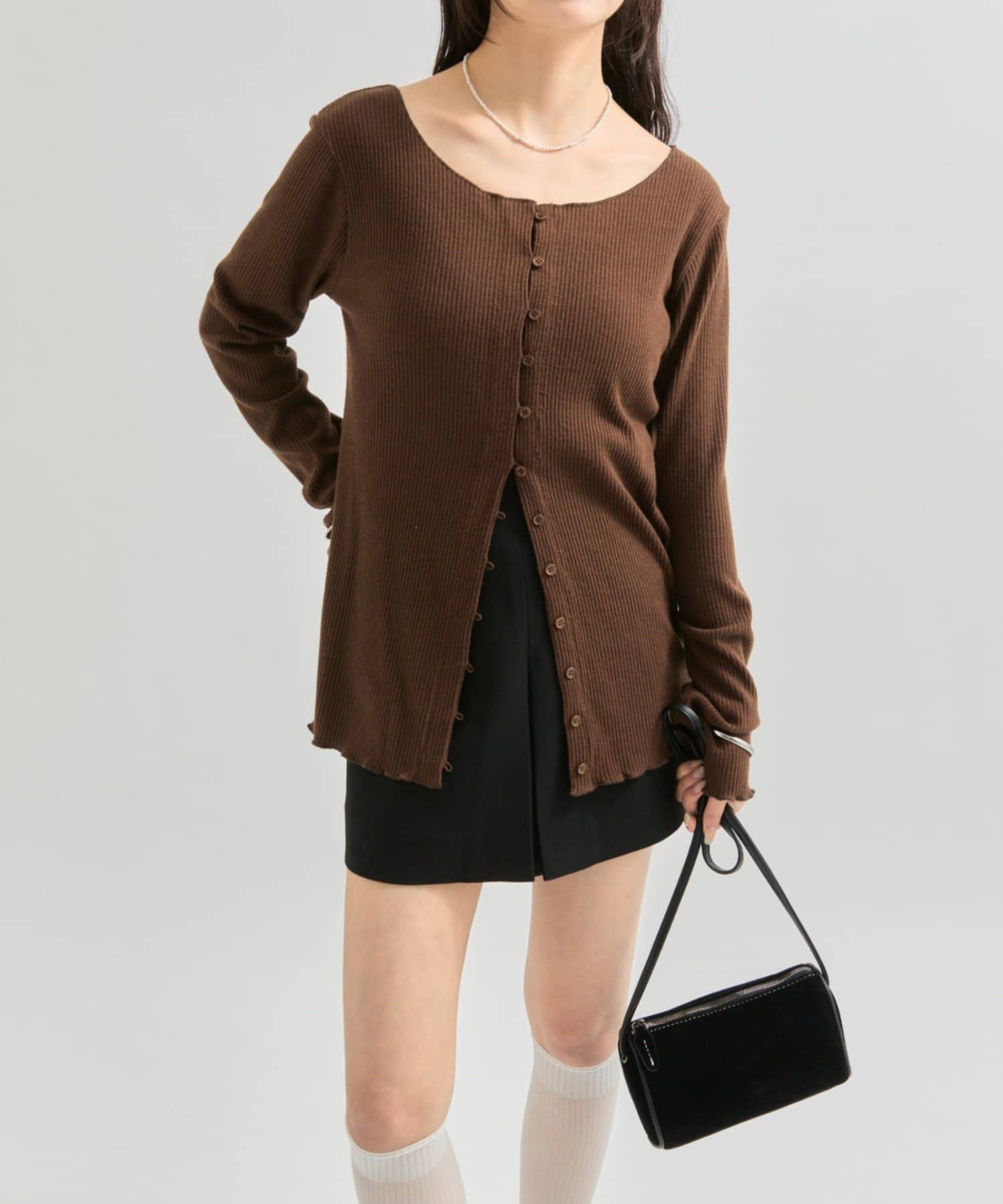 ・シンプルなデザインで、どんなコーディネートにも合わせやすいリブニットカーディガン。