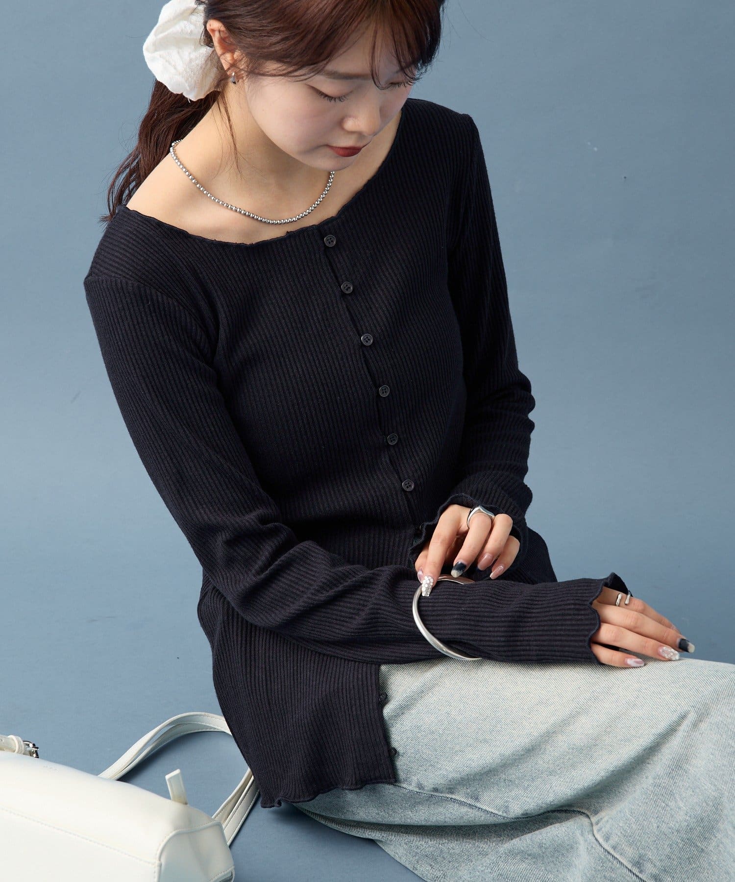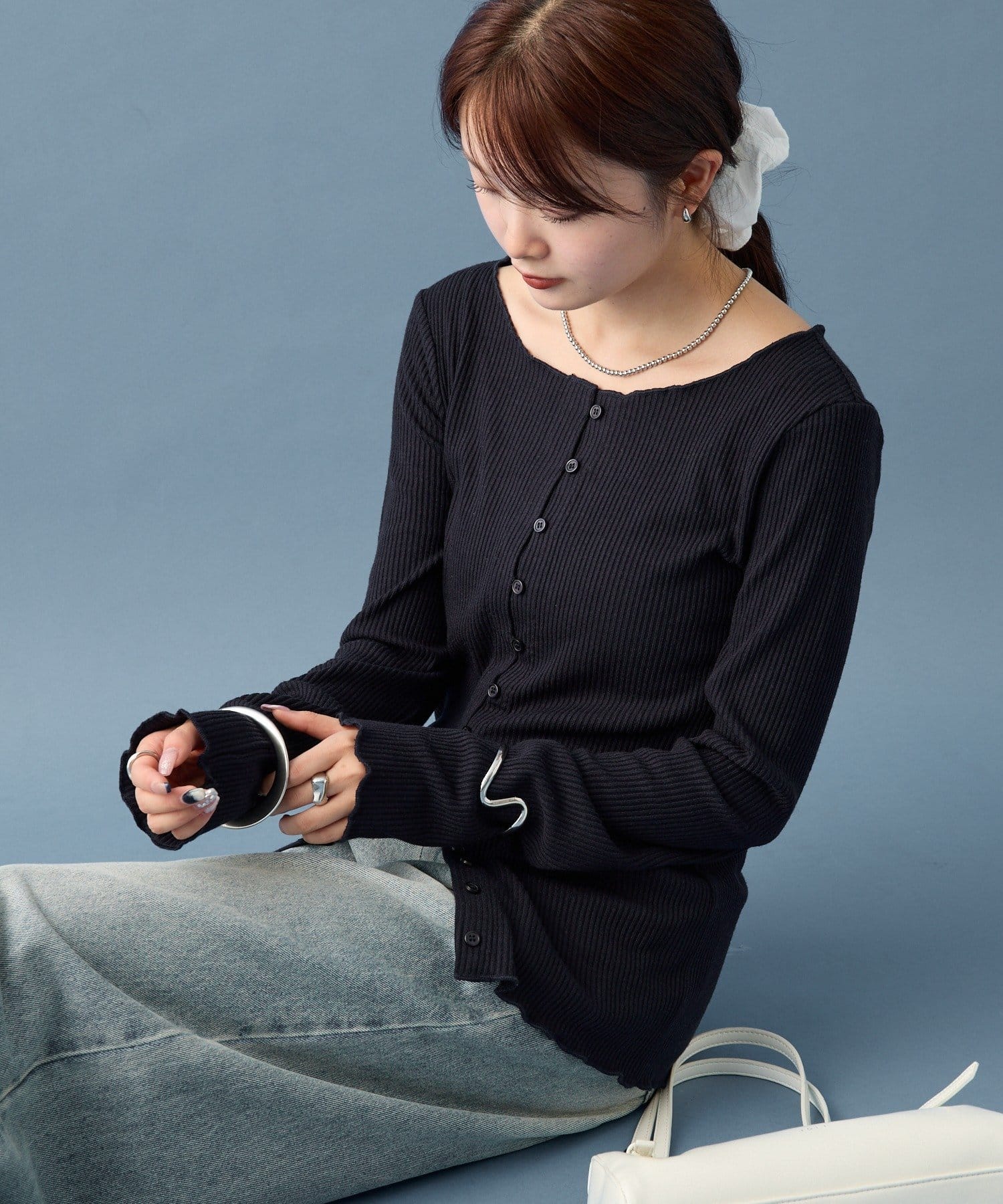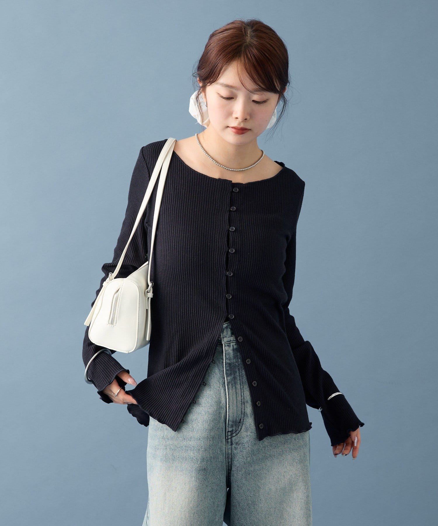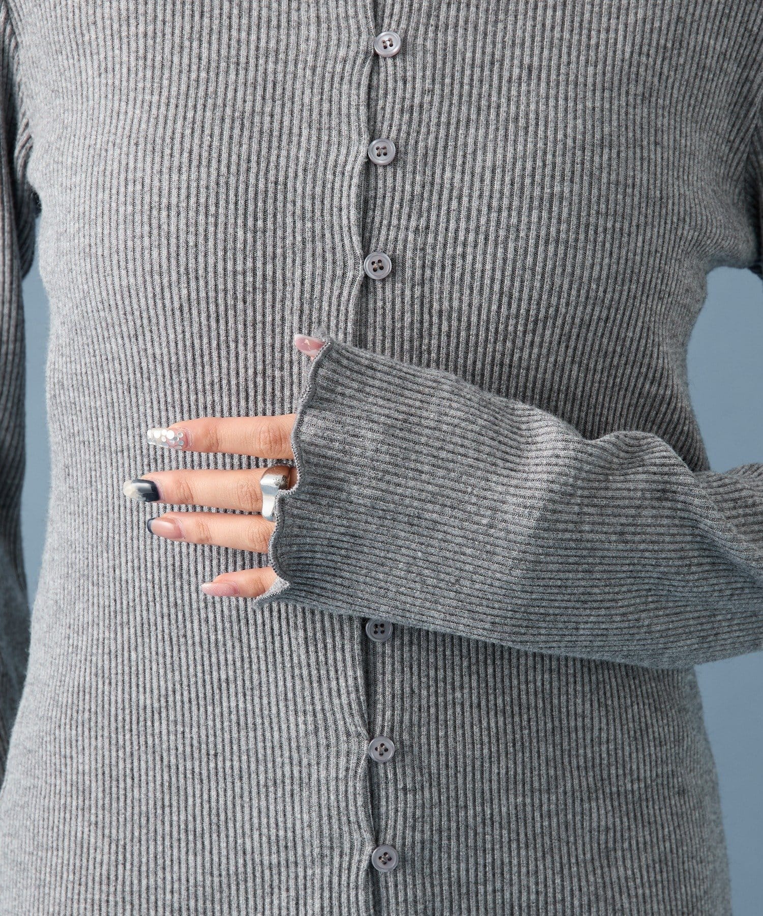 ・シンプルなデザインで、どんなコーディネートにも合わせやすいリブニットカーディガン。