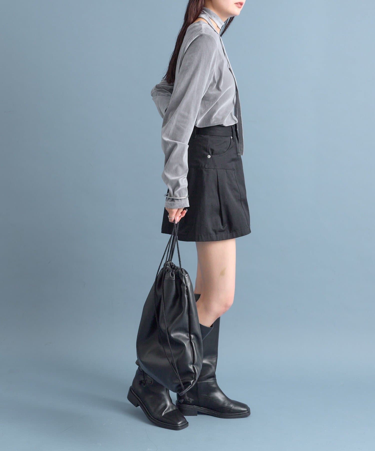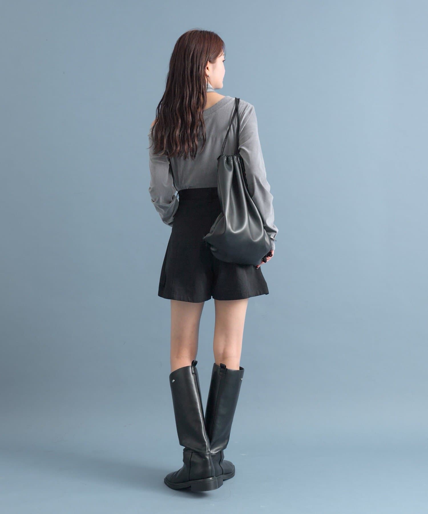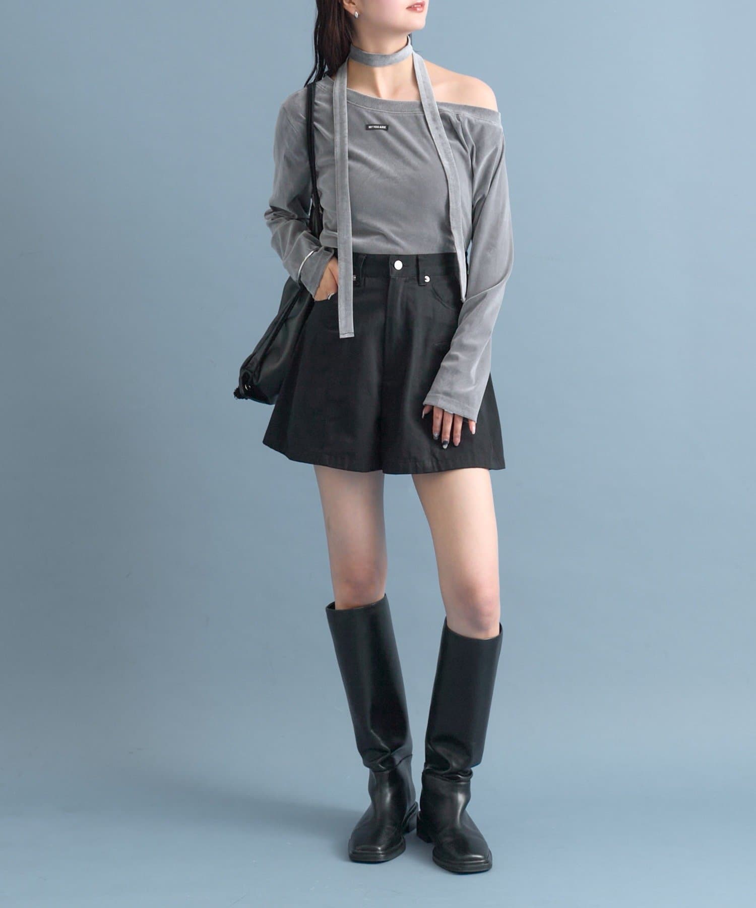 ・ミニ丈のボトムスやロングブーツを合わせてヘルシーなスタイリングに。