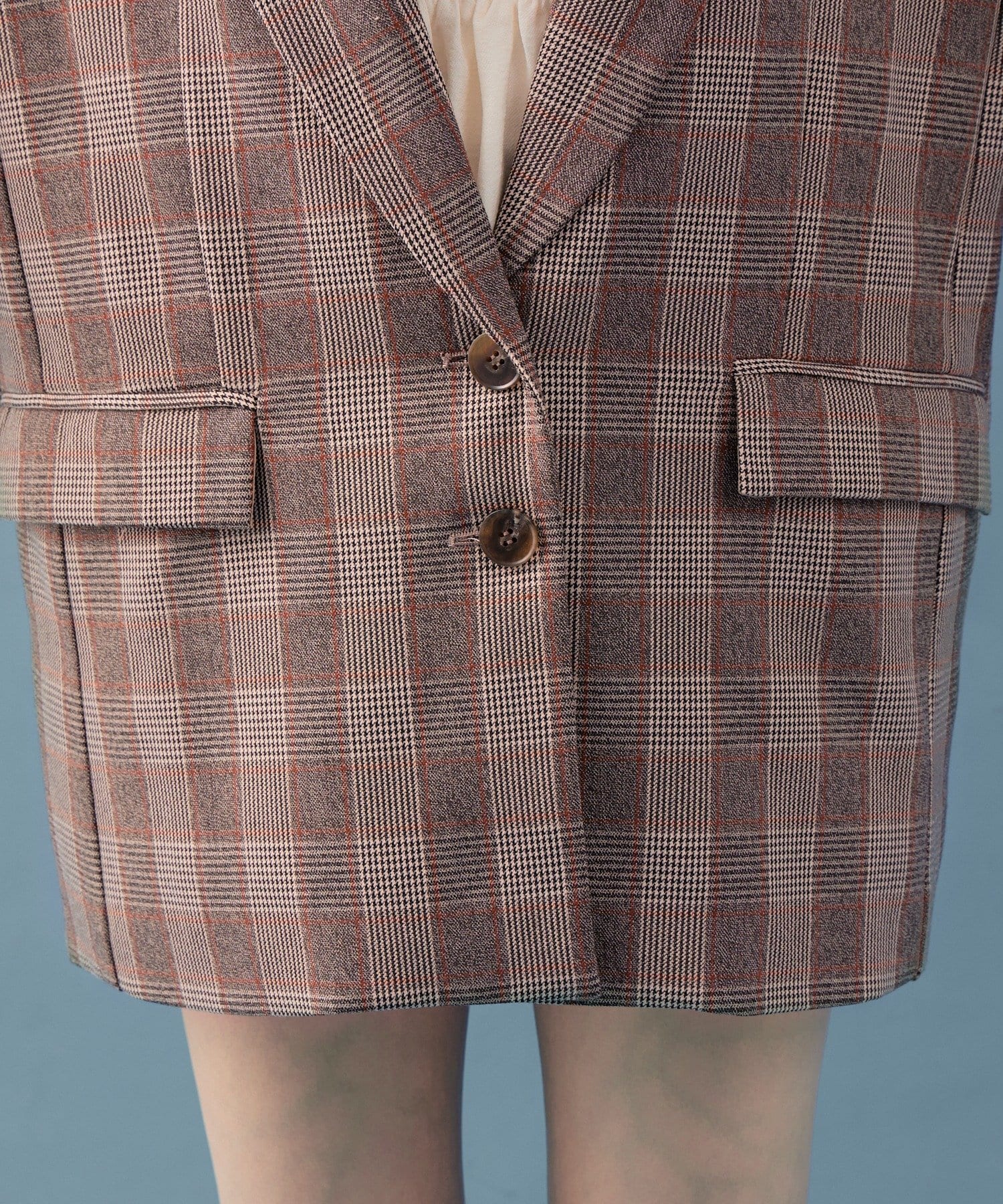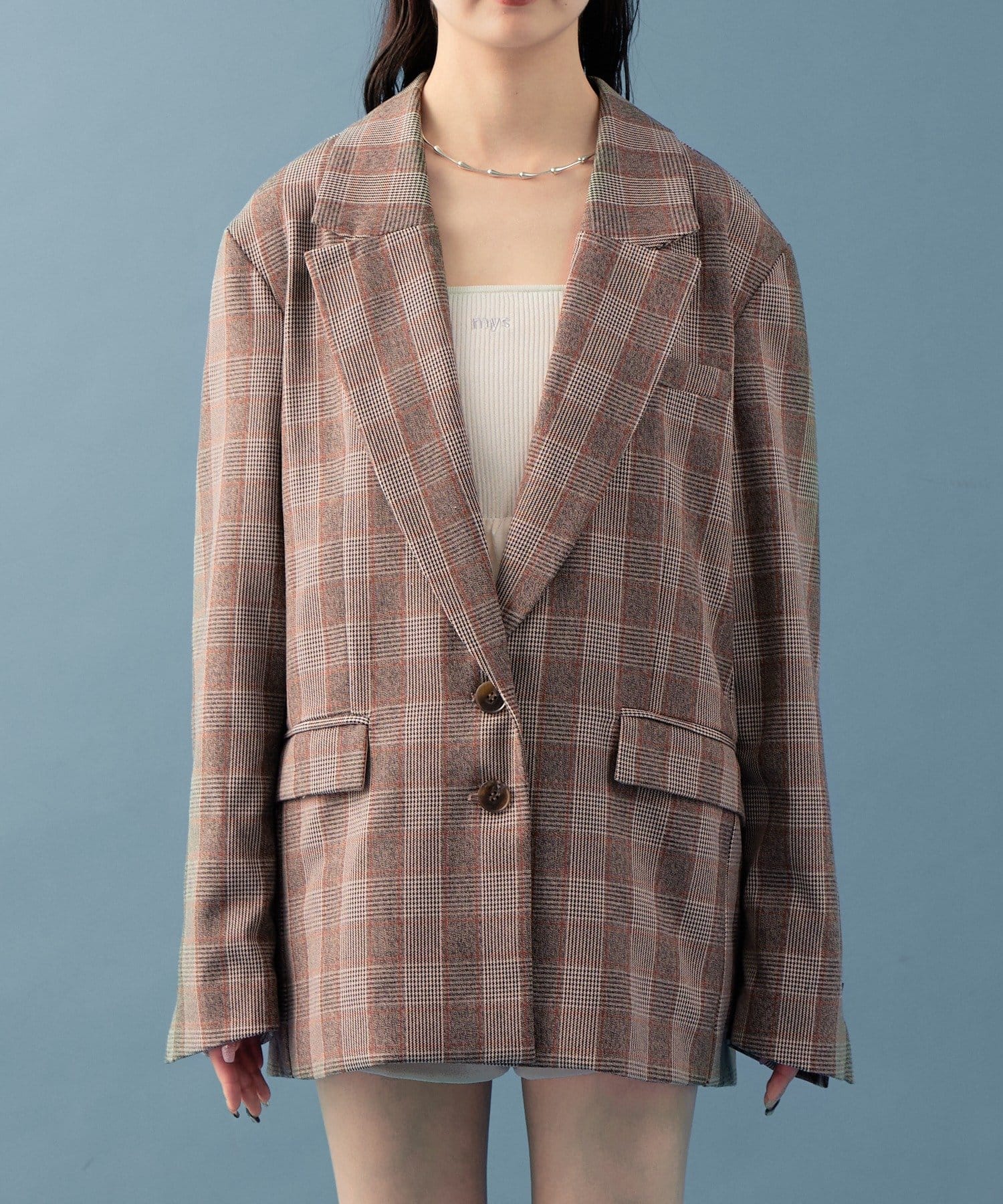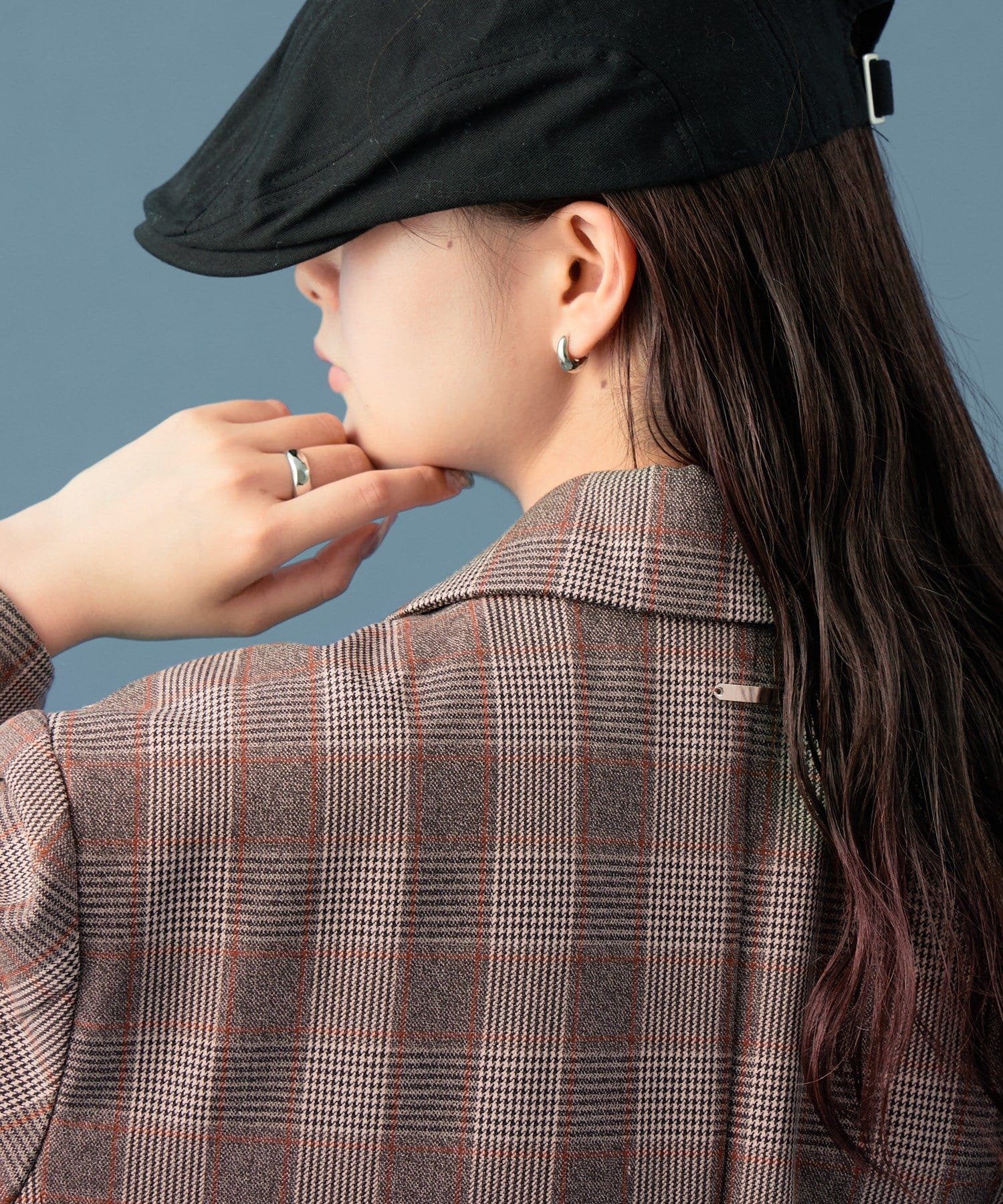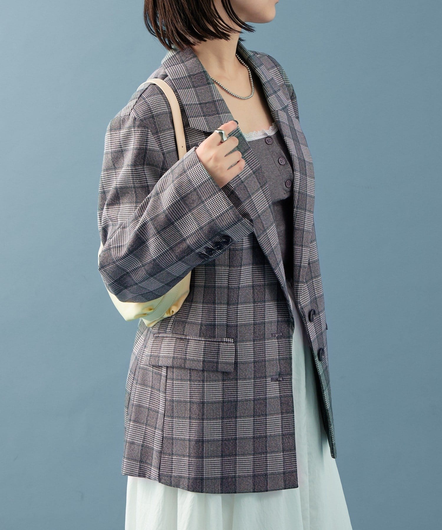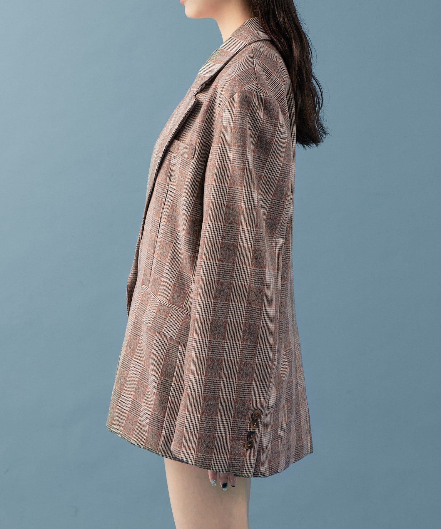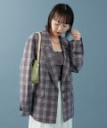 ・落ち着いた色味の大人っぽさを感じられるチェックジャケット。トレンド感のある大きめのサイズ感が可愛らしさもプラス。