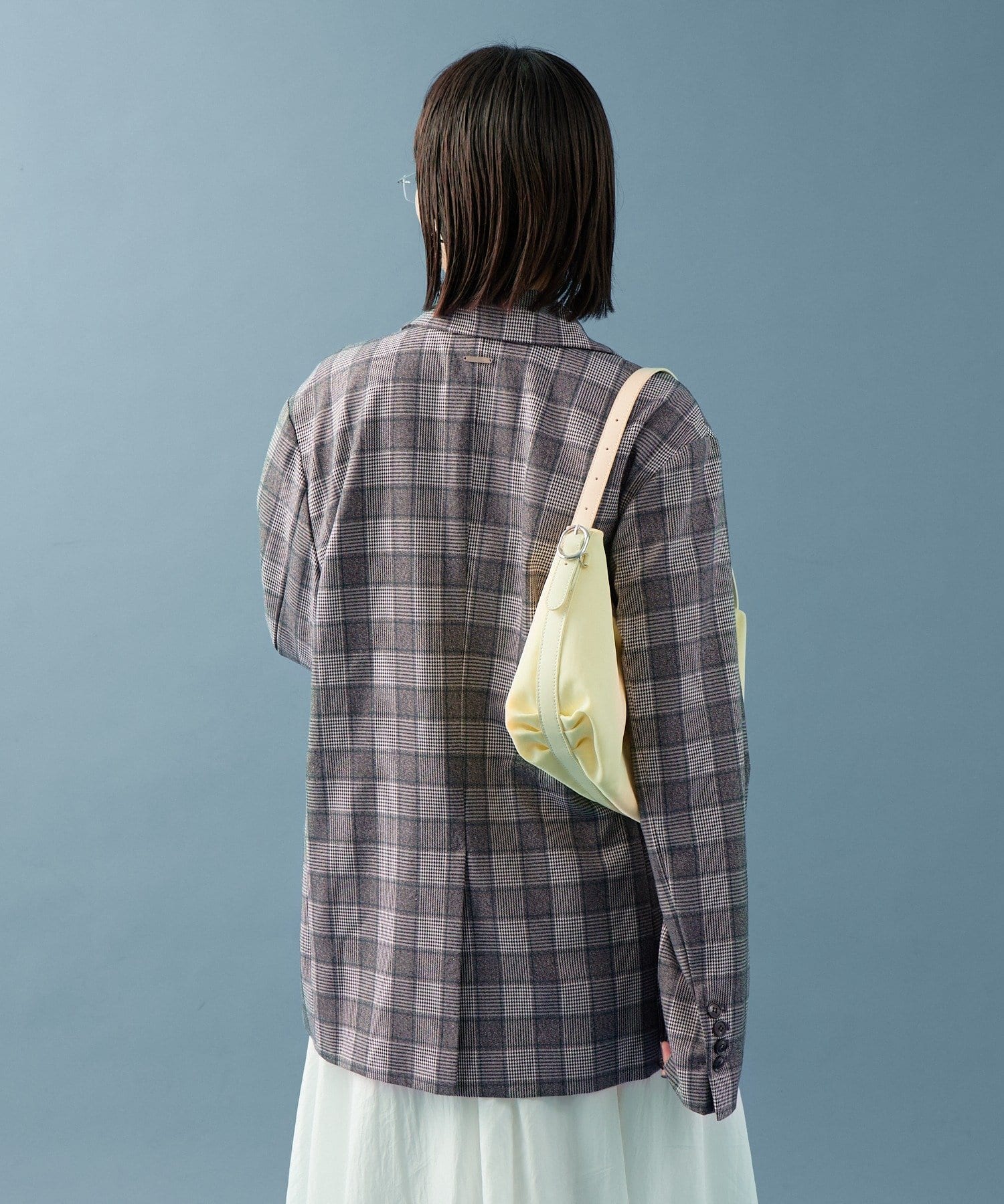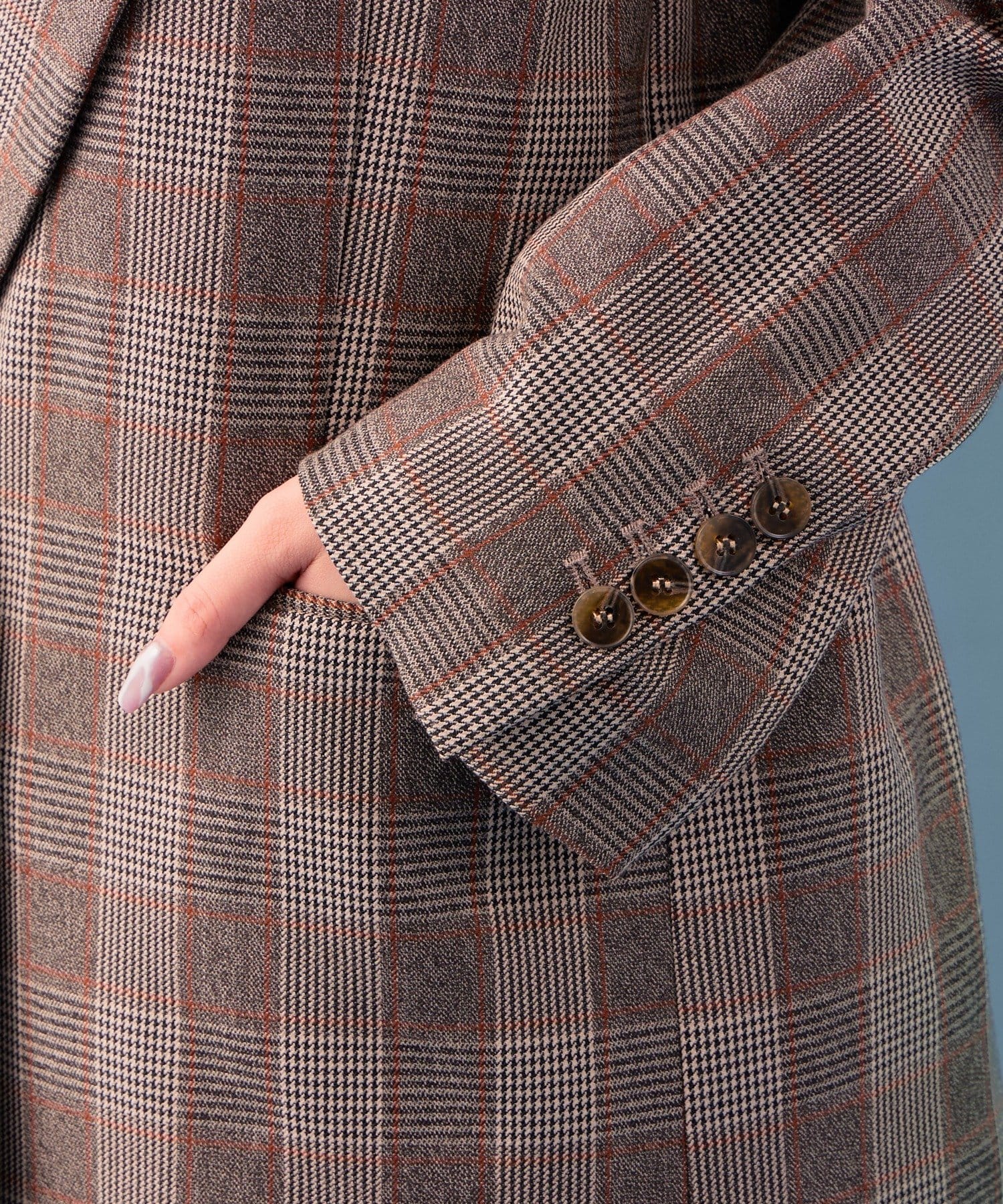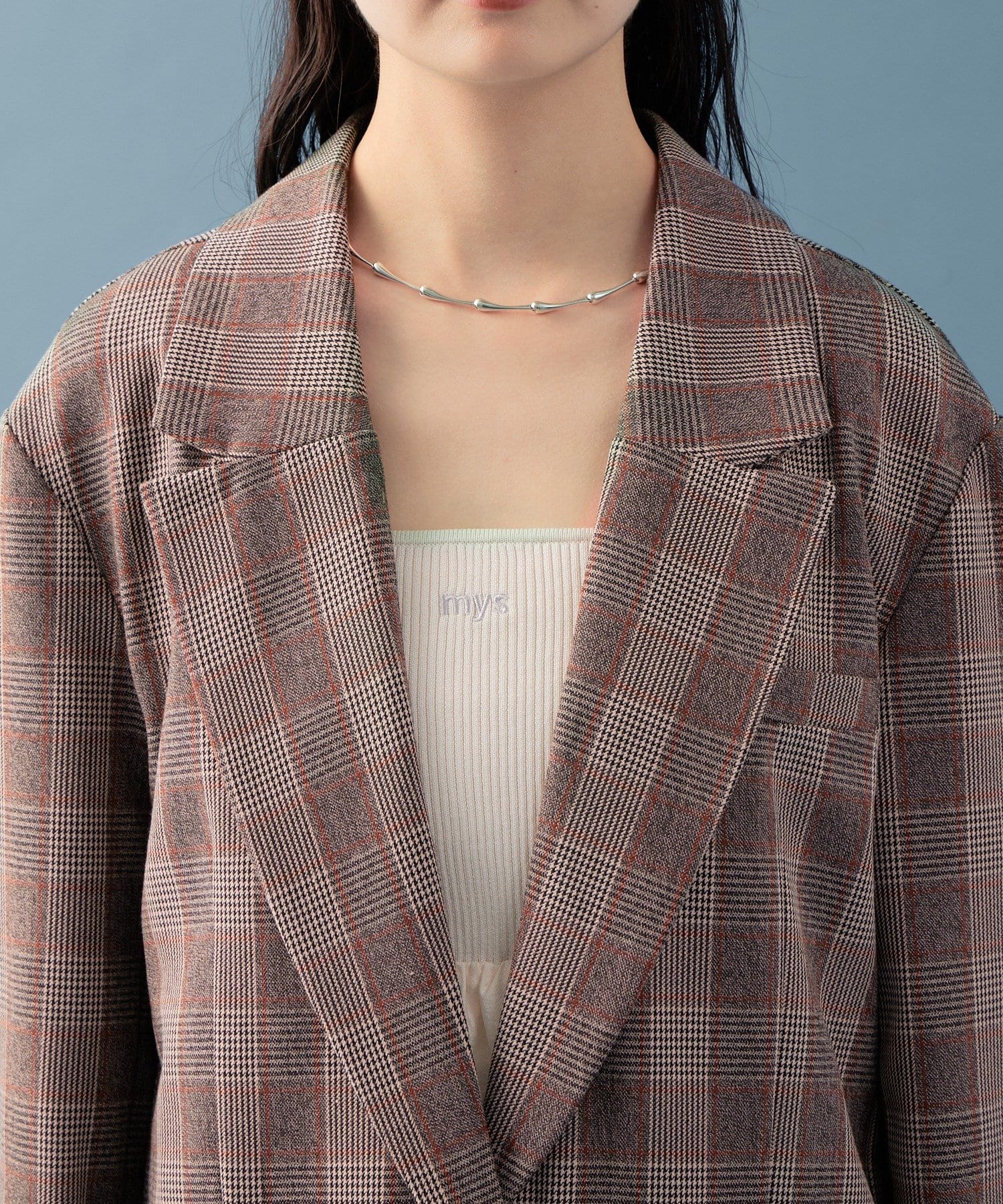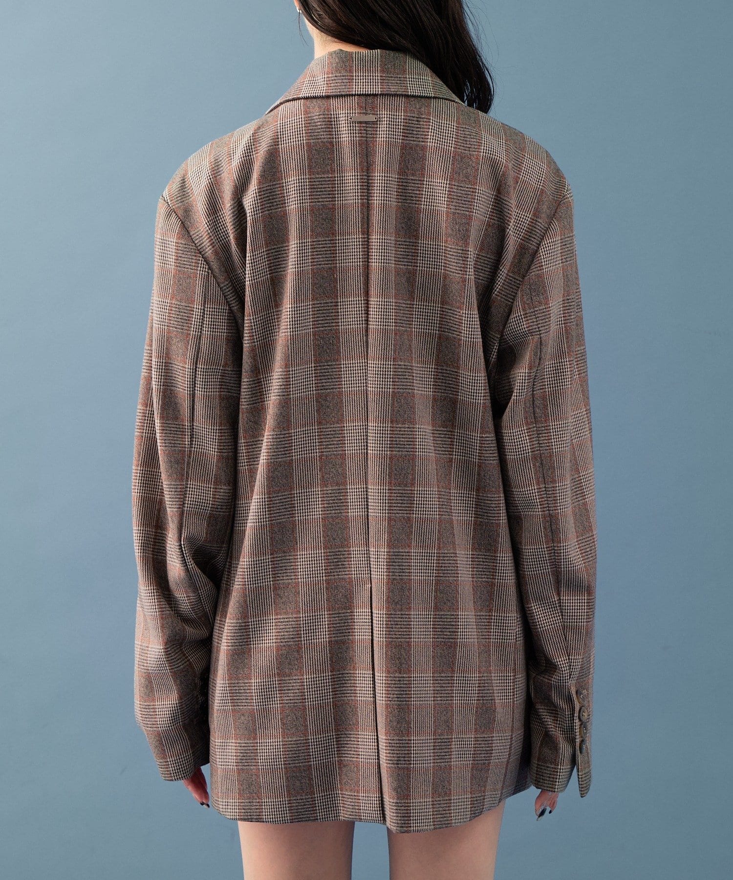 ・落ち着いた色味の大人っぽさを感じられるチェックジャケット。トレンド感のある大きめのサイズ感が可愛らしさもプラス。