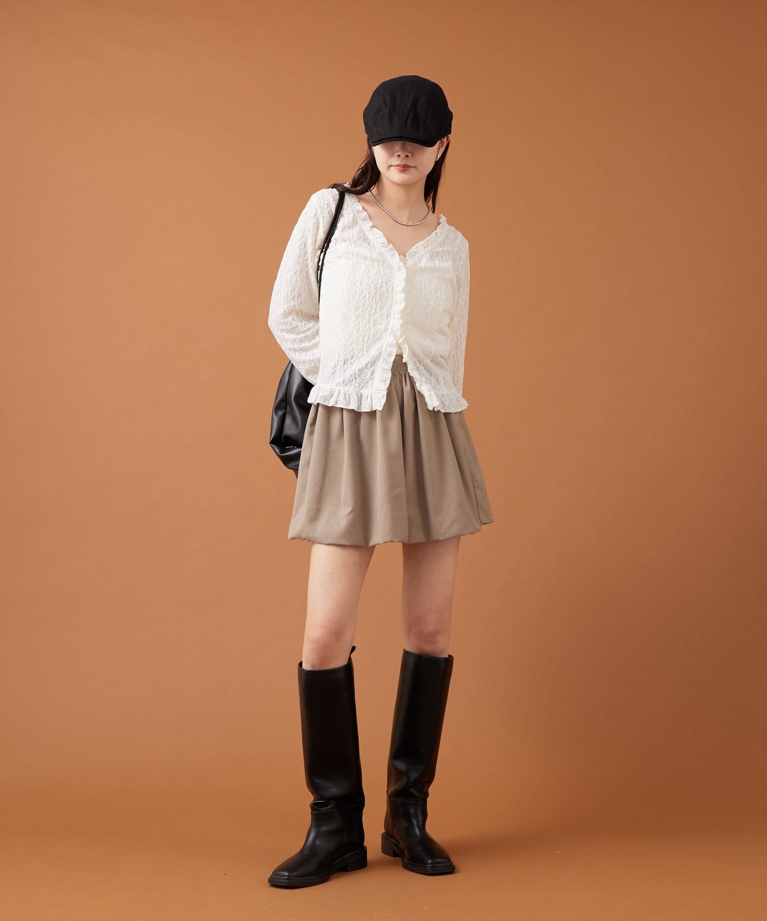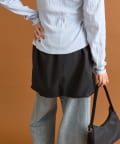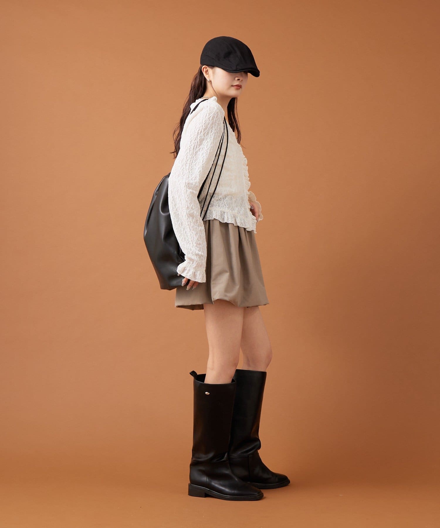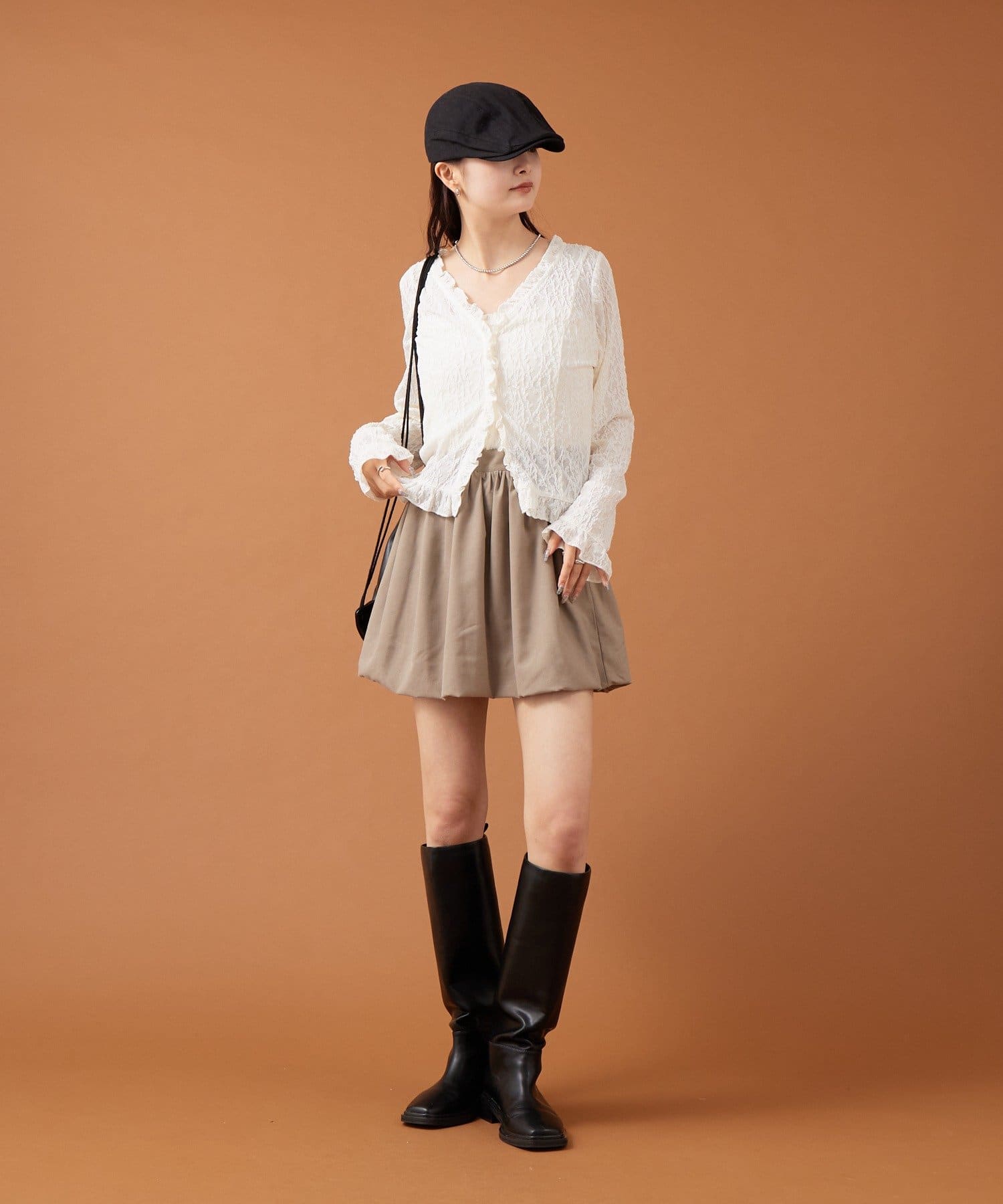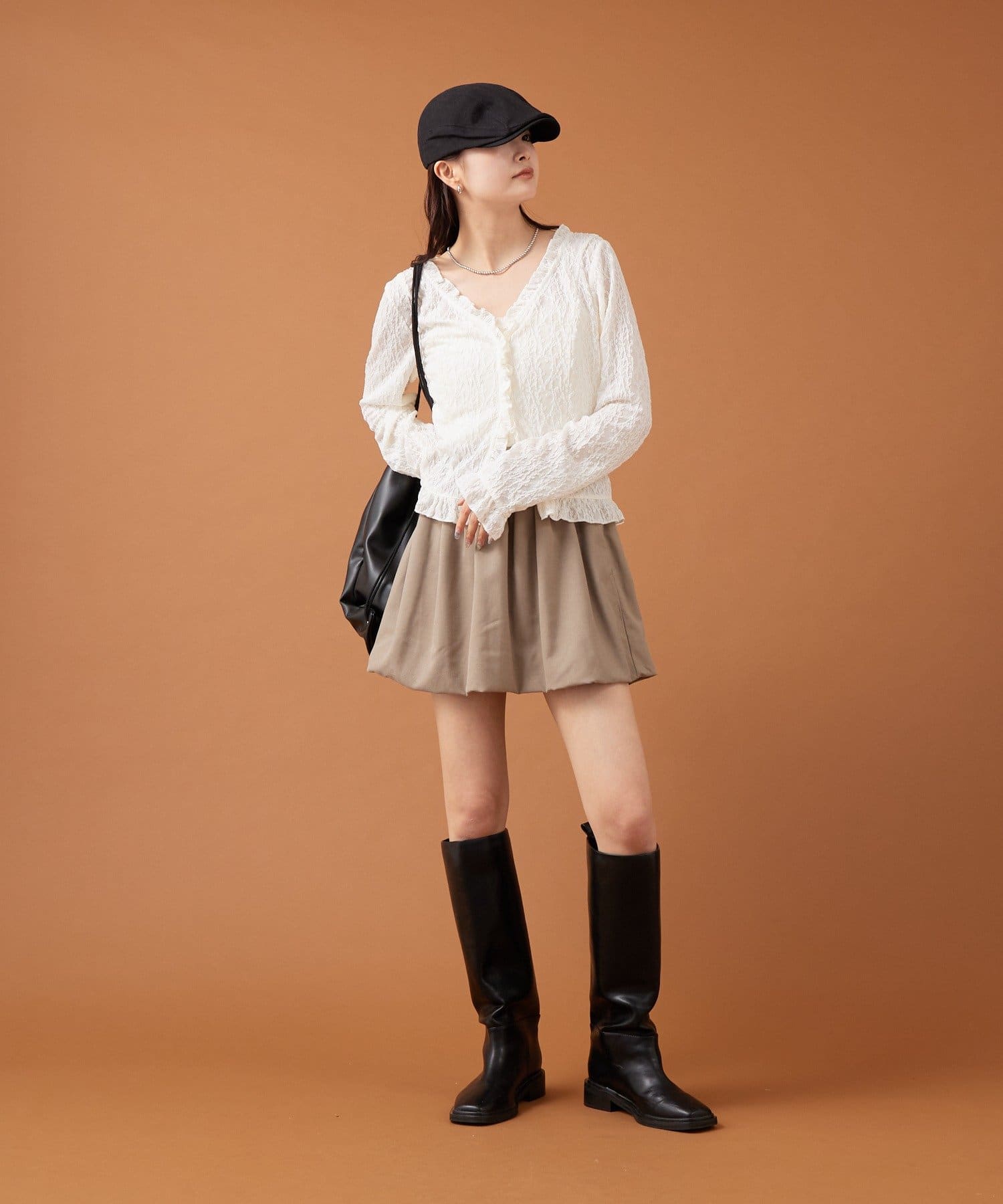 ・ミニ丈のボトムスのため、ロングブーツとの相性がよくこれからの時期に生えそうなスタイリングです◎