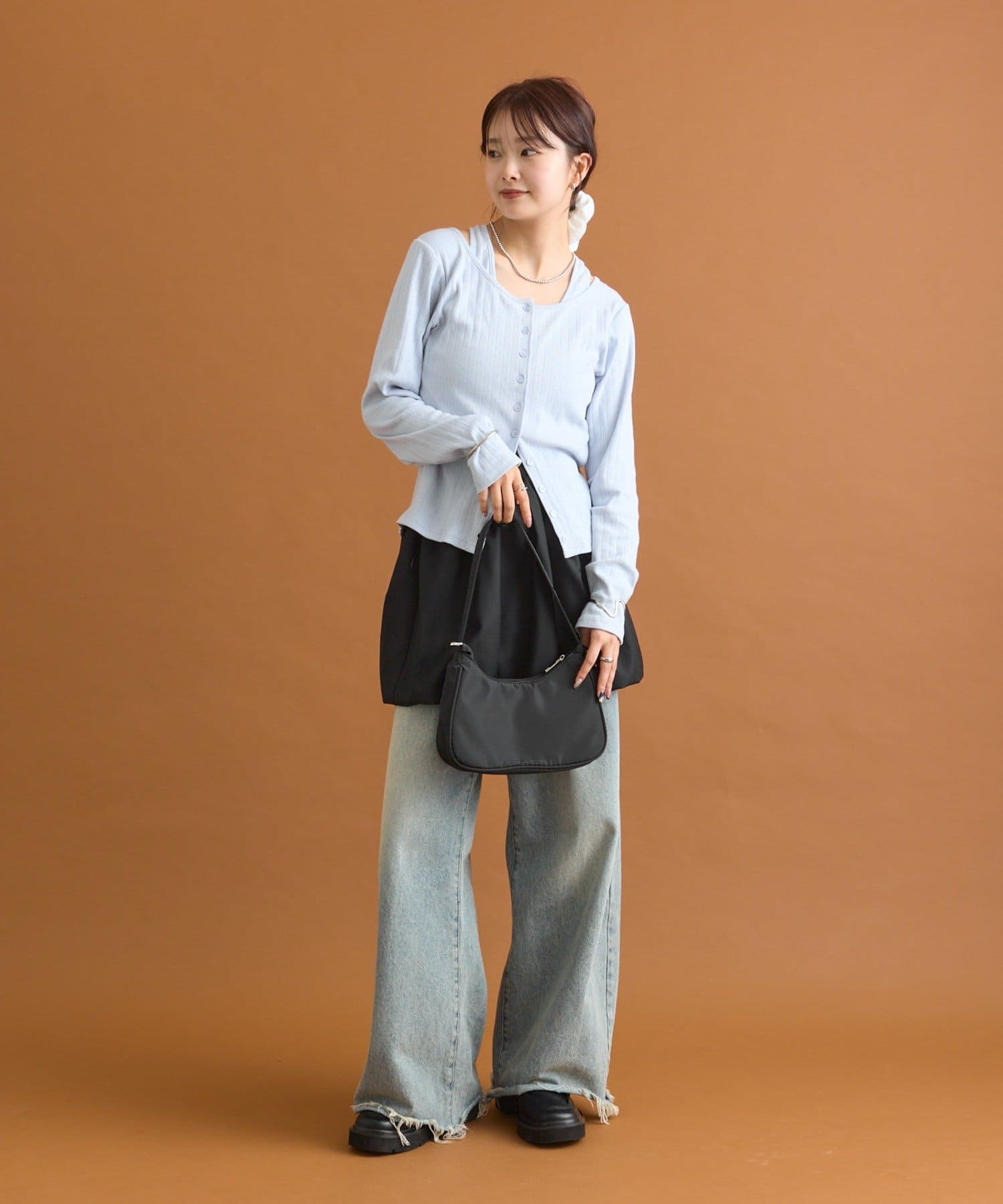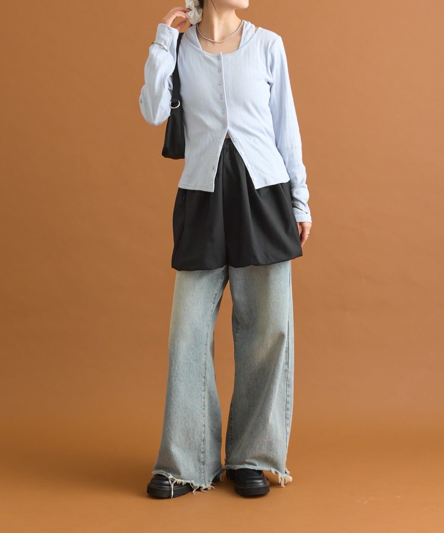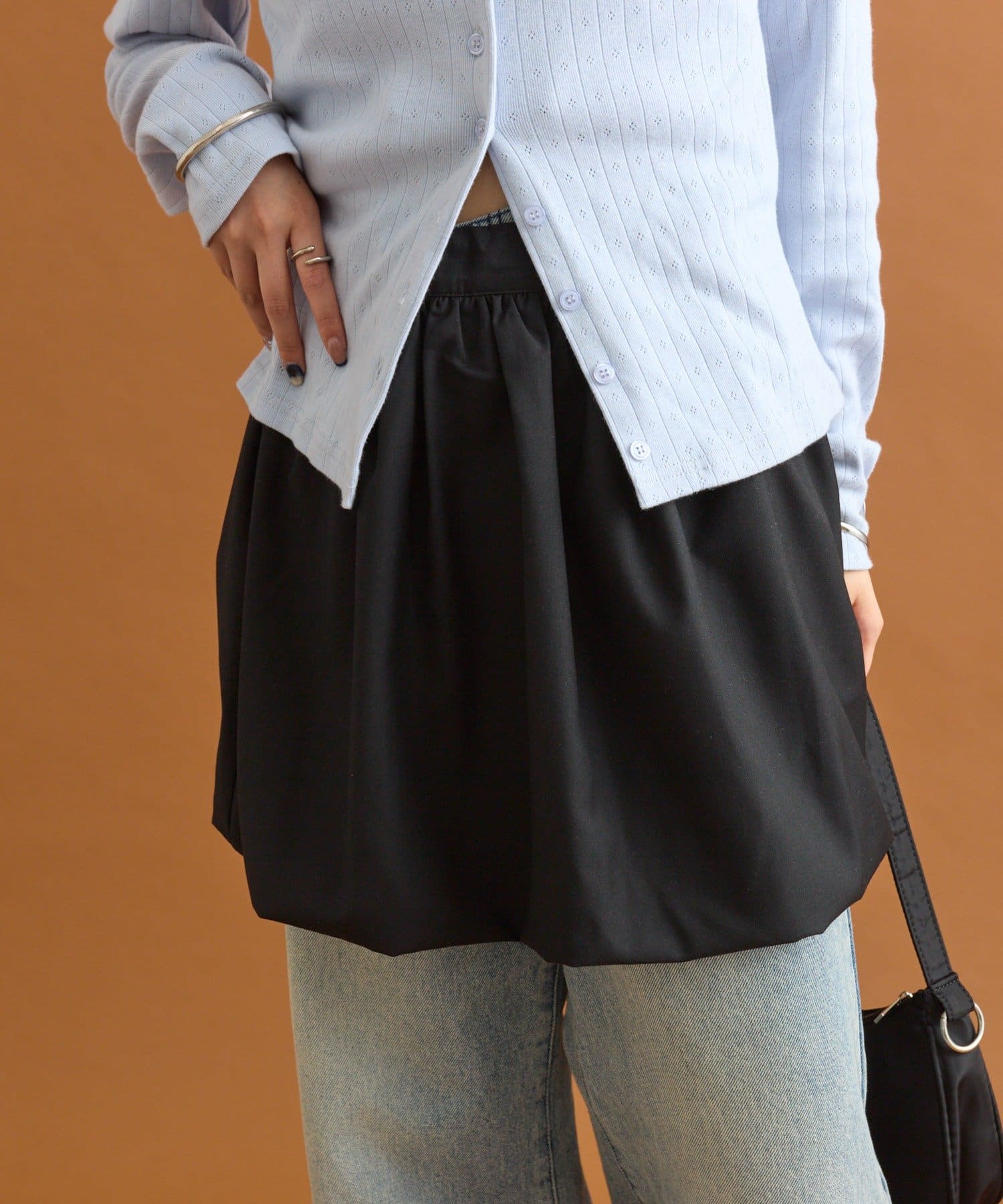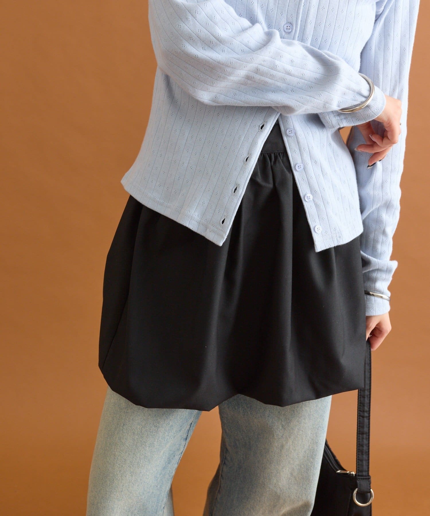 ・ぴったりとしたシルエットのカーディガンやトップスと合わせるとバランスが良く決まります。
