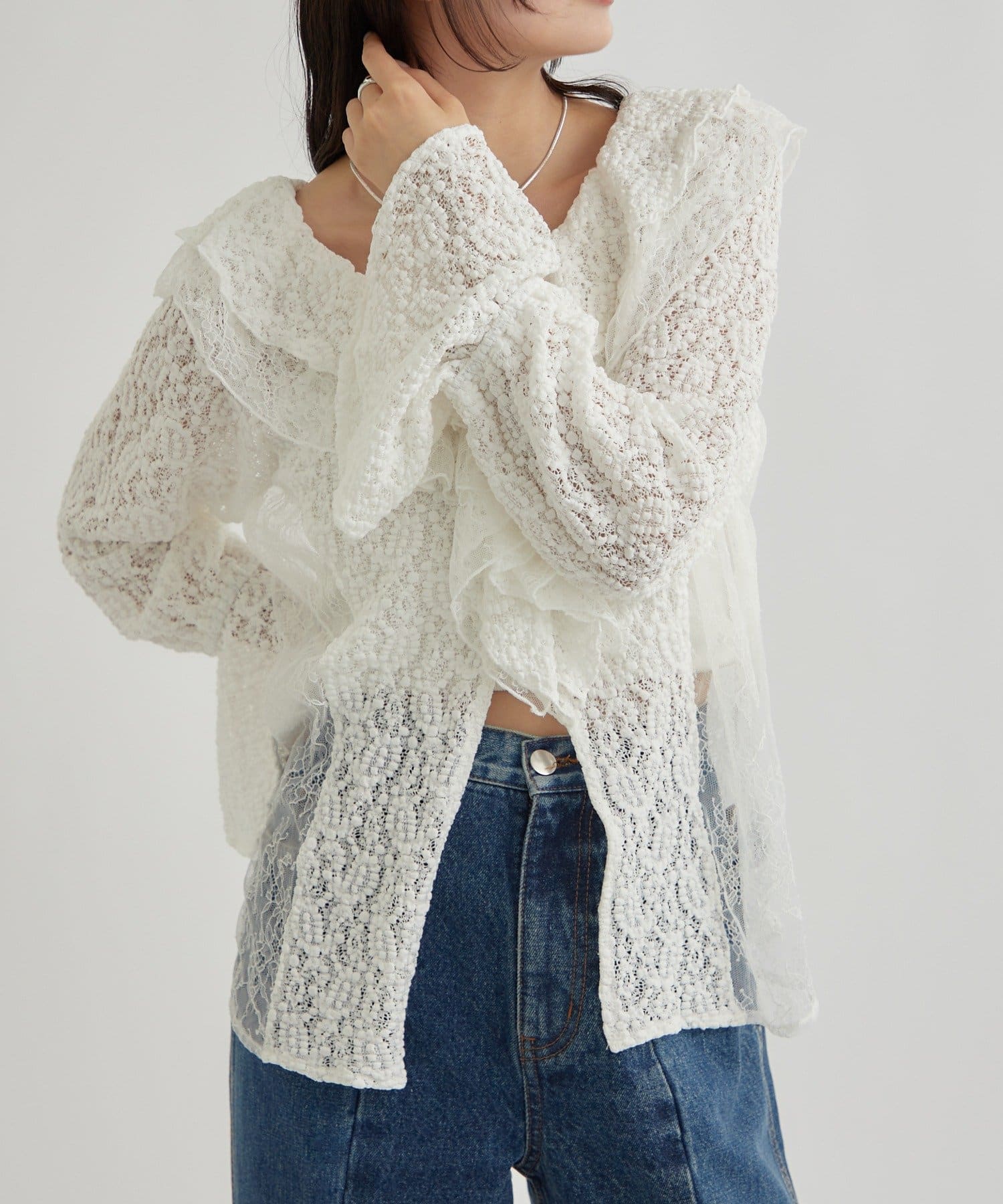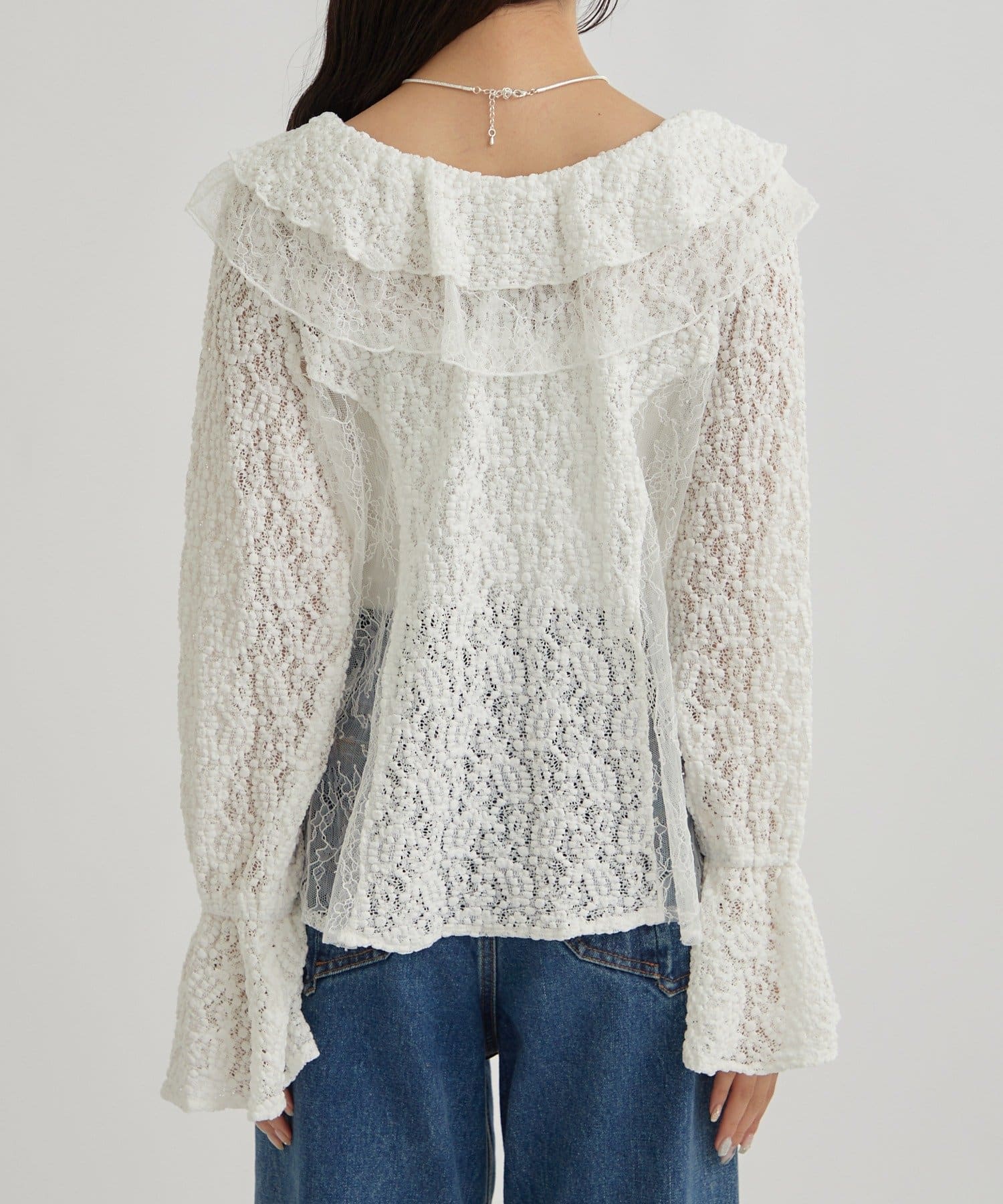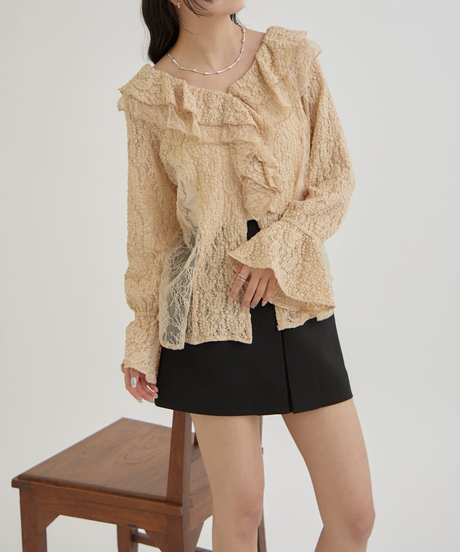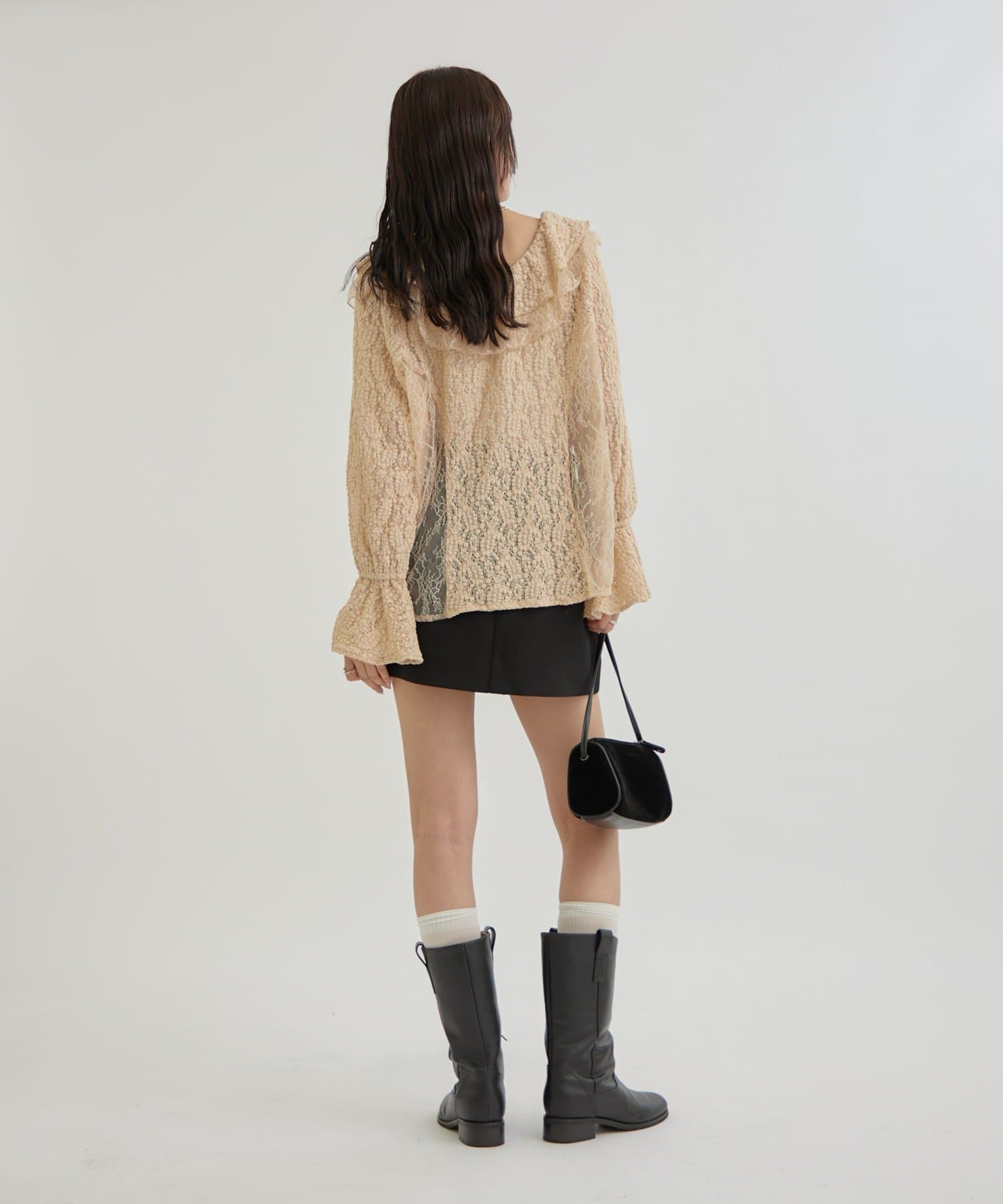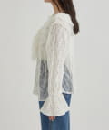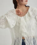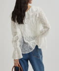 ・首回りの大胆なフリルと繊細な2種類のレースが組み合わさった華やかなレースがヴィンテージ感のあるブラウス。