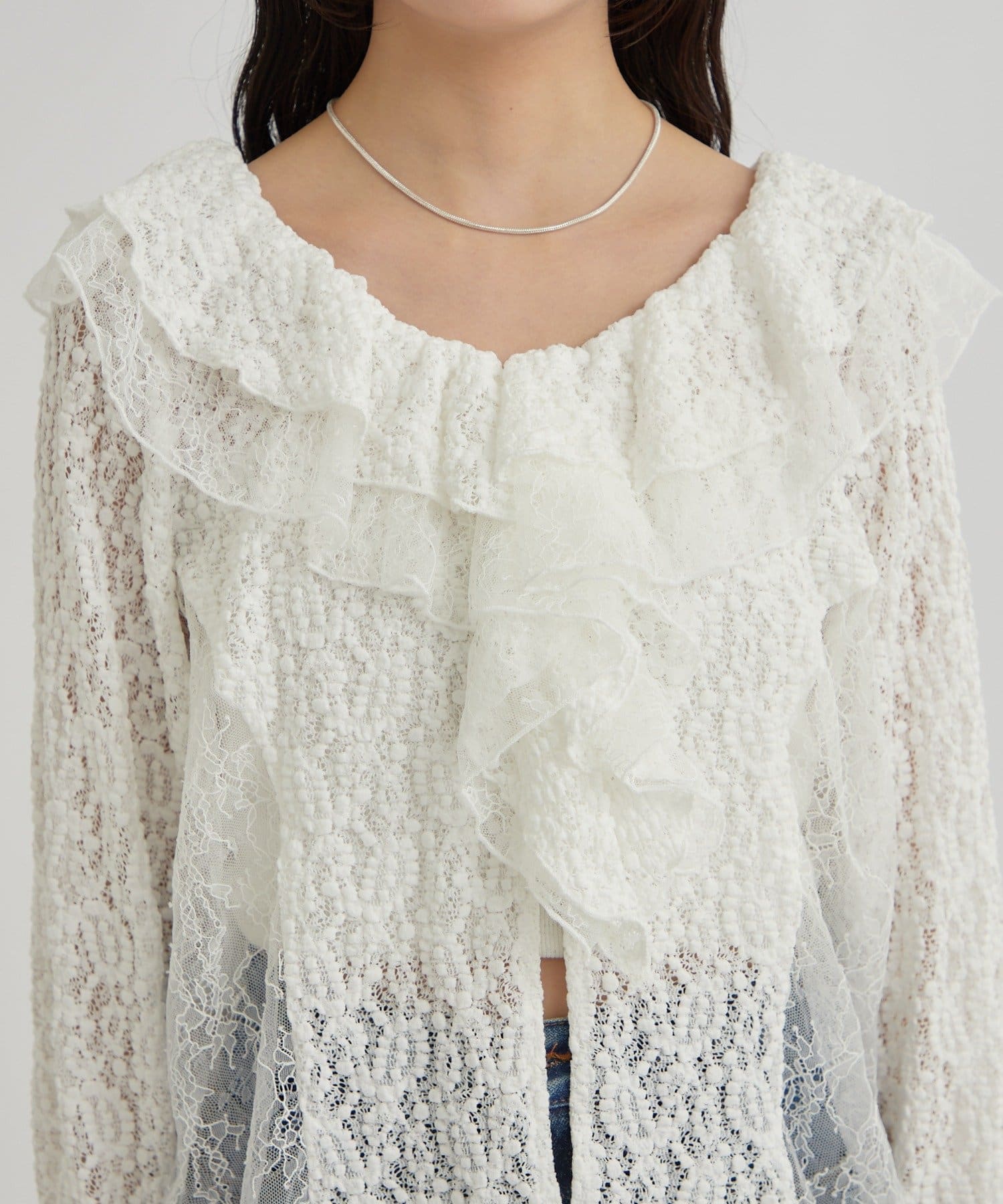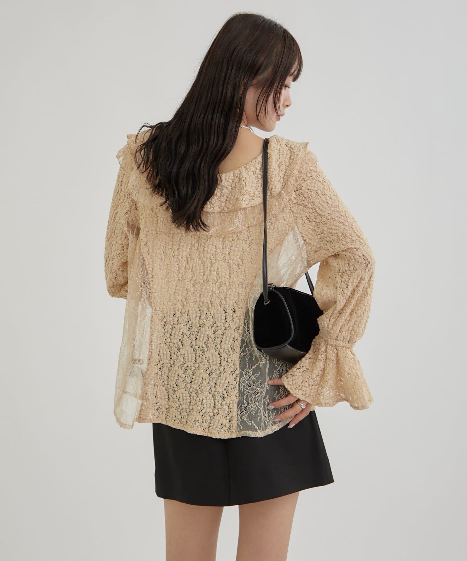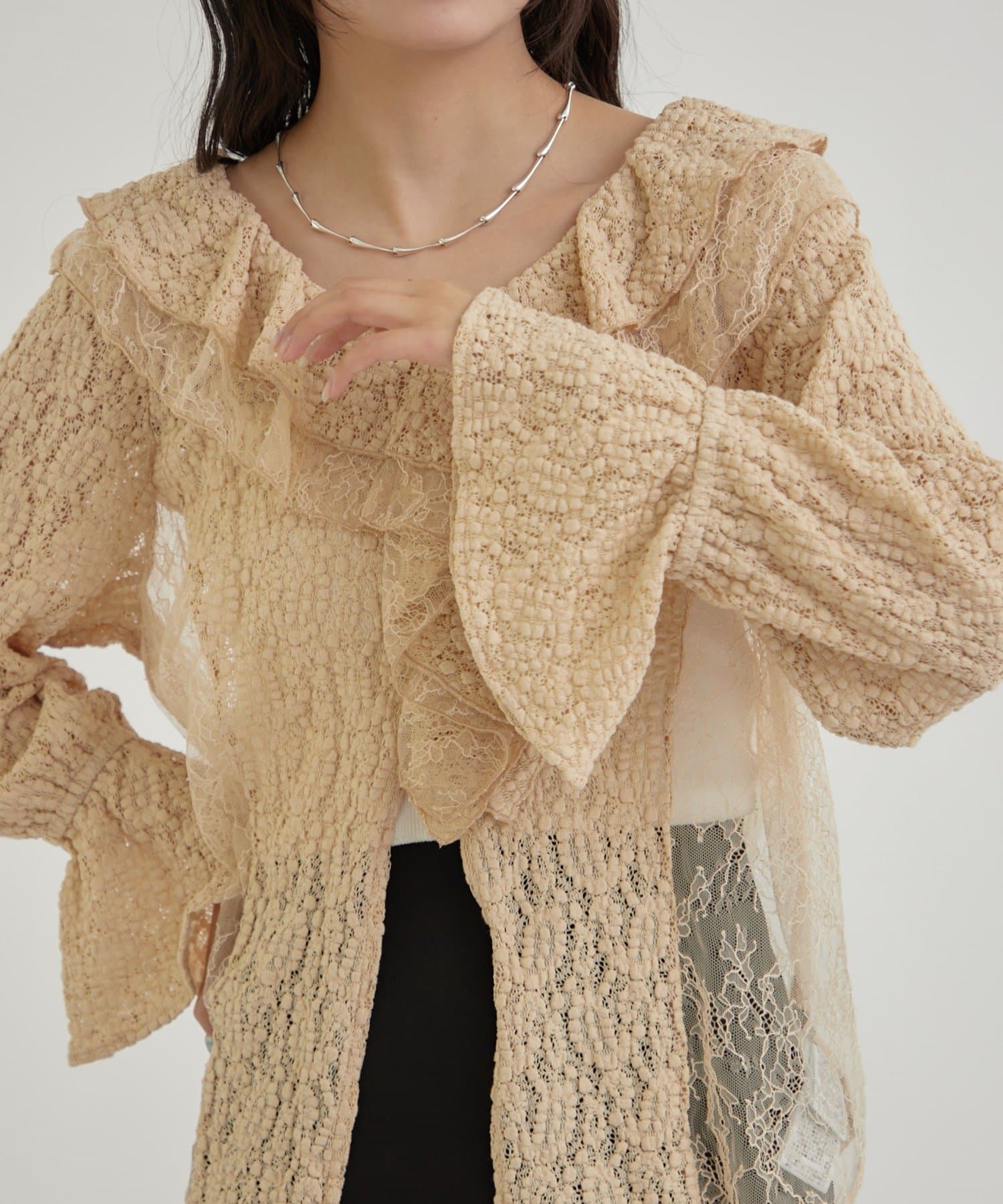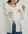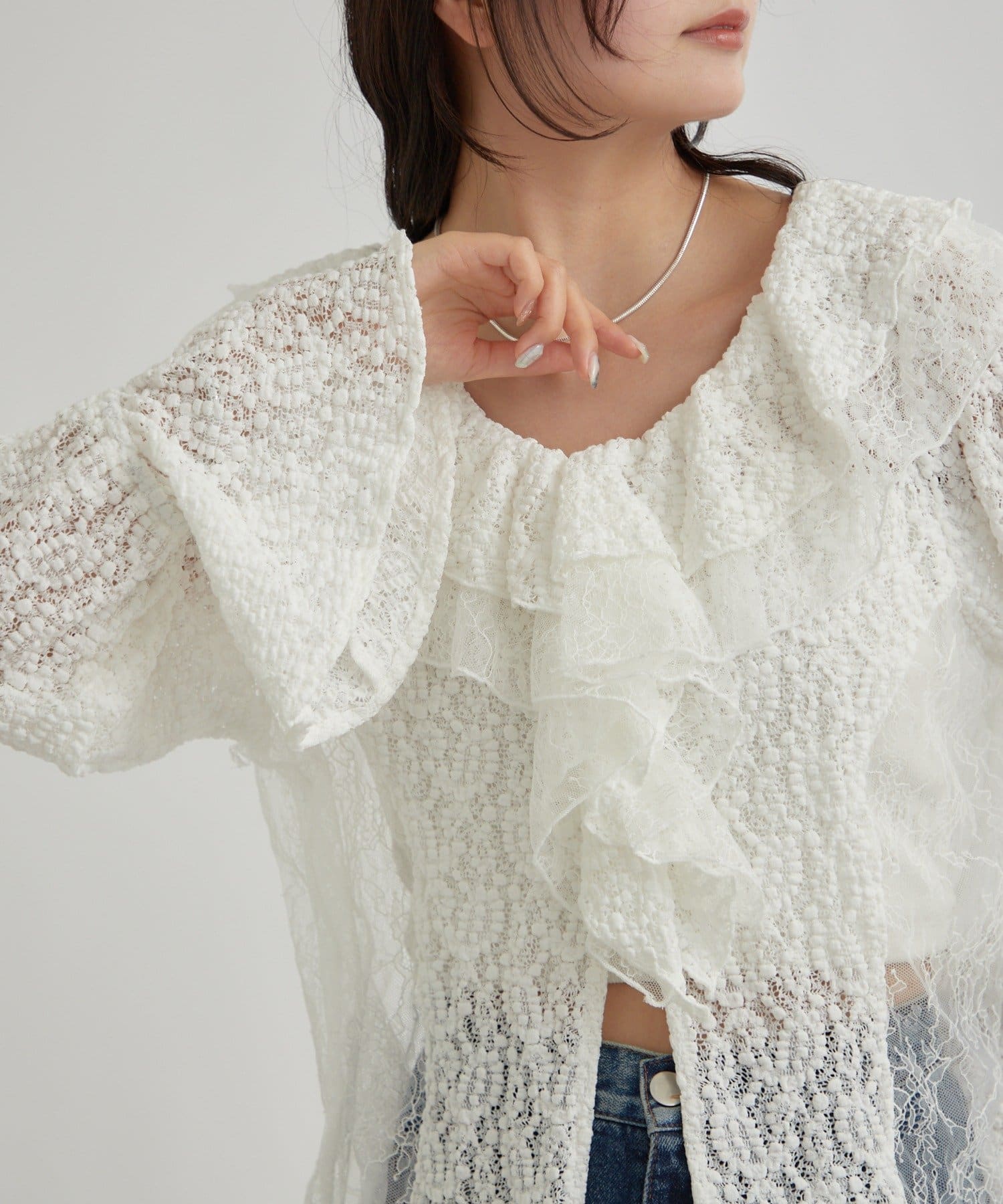 ・首回りの大胆なフリルと繊細な2種類のレースが組み合わさった華やかなレースがヴィンテージ感のあるブラウス。