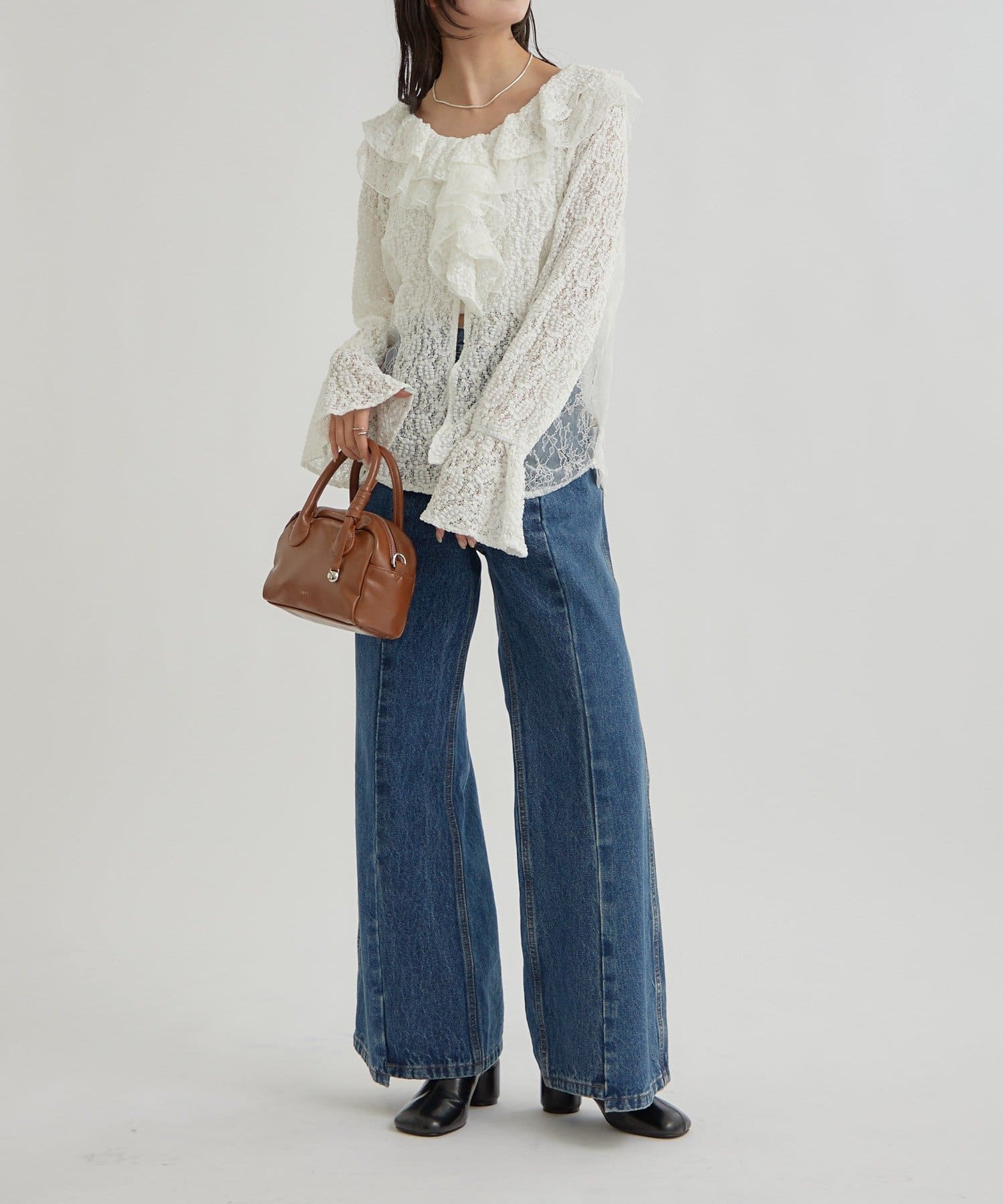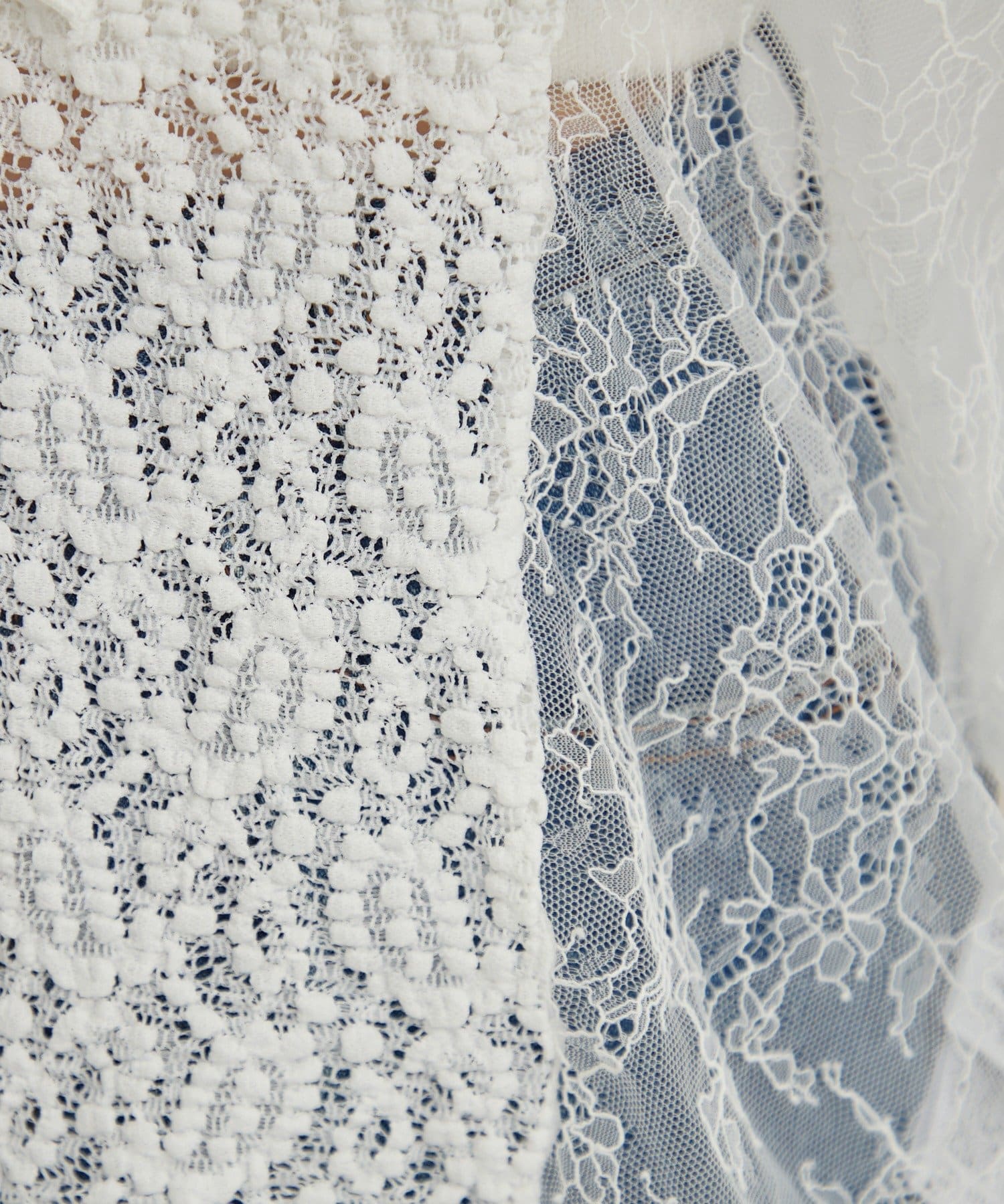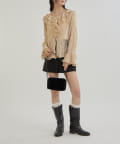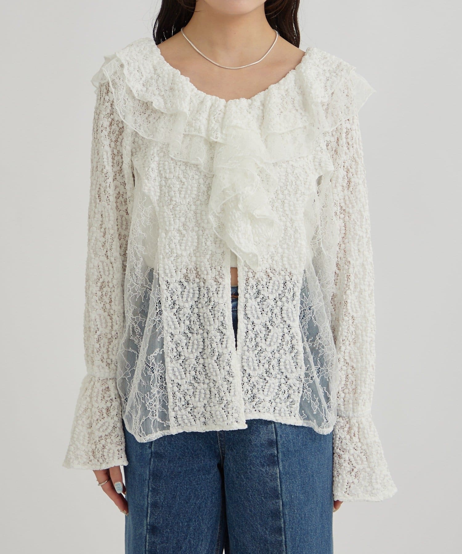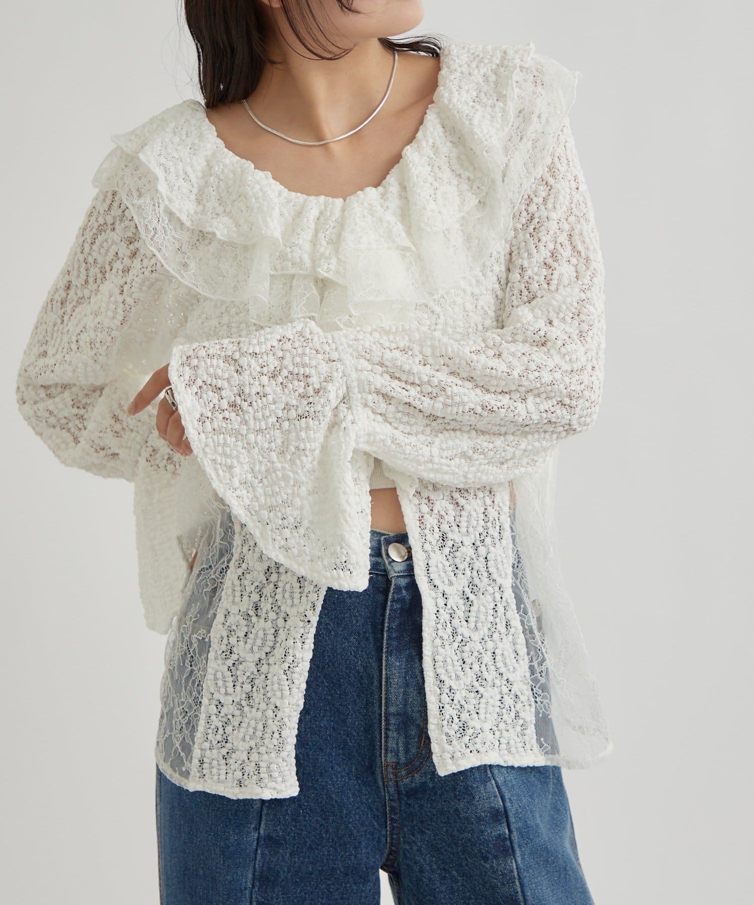 ・首回りの大胆なフリルと繊細な2種類のレースが組み合わさった華やかなレースがヴィンテージ感のあるブラウス。