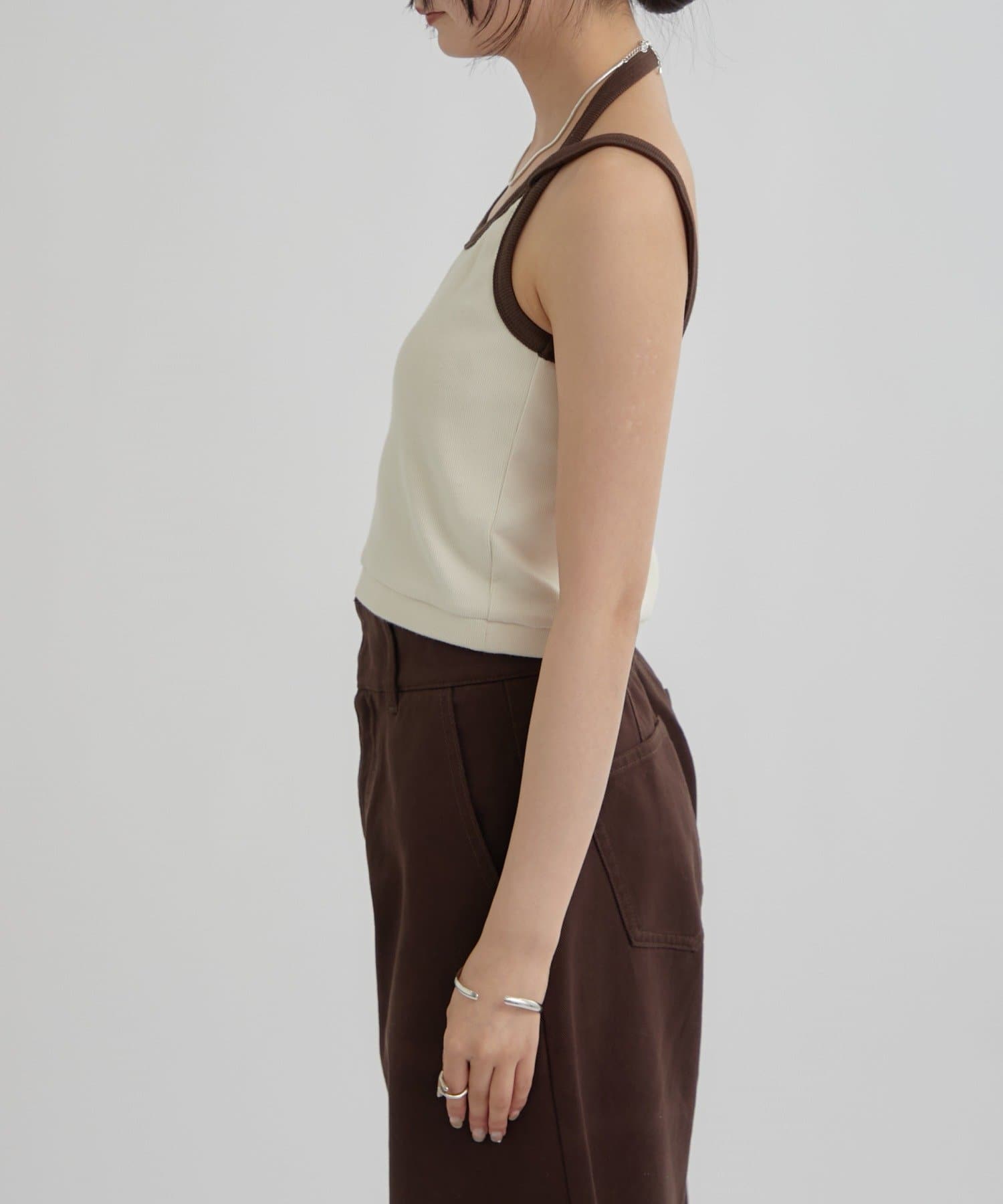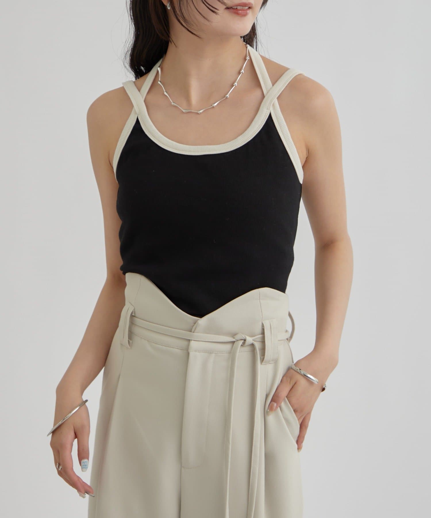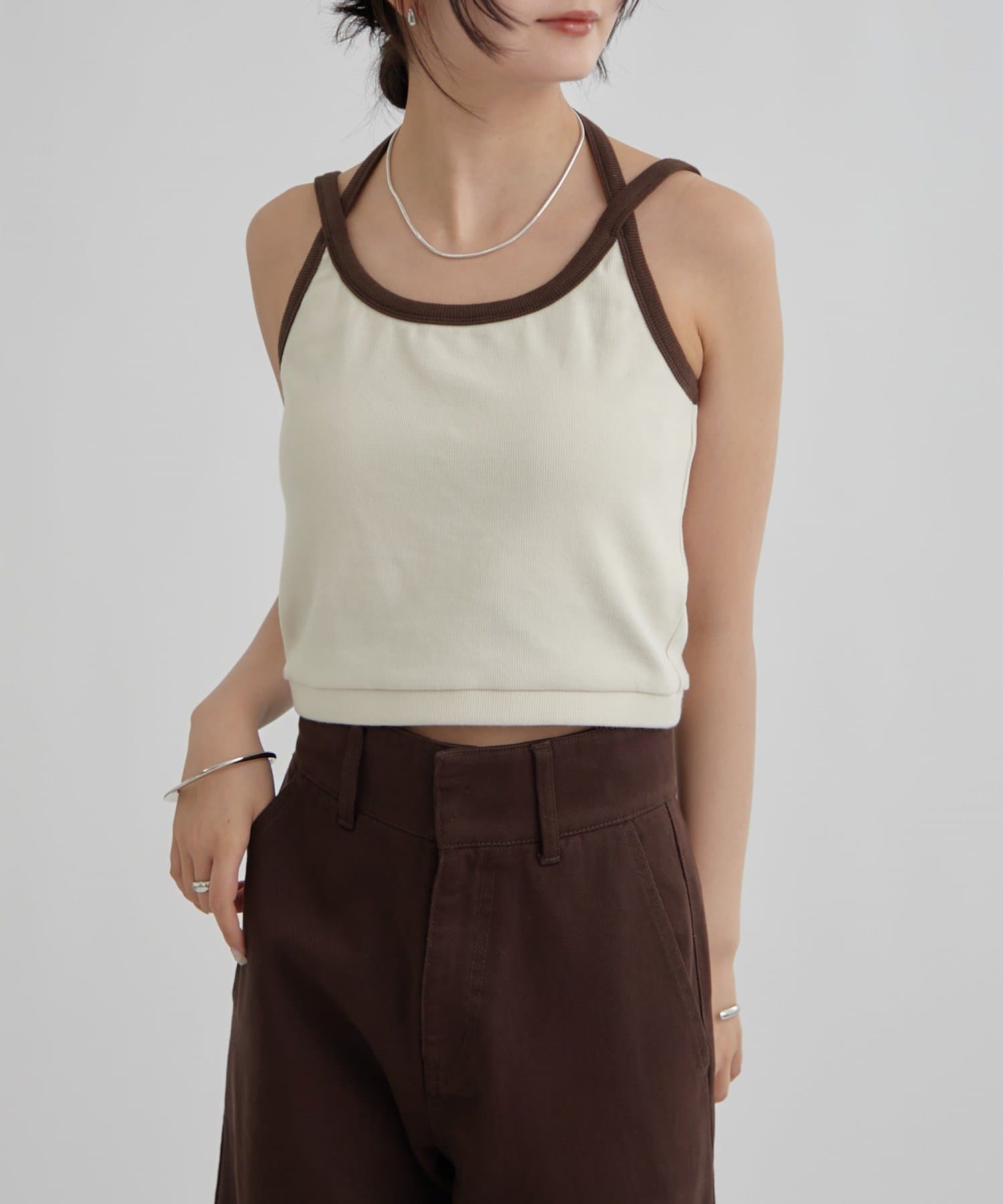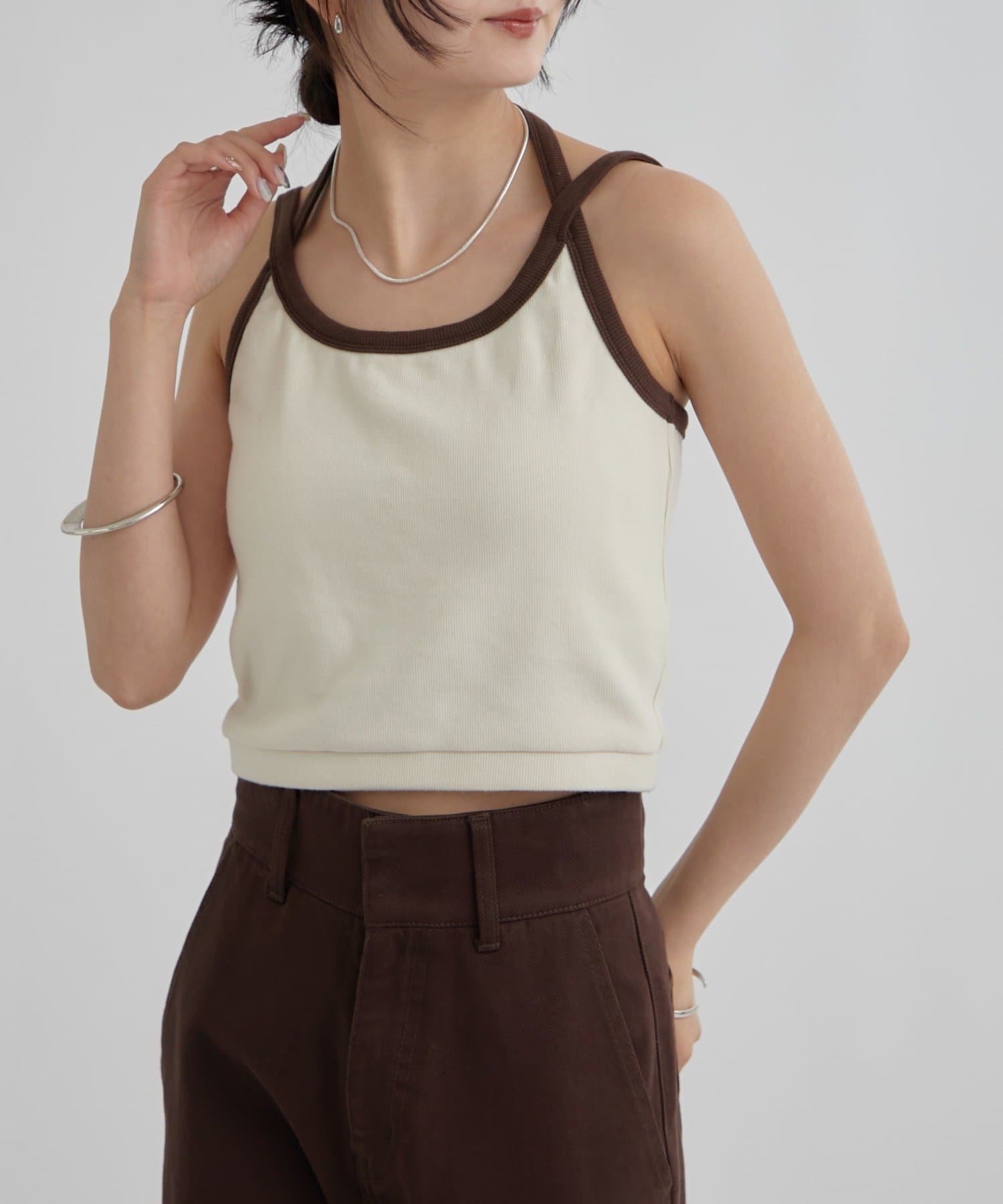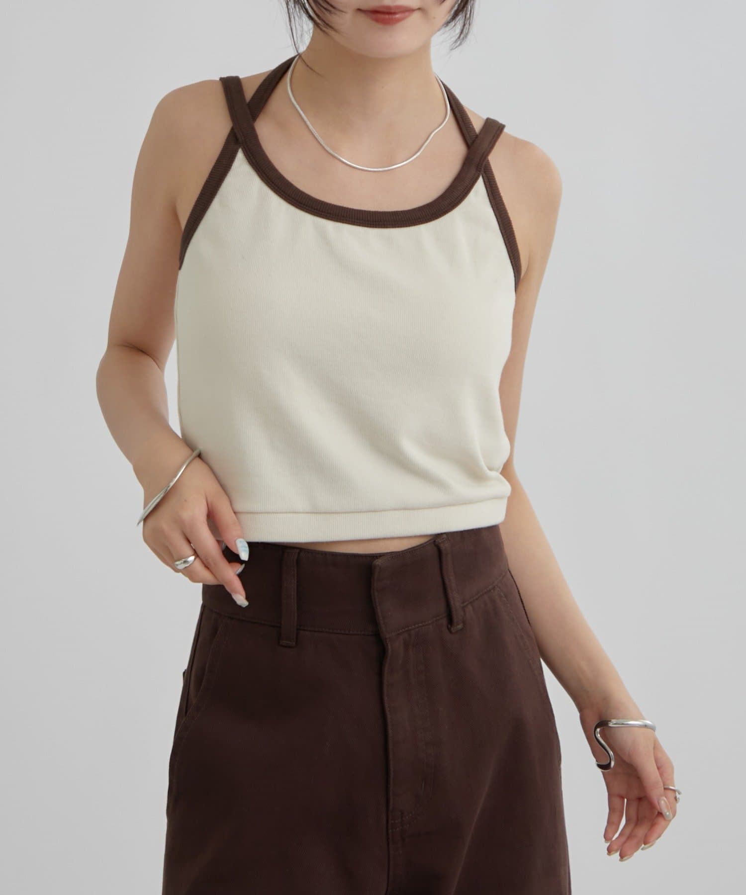 ・ホルターネックで絶妙な組み合わせが可愛いバイカラーデザインが目を惹くキャミソール。ジャケットなどの羽織のインナーとして着ても決まる1枚です◎