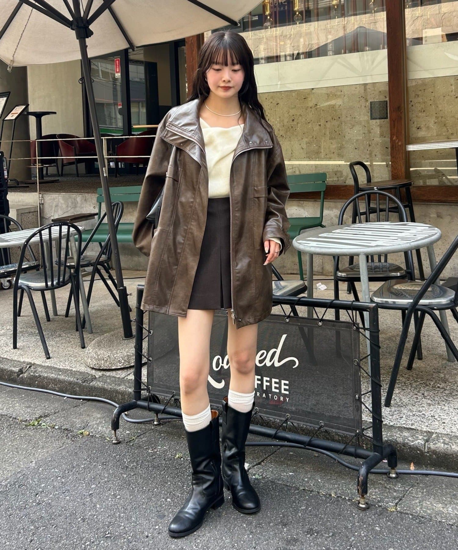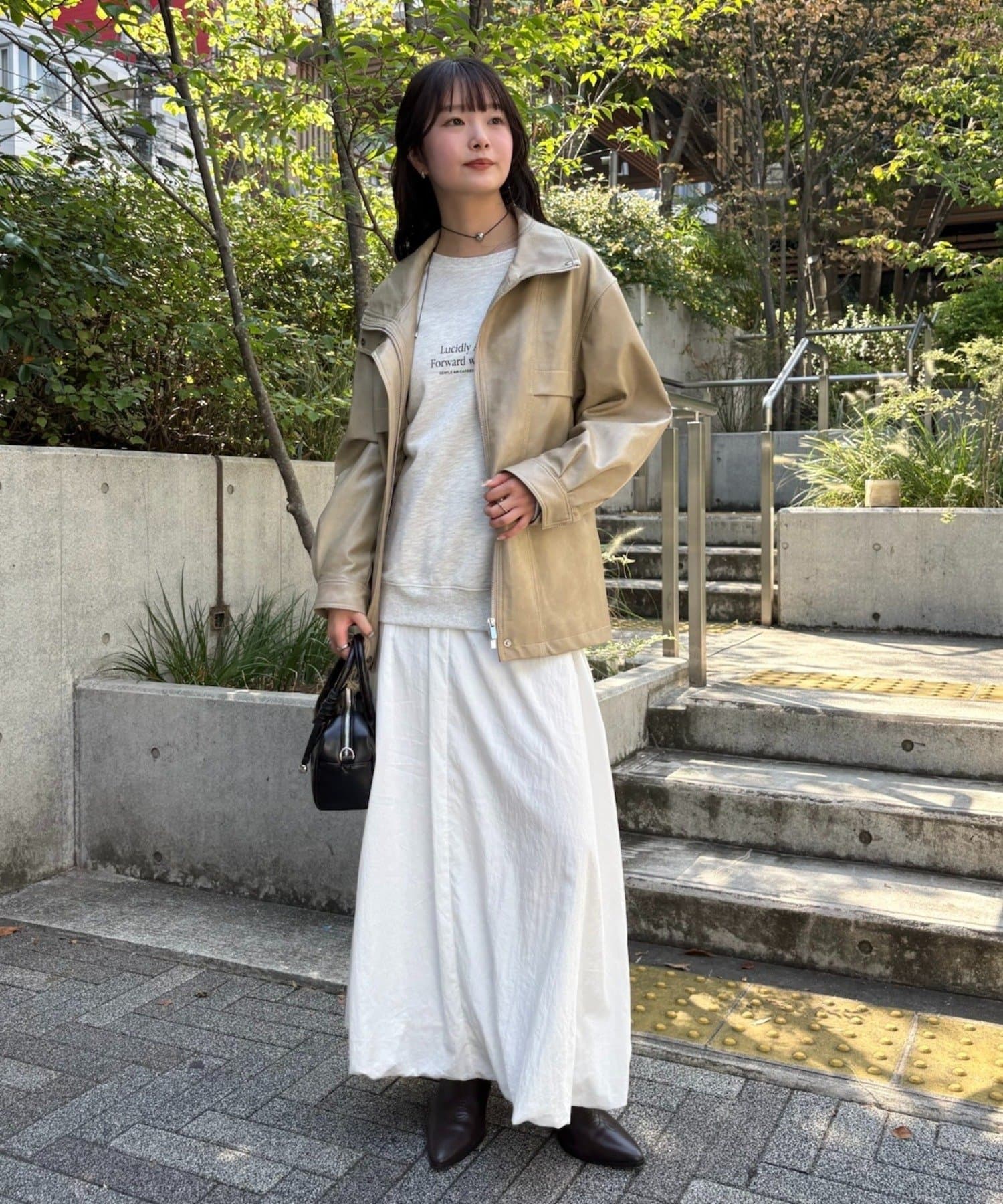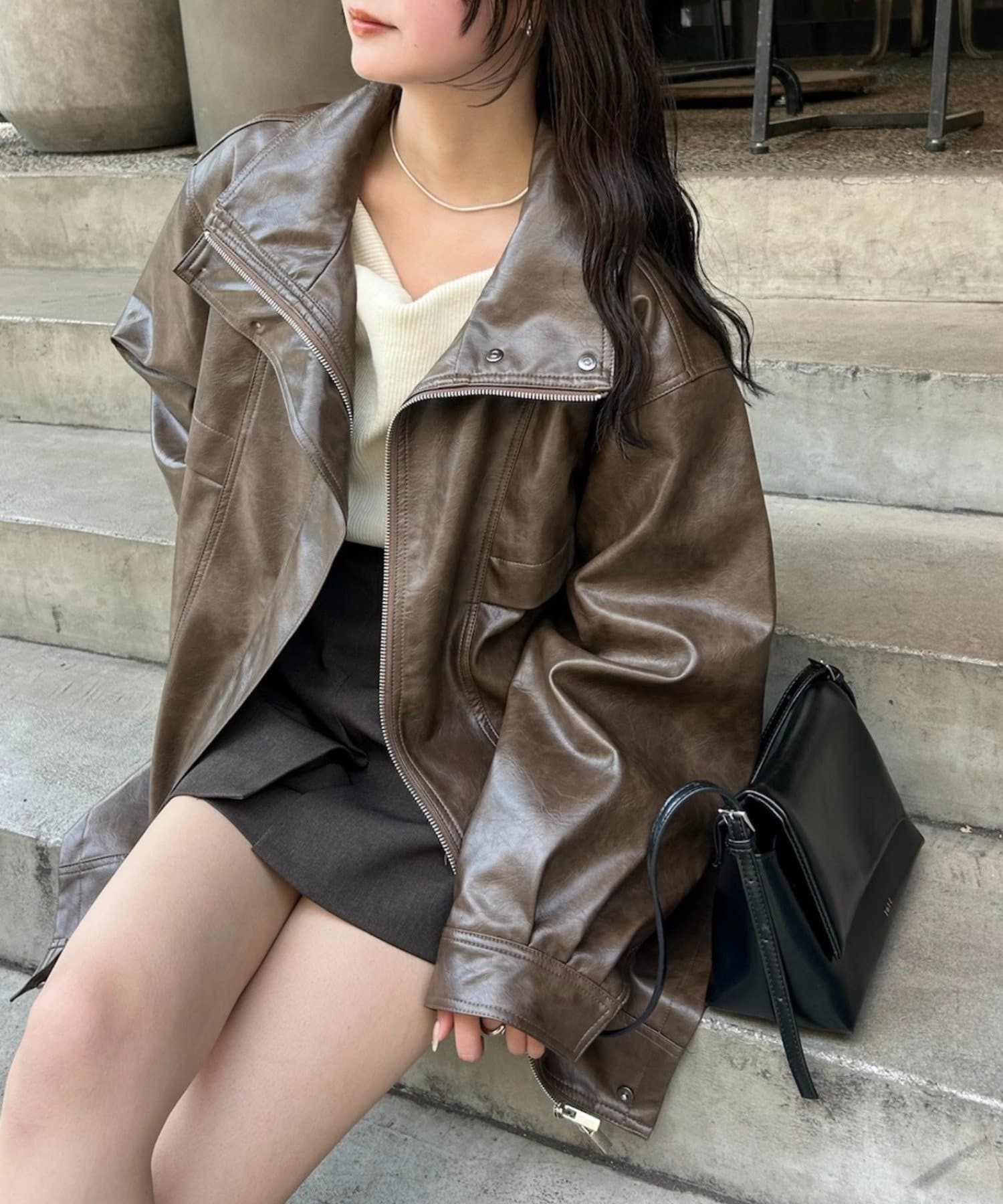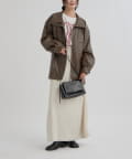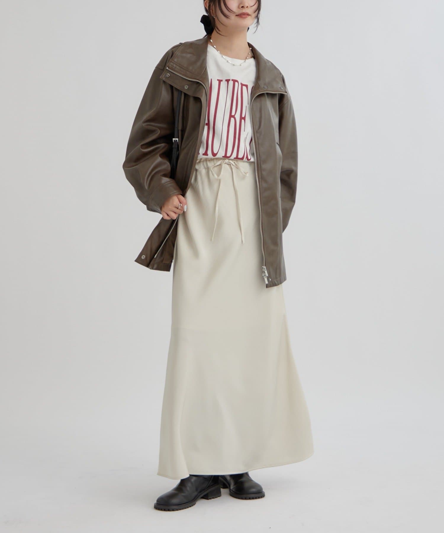 ・こなれ感のあるレザーブルゾンはメンズライクな印象なので、女性らしいアイテムと合わせると程よく中和されます◎