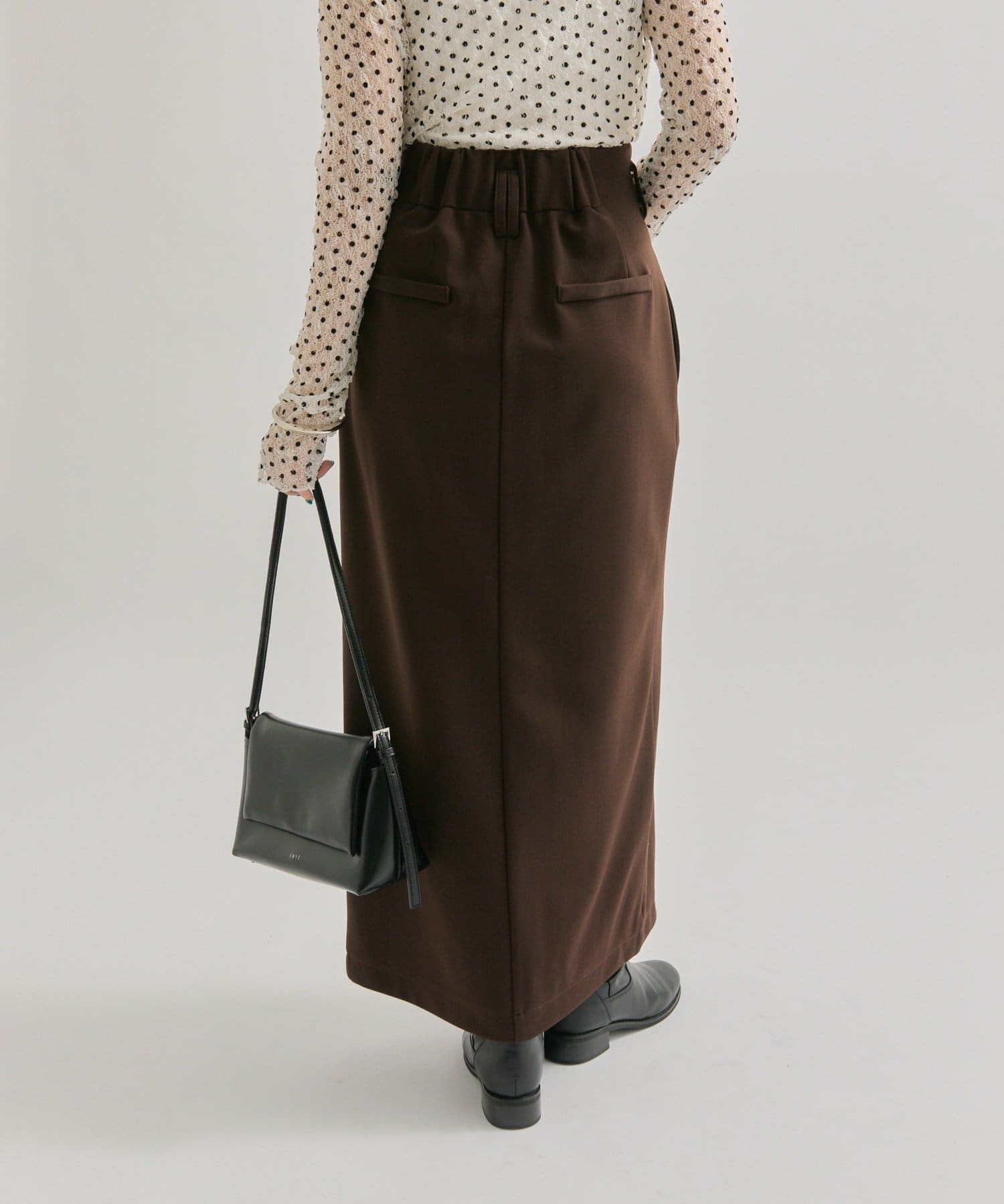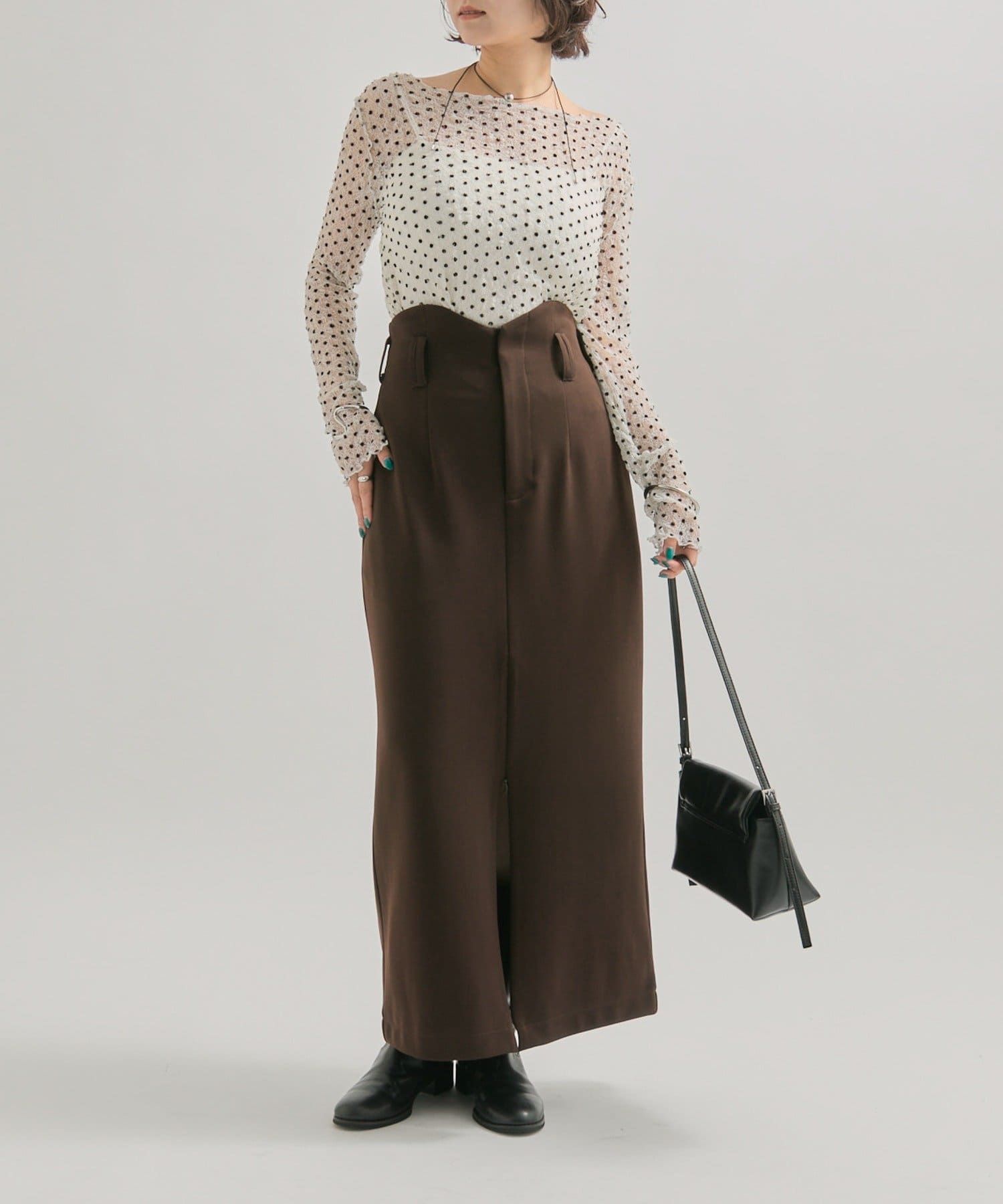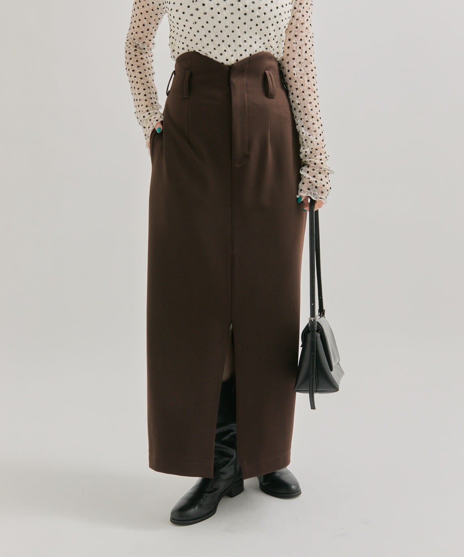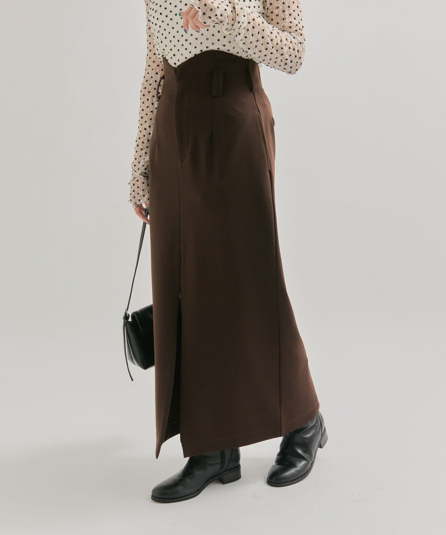 ・スリット部分を広めにして、足元はブーツを合わせるとこなれ感のあるコーディネートになります。