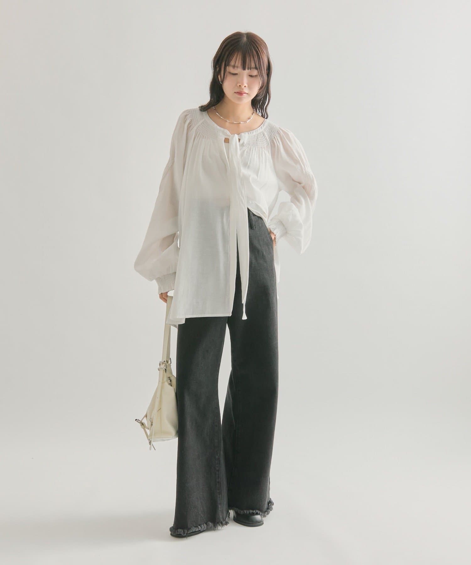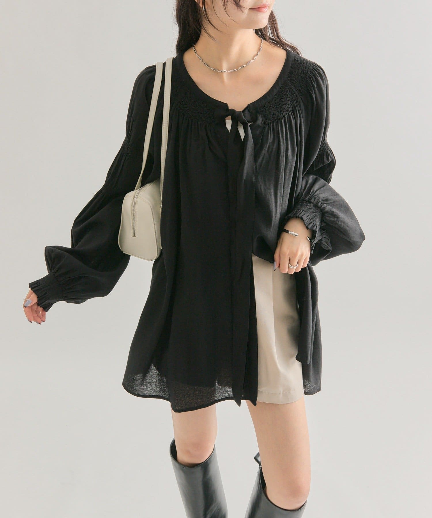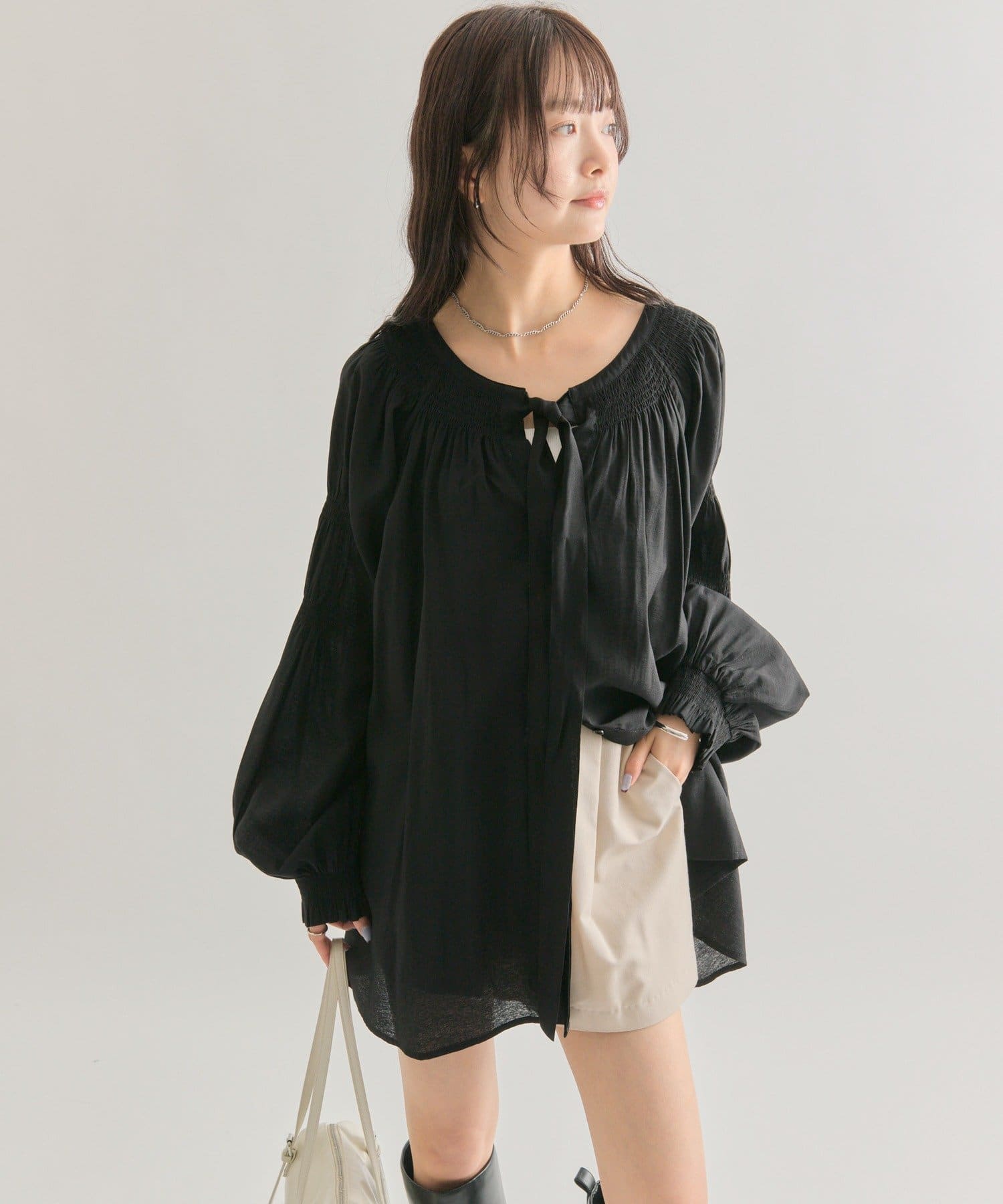 ・落ち感のあるシルエットでふんわりとした女性らしいシルエットが魅力的なボウタイスキッパーブラウス。