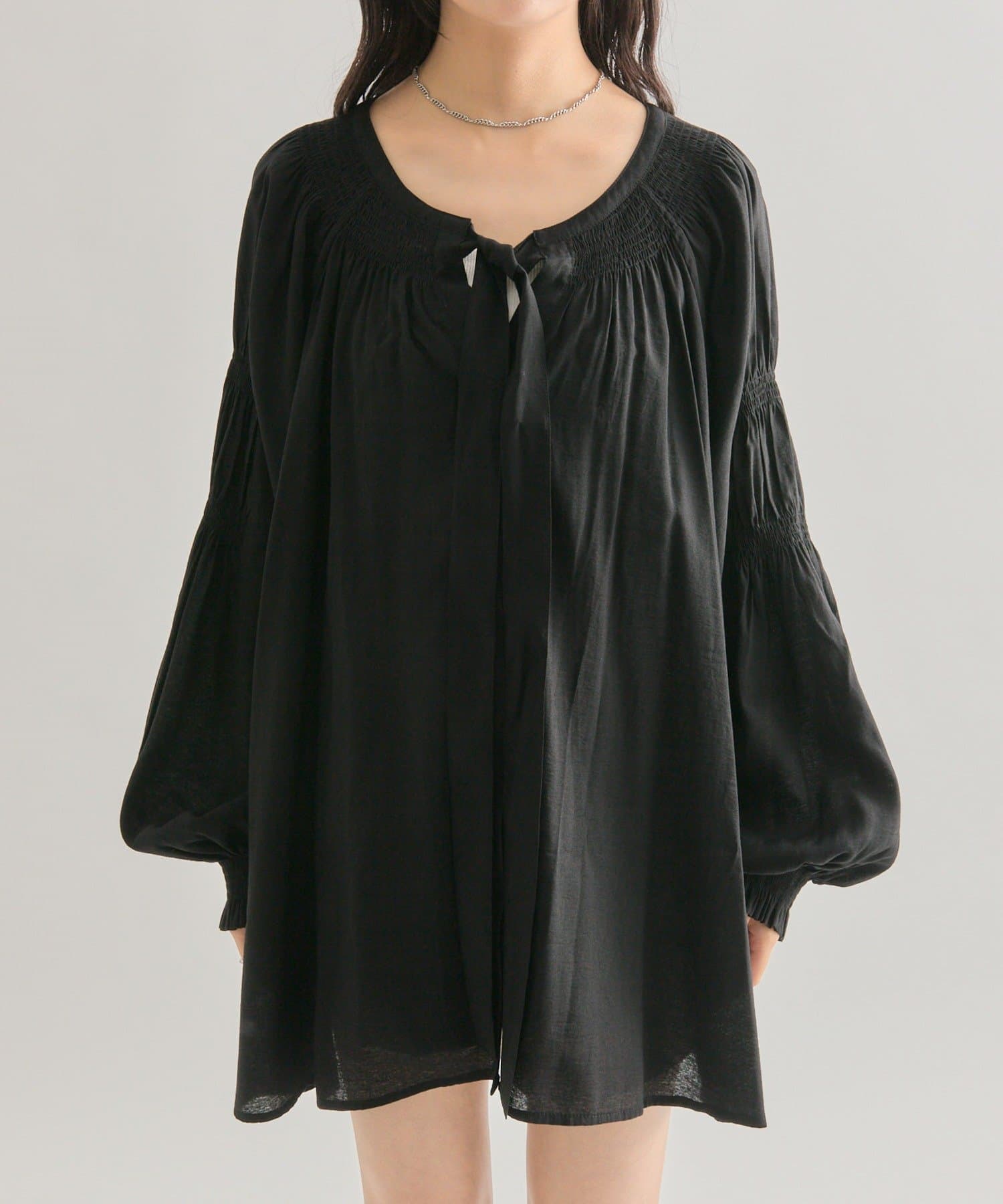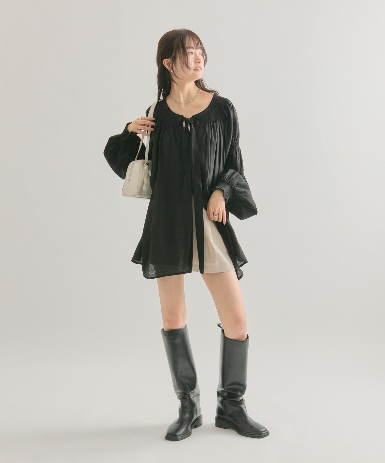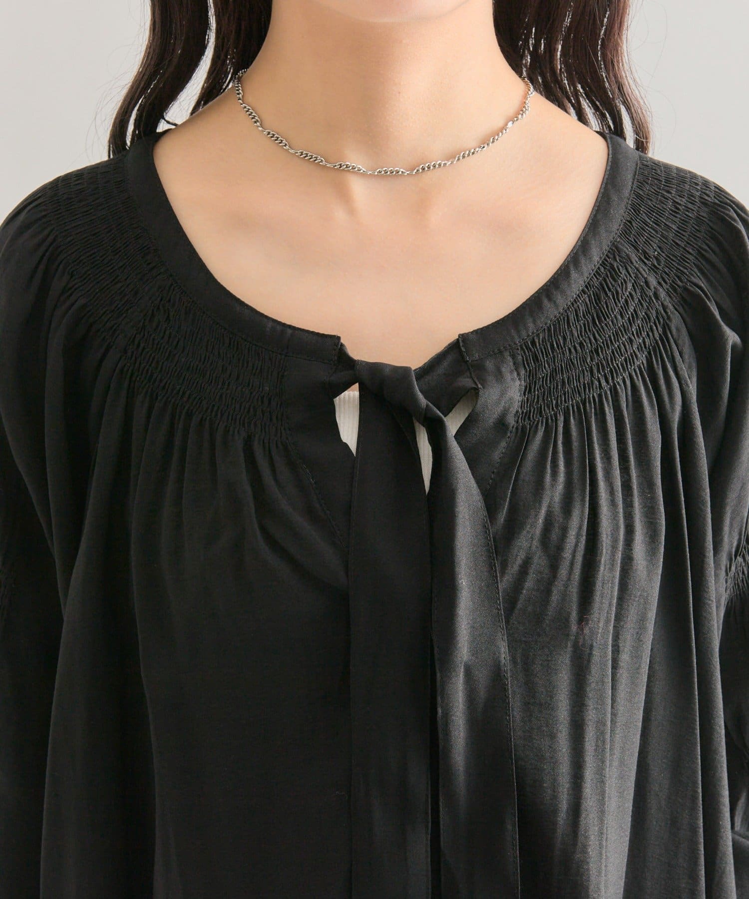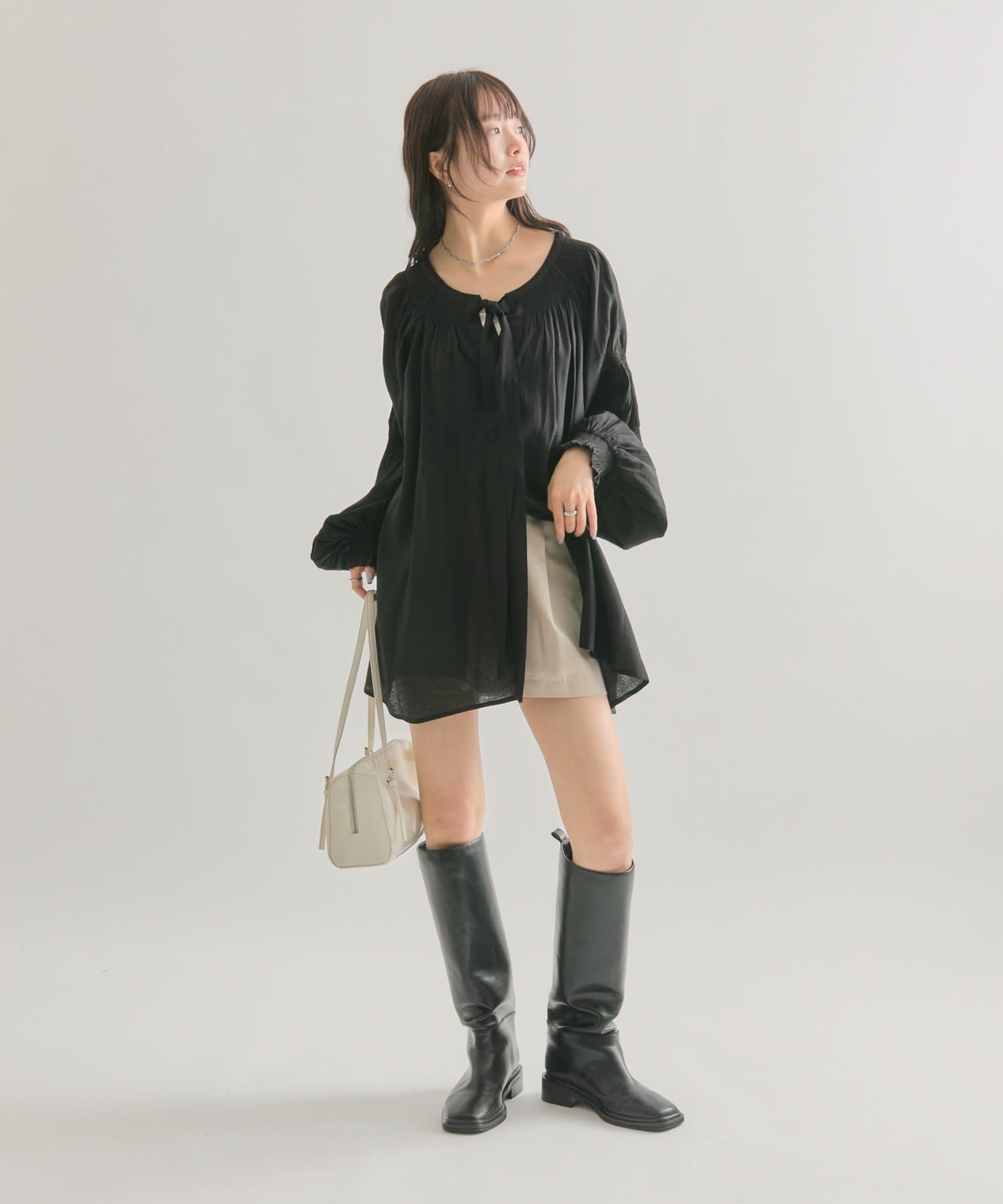 ・落ち感のあるシルエットでふんわりとした女性らしいシルエットが魅力的なボウタイスキッパーブラウス。