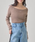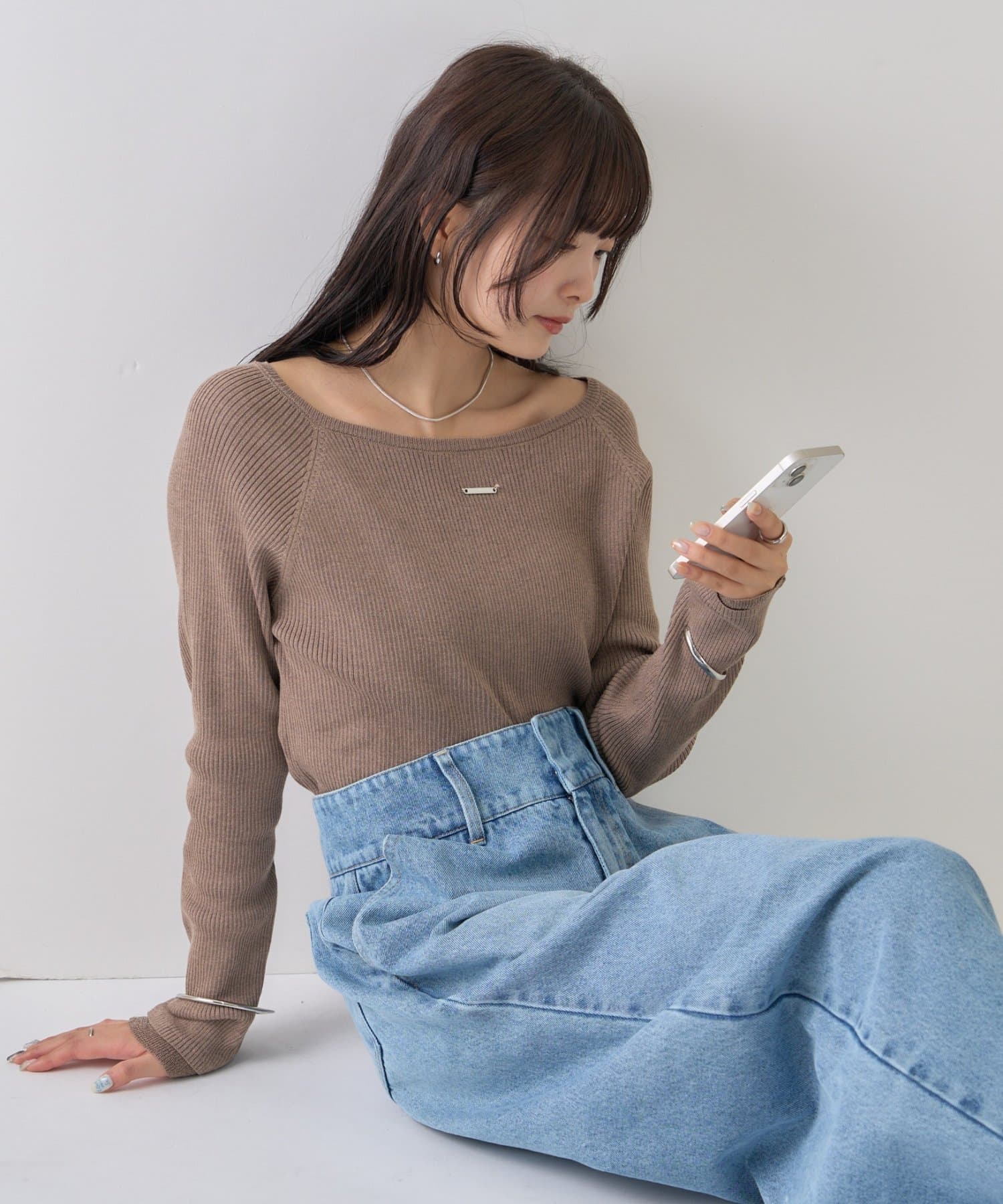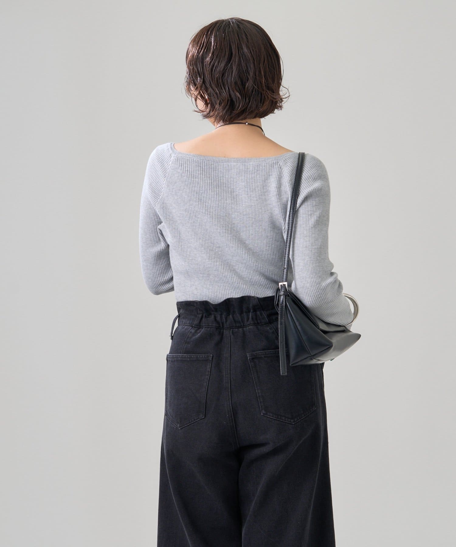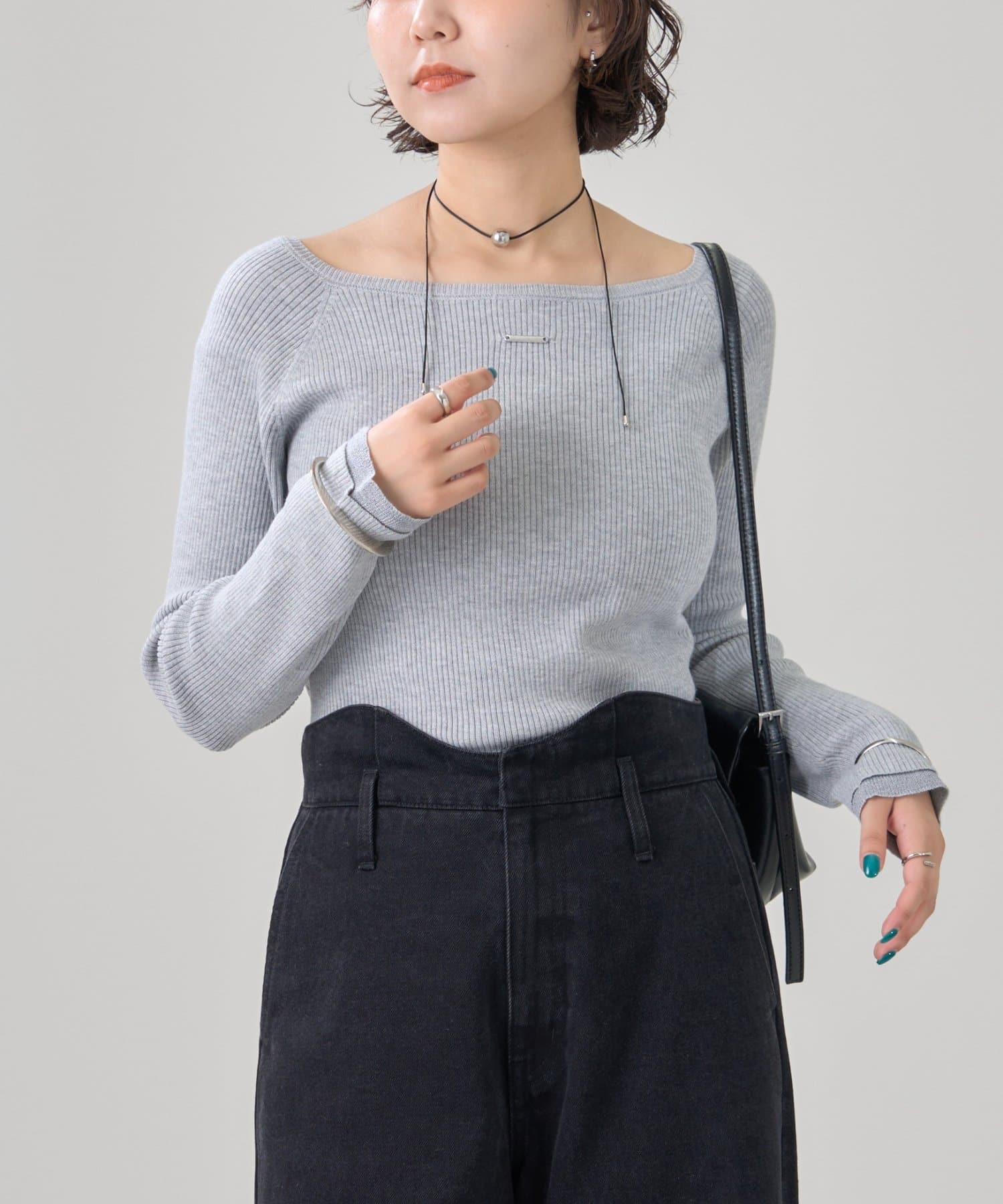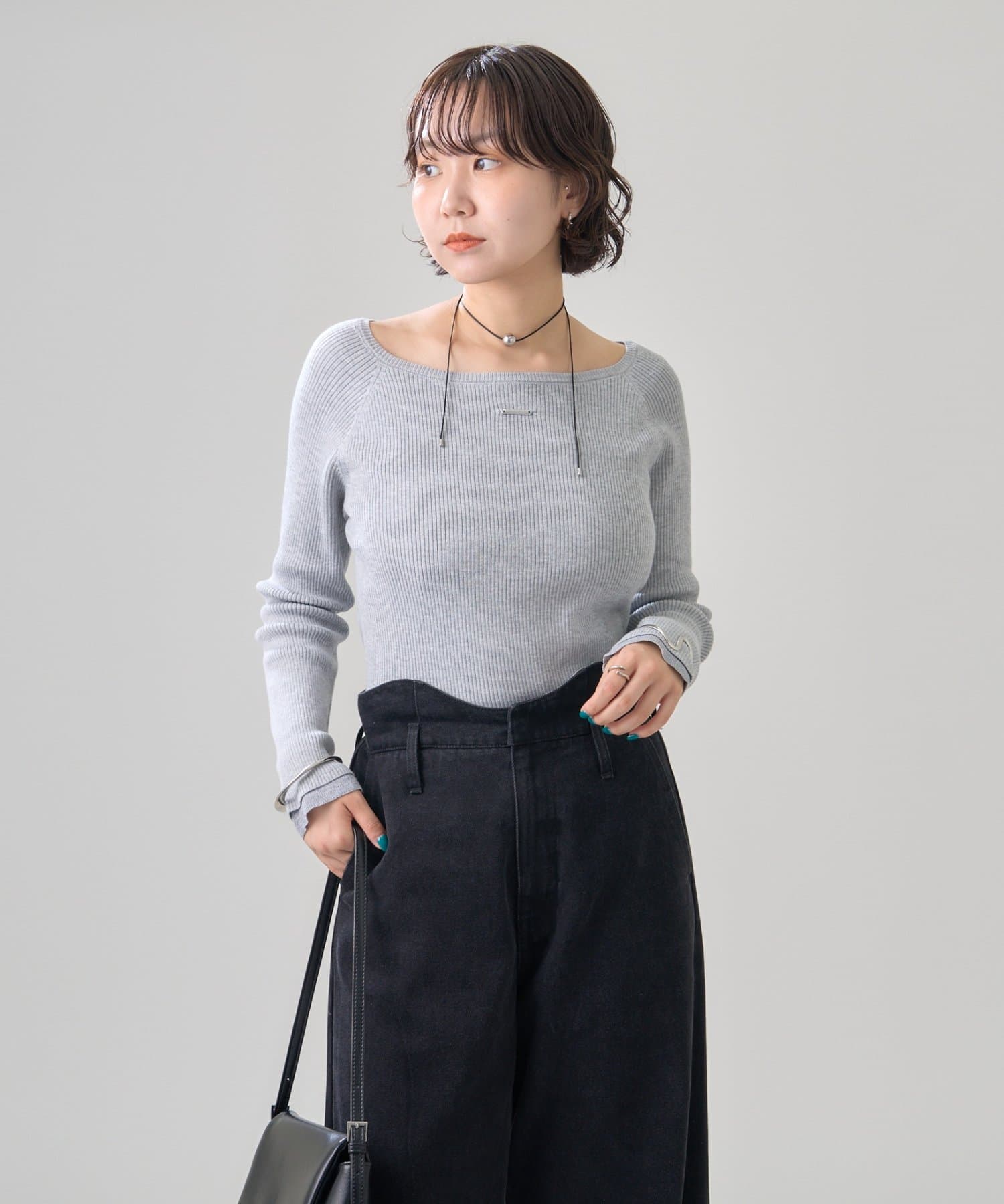 ボートネックで女性らしく華奢見えするクルーリブニット!
