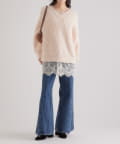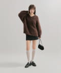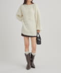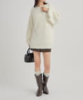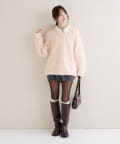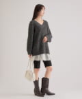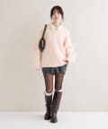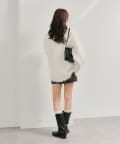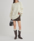 ・オーバーサイズなのでショート丈のボトムスに足元はブーツを合わせて可愛らしいフェミニンスタイルに。