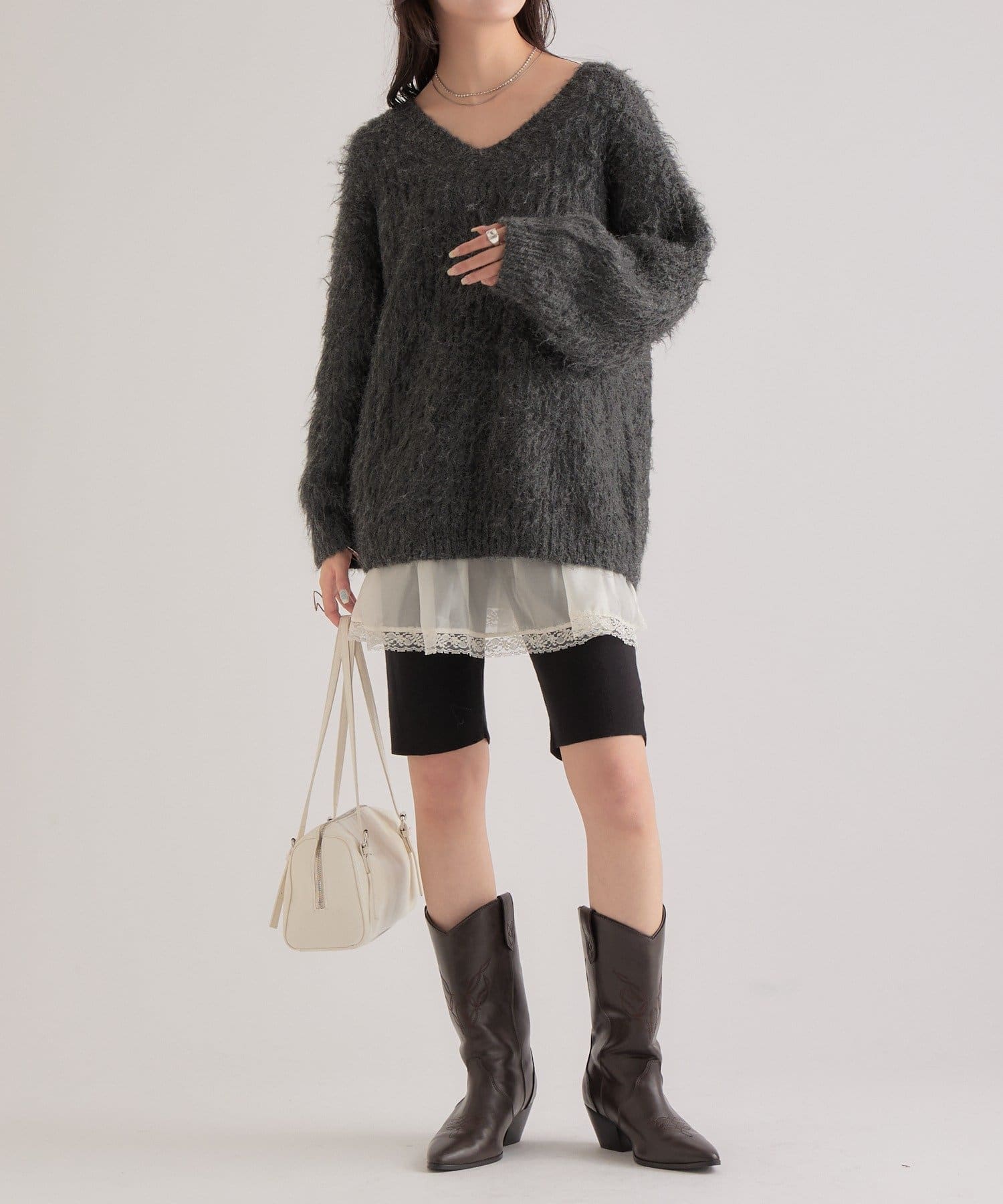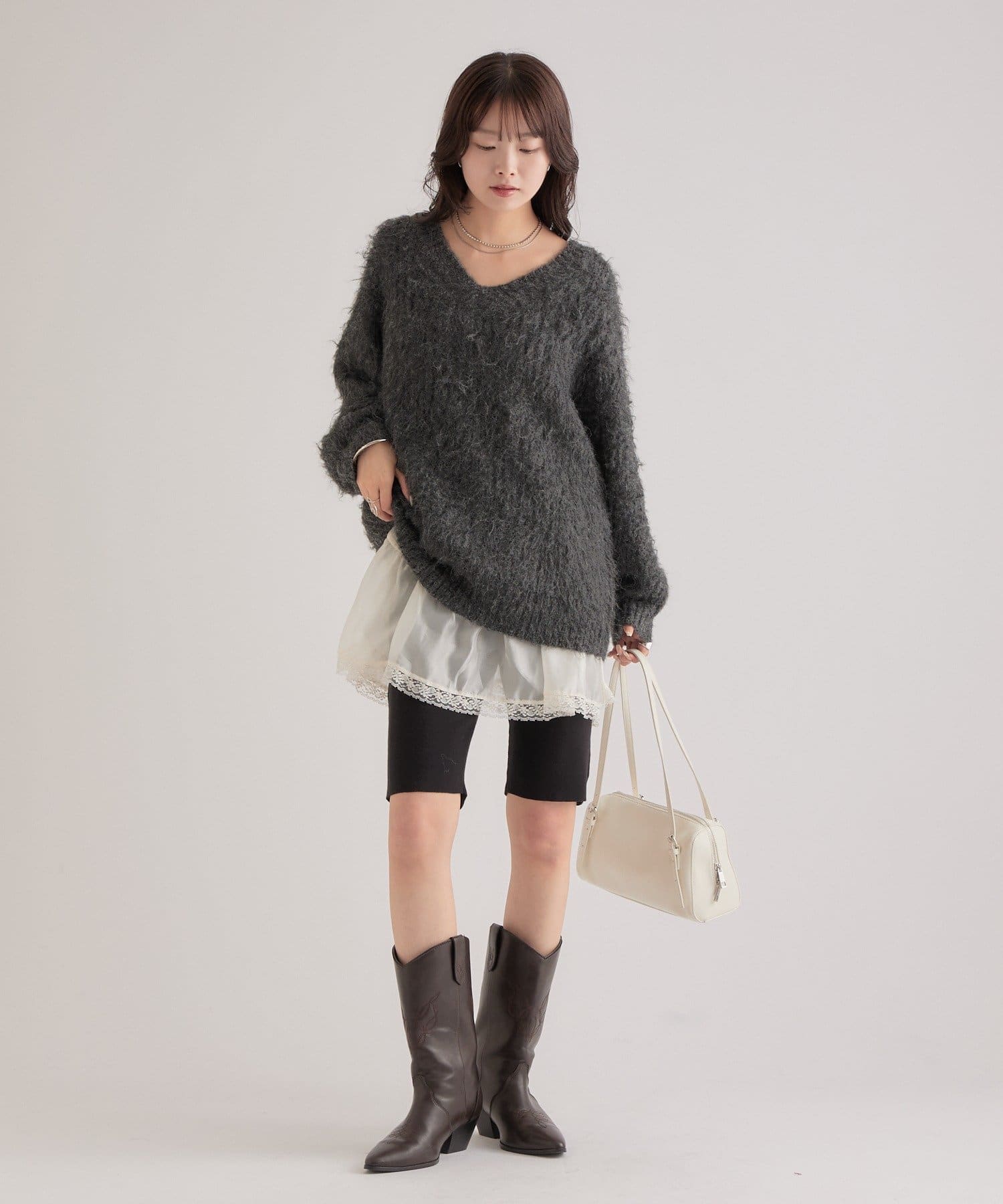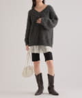 ・オーバーサイズなのでショート丈のボトムスに足元はブーツを合わせて可愛らしいフェミニンスタイルに。
