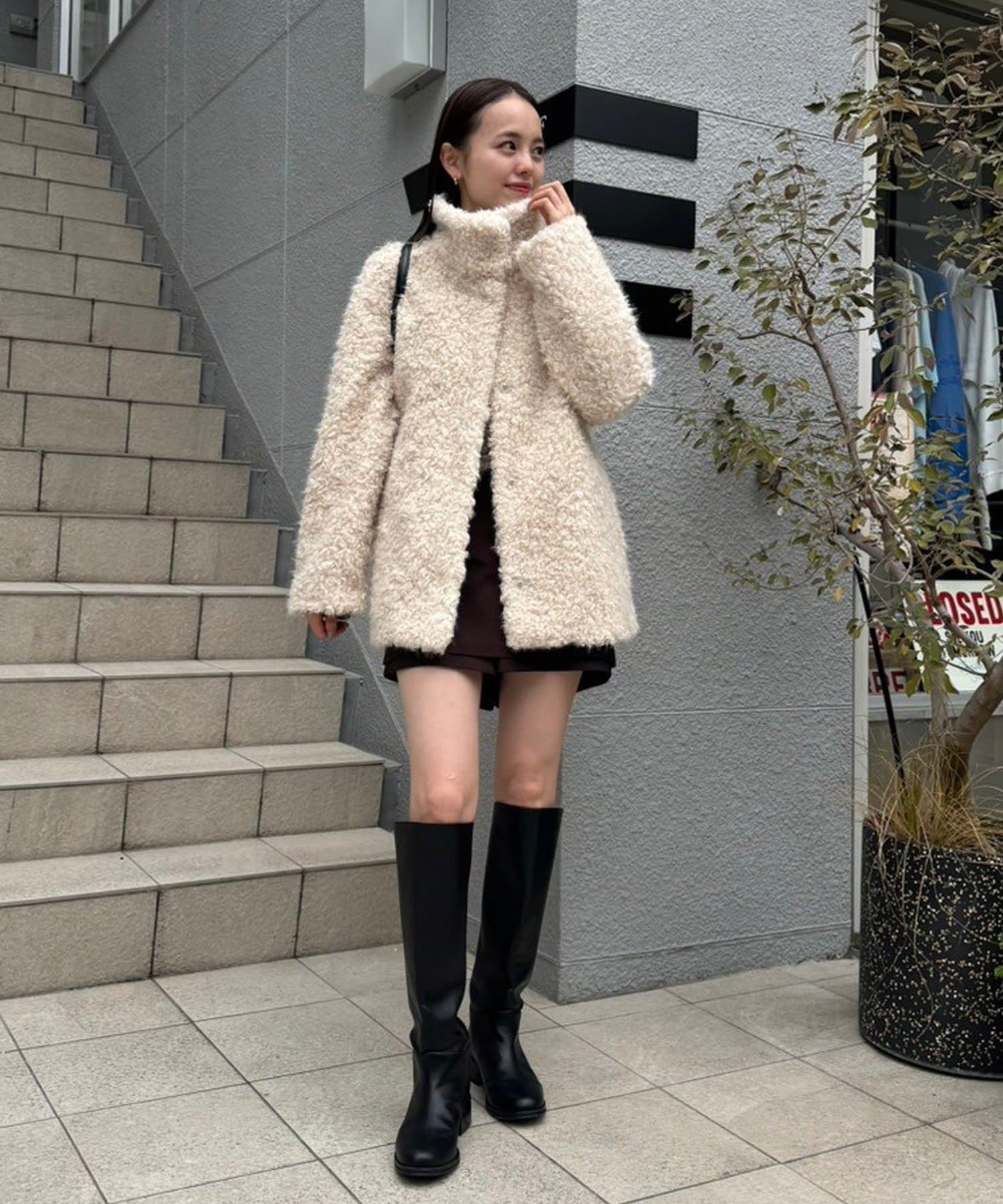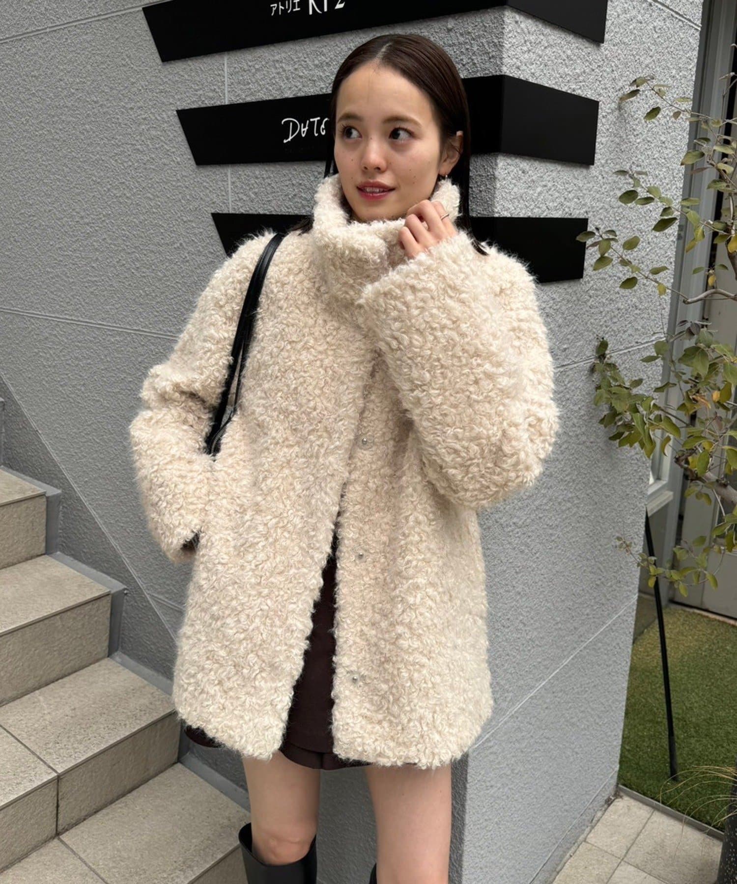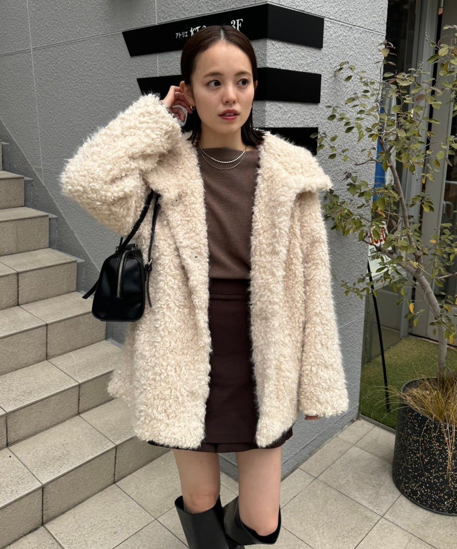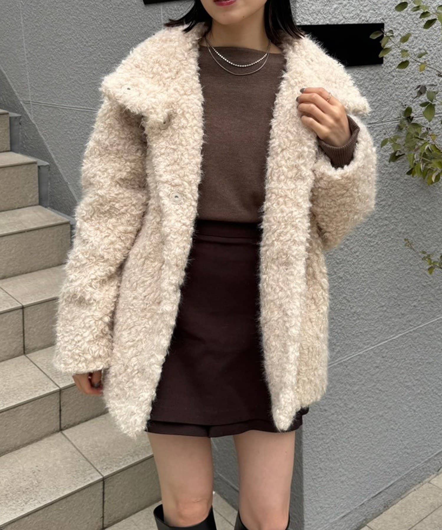 ・ボリューム感のある巻き毛のフェイクファーが目を惹く主役級ミドルコート。