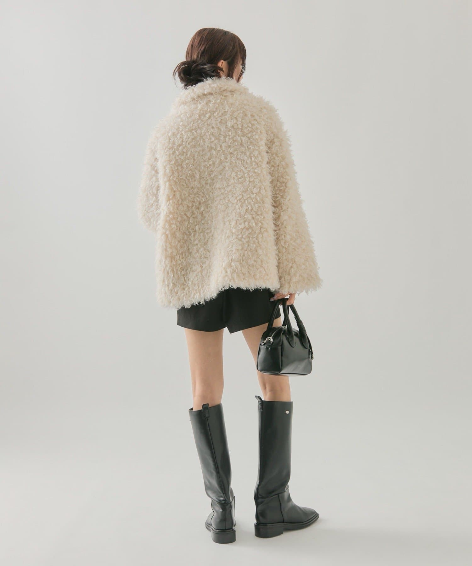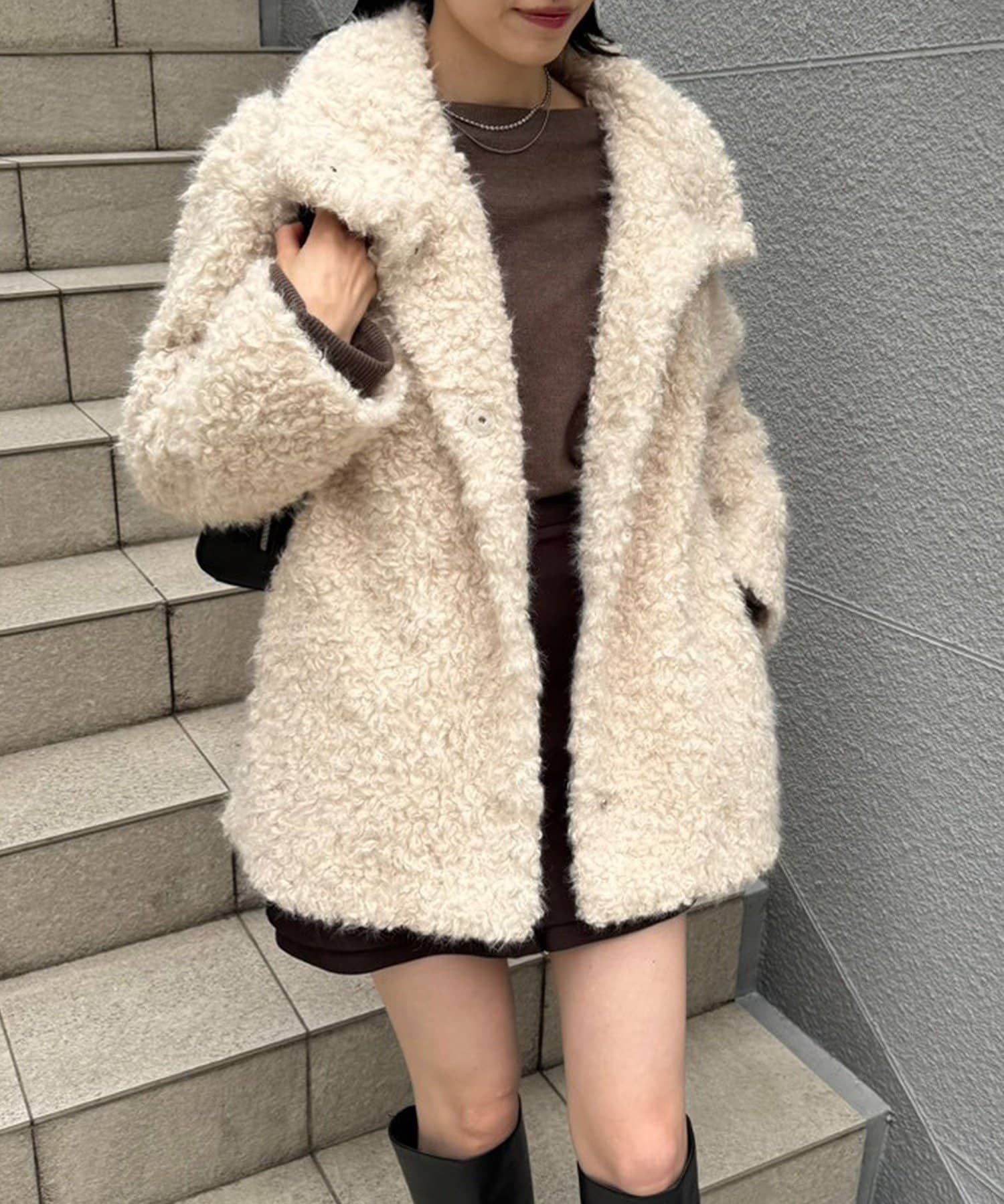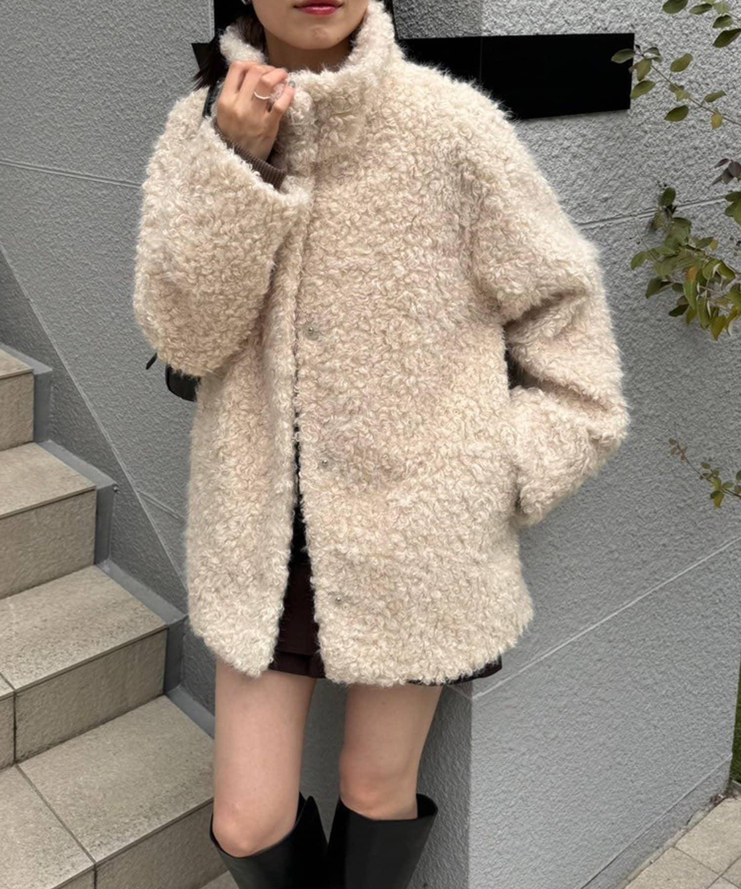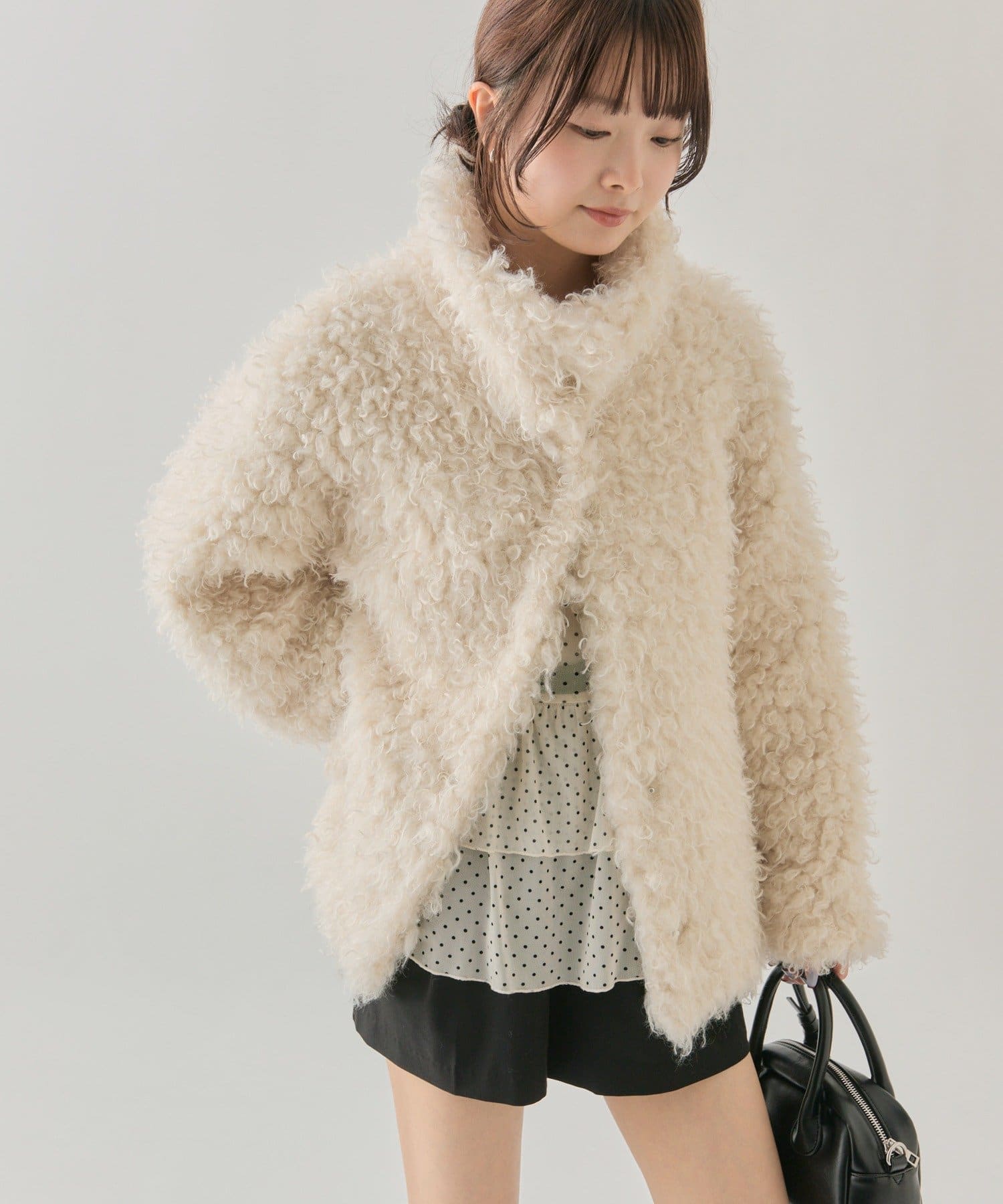 ・ボリューム感のある巻き毛のフェイクファーが目を惹く主役級ミドルコート。