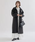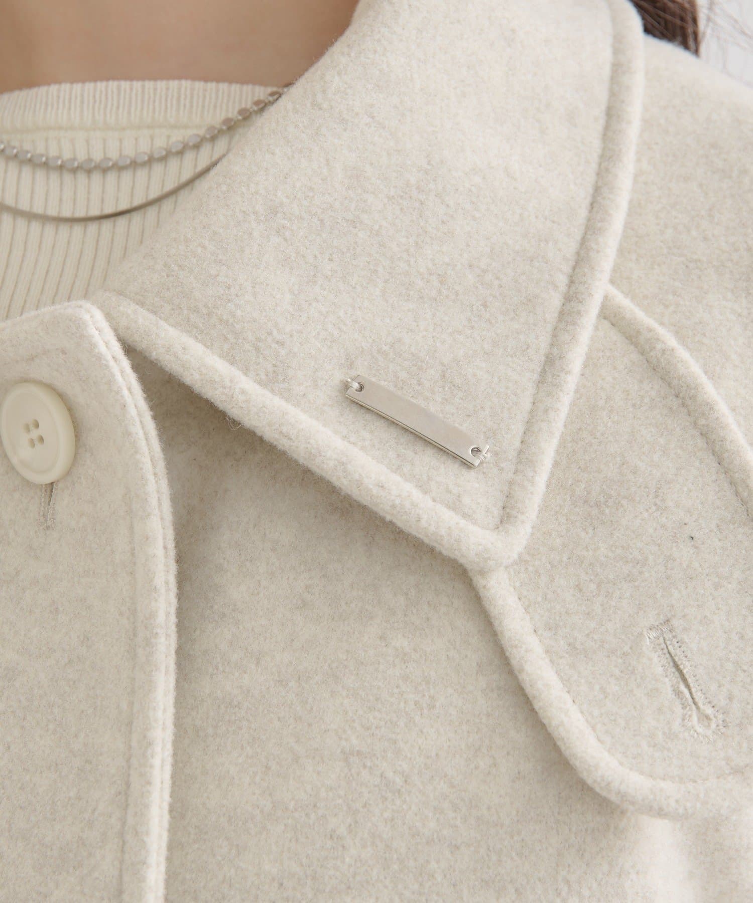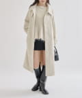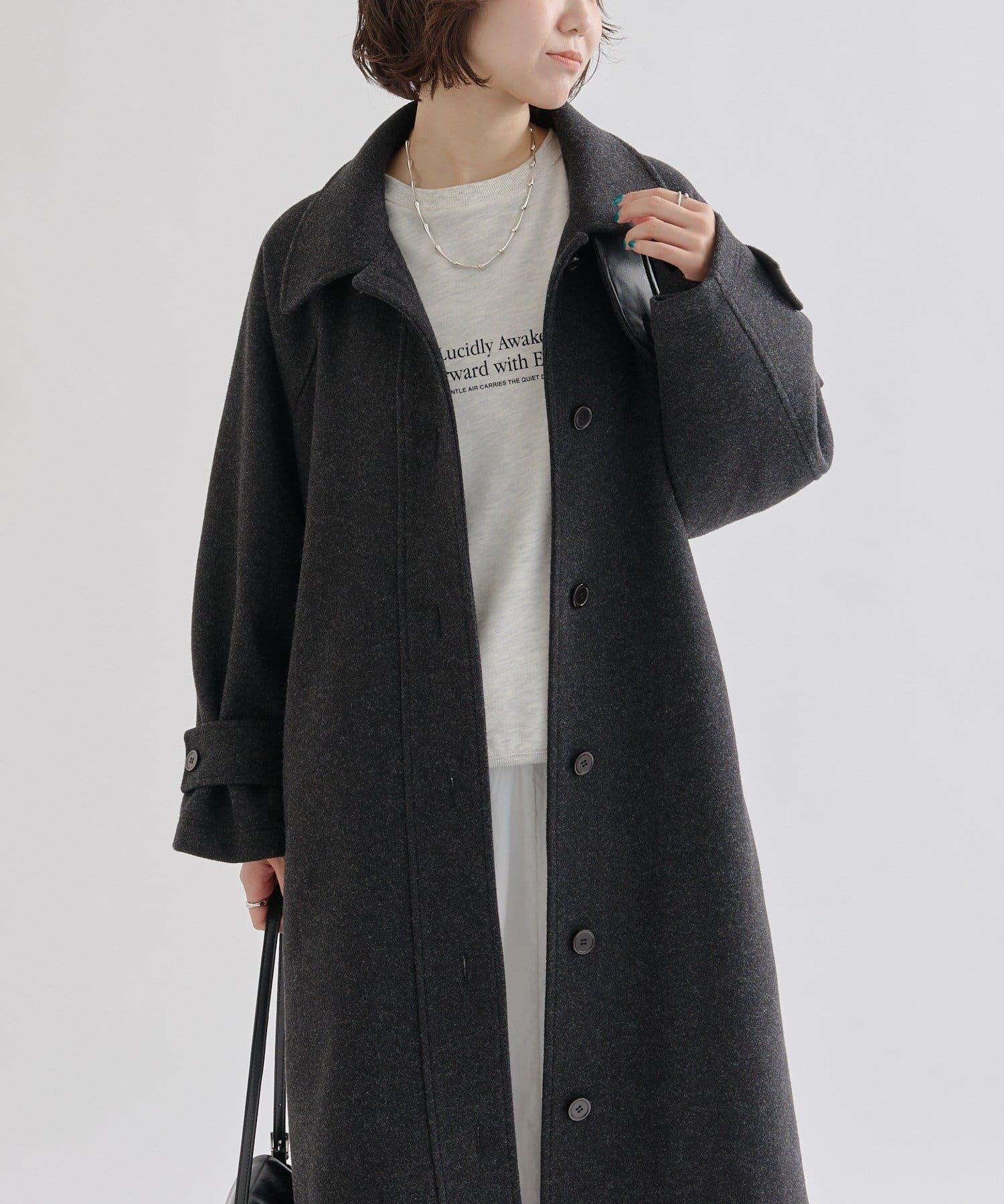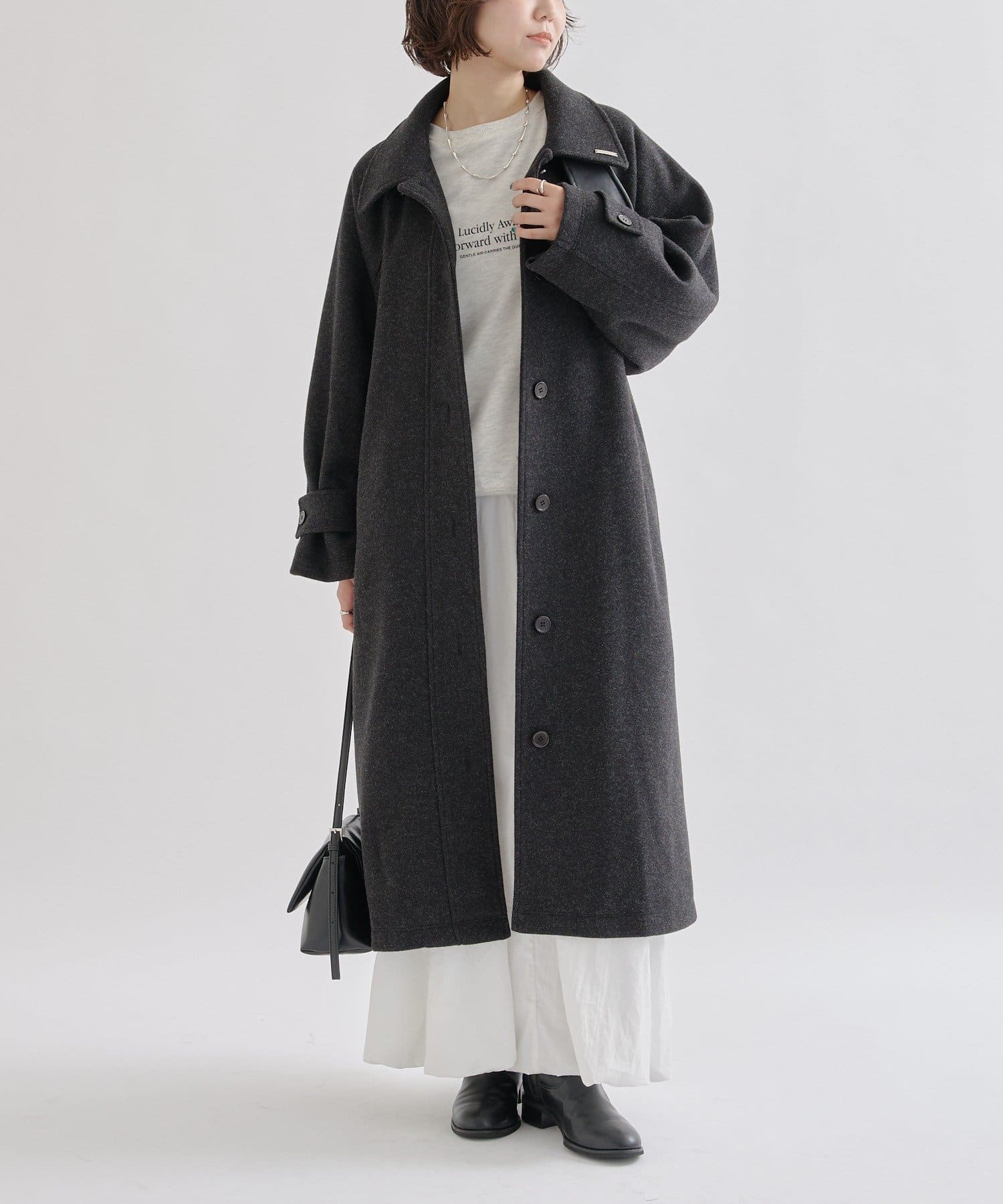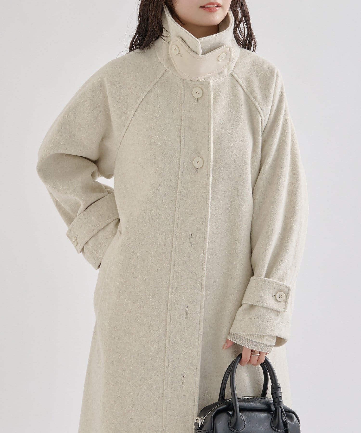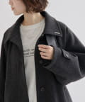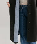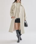 ・スタンドカラーとして使える襟が特徴で生地感が高見えするロングコート。襟元の小さなプレートが上品なアクセントに。