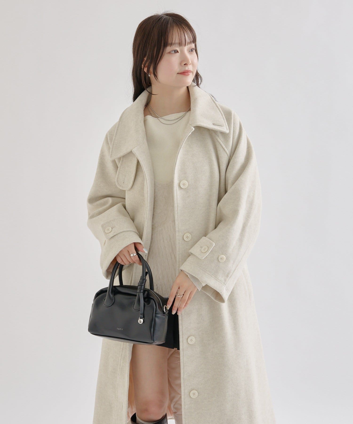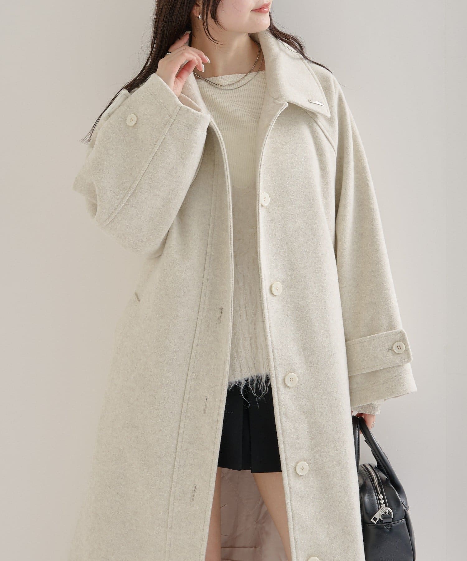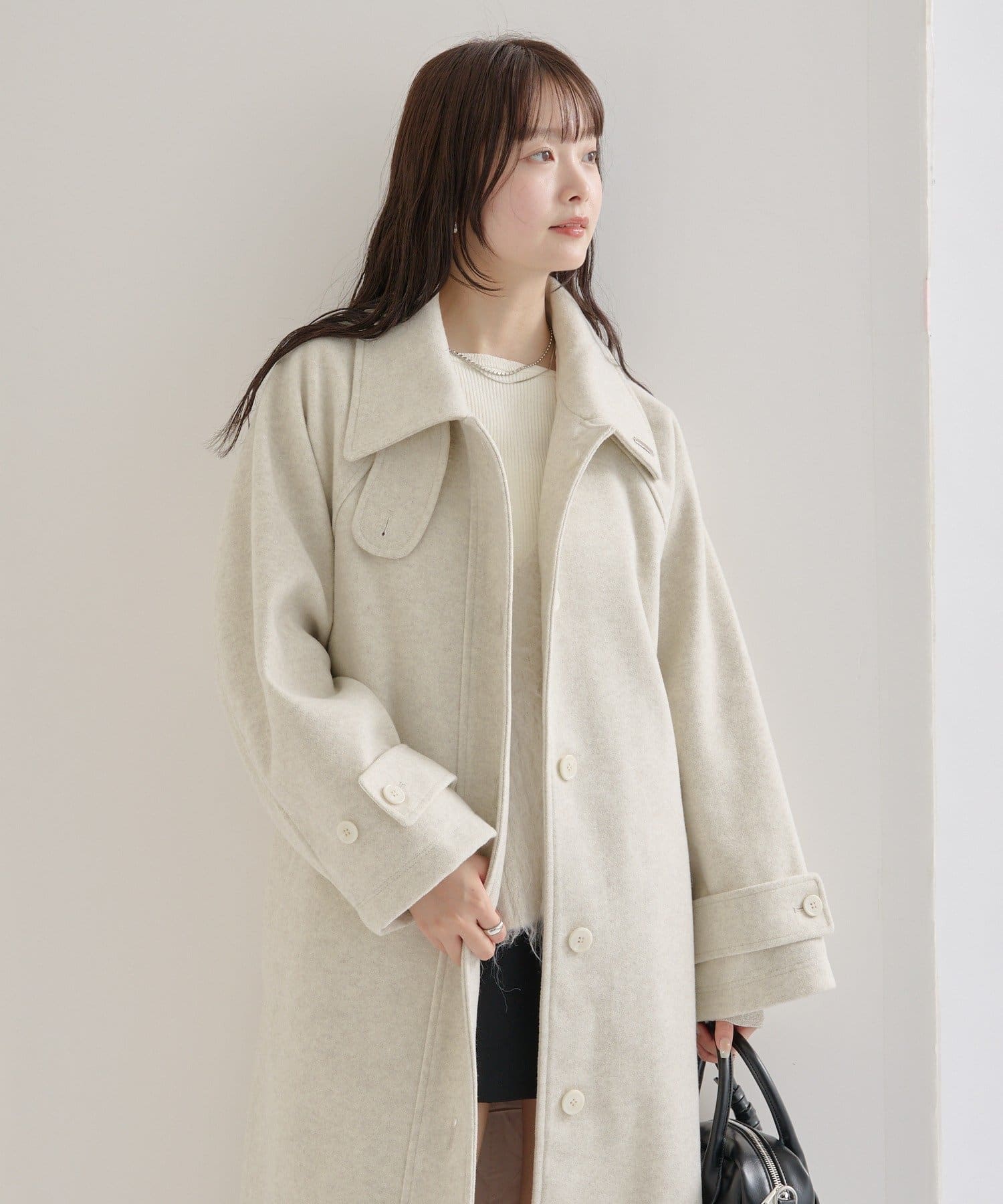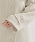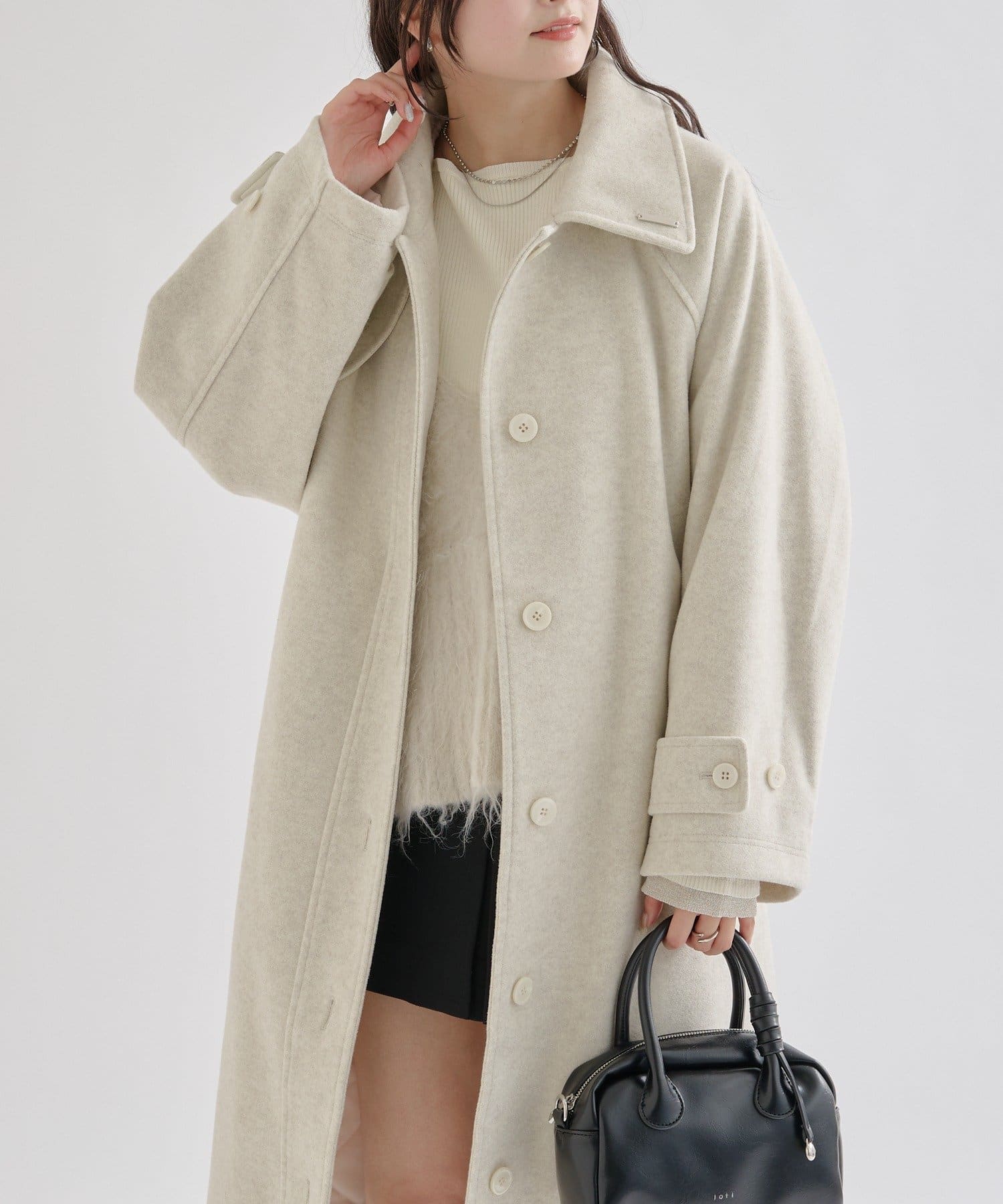 ・スタンドカラーとして使える襟が特徴で生地感が高見えするロングコート。襟元の小さなプレートが上品なアクセントに。