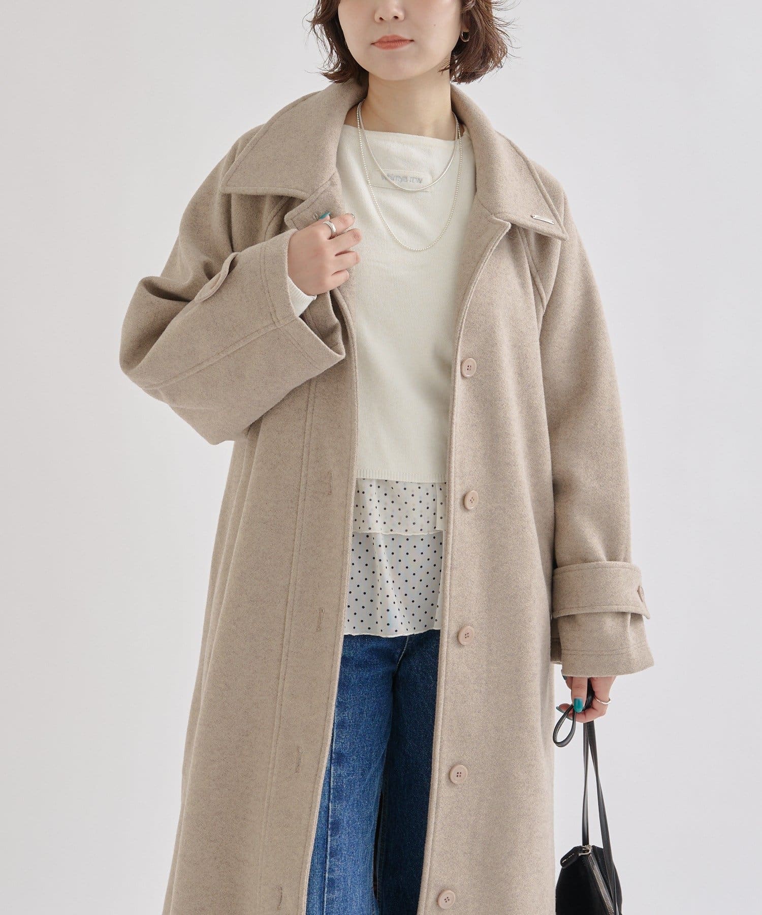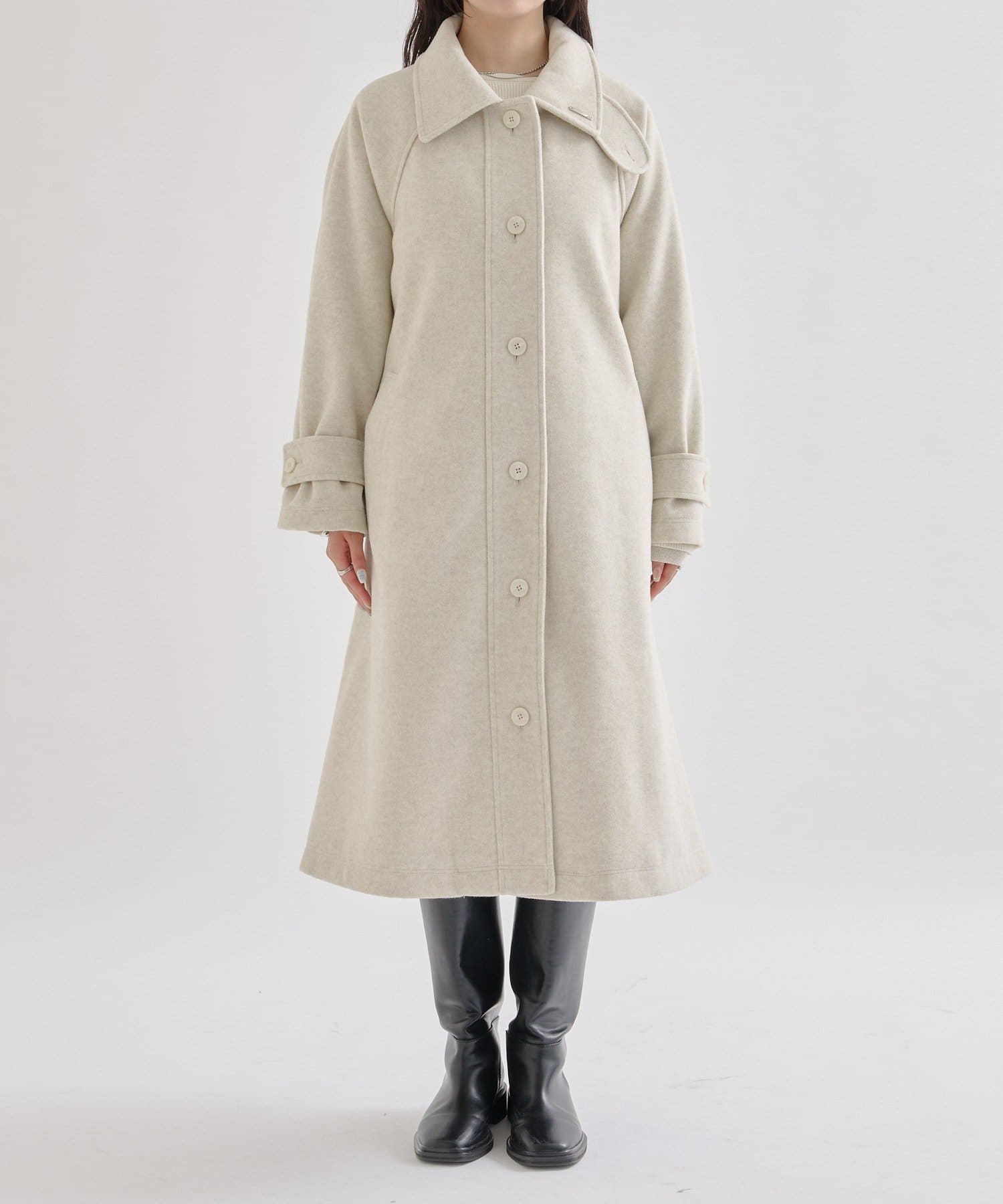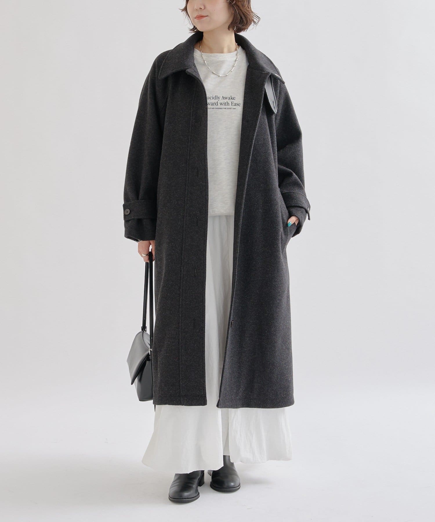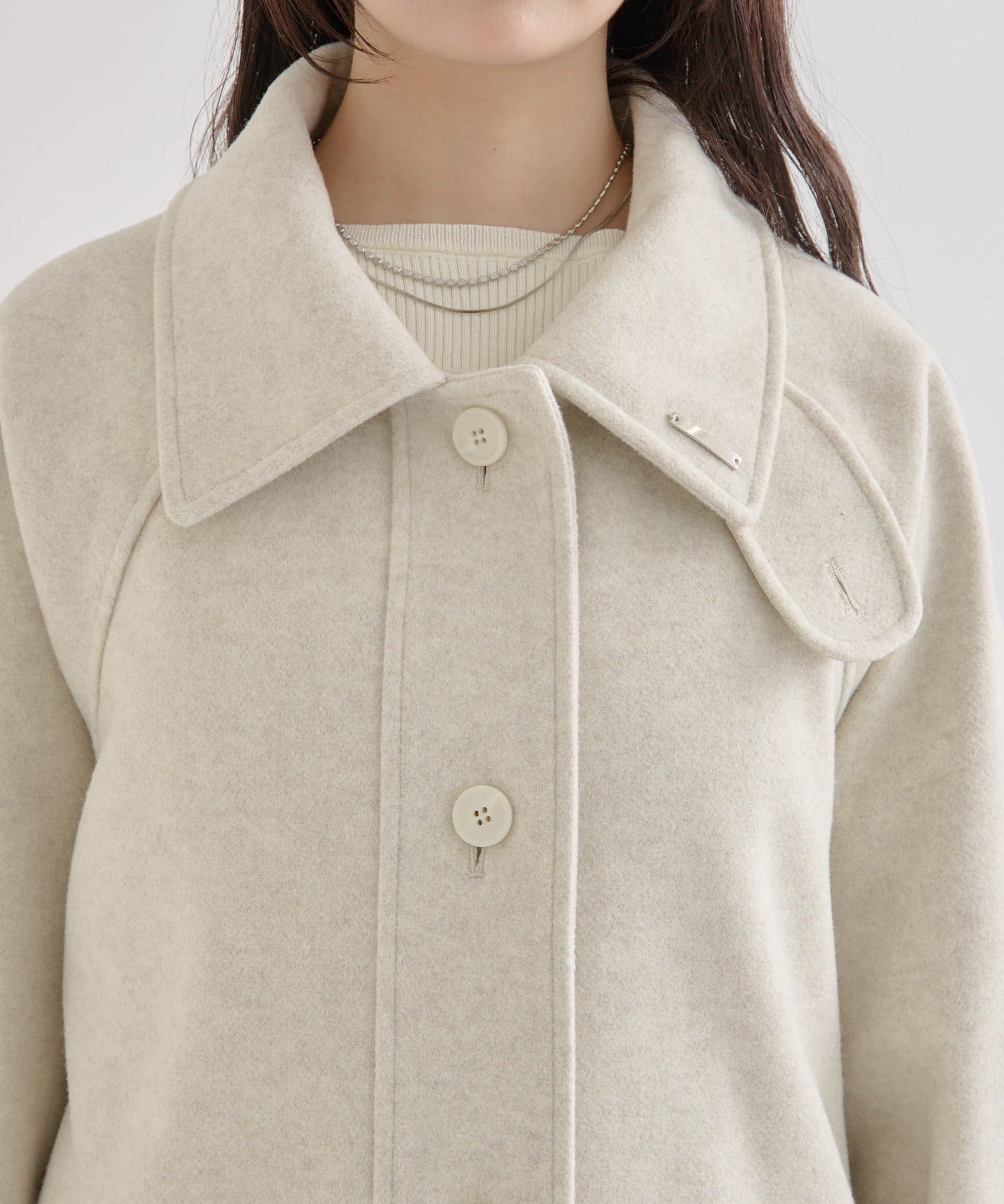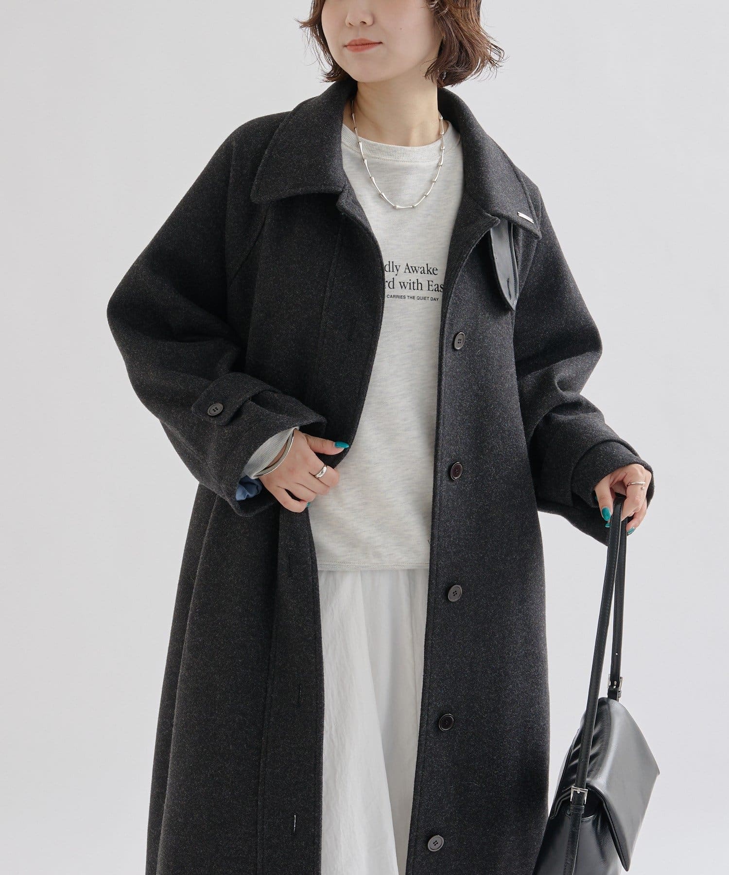 ・スタンドカラーとして使える襟が特徴で生地感が高見えするロングコート。襟元の小さなプレートが上品なアクセントに。
