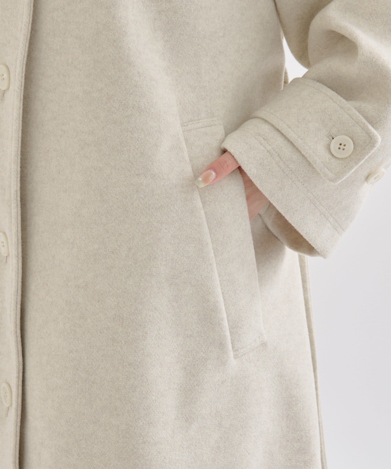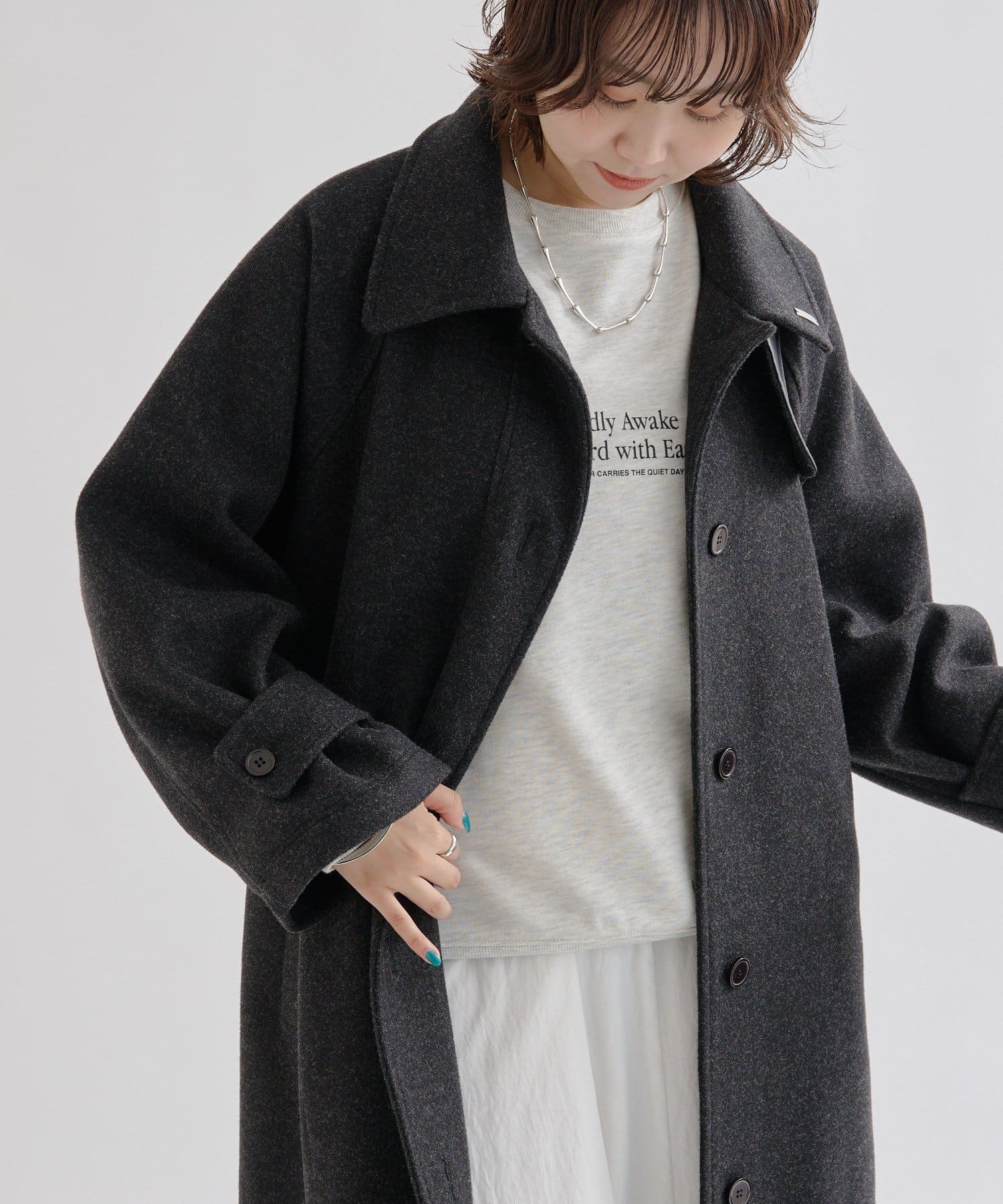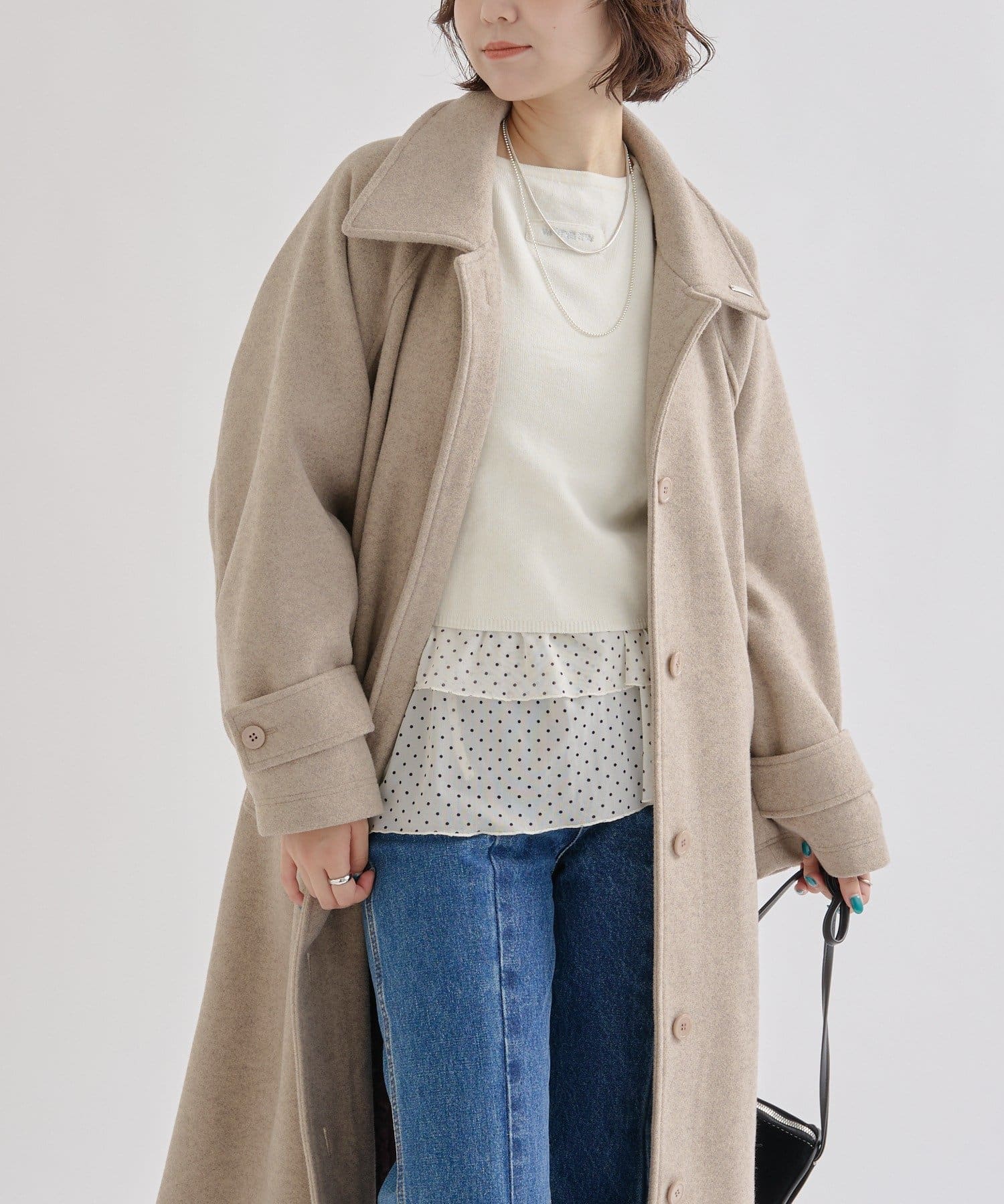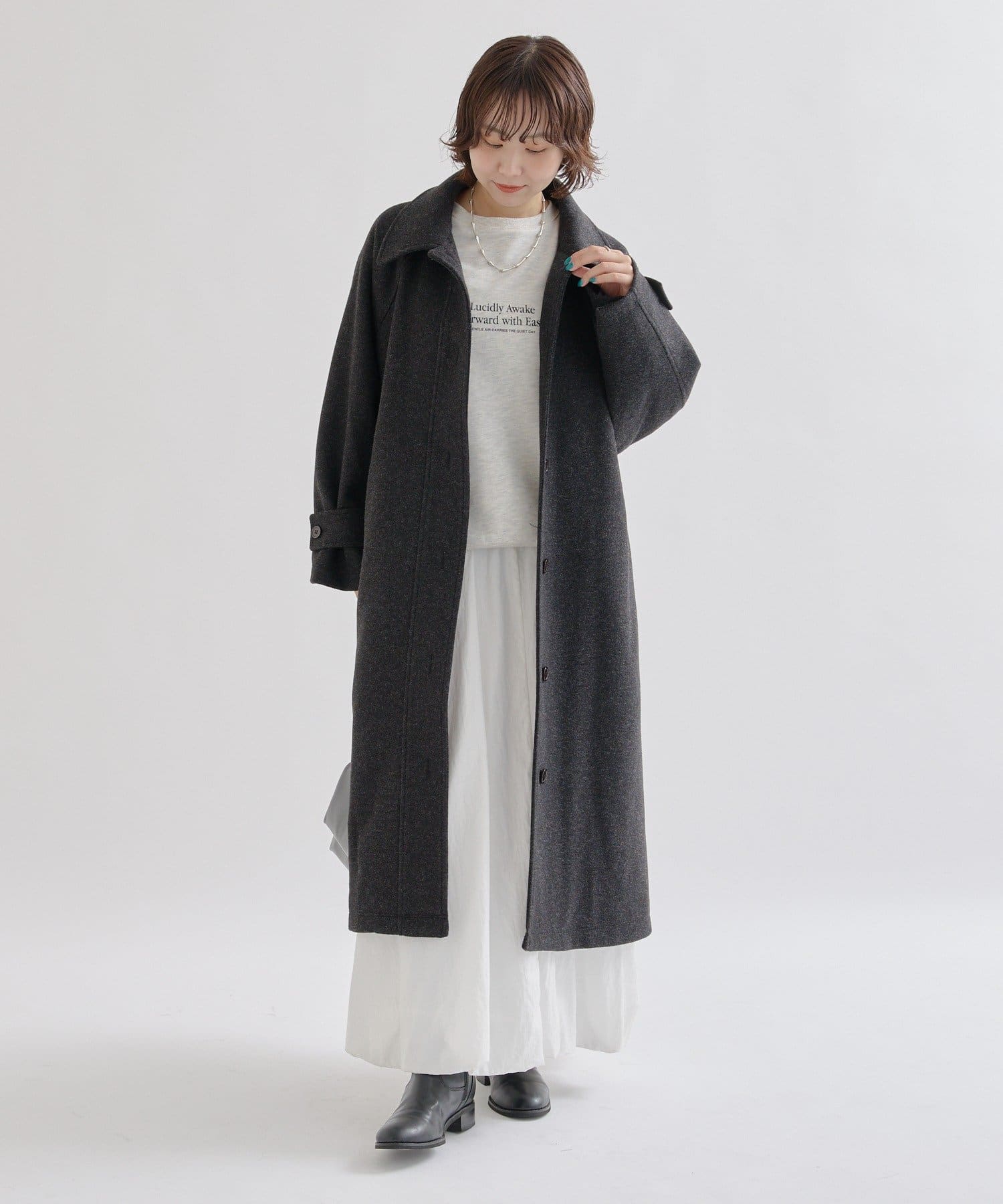 ・スタンドカラーとして使える襟が特徴で生地感が高見えするロングコート。襟元の小さなプレートが上品なアクセントに。