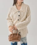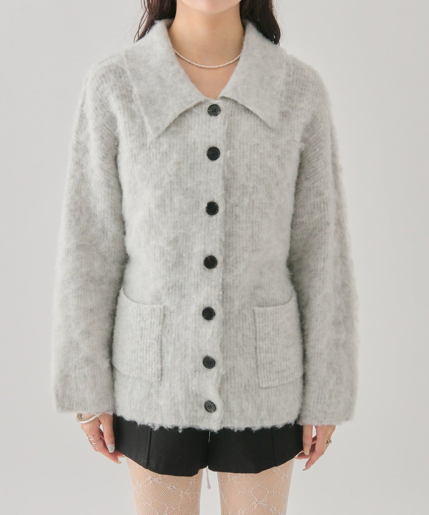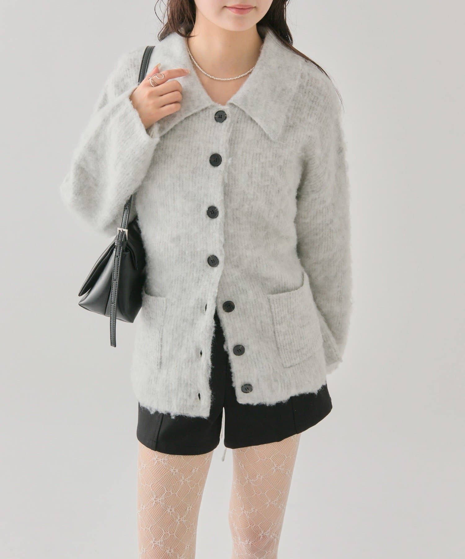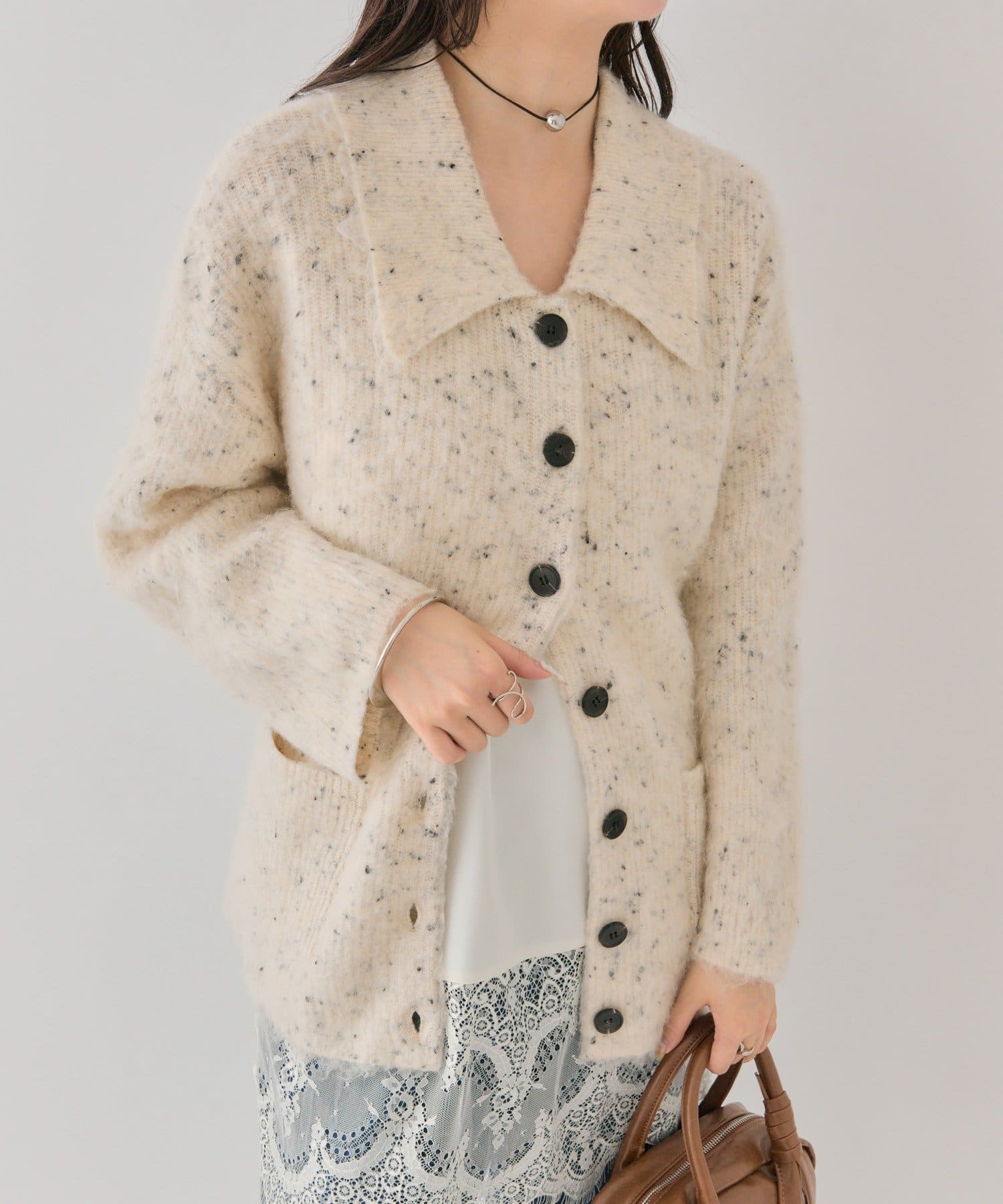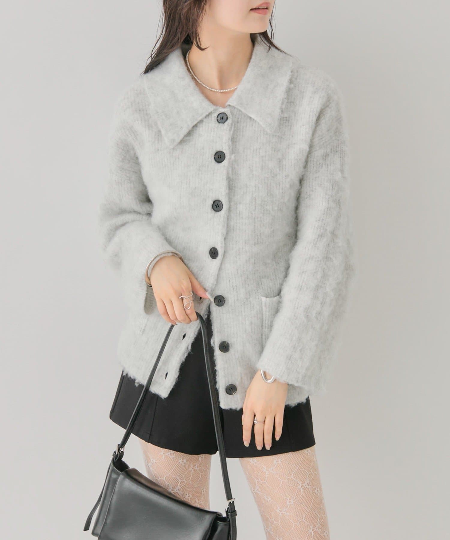 ・大きめの襟とフロントのボタンがポイントになったニットカーディガン。
