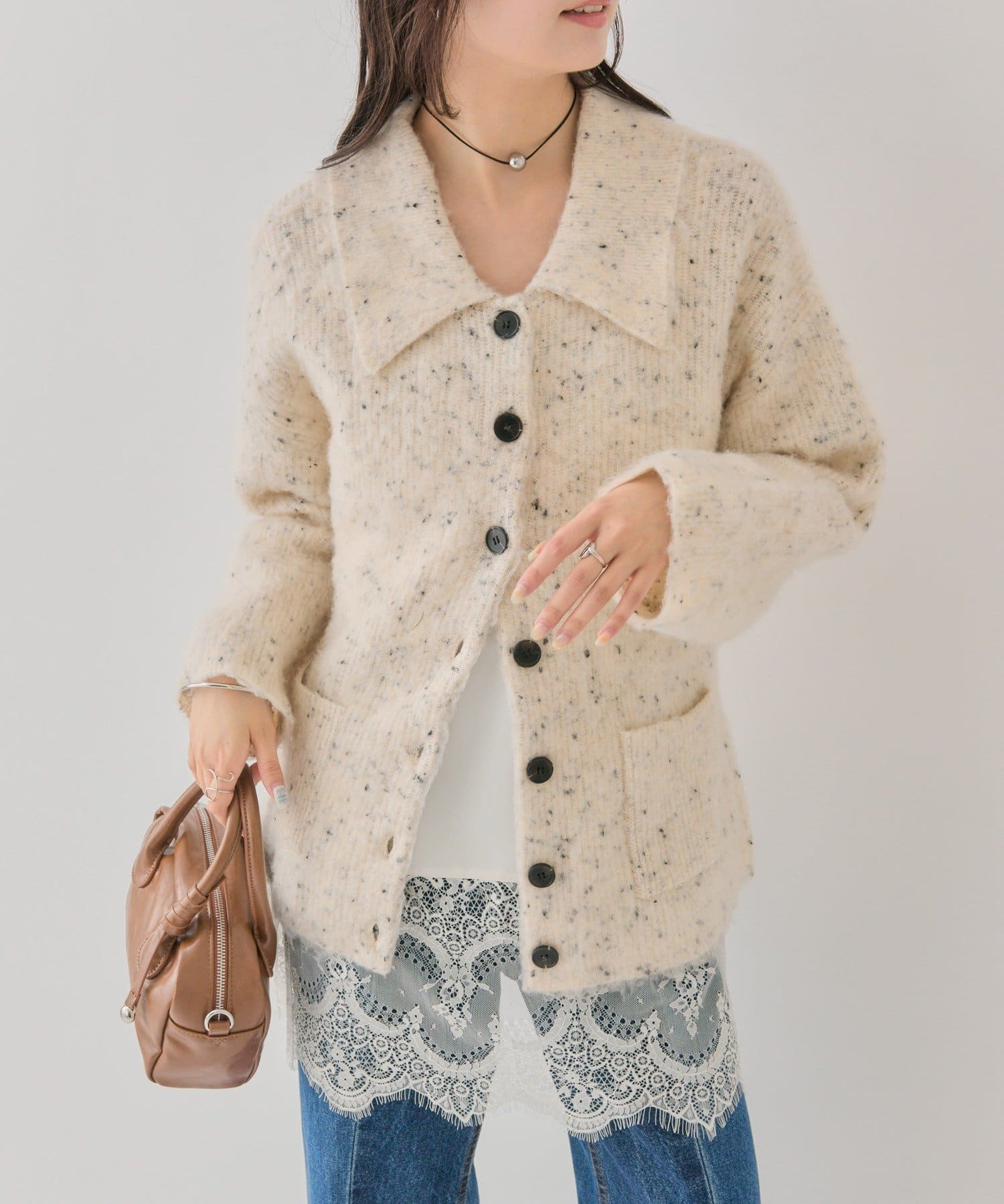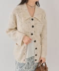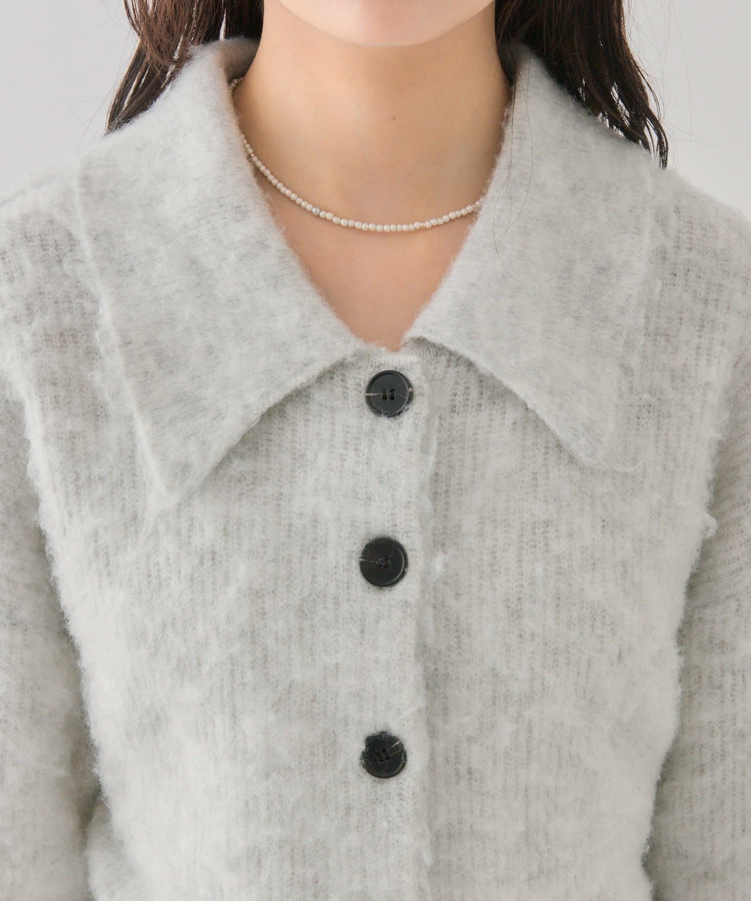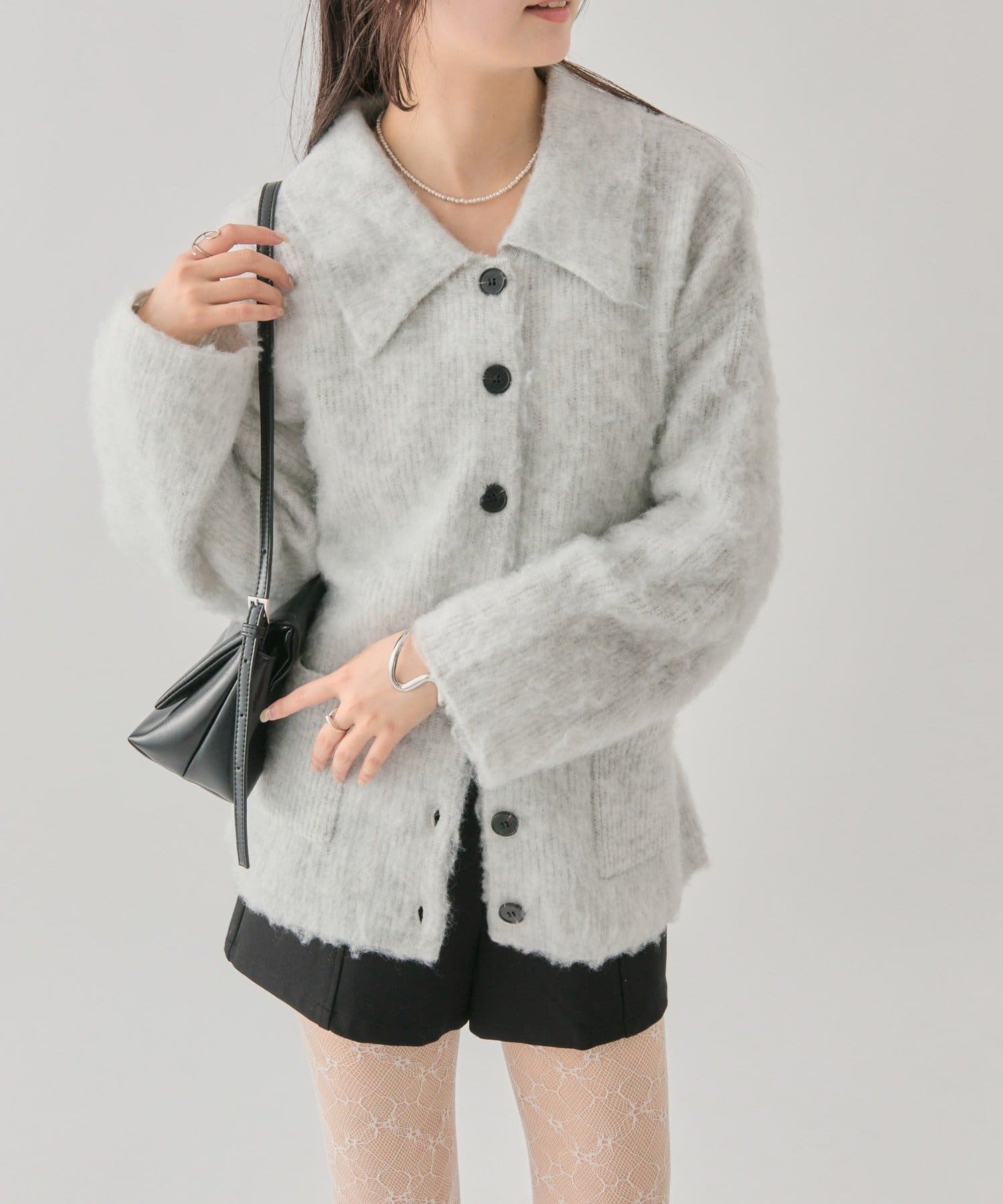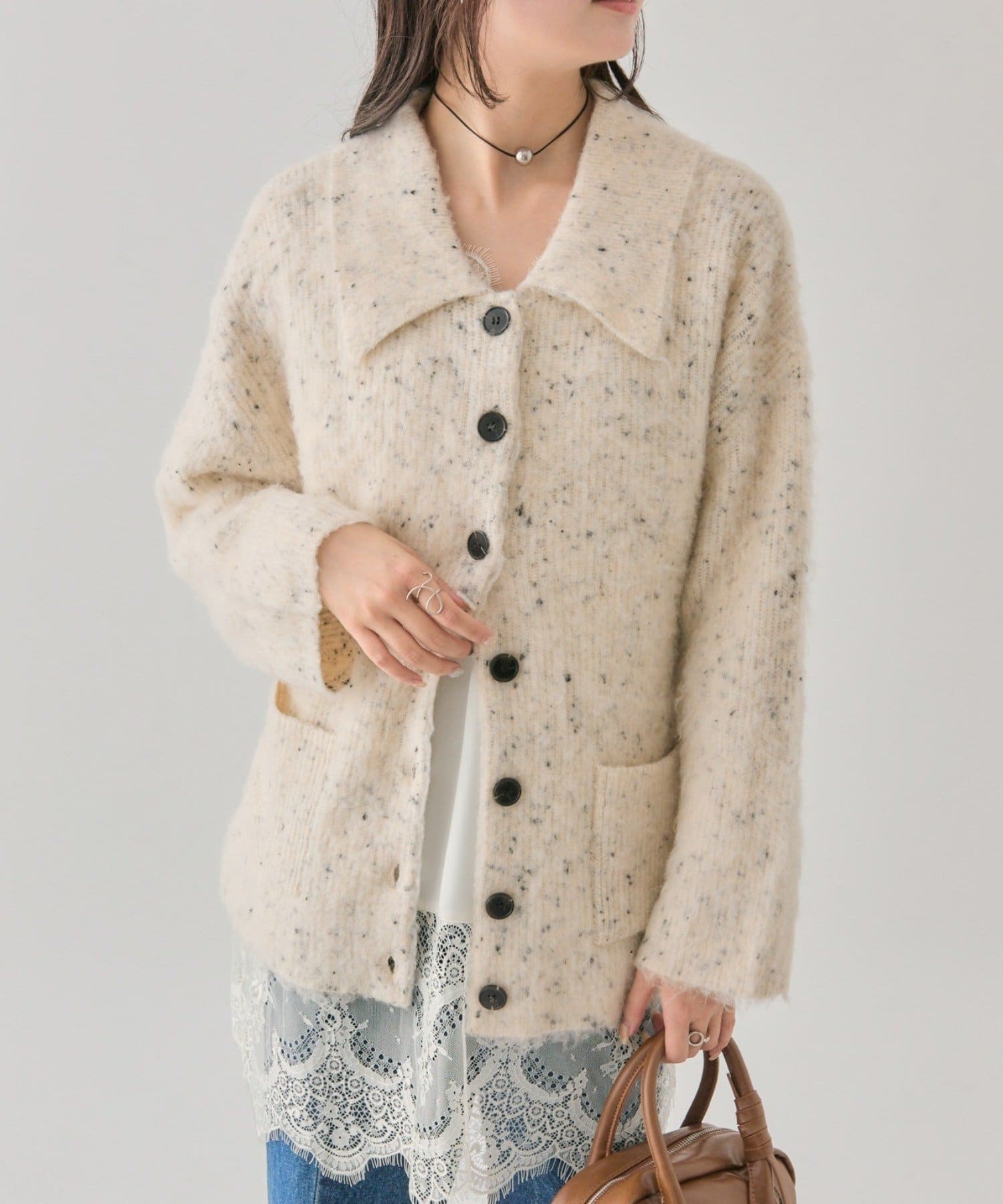 ・大きめの襟とフロントのボタンがポイントになったニットカーディガン。