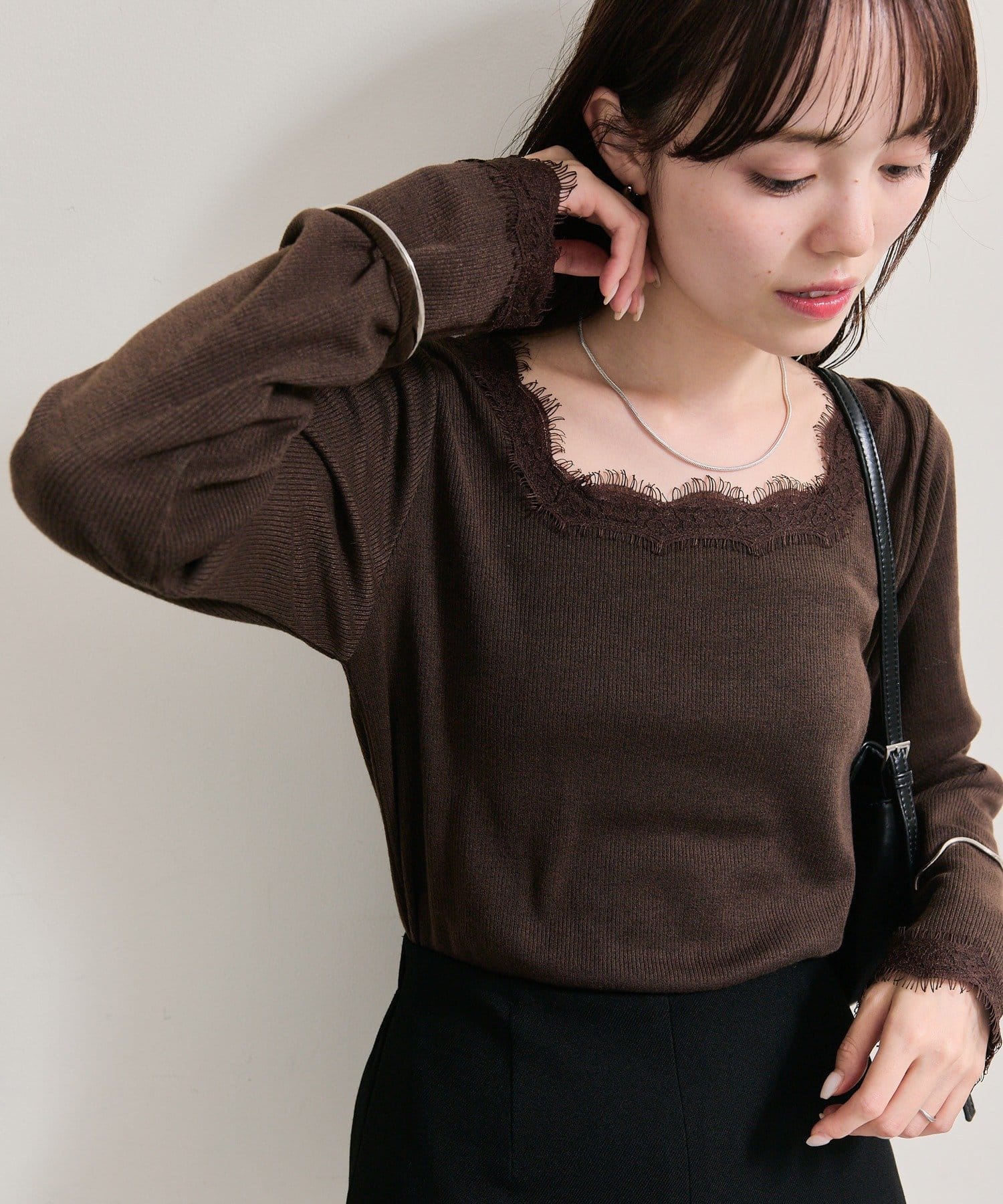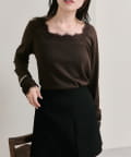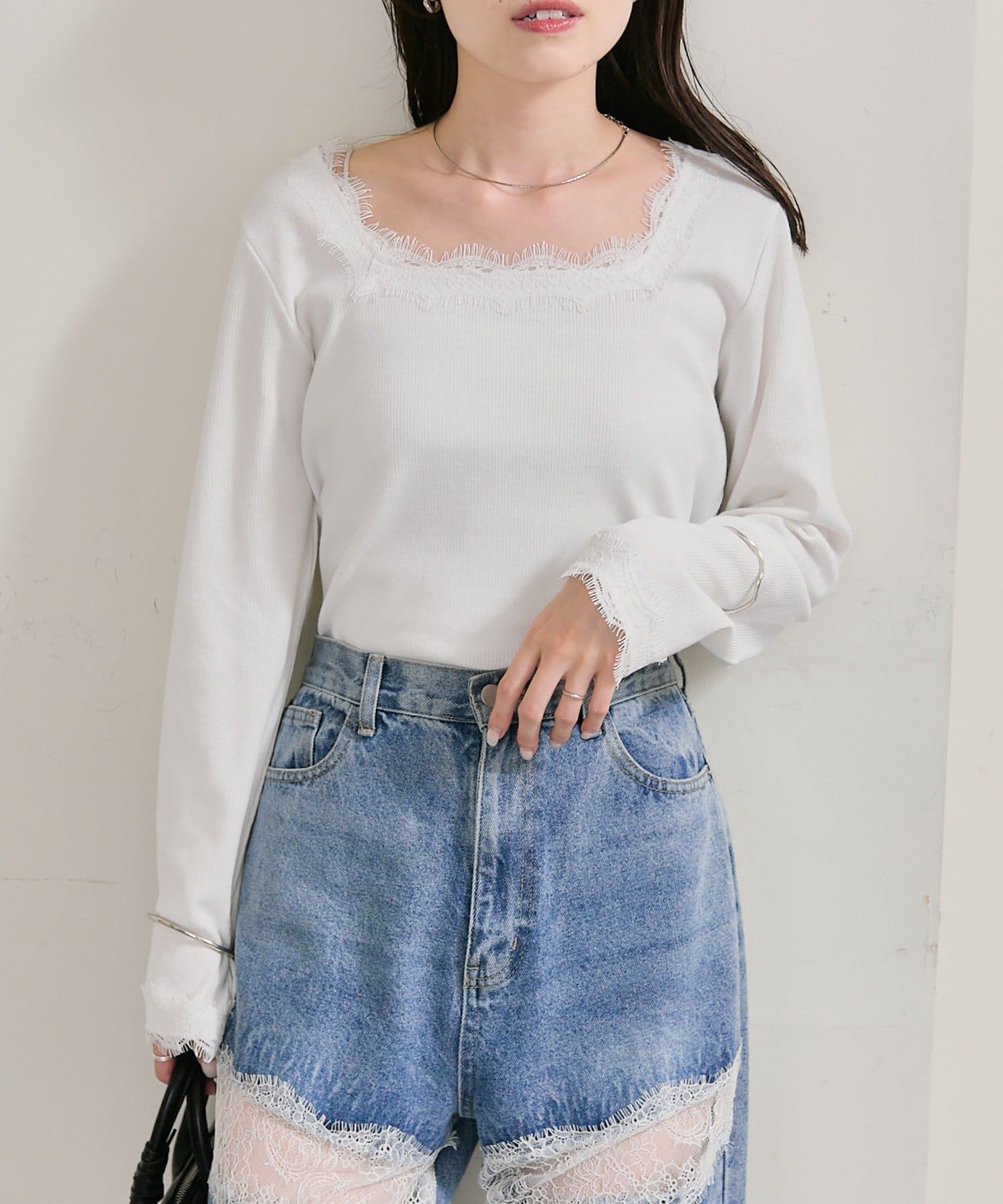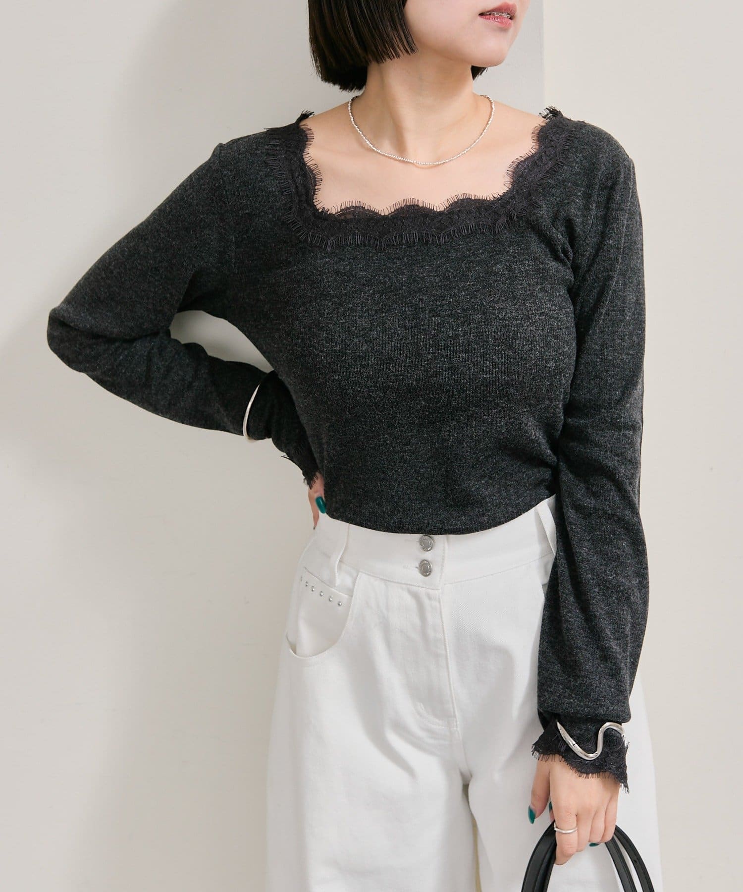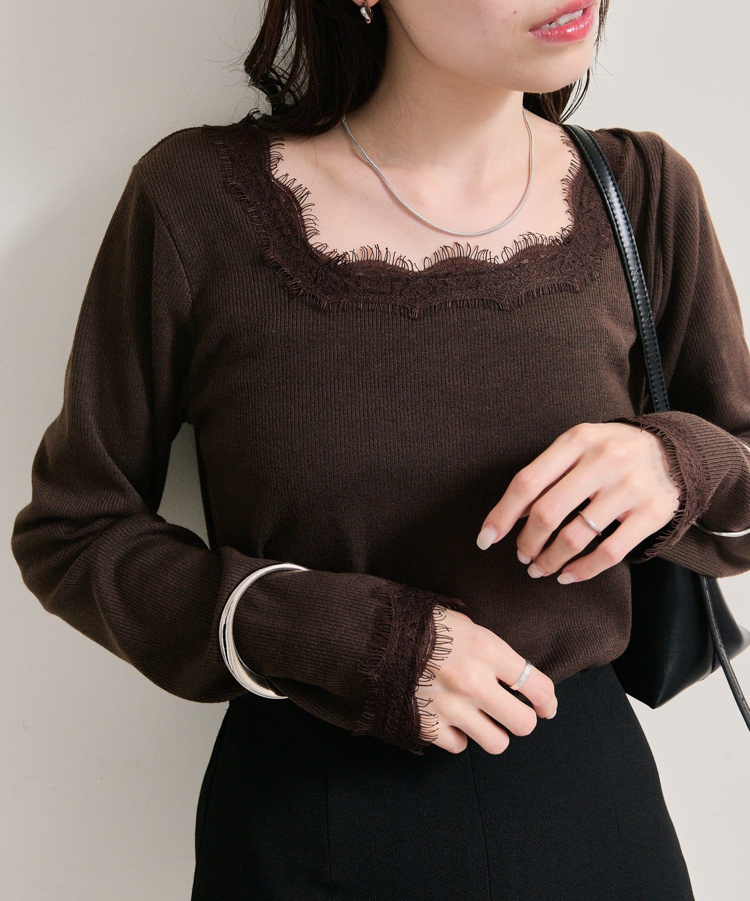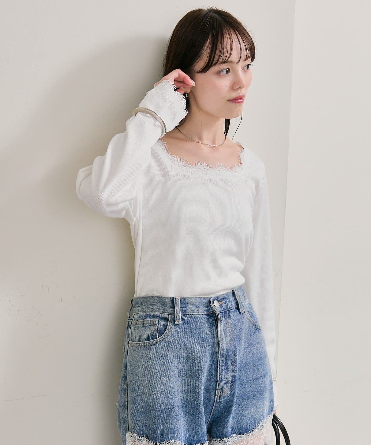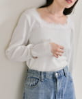 ・ネックラインと袖口のフリンジレースが女性らしさを引き立てるトップス。