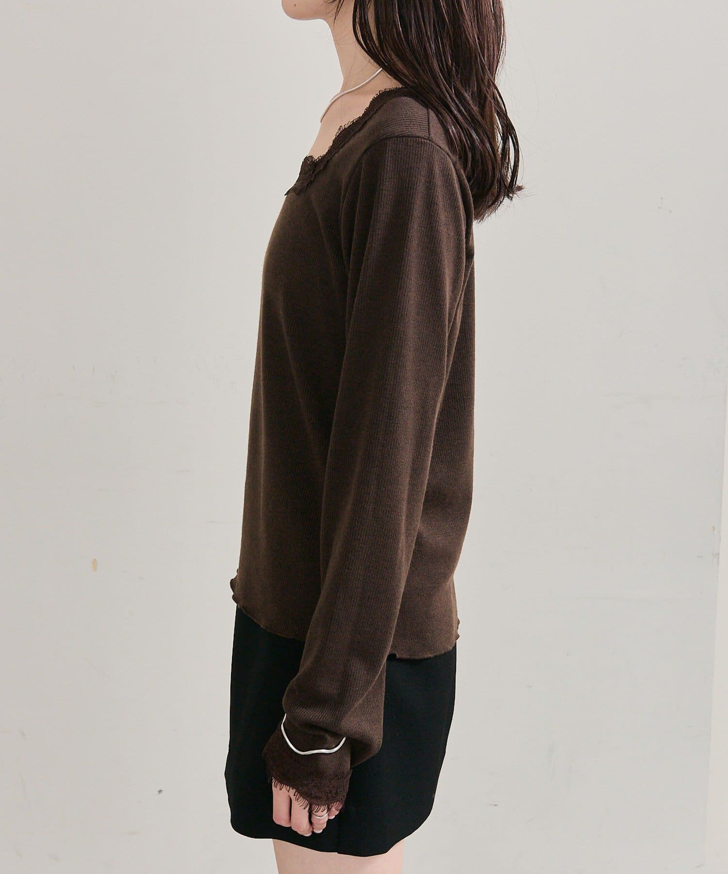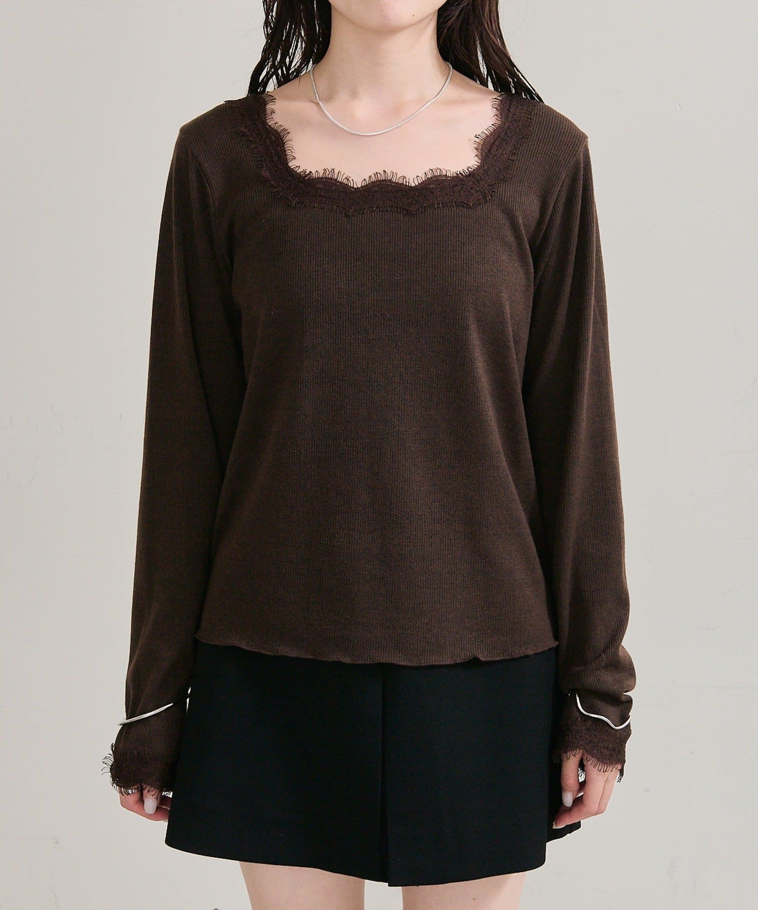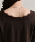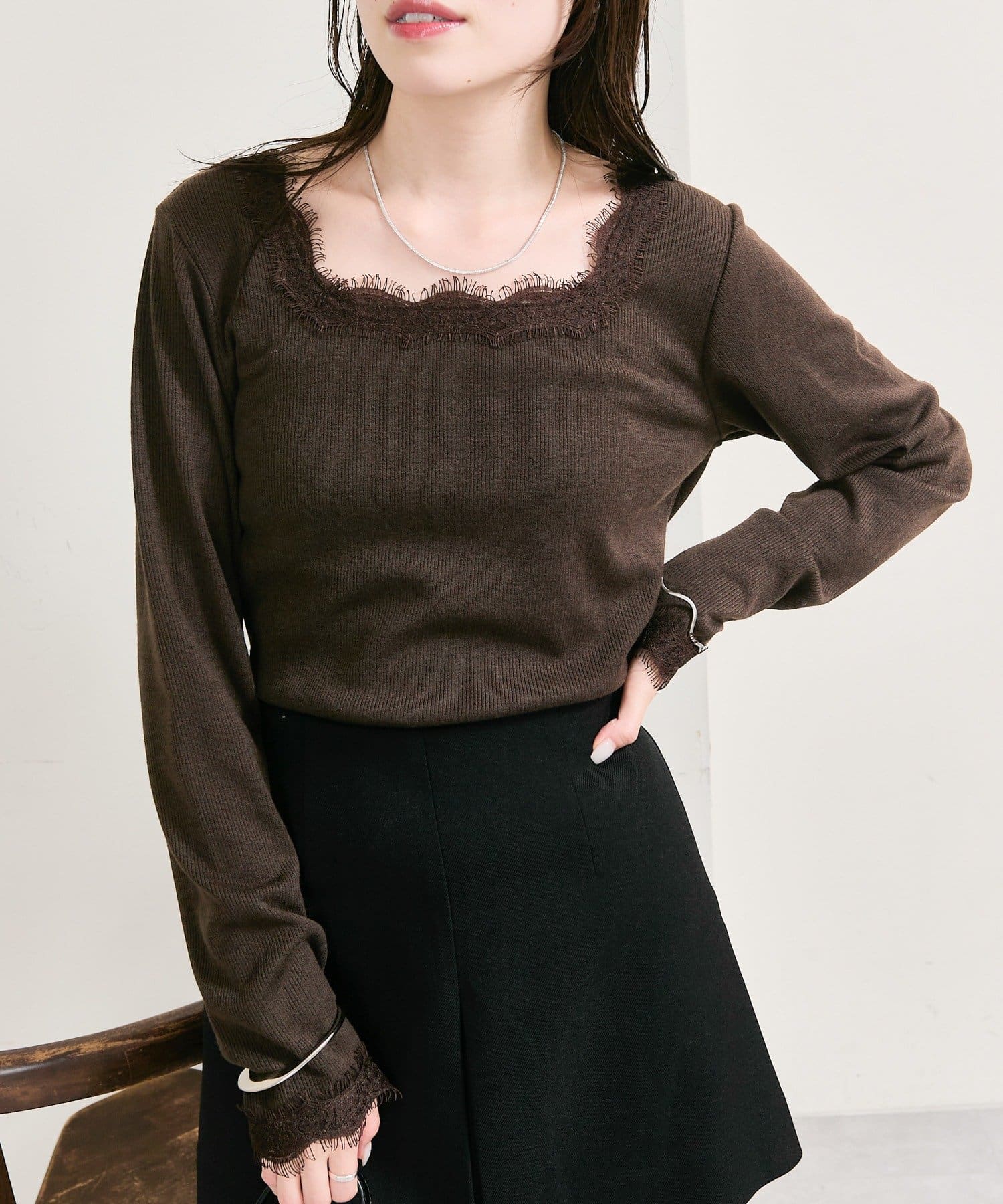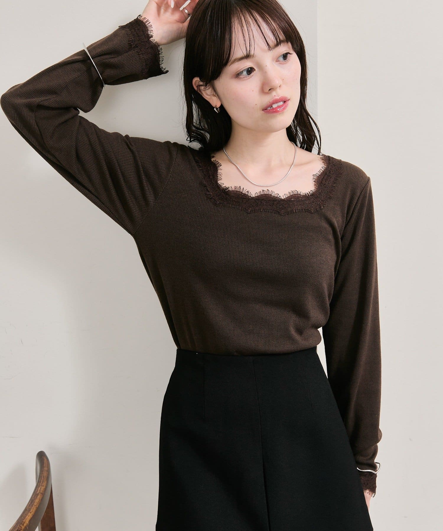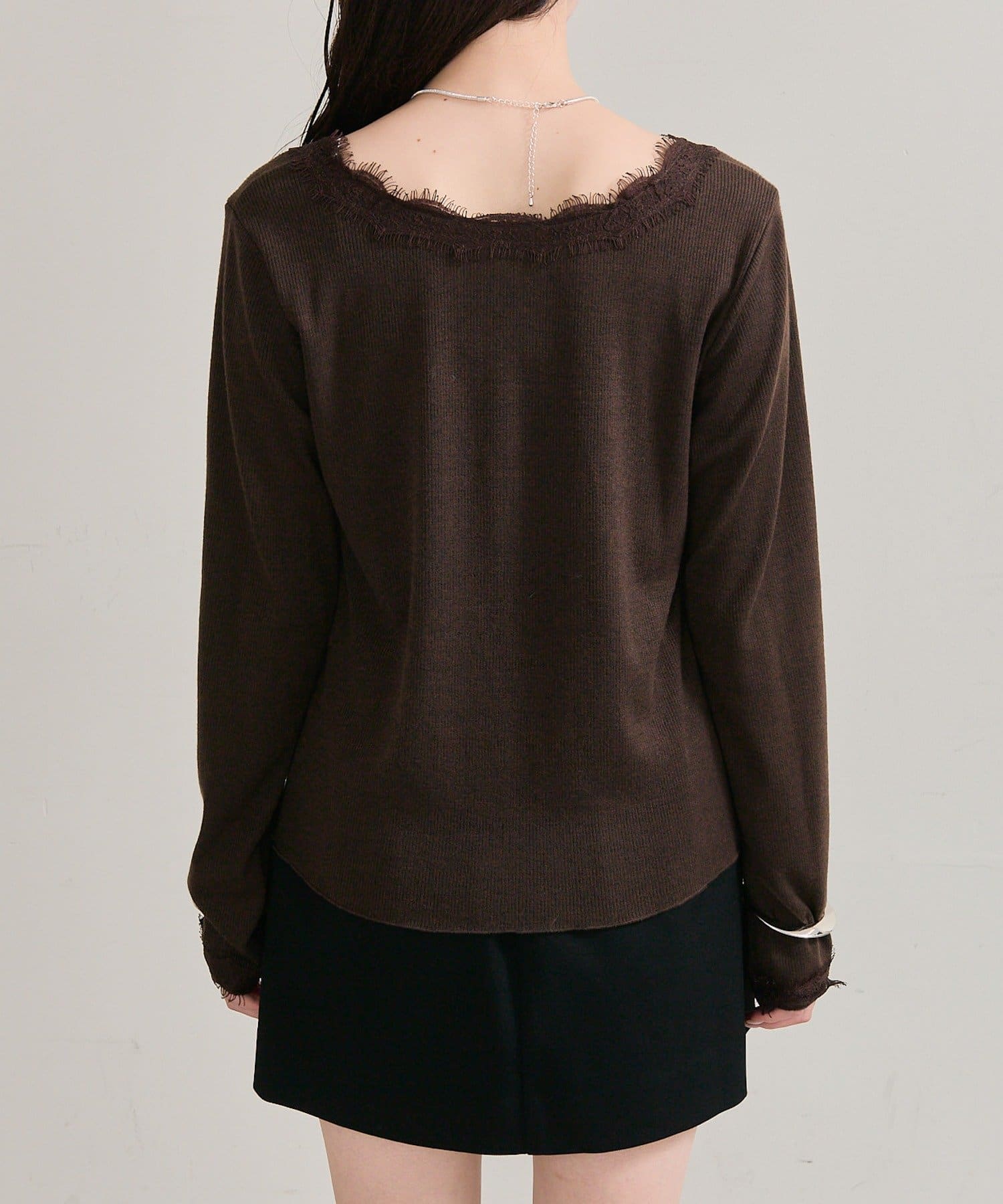 ・ネックラインと袖口のフリンジレースが女性らしさを引き立てるトップス。
