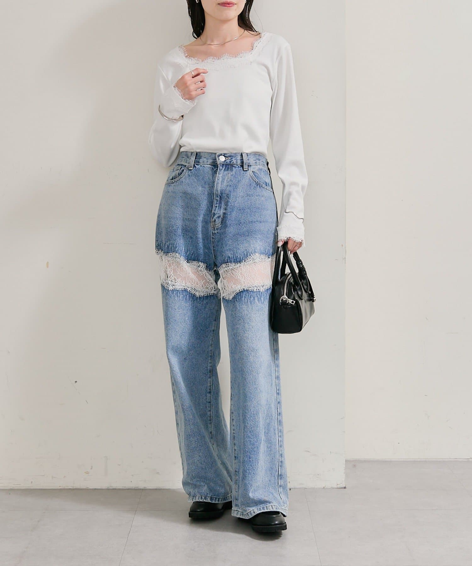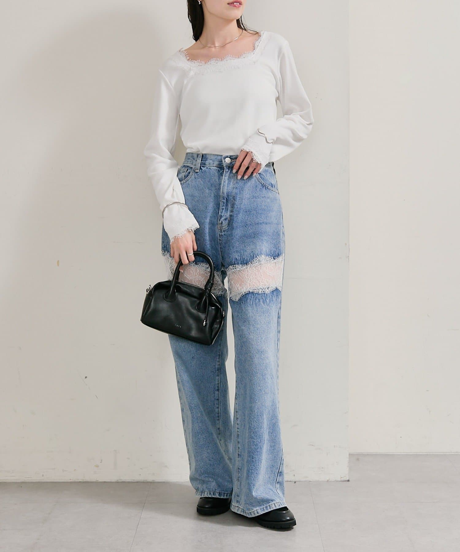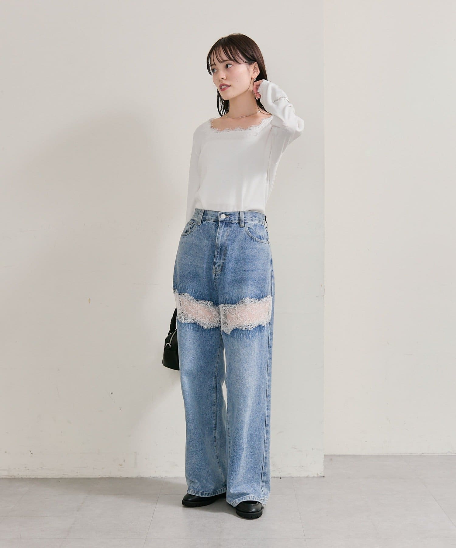 オーバーサイズのトップスのインナーに合わせて、袖口のレース部分を出したレイヤードスタイルも女性らしさが出ておすすめです◎
