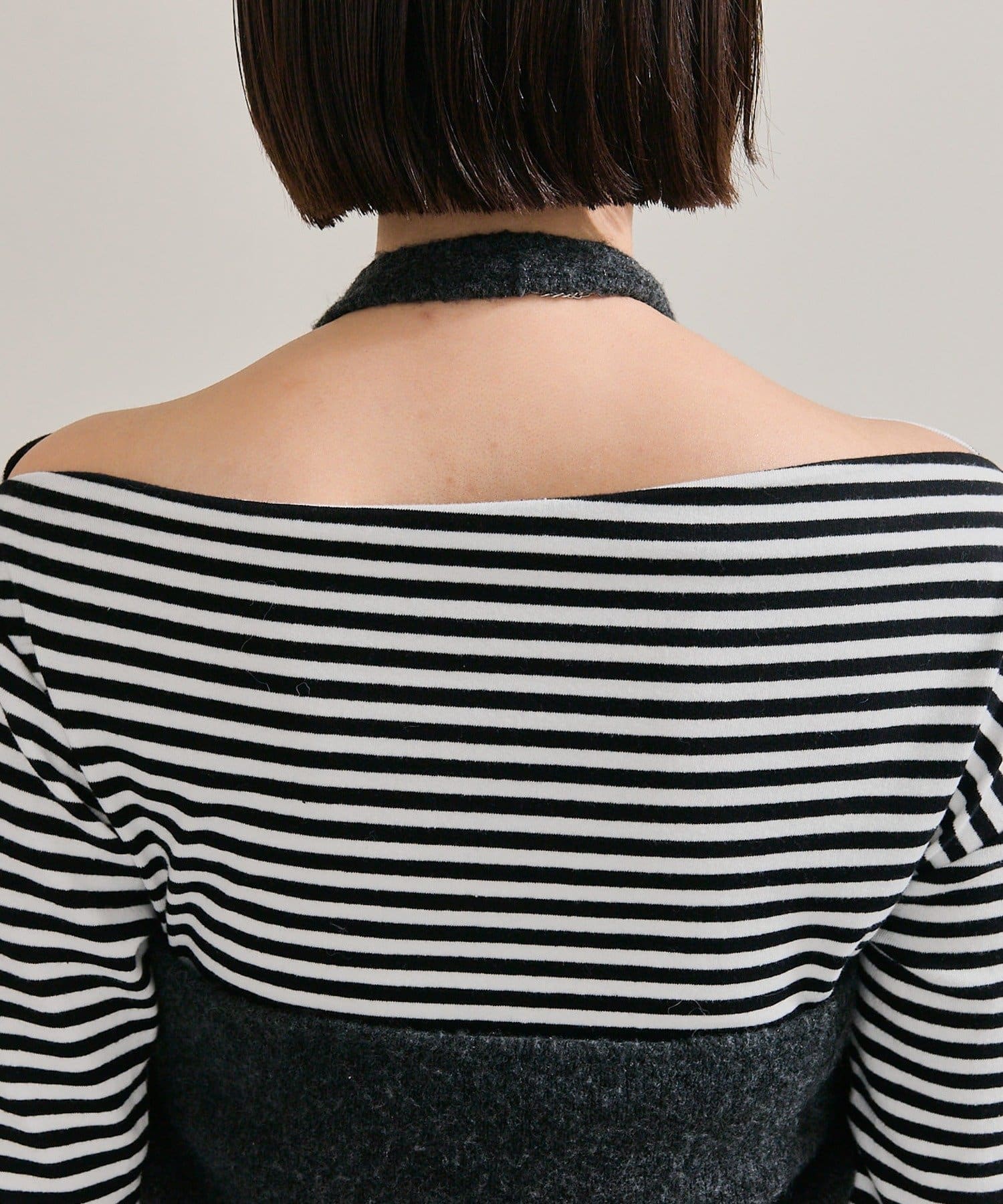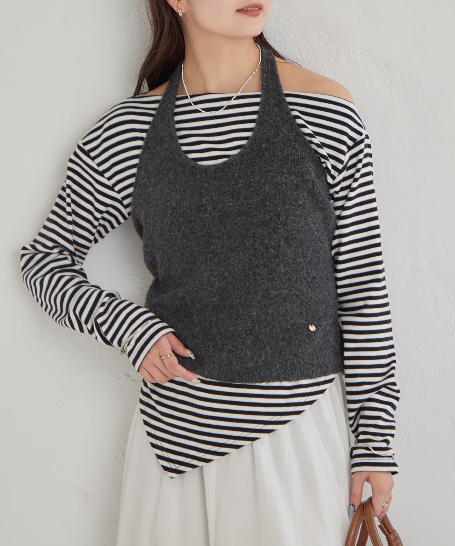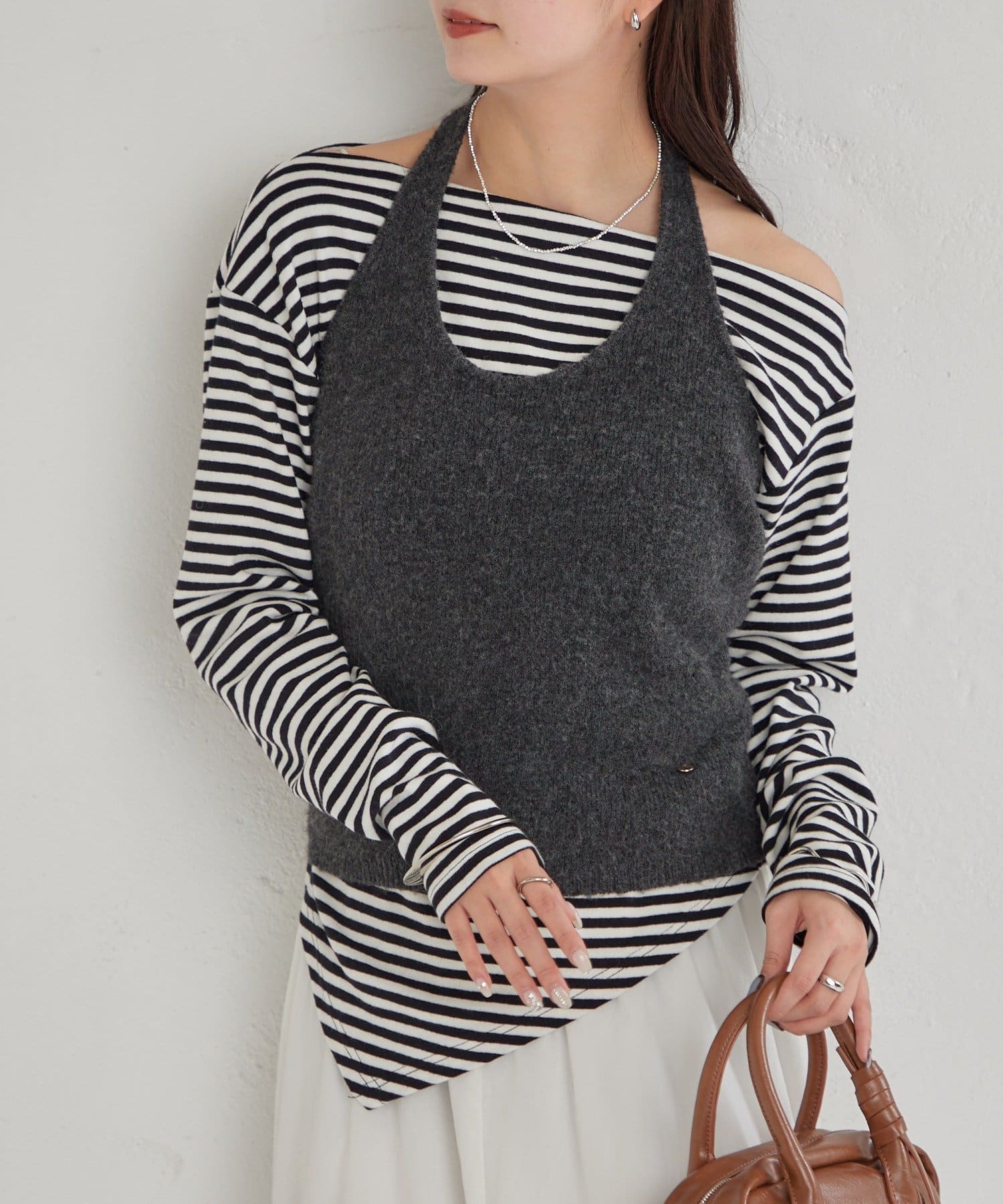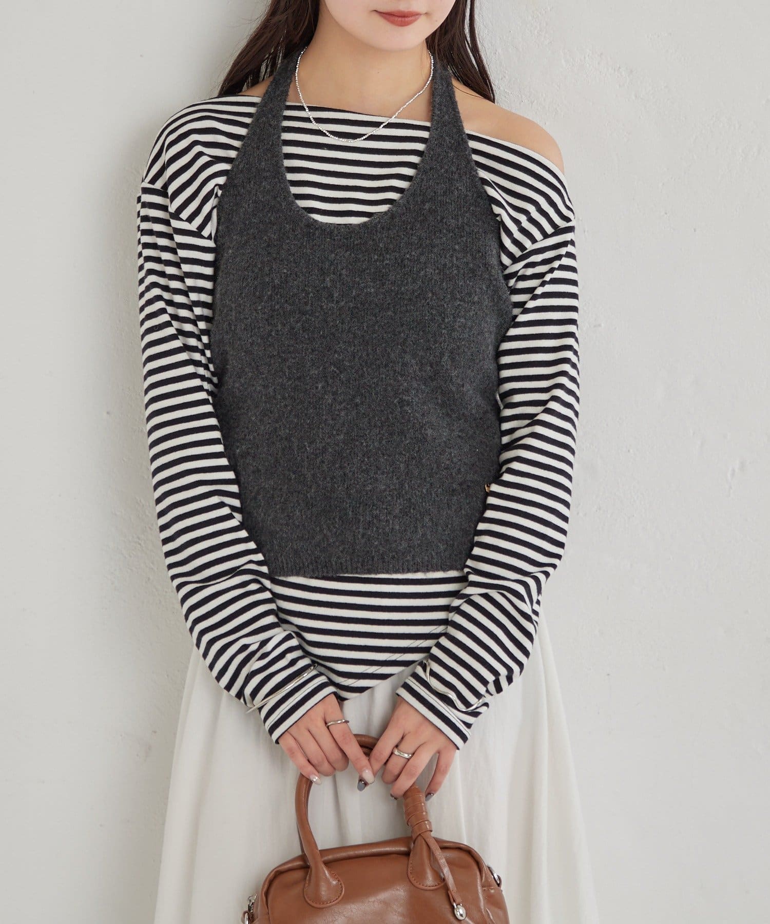 ・ボートネックでオフショル風に着られるカットソーに、ホルタービスチェがSETになったアイテム。