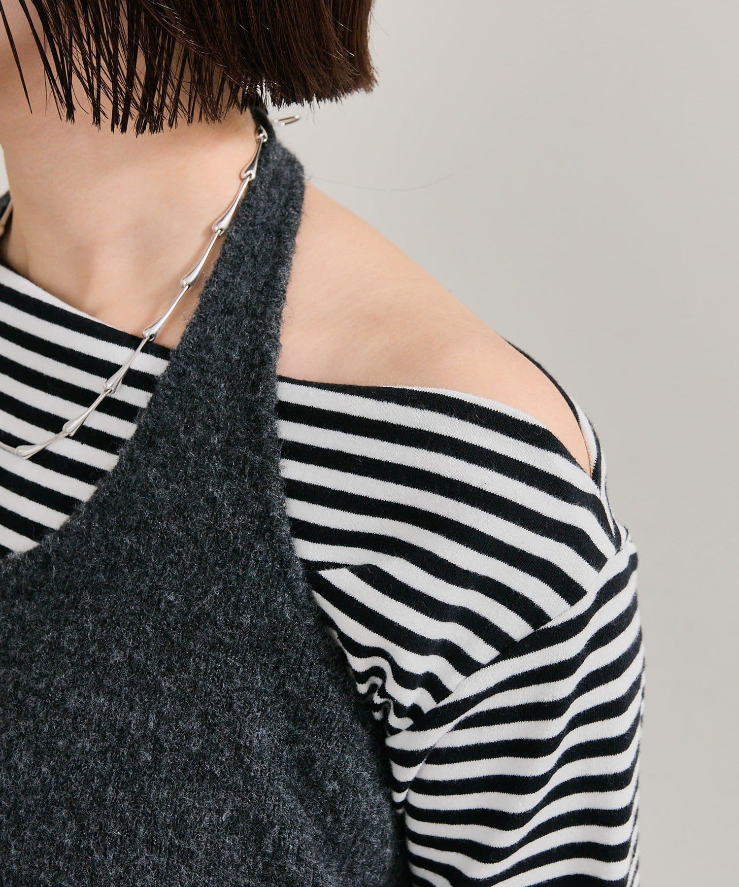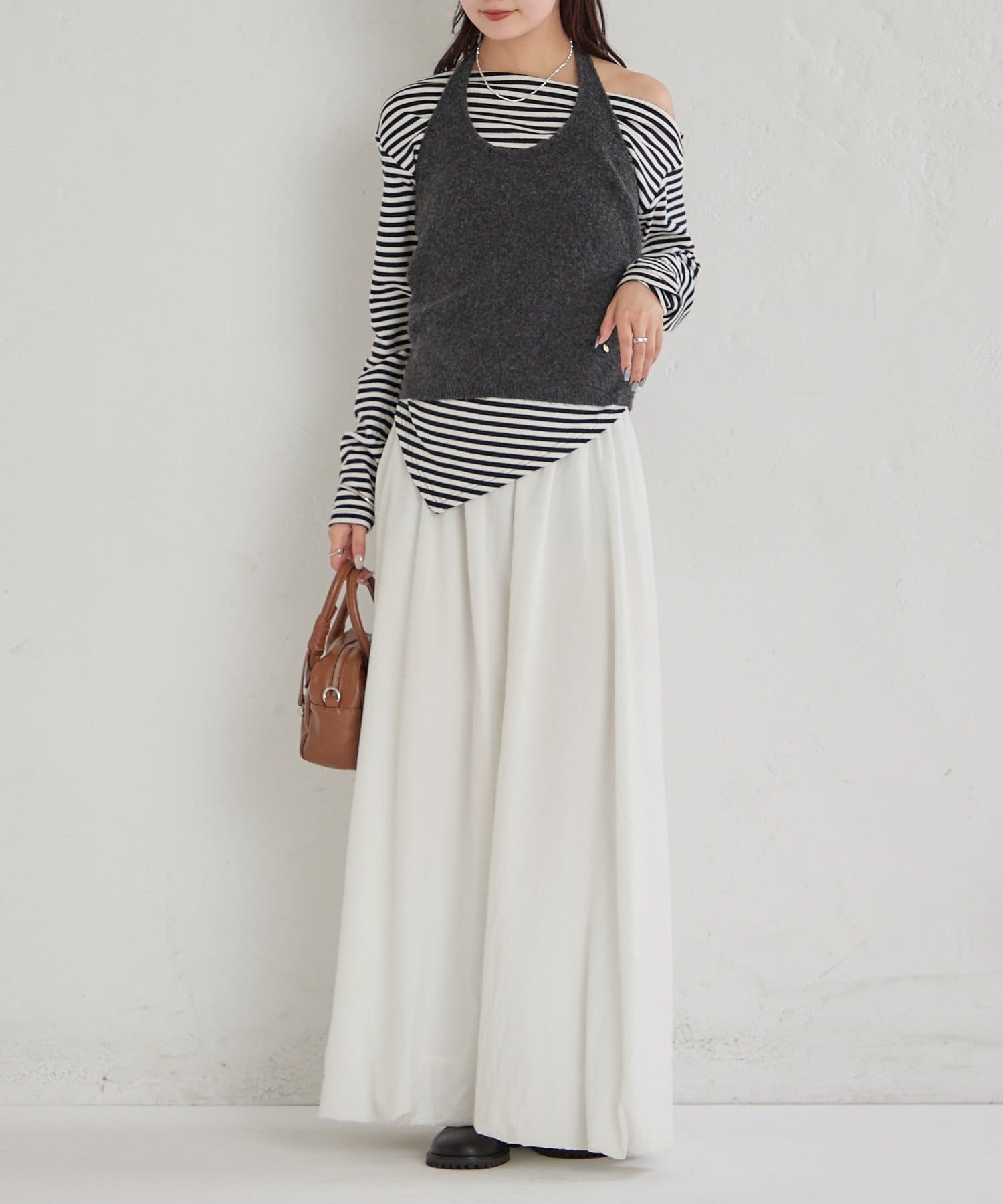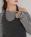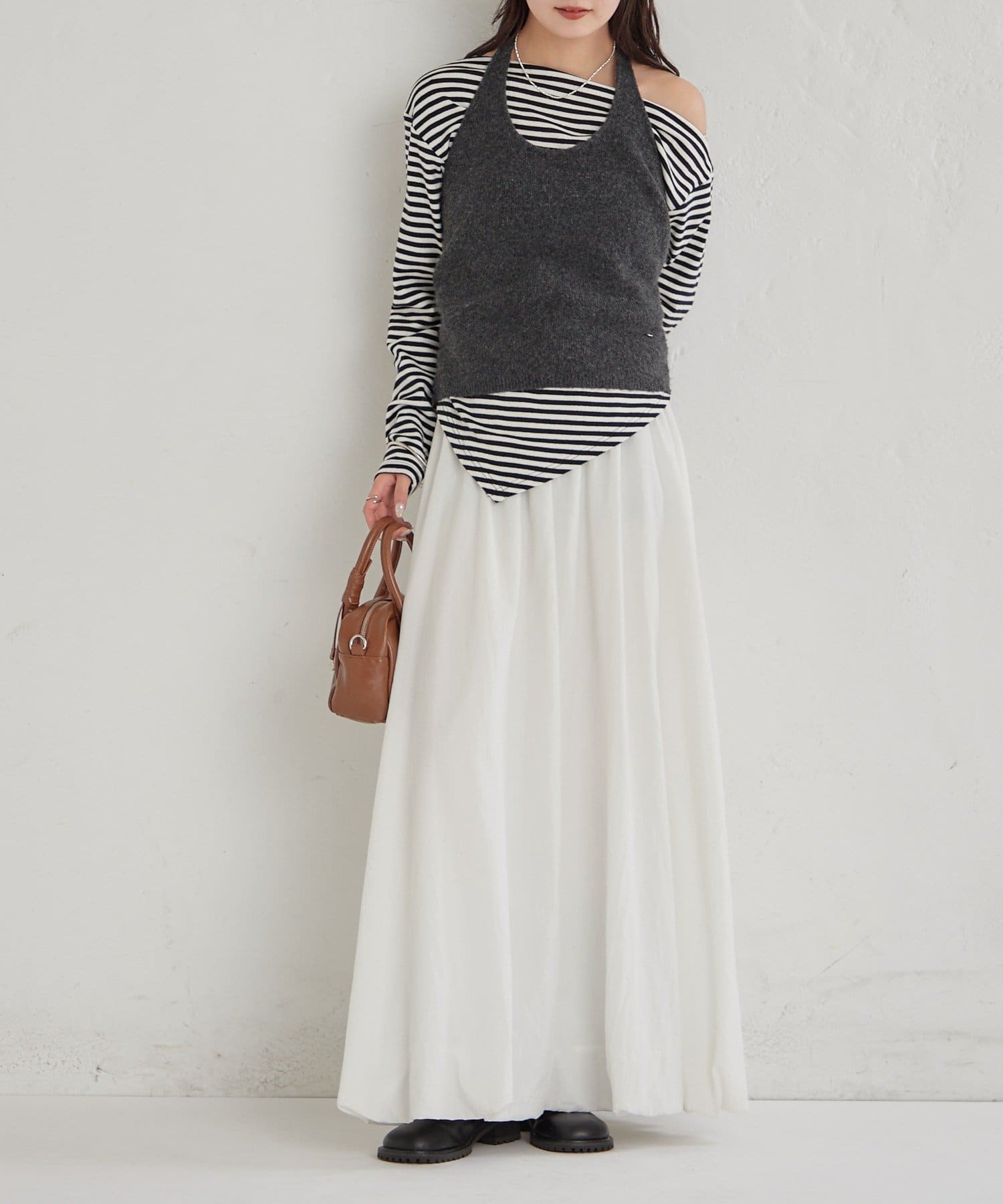 ・ボートネックでオフショル風に着られるカットソーに、ホルタービスチェがSETになったアイテム。