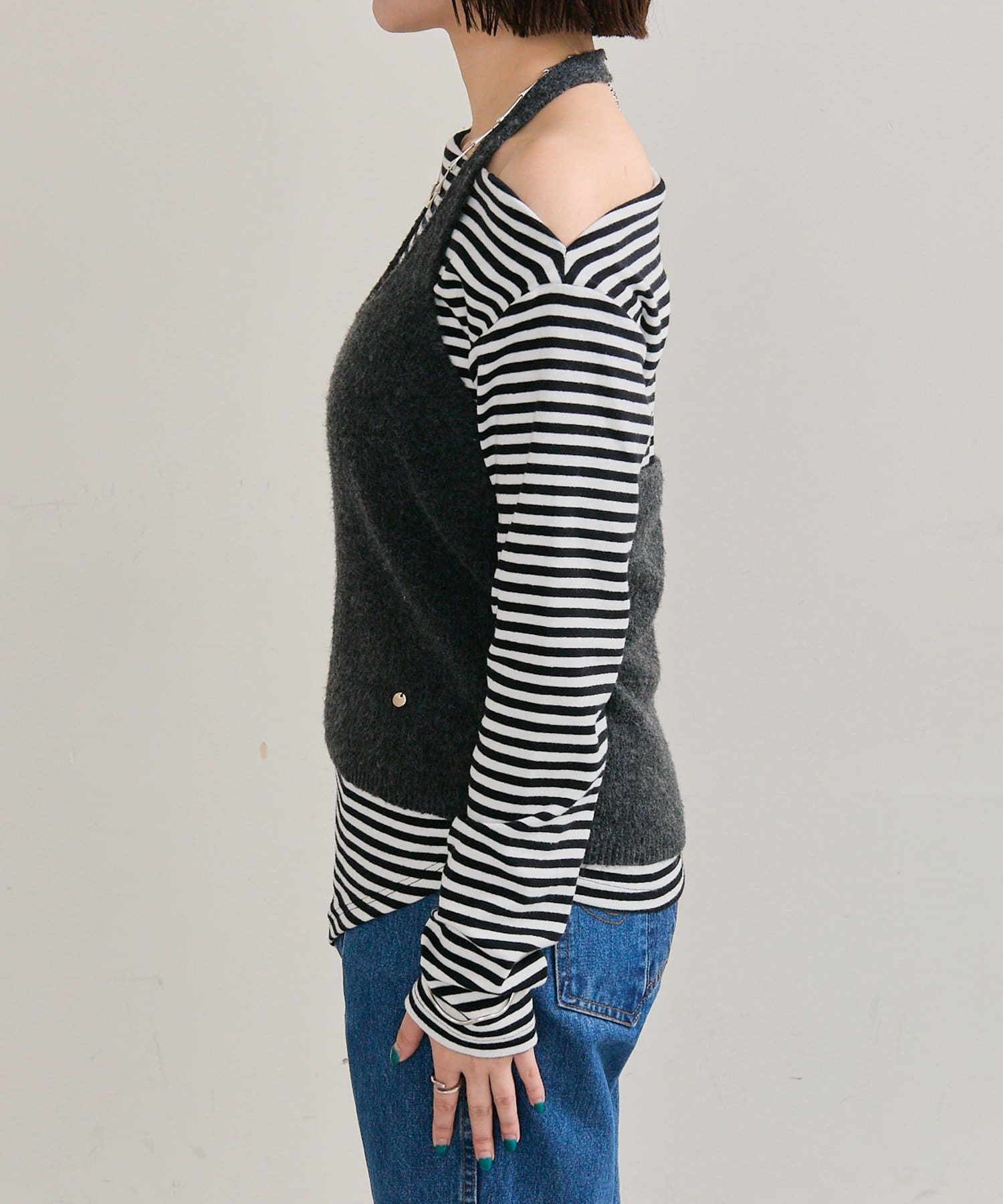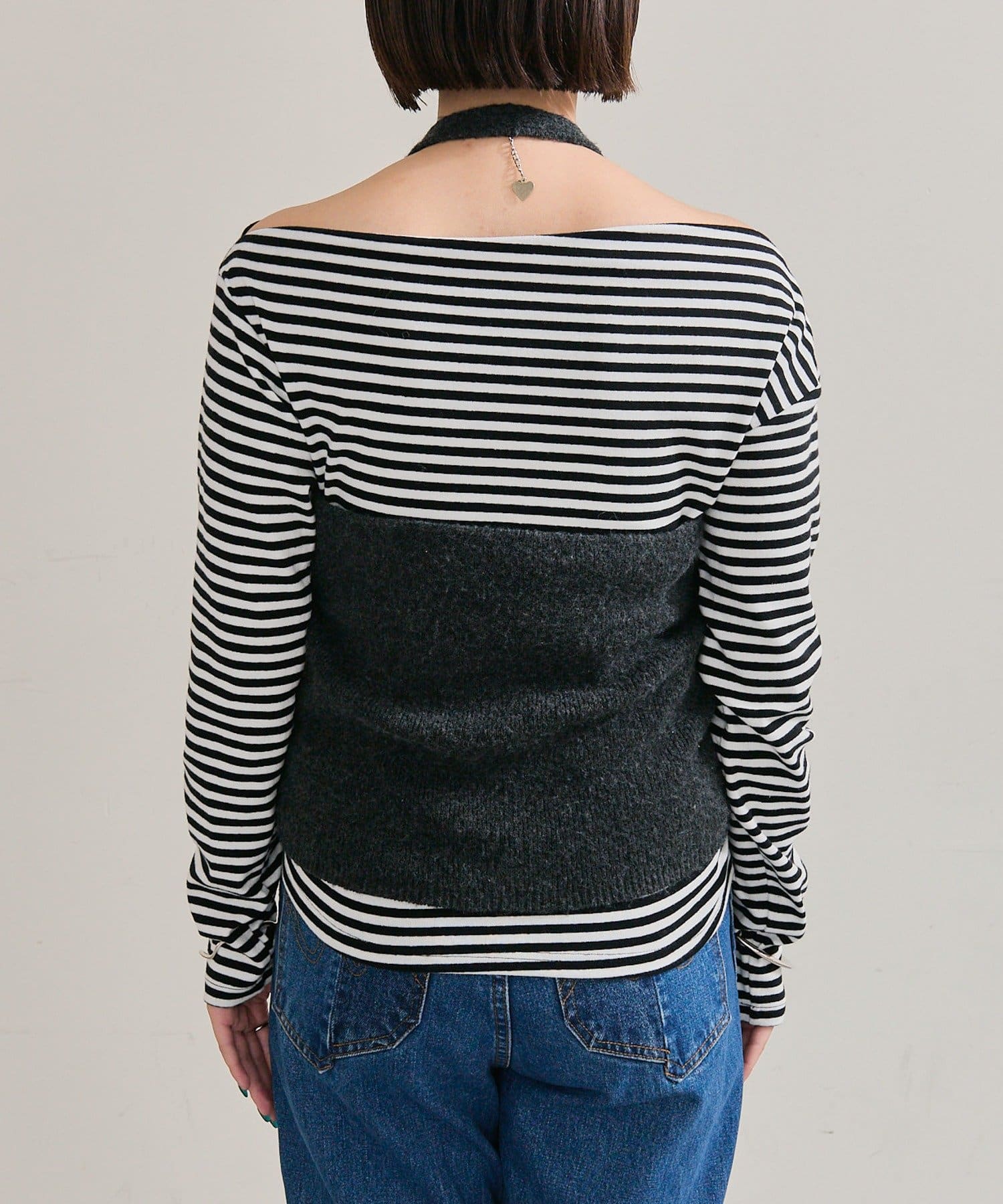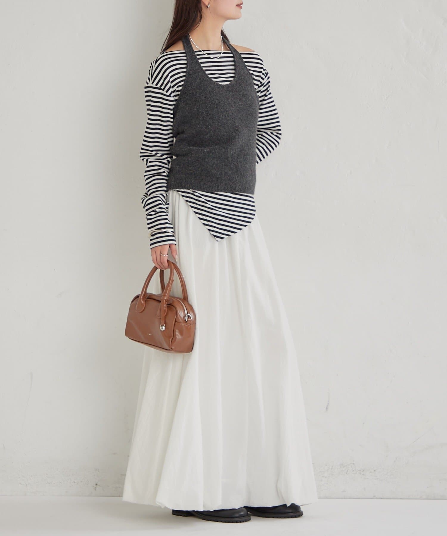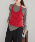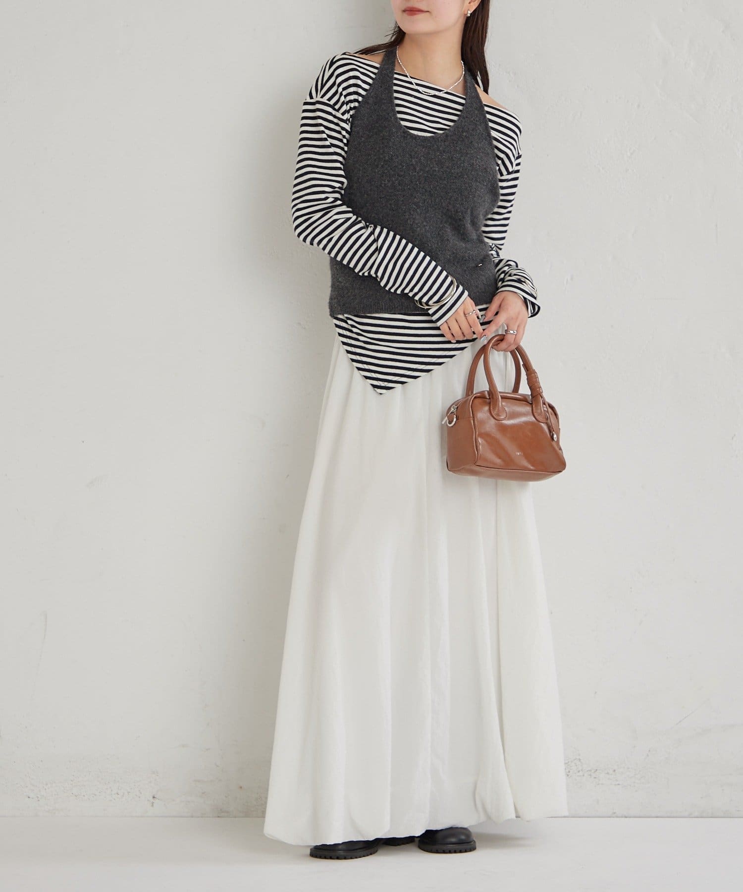 ・ボートネックでオフショル風に着られるカットソーに、ホルタービスチェがSETになったアイテム。
