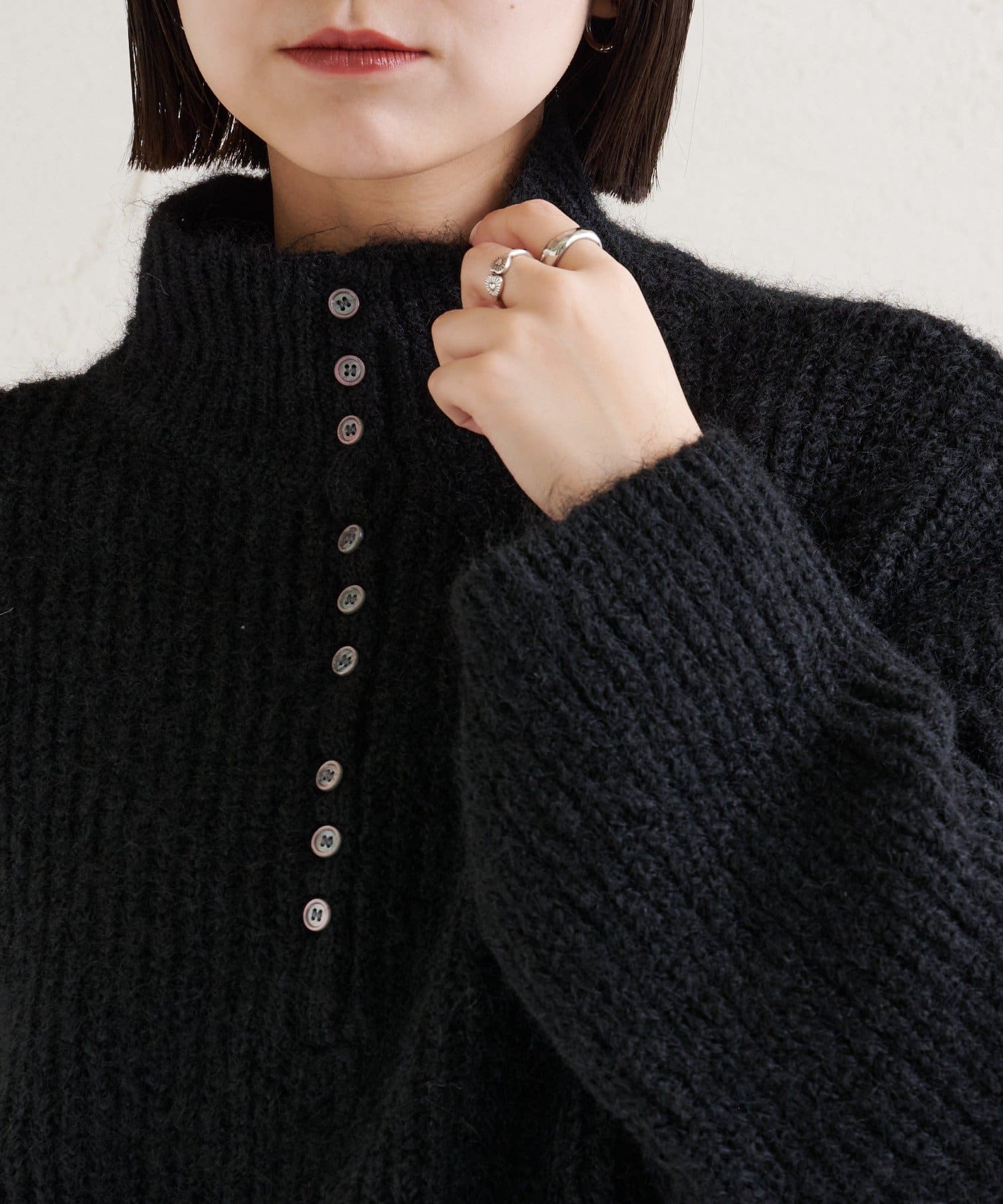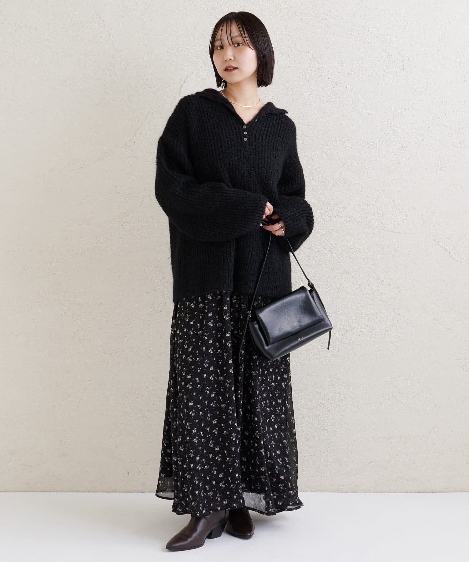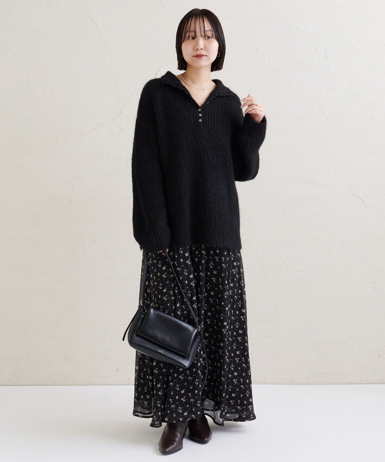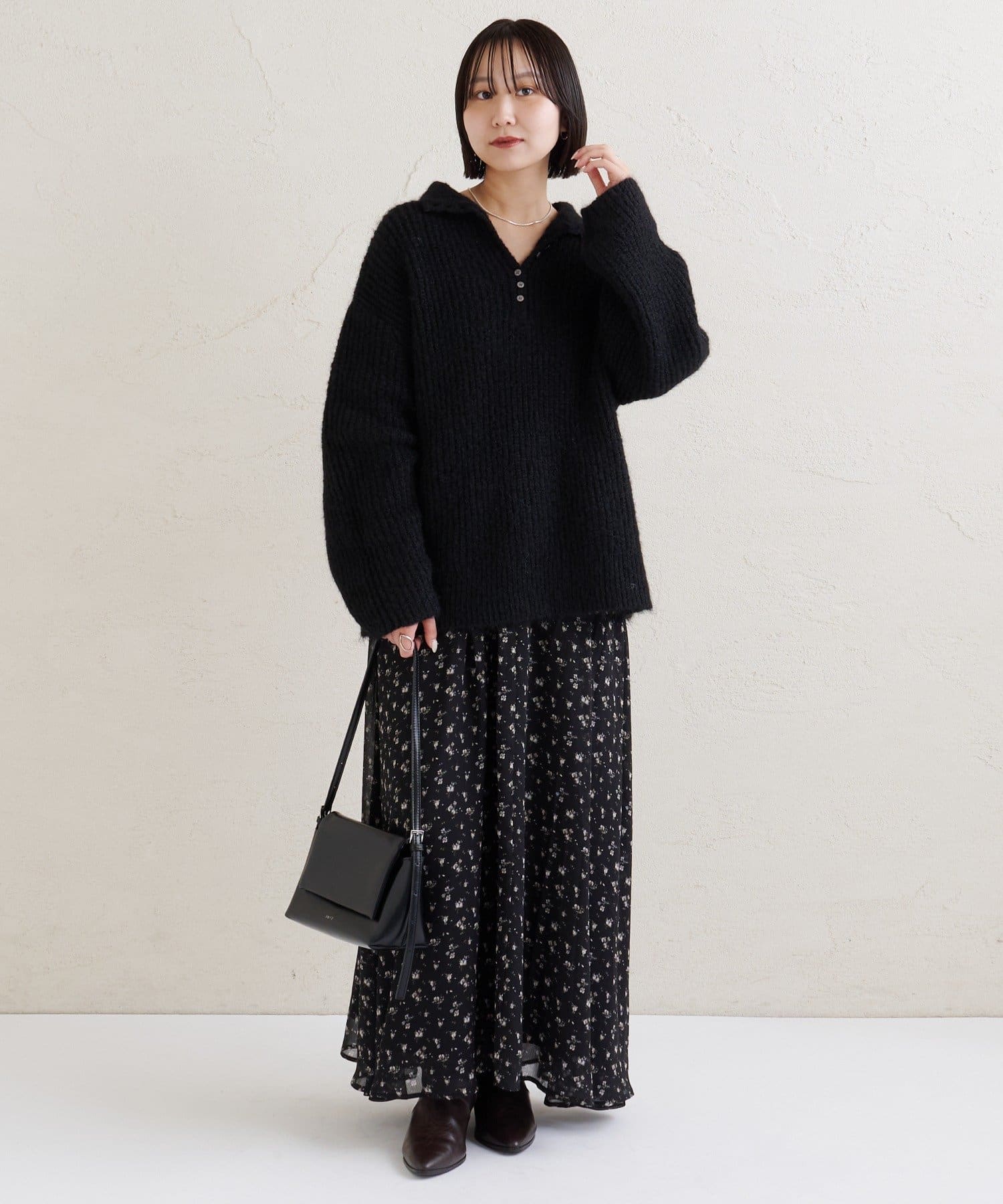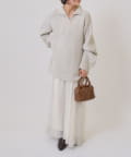 ・ニットはトレンドのポロデザインで、フロントボタンがアクセントに。 開け閉めで印象を変えて着ていただけます。